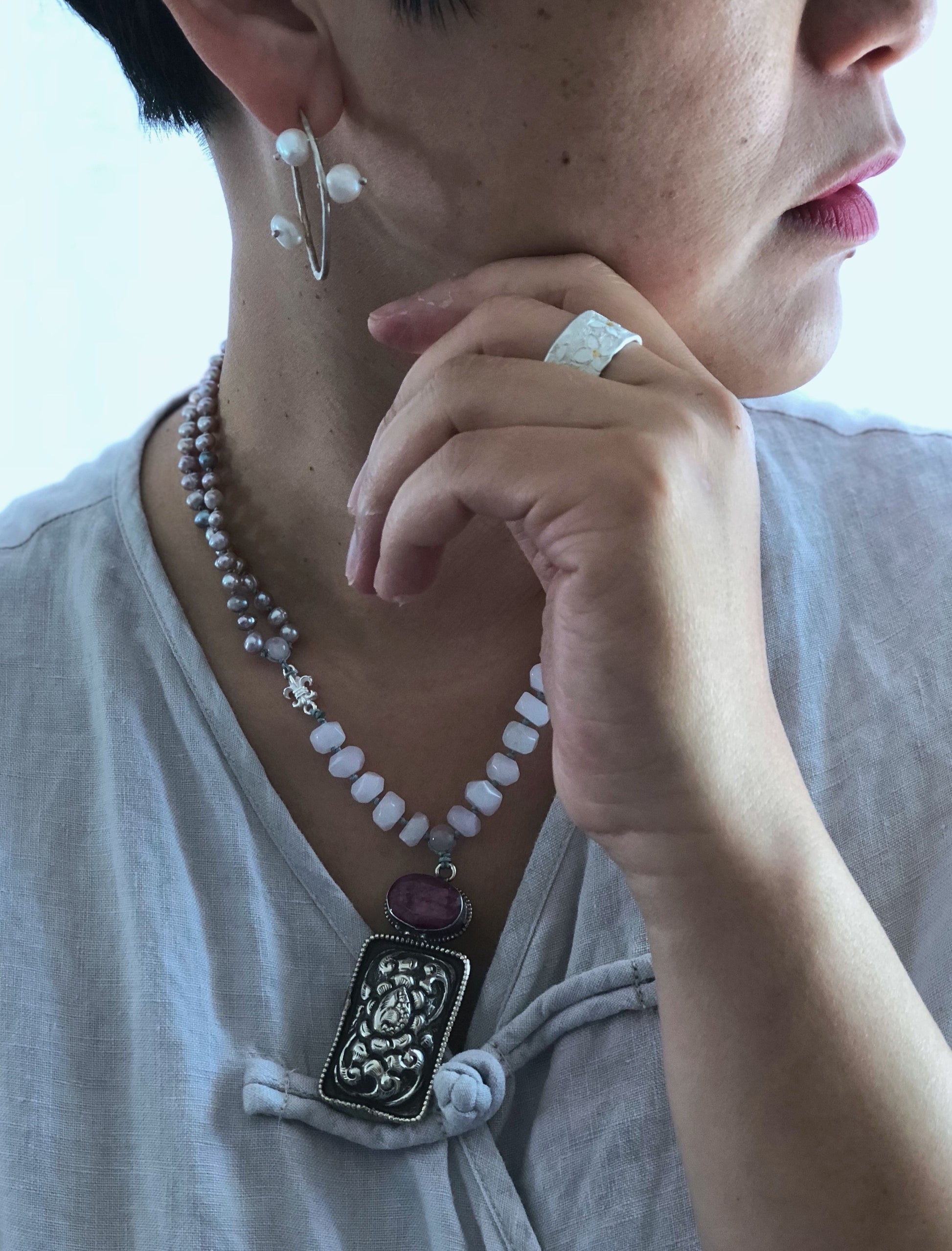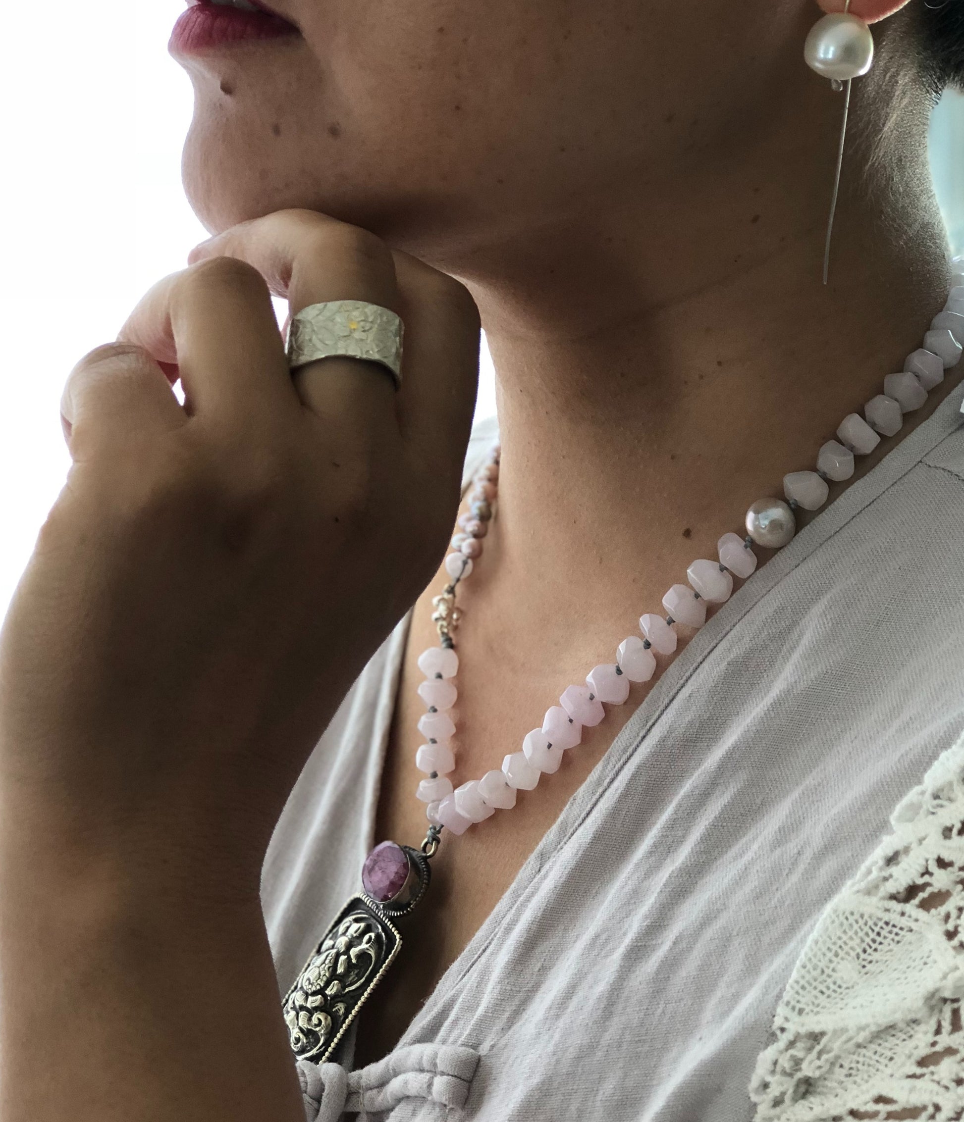 Materials : Pink opal , fresh water pearl, Nepal silver pendent