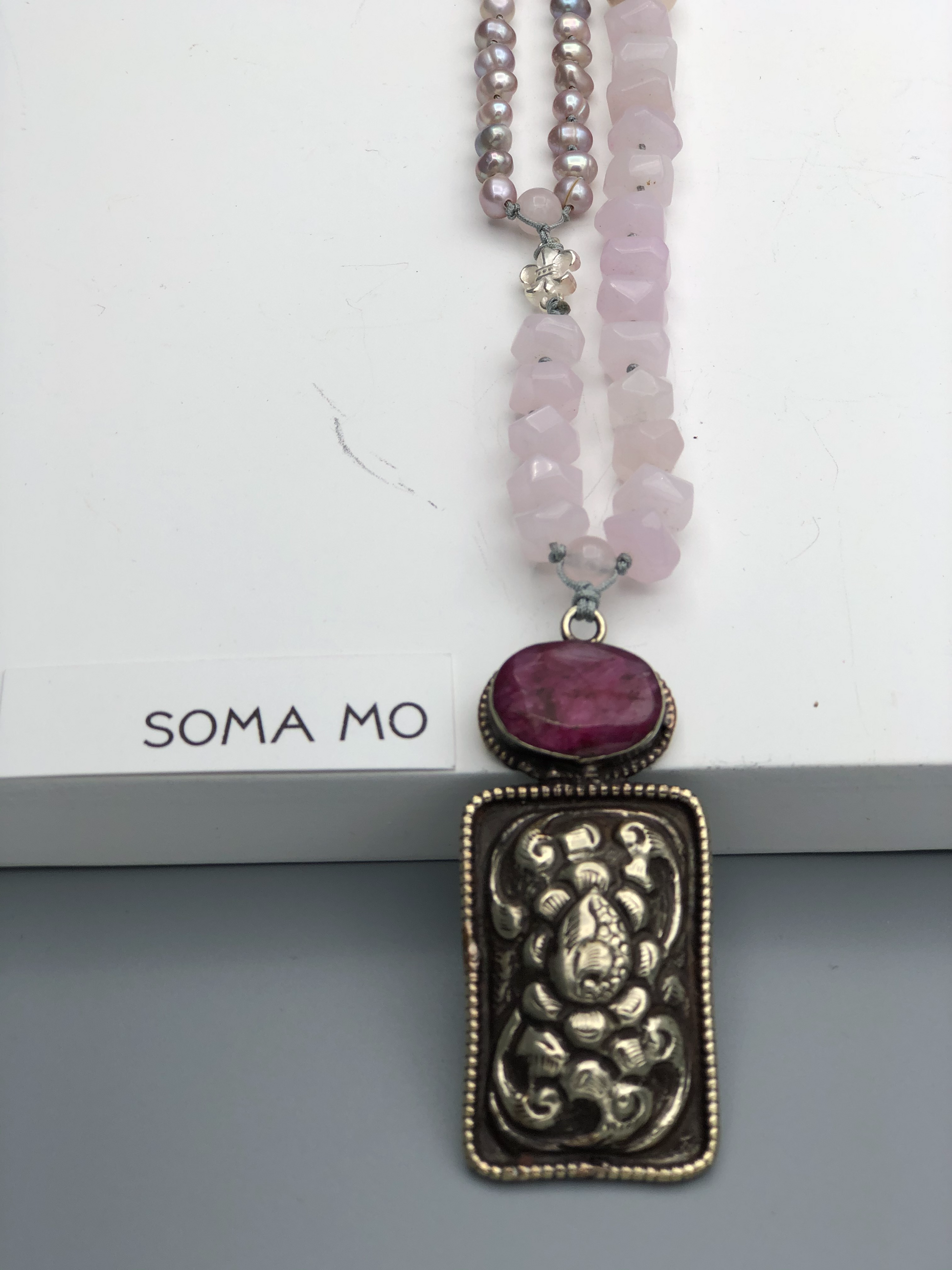 Very feminine piece with light pink opal stone and old Nepal pendent . Small purple fresh water pearl adds some luster for the piece.
