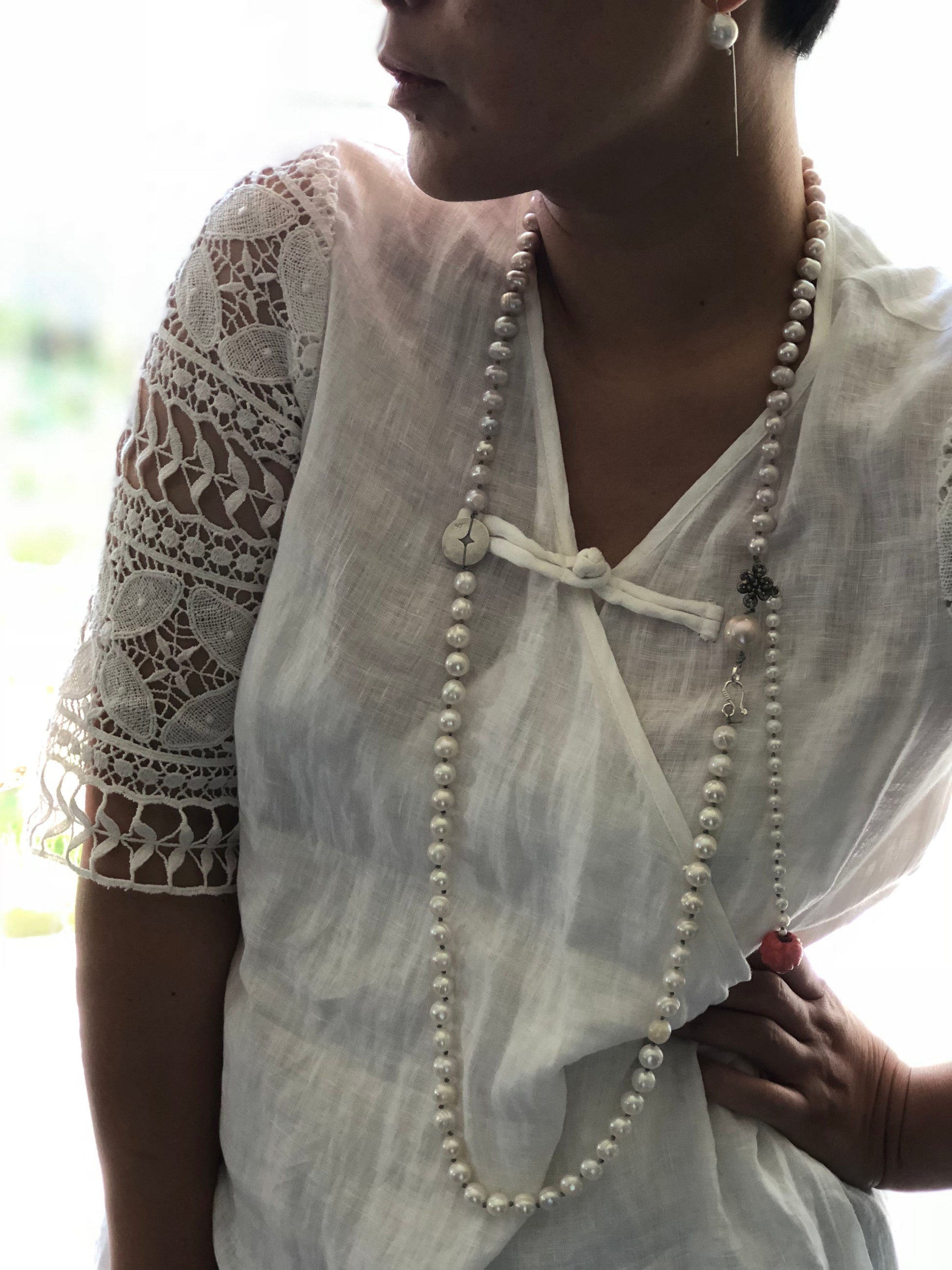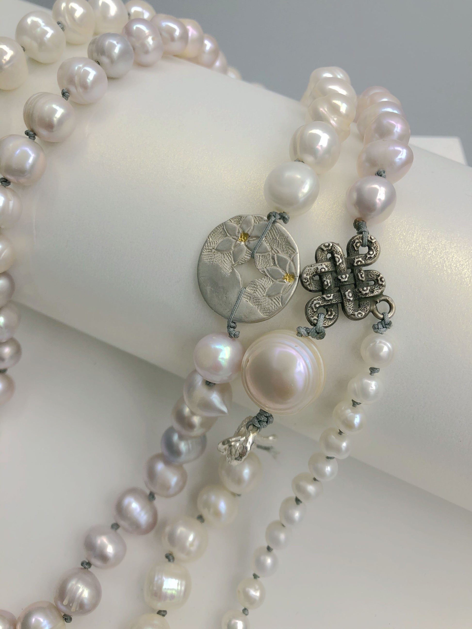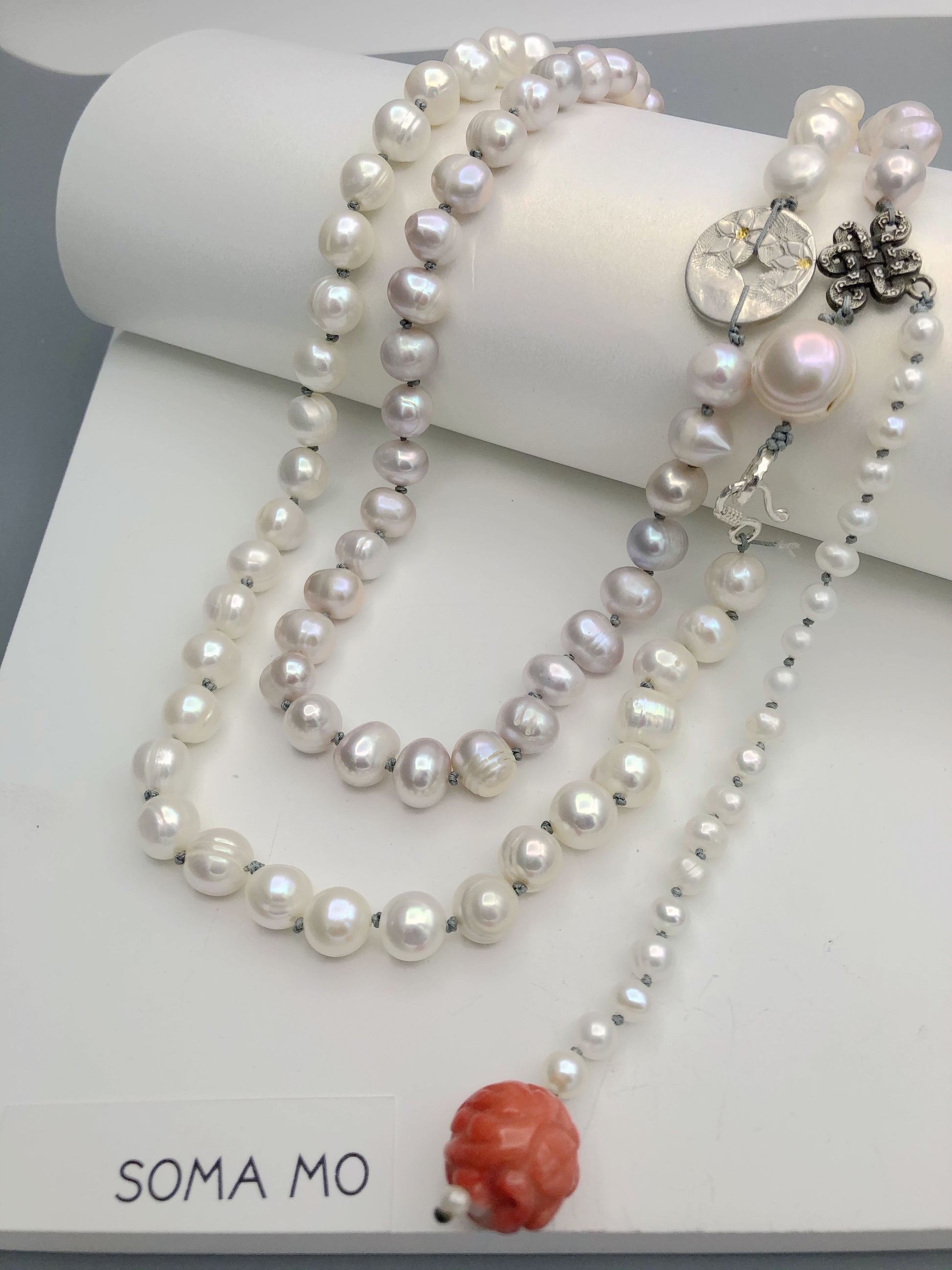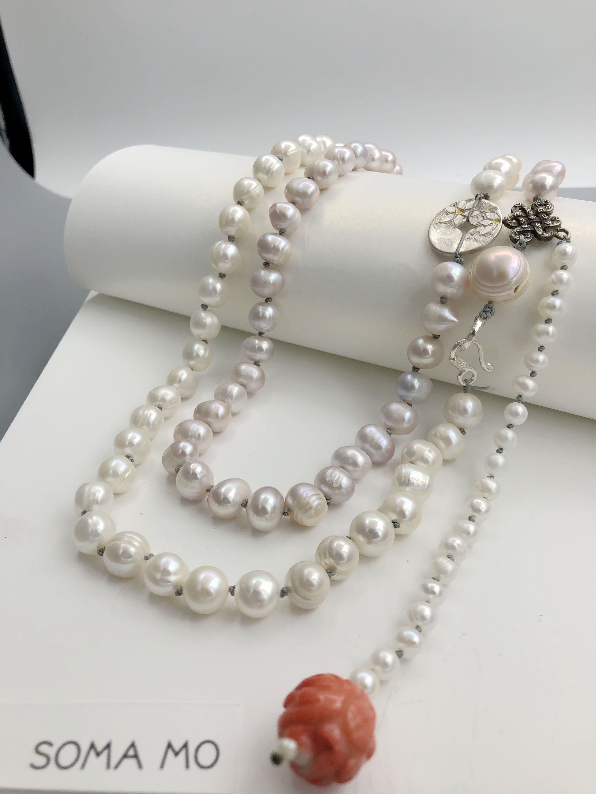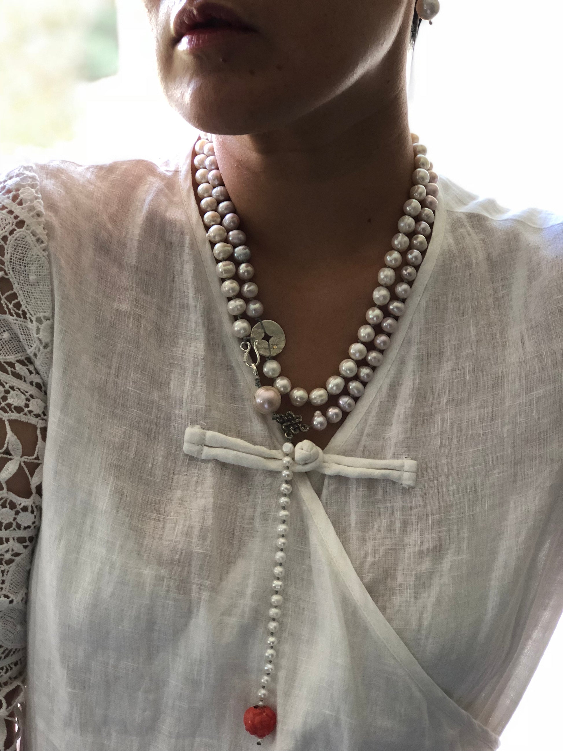 Two color of fresh water pearl -- white and pink, combined with one vintage silver infinity pendent , and one fine silver handmade pendent , which I used the traditional Himalaya silver technique to make, plus one red coral bead, this necklace can be wear long or doubled. Hand knotted between each beads.
