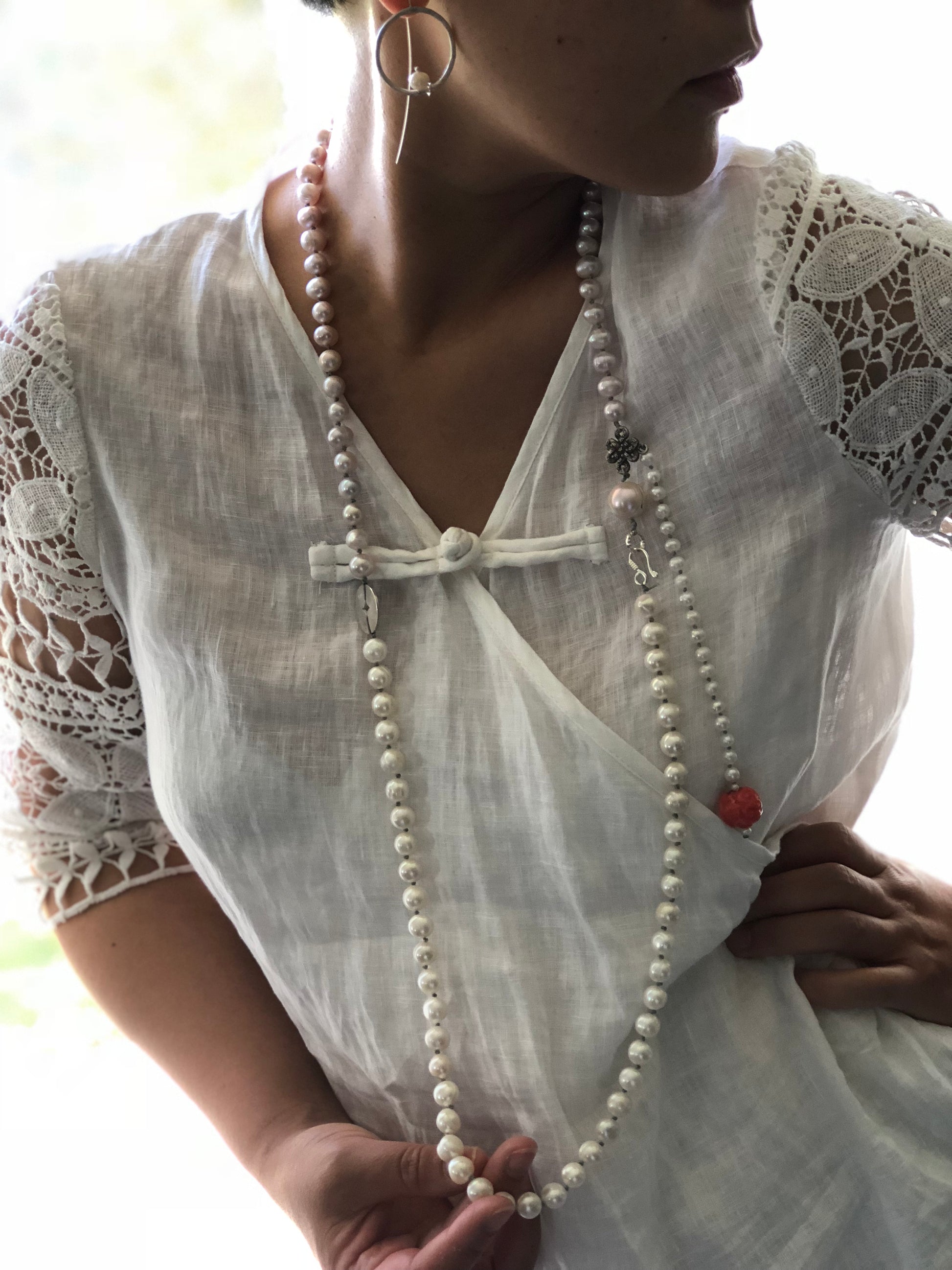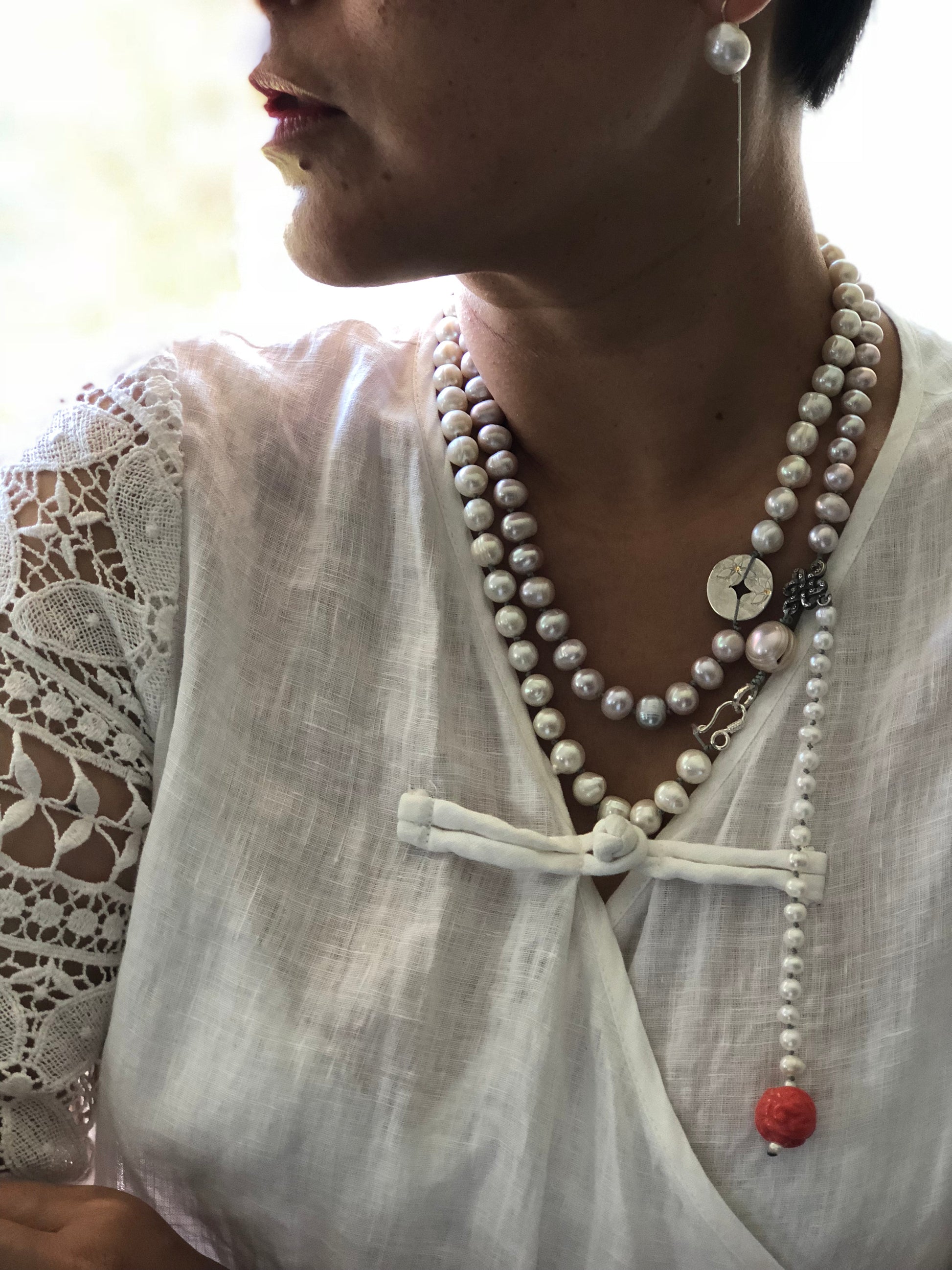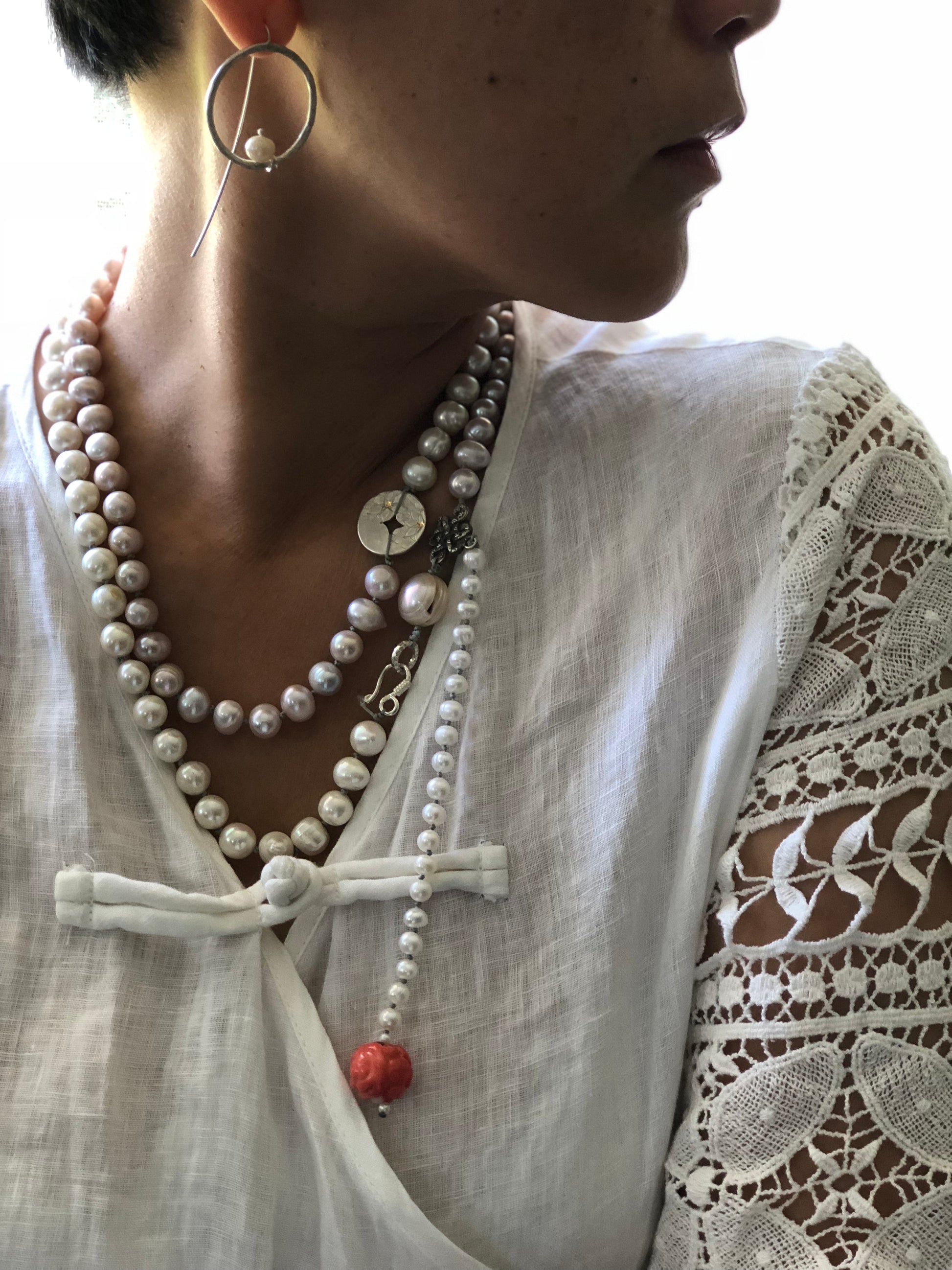 Materials : Fresh water pearl, red coral, fine silver, silver