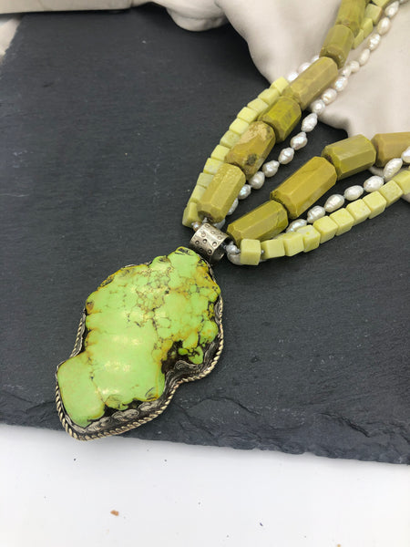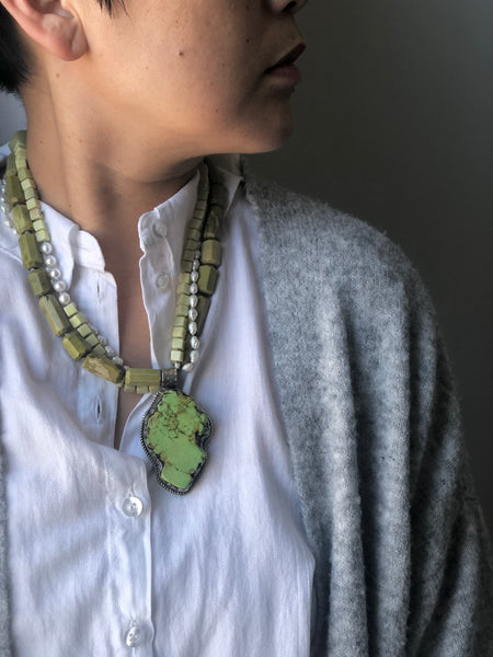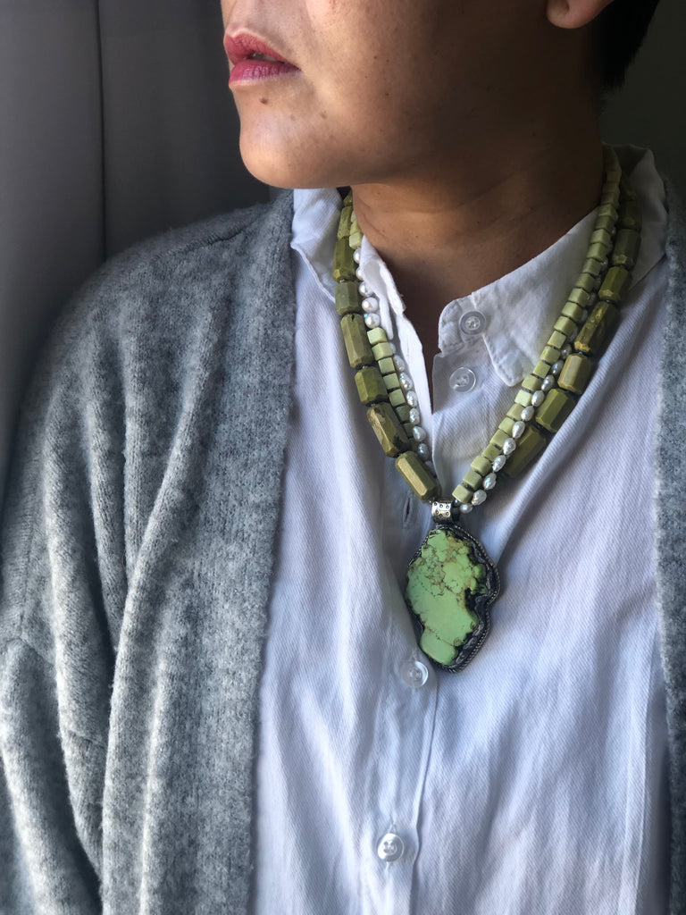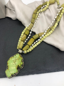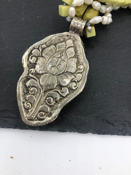 Materials : Yellow tequoise, olive jade, fresh water pearl, Tibetan pendent with tequoise