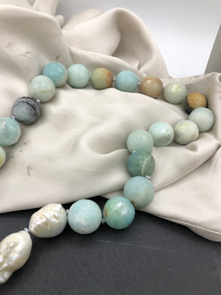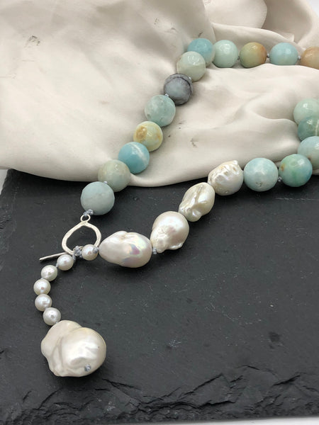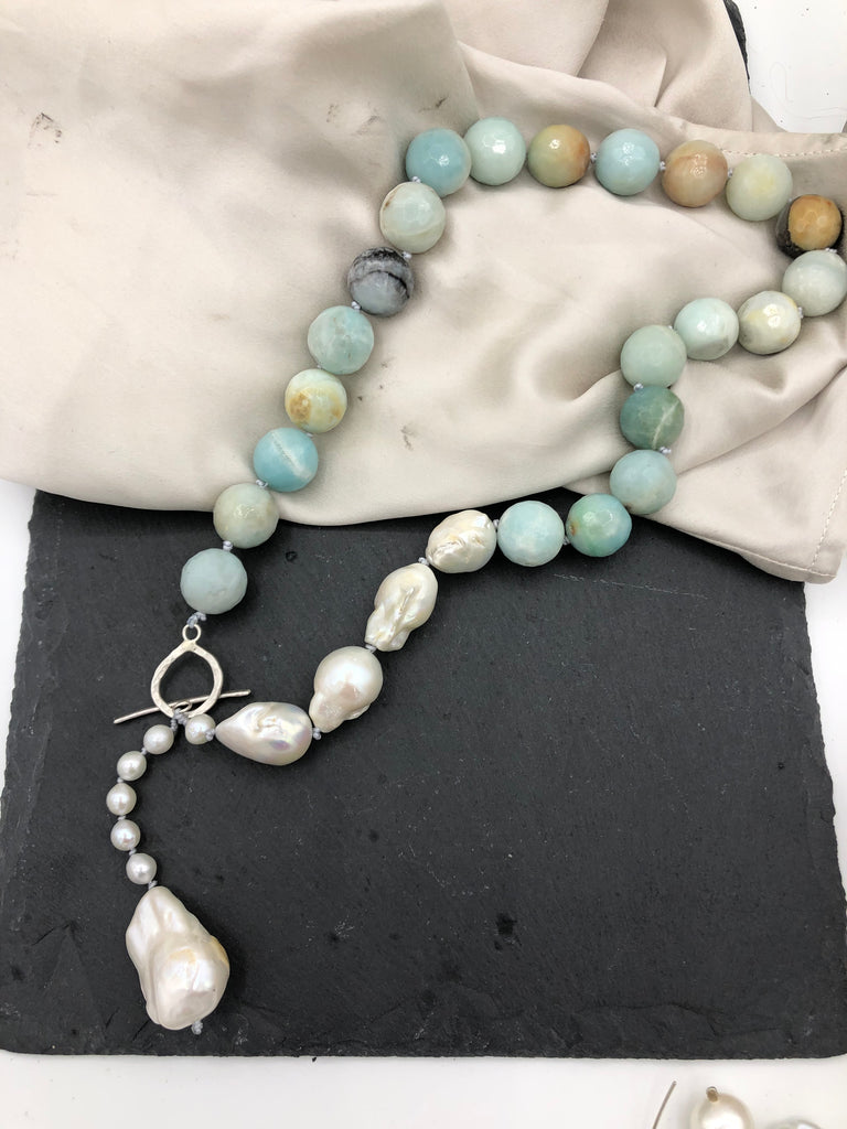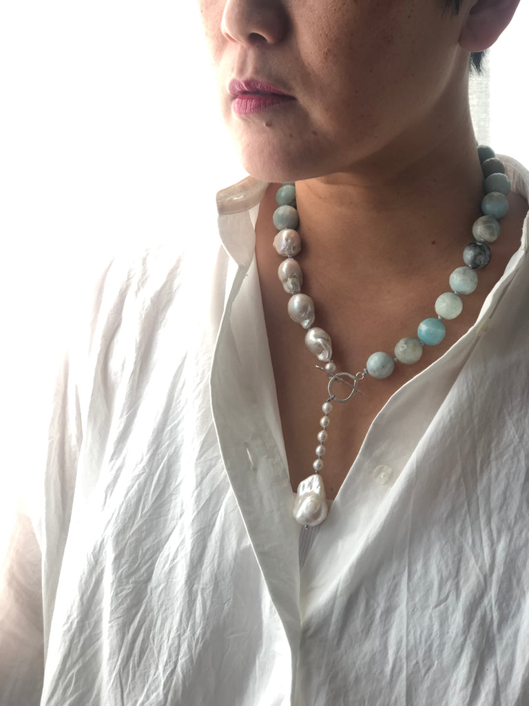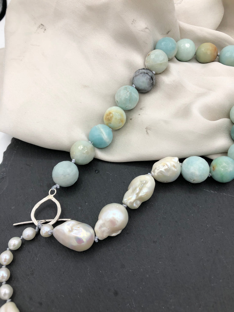 Materials : Amazonite, baroque pearls, handmade silver clasp with Soma logo