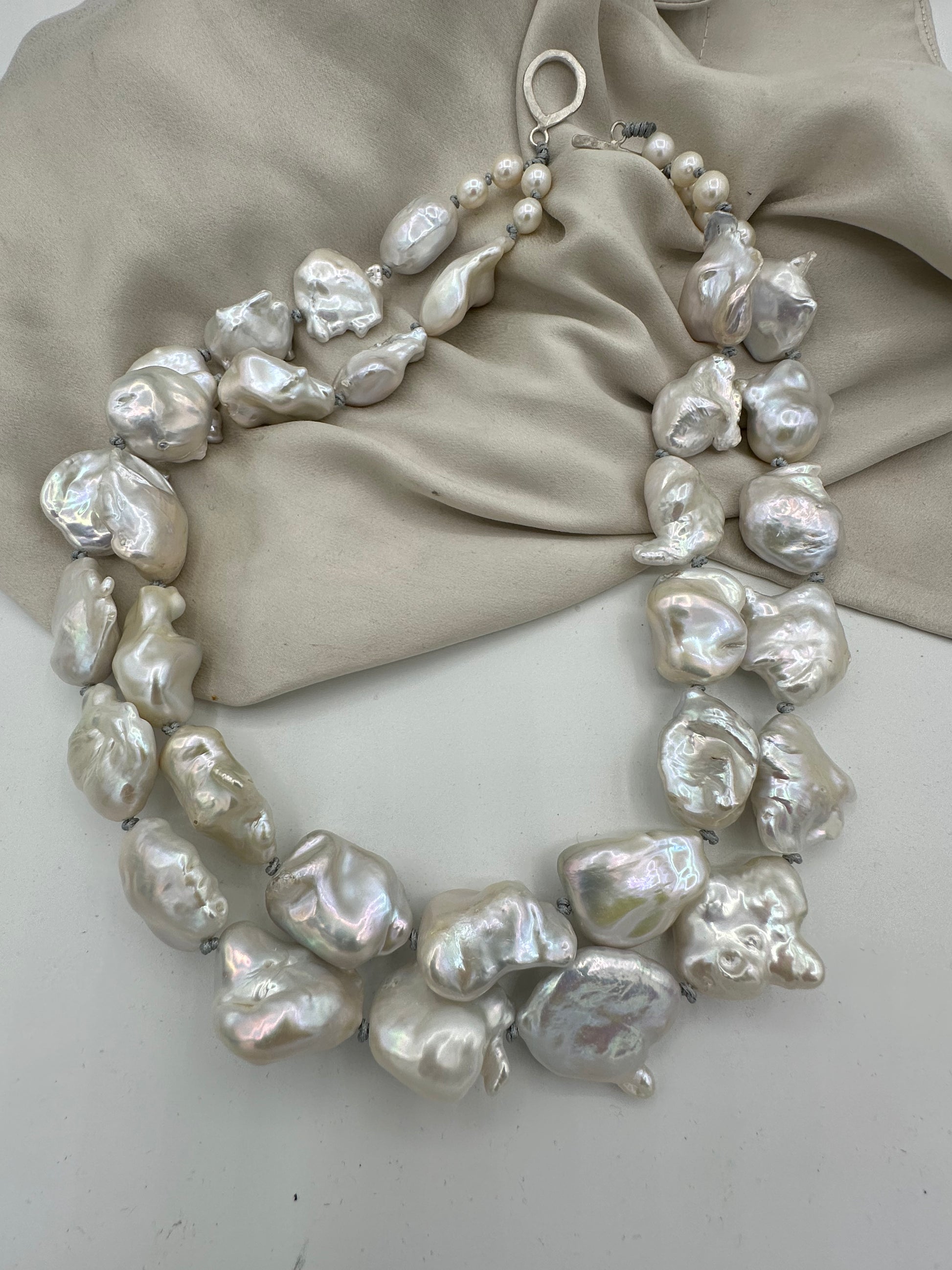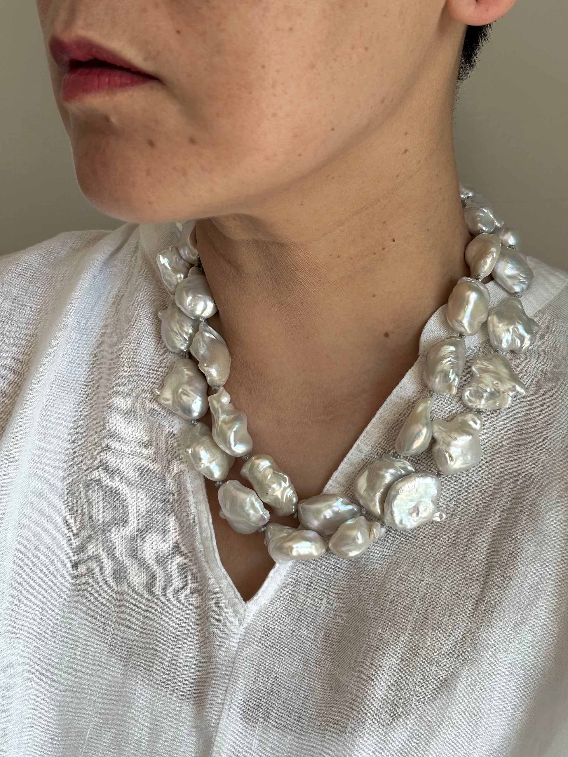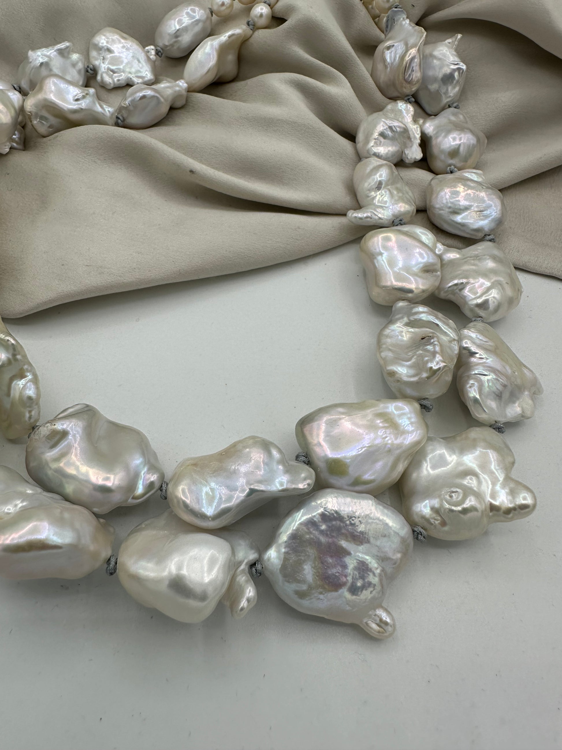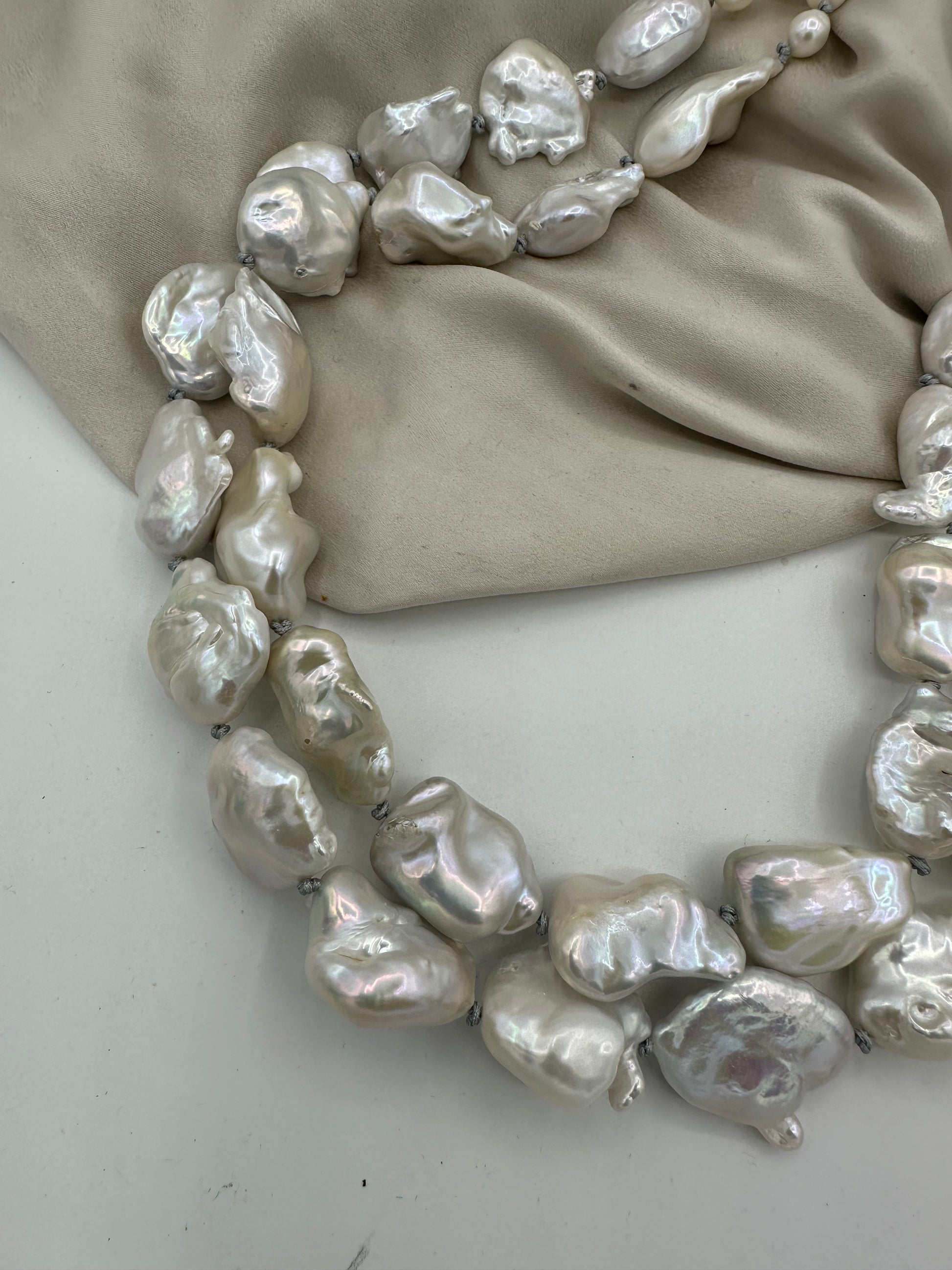 Hand knotted between each pearls, natural baroque pearls.