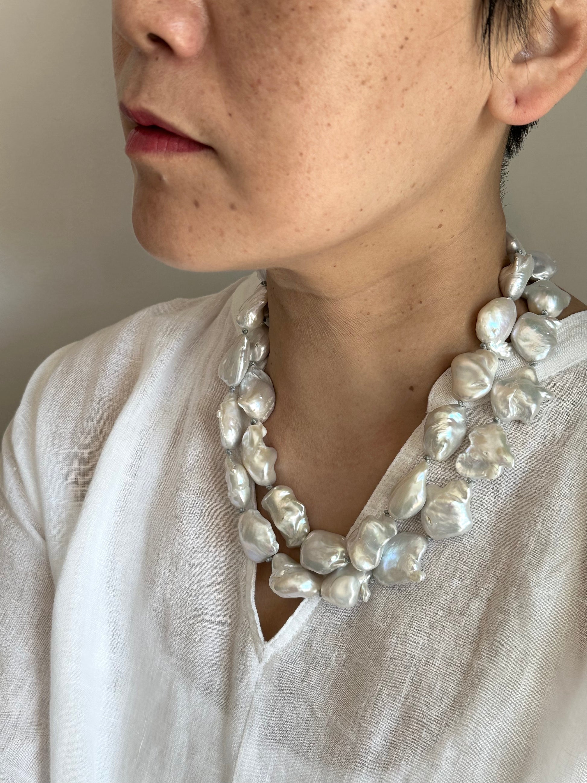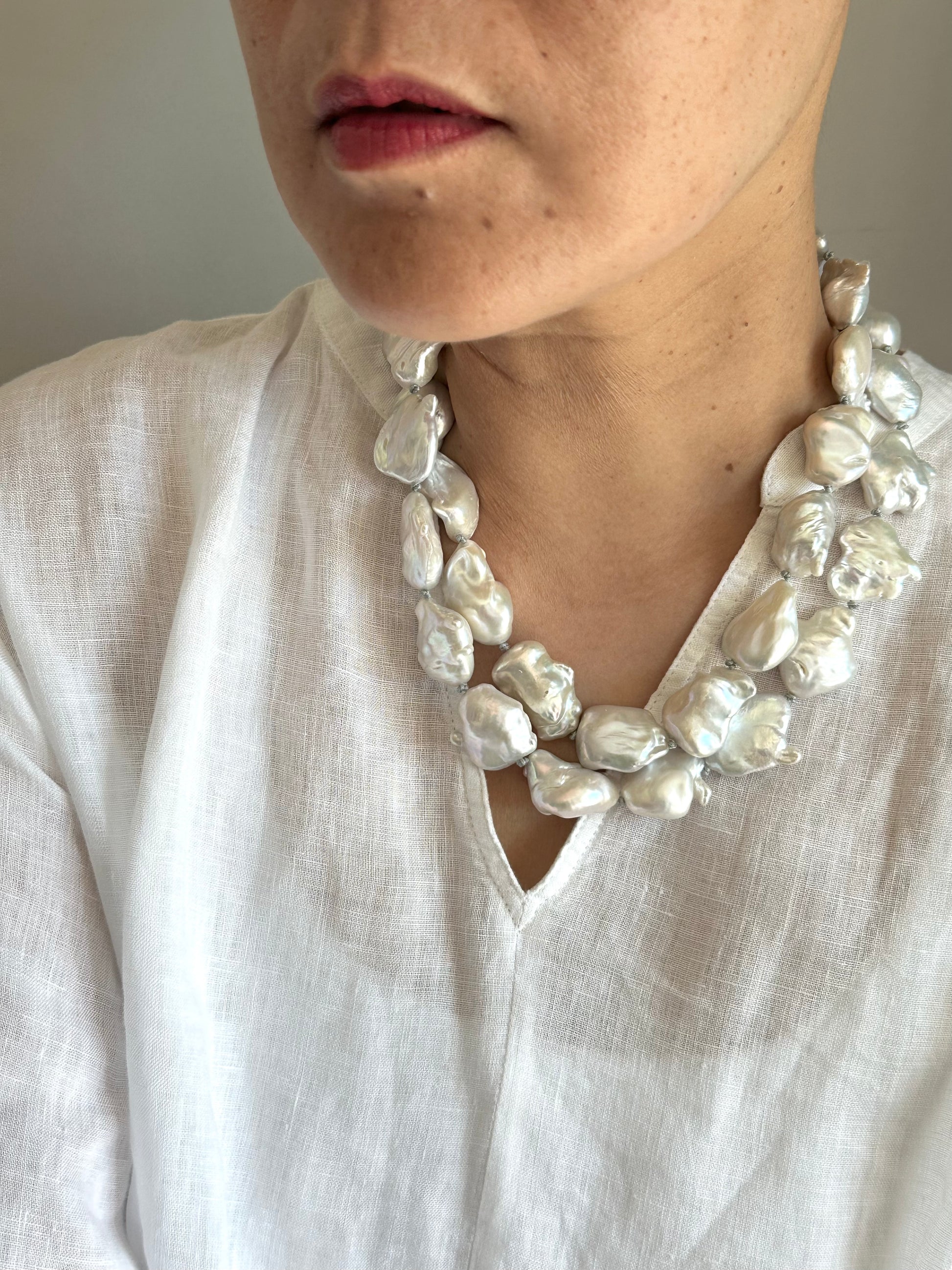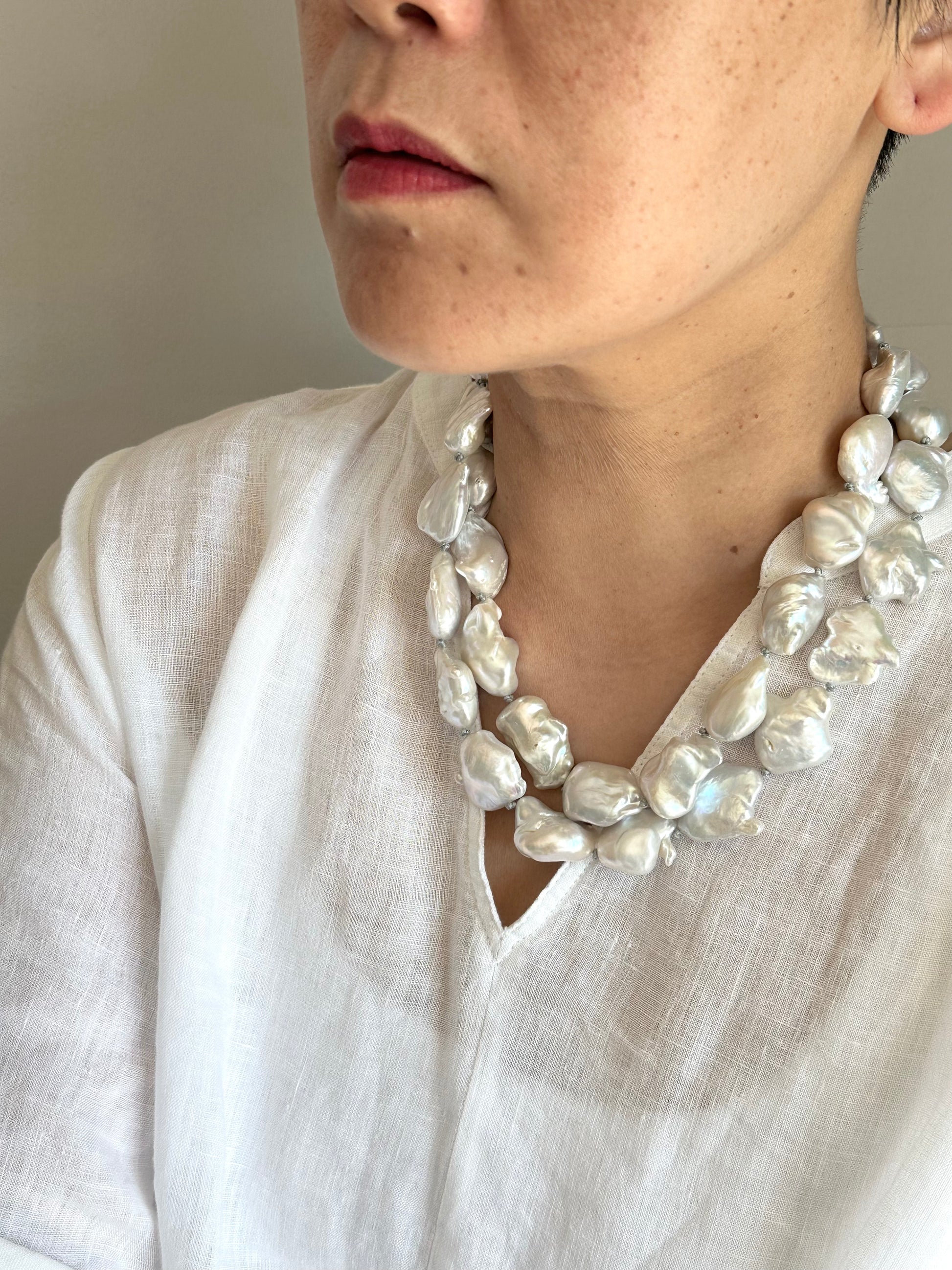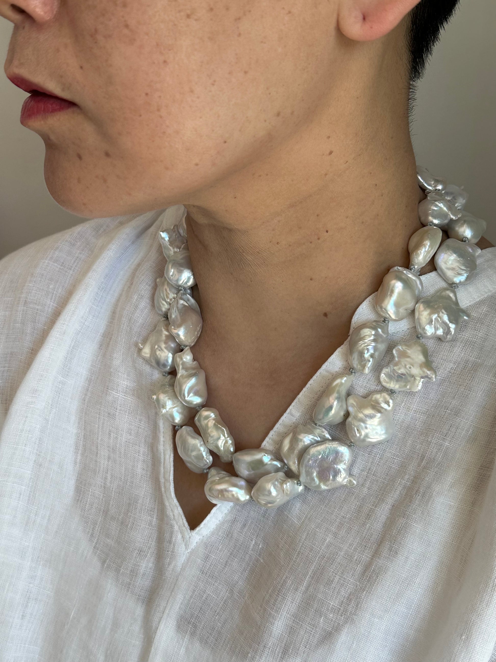 Hand knotted between each pearls, natural baroque pearls.