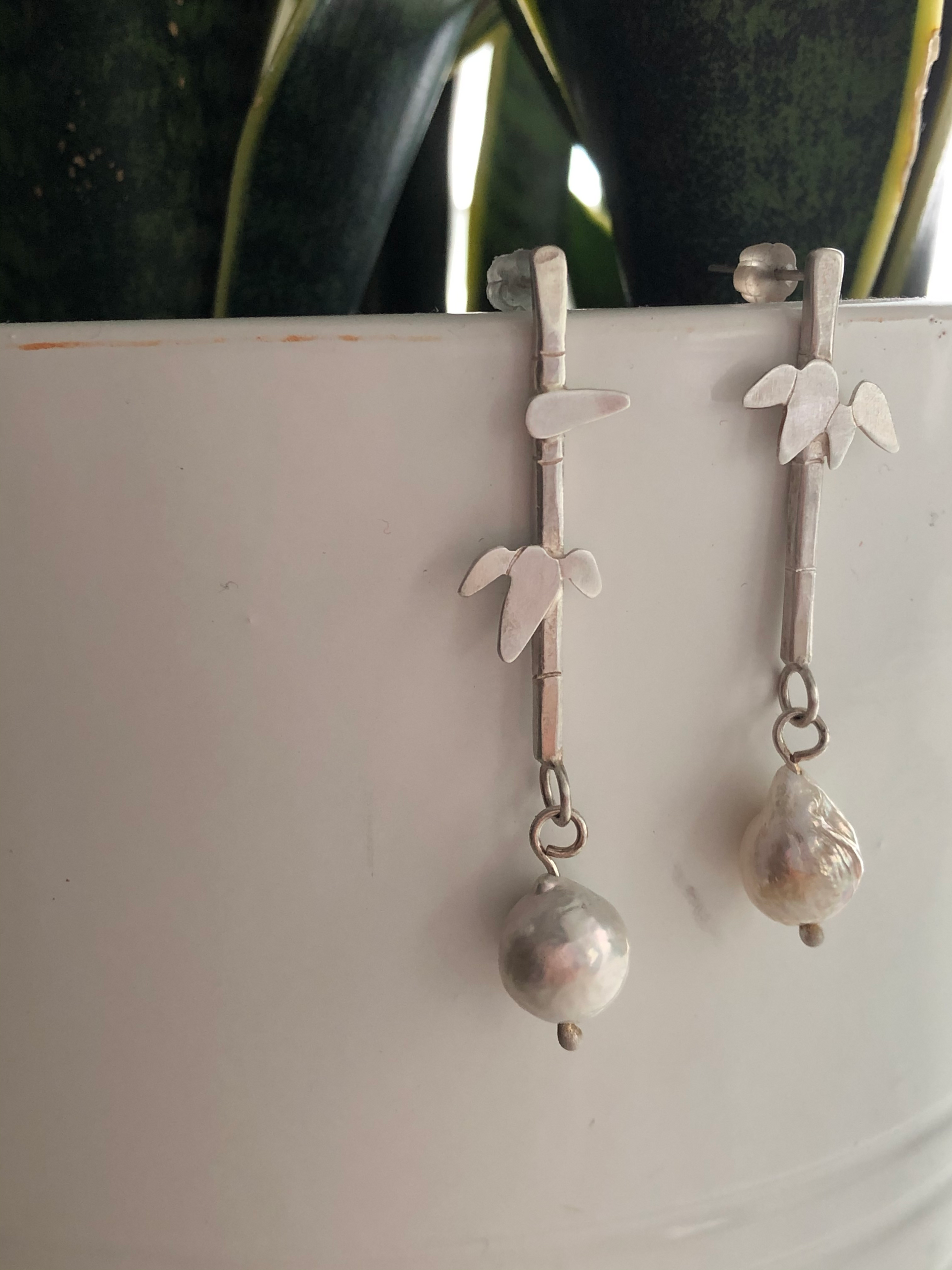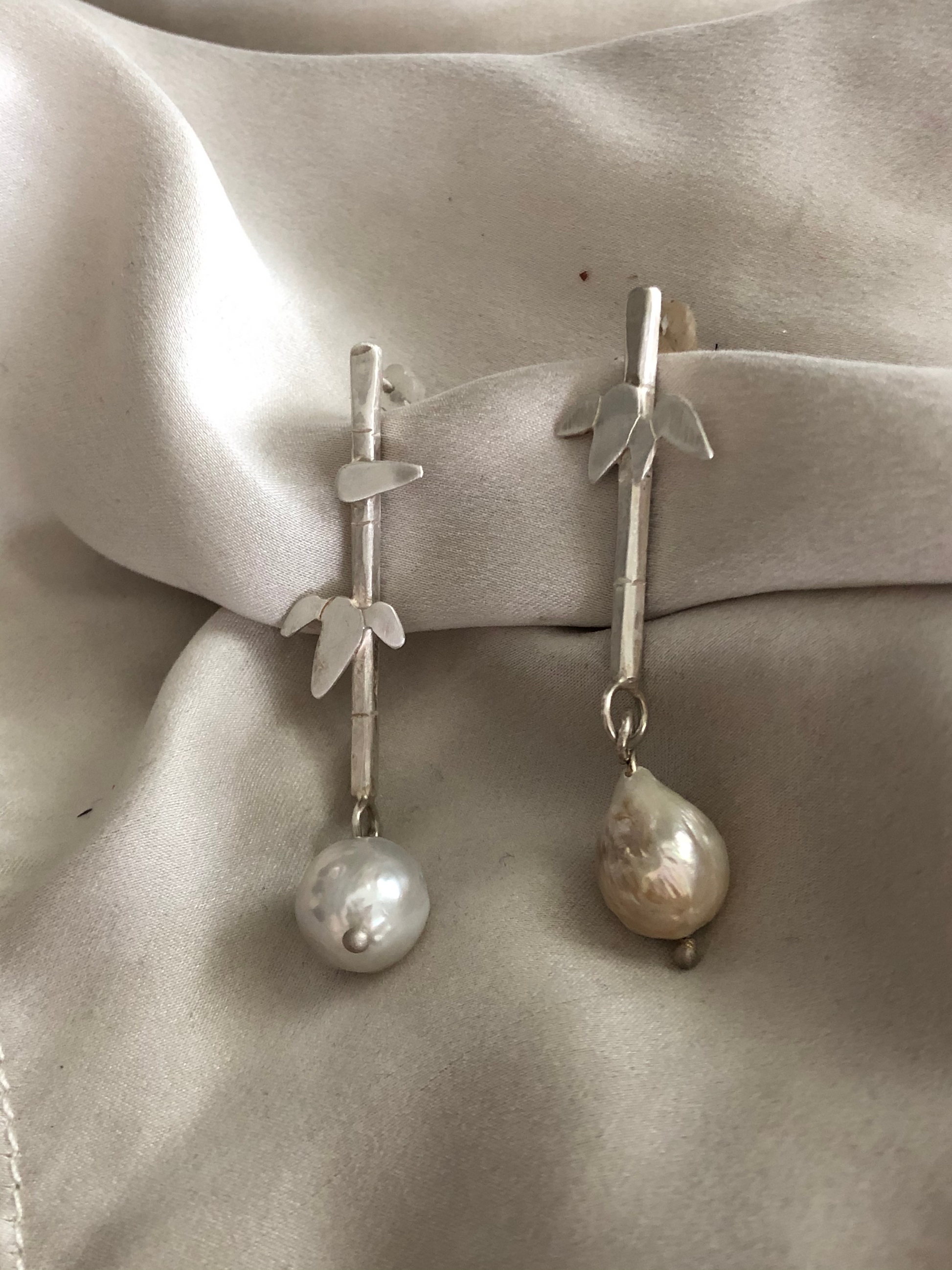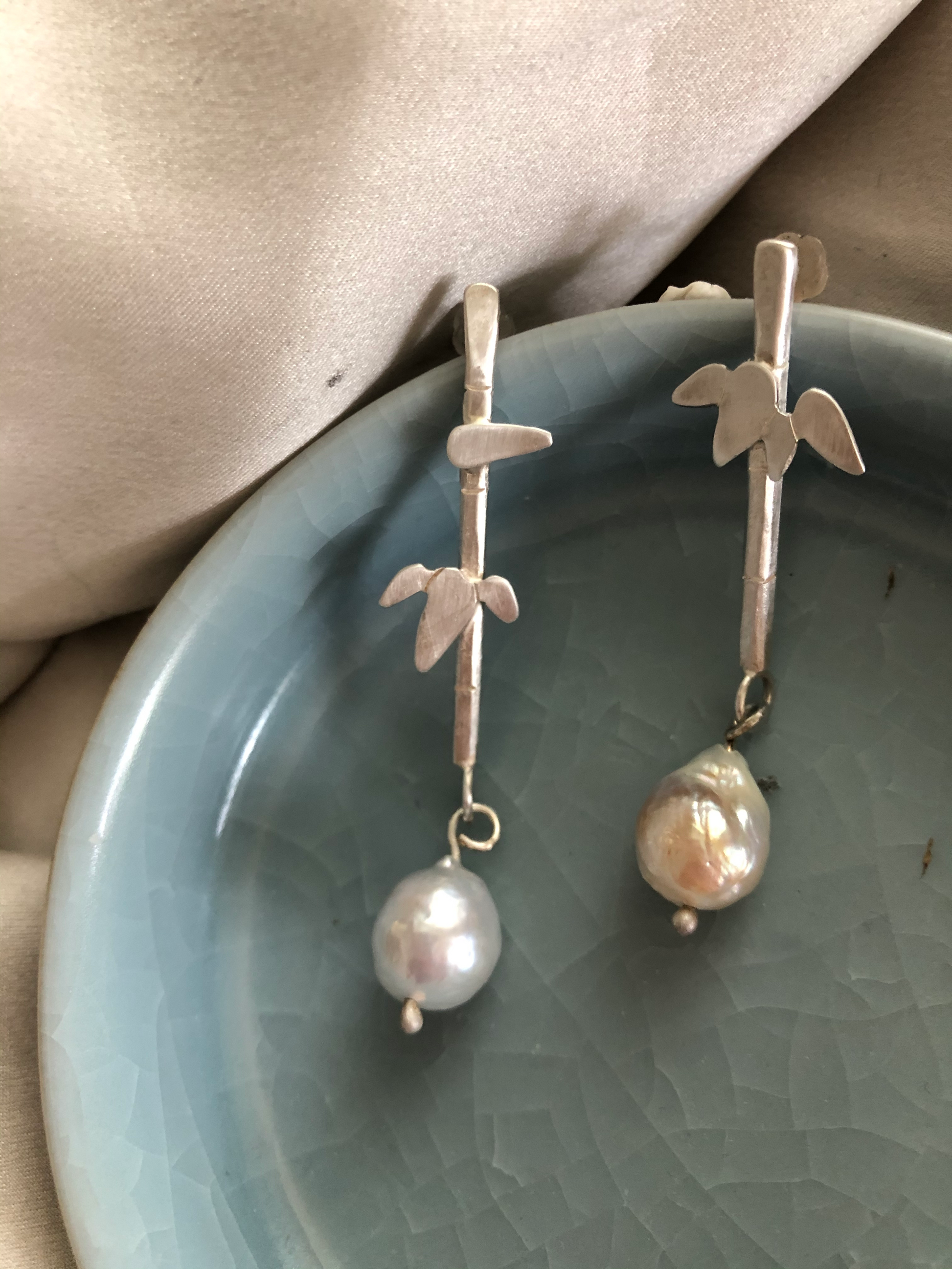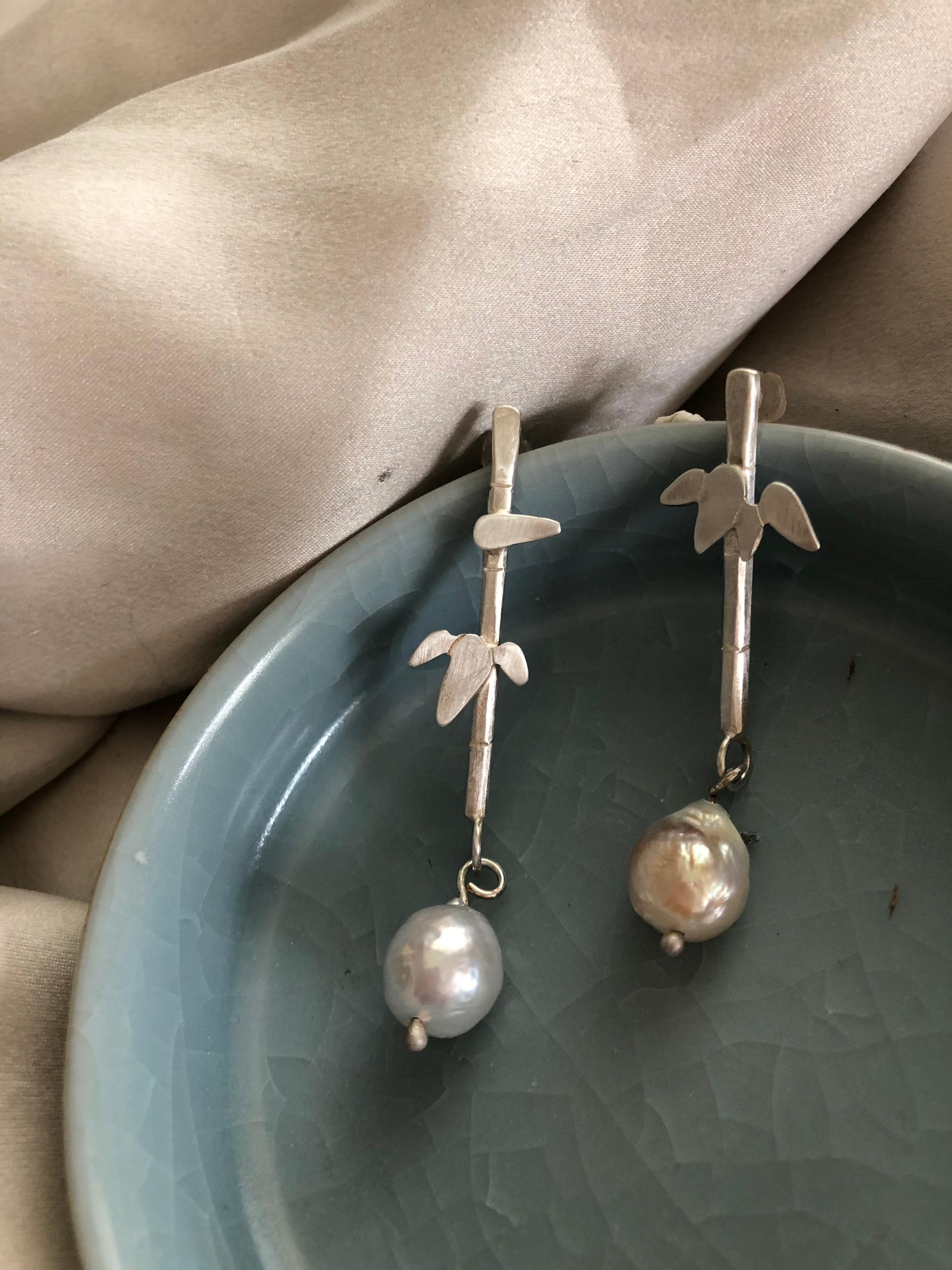 Free hand drawing and hammered bamboo , made of fine silver, with one piece of fresh water pearl.