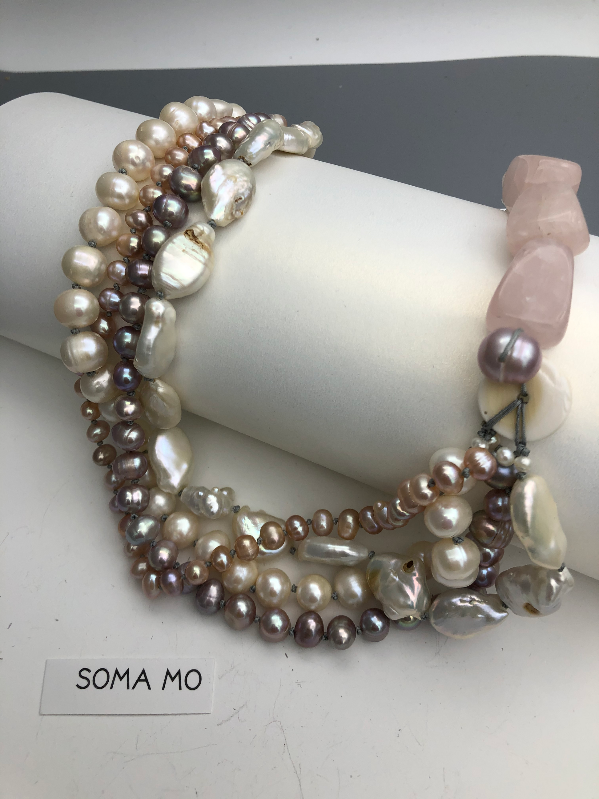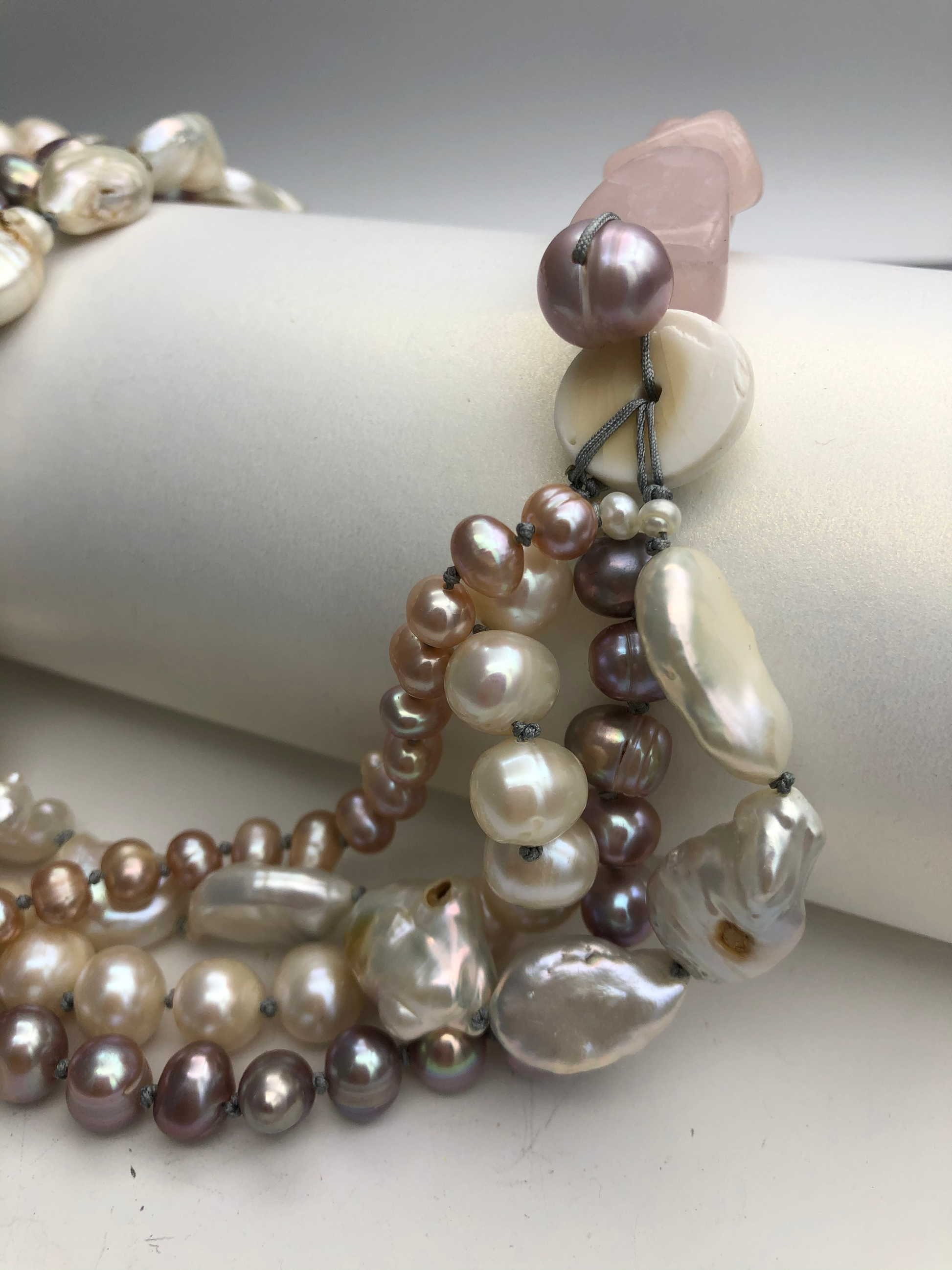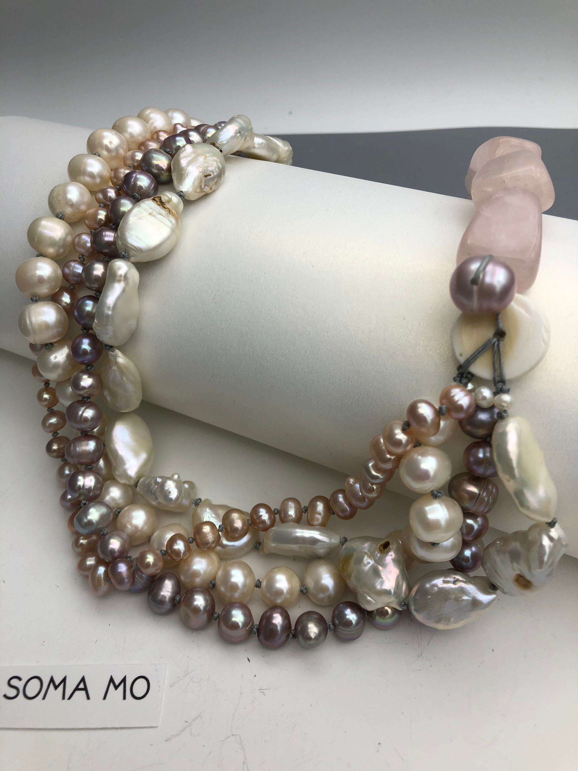 Multi strands of different pearls, in different colors and shape, plus a few chunk of rose quartz on one side, this necklace is a statement piece. Hand knotted between beads, can be resized for special request.