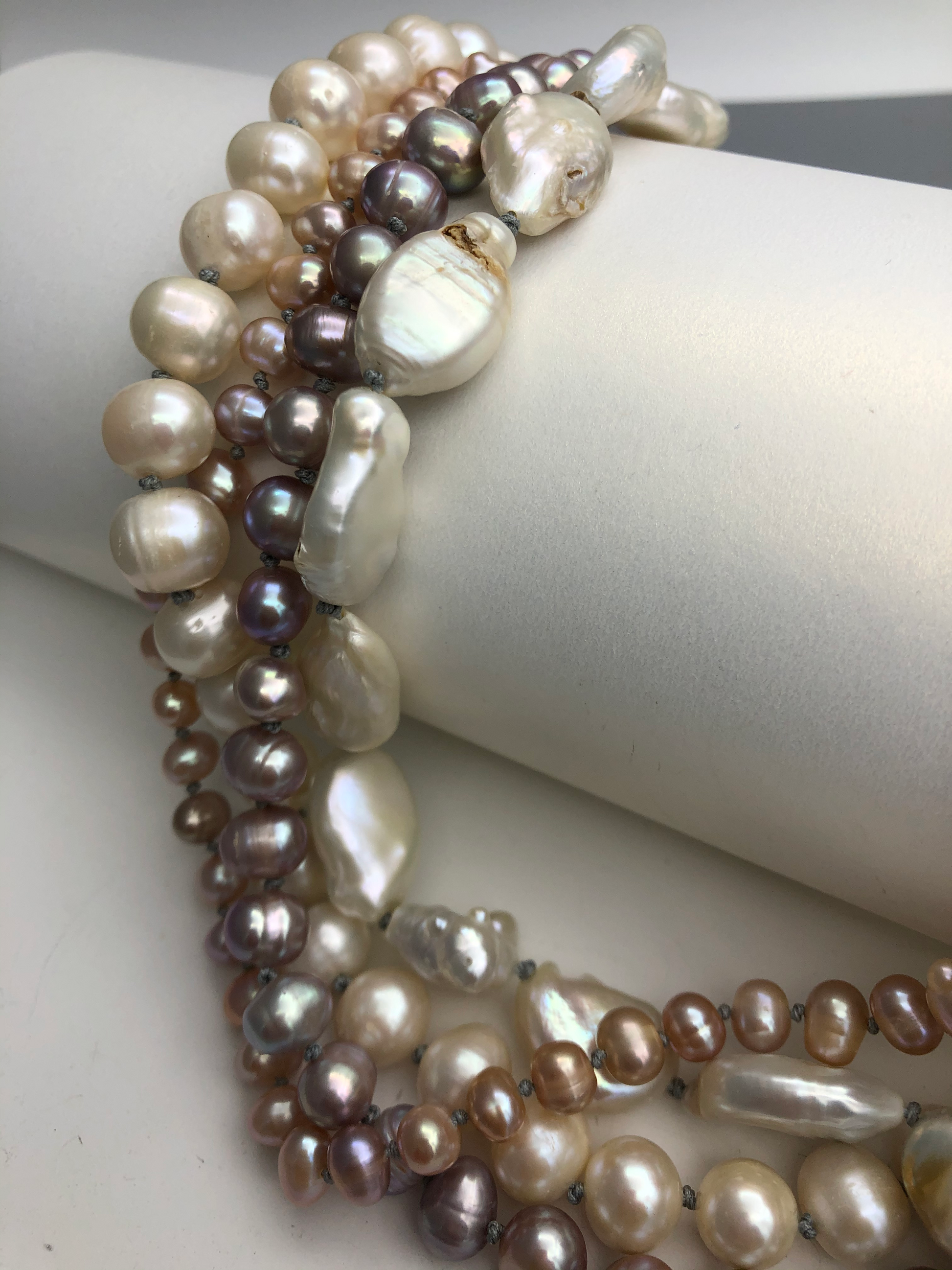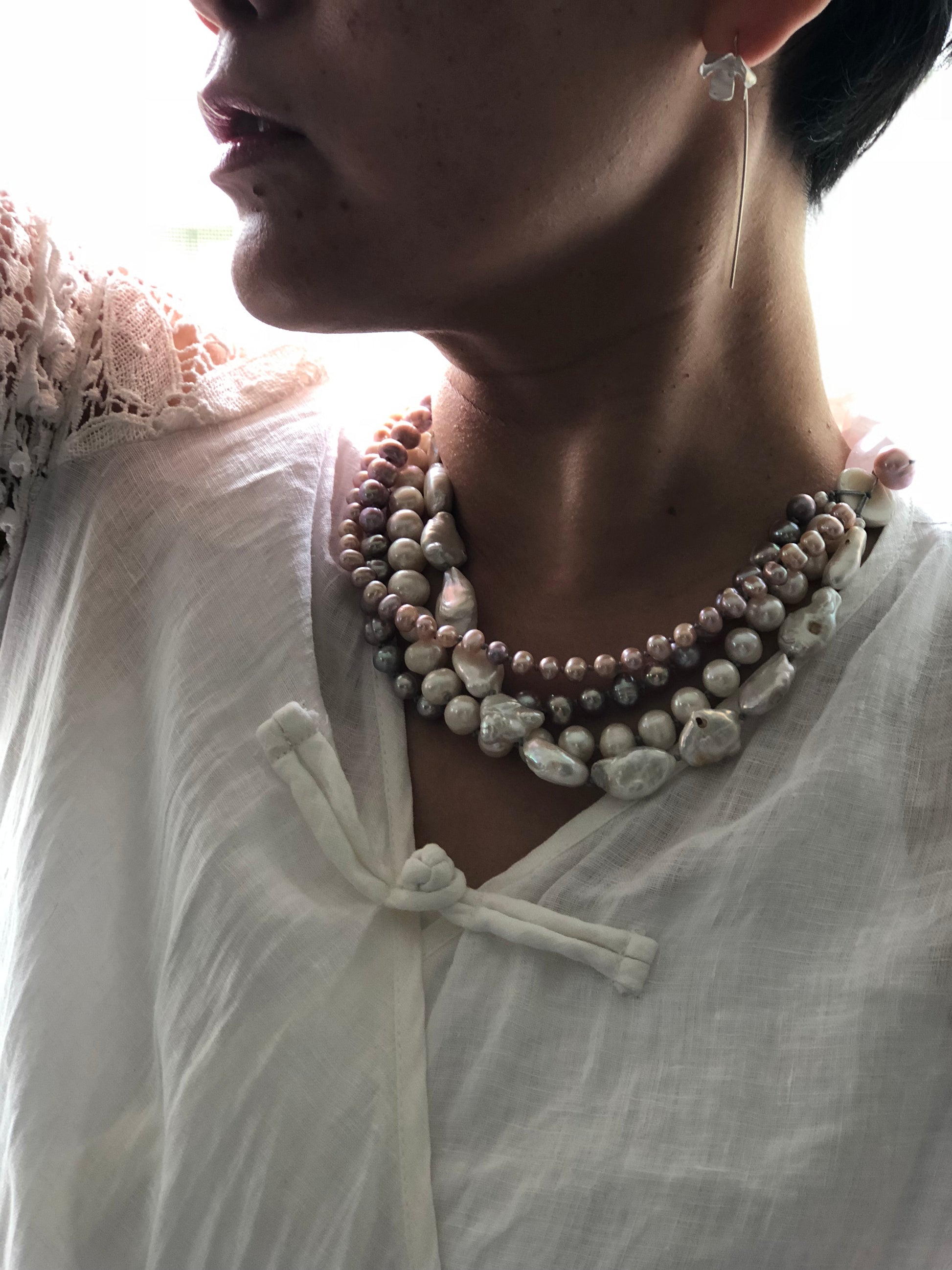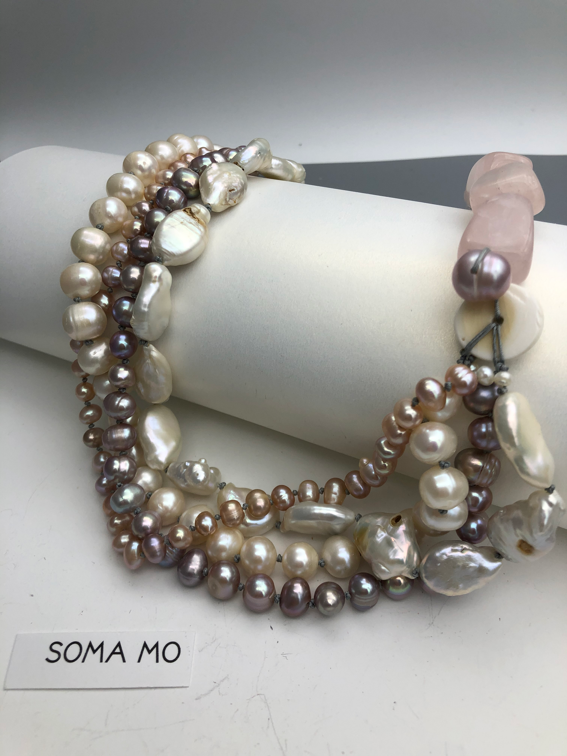 Multi strands of different pearls, in different colors and shape, plus a few chunk of rose quartz on one side, this necklace is a statement piece. Hand knotted between beads, can be resized for special request.