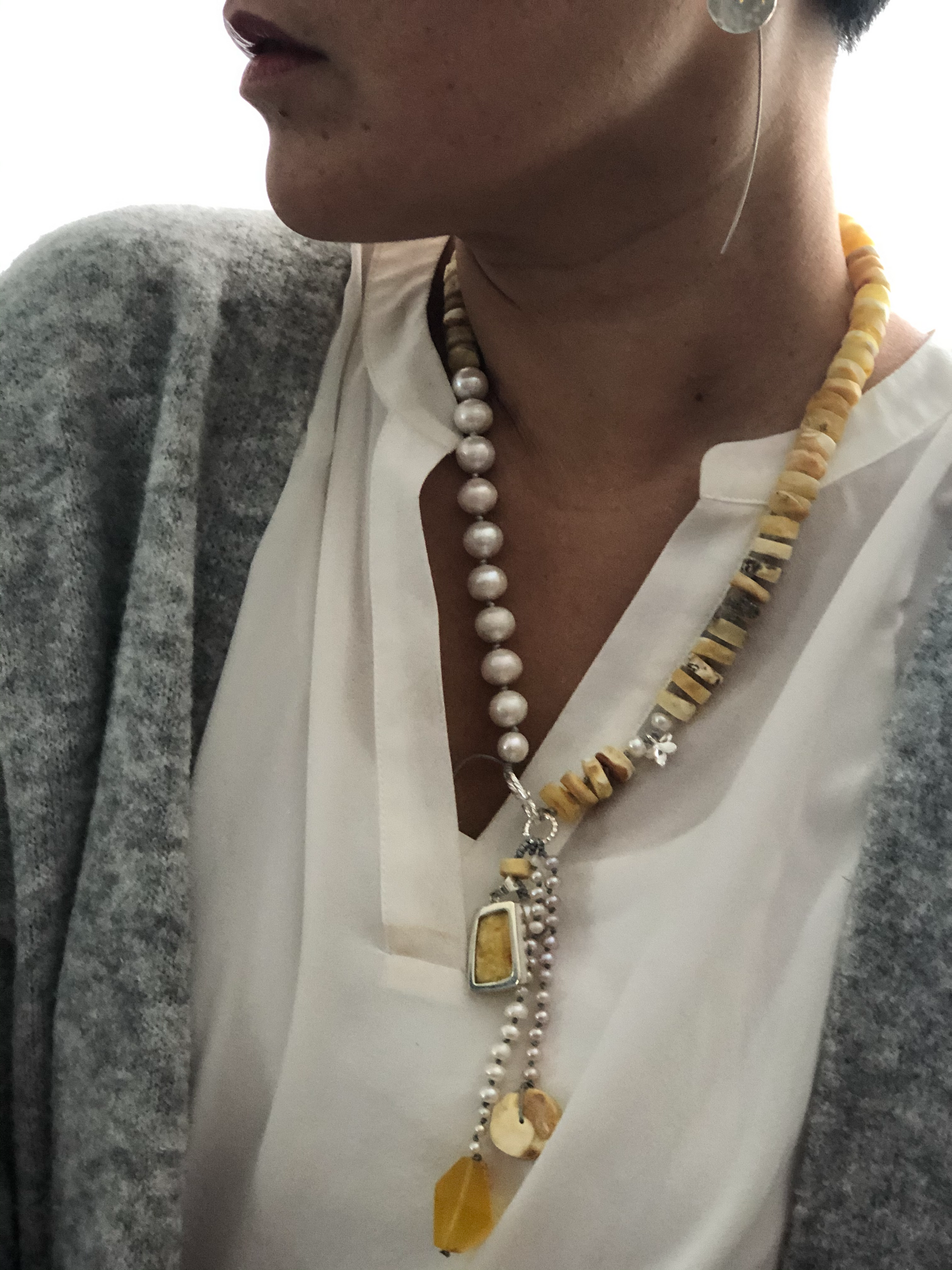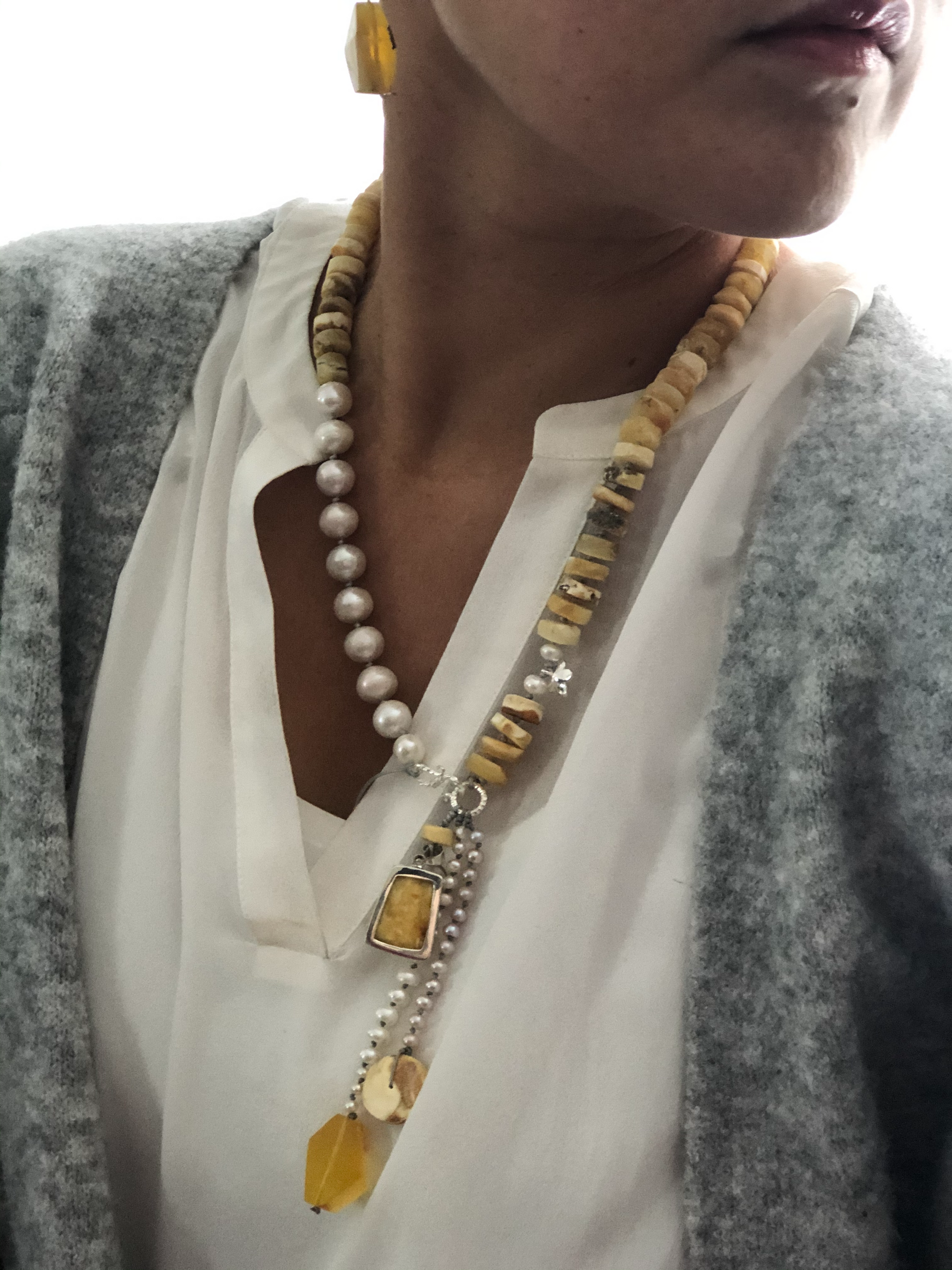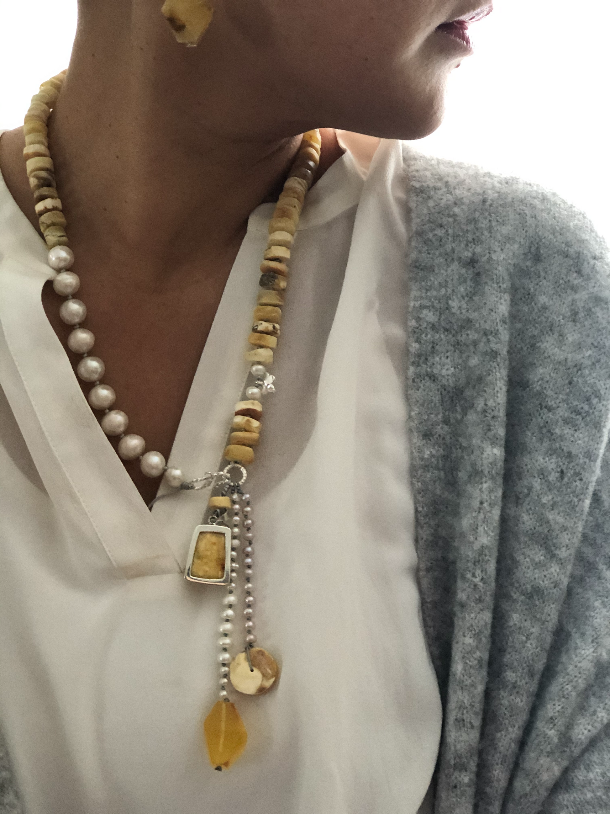 Materials : Baltic amber , fresh water pearl, amber pendent with silver