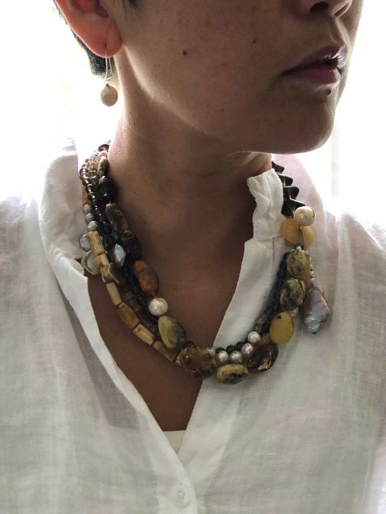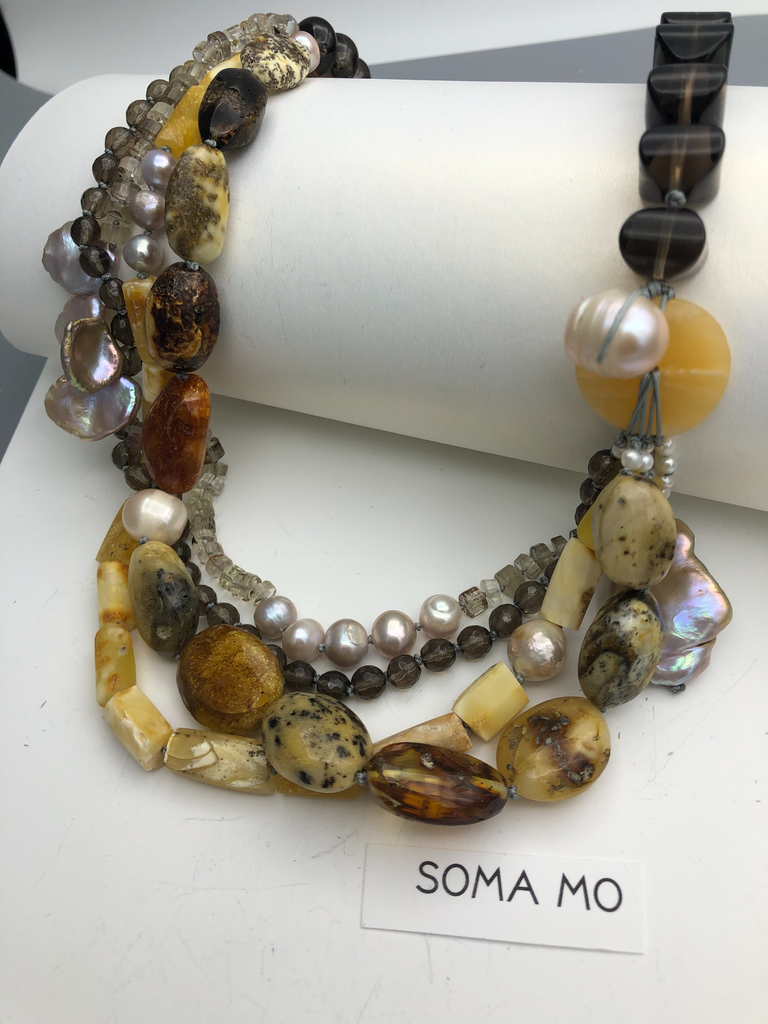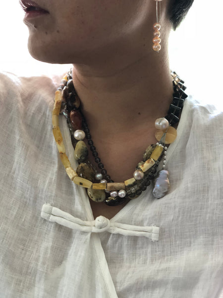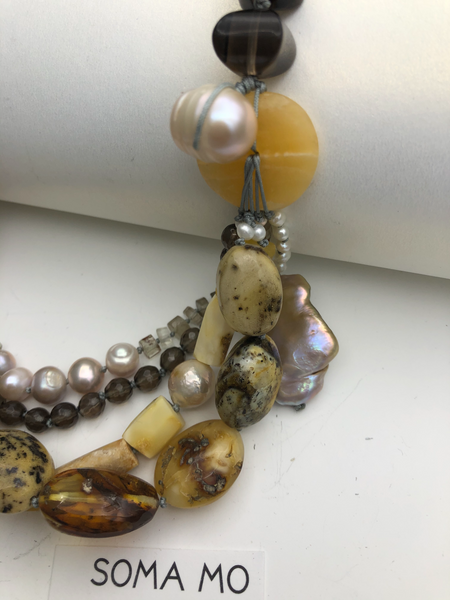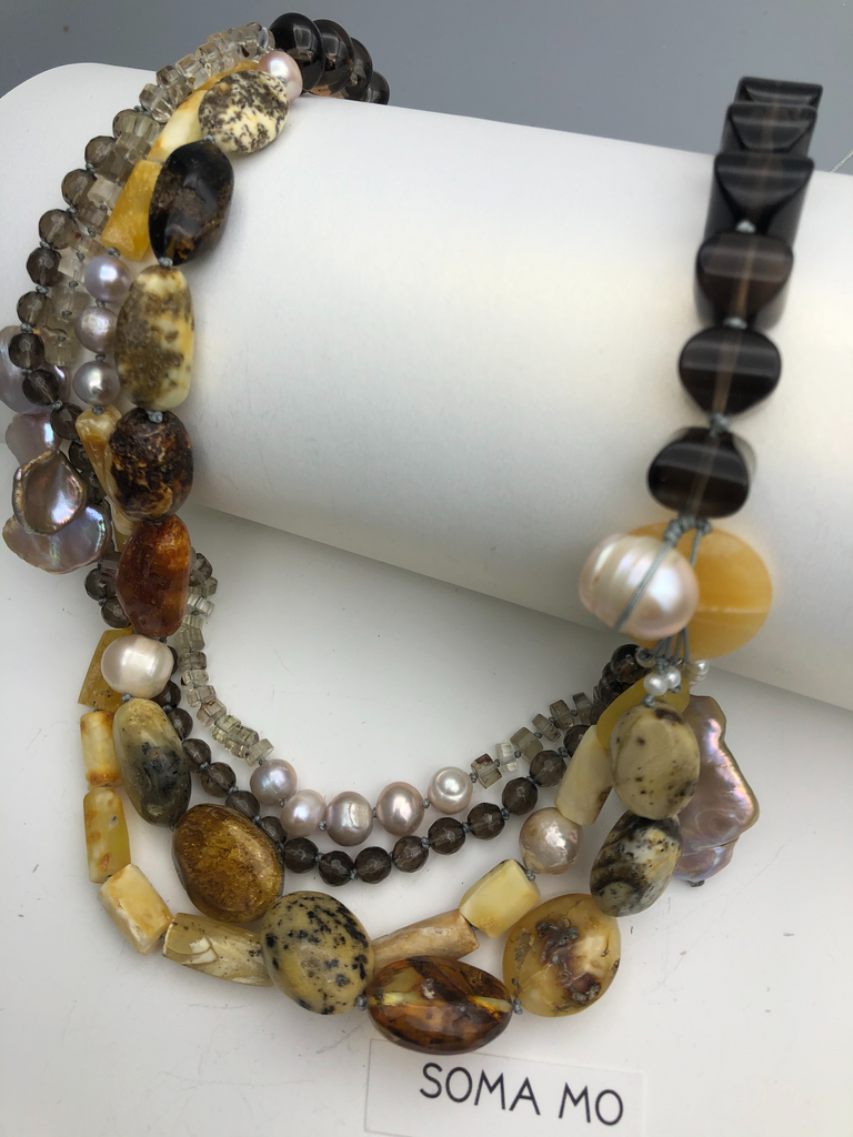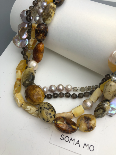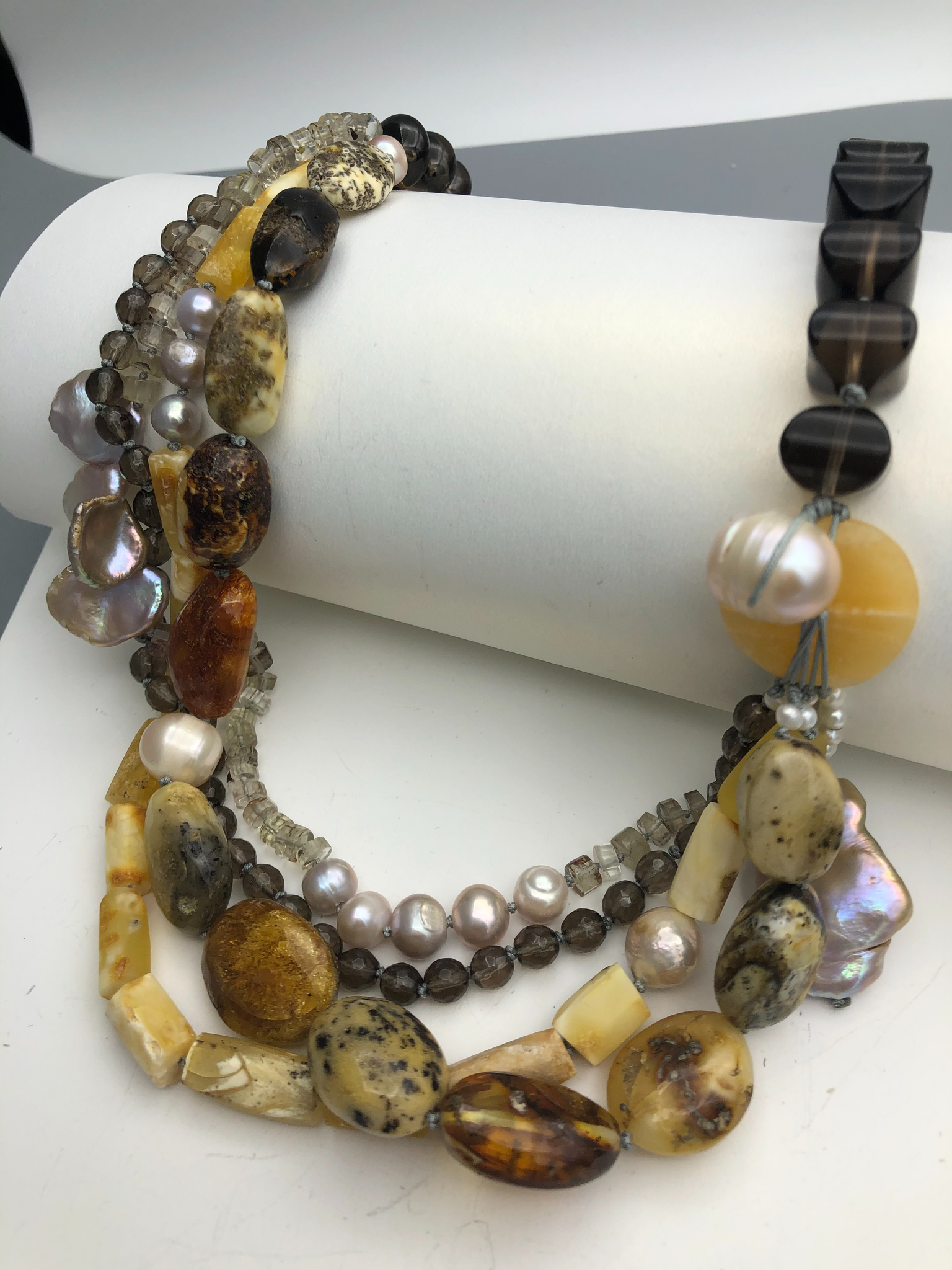 Materials : Baltic amber, fresh water pearl, smoky quartz