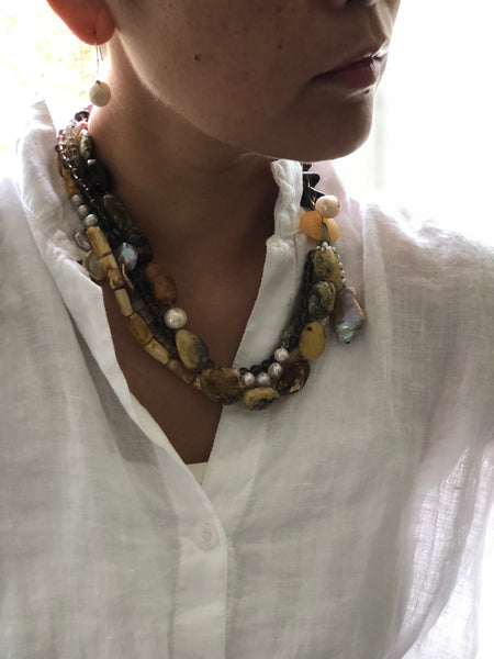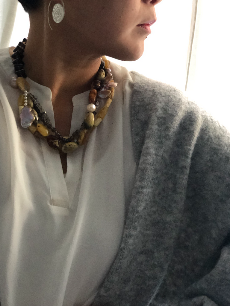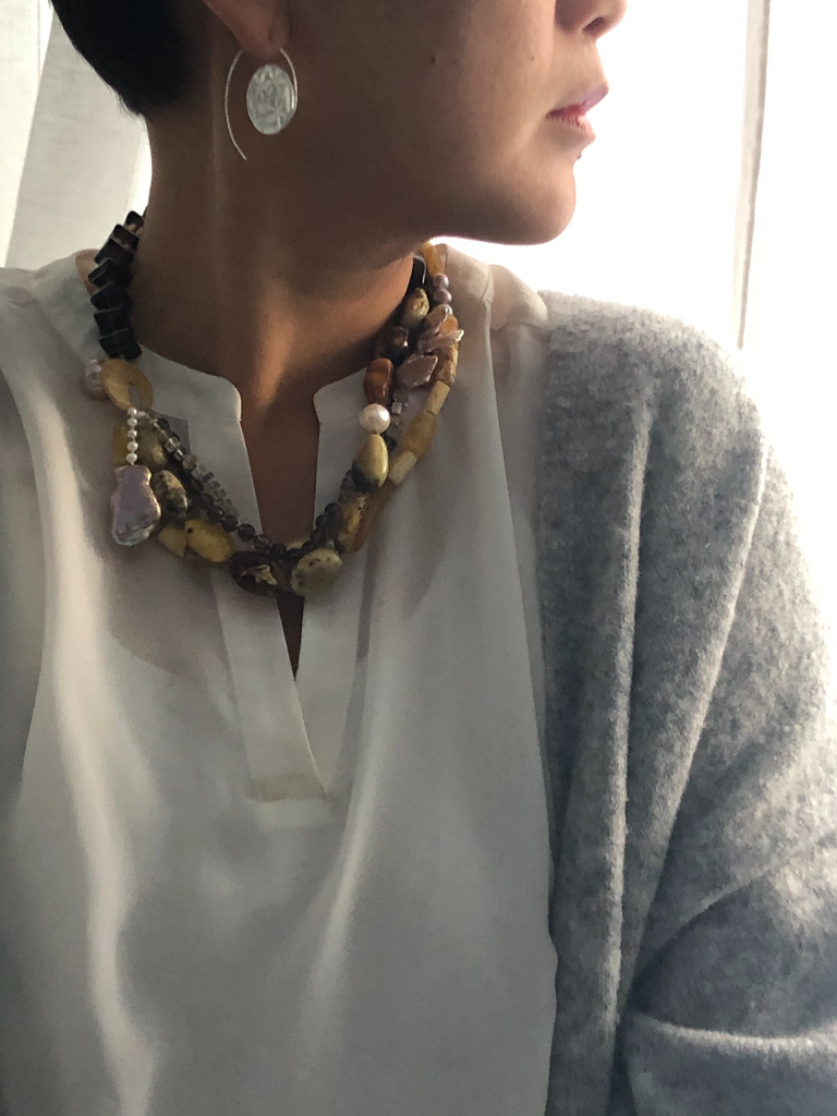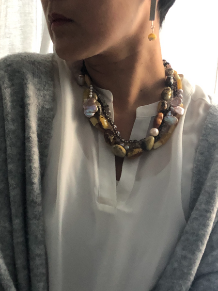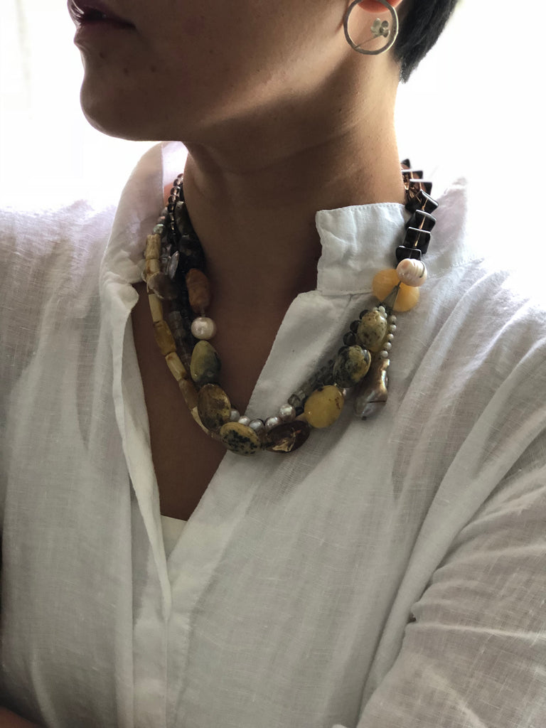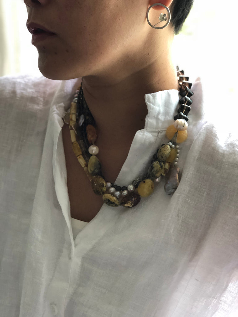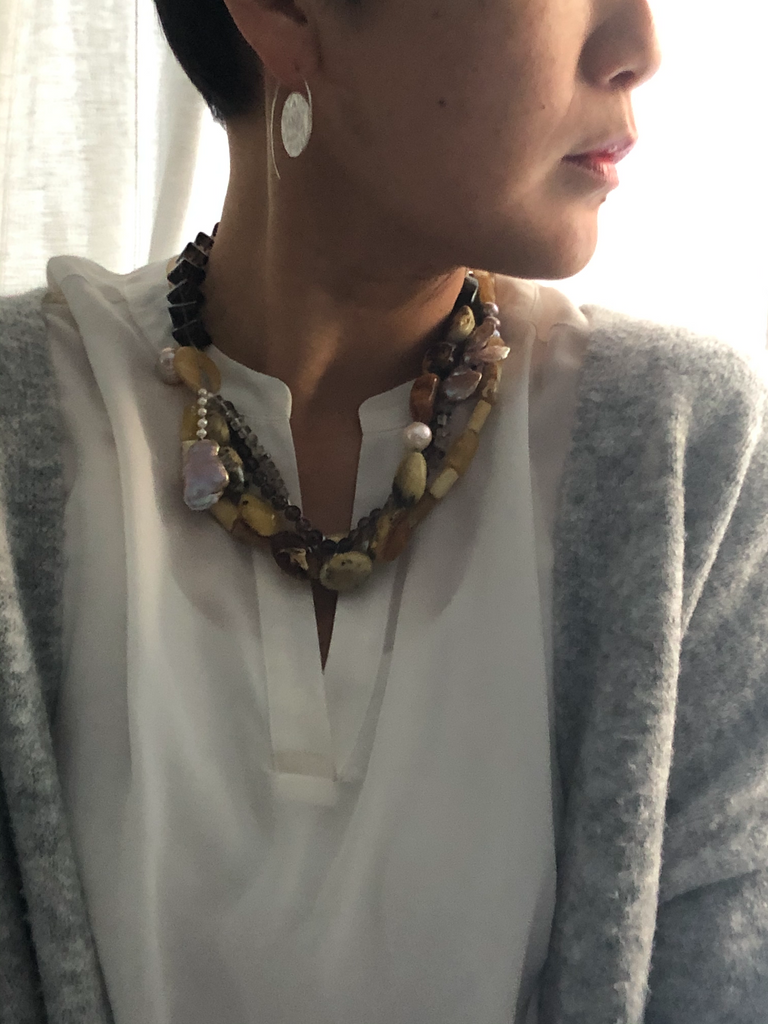 Materials : Baltic amber, fresh water pearl, smoky quartz