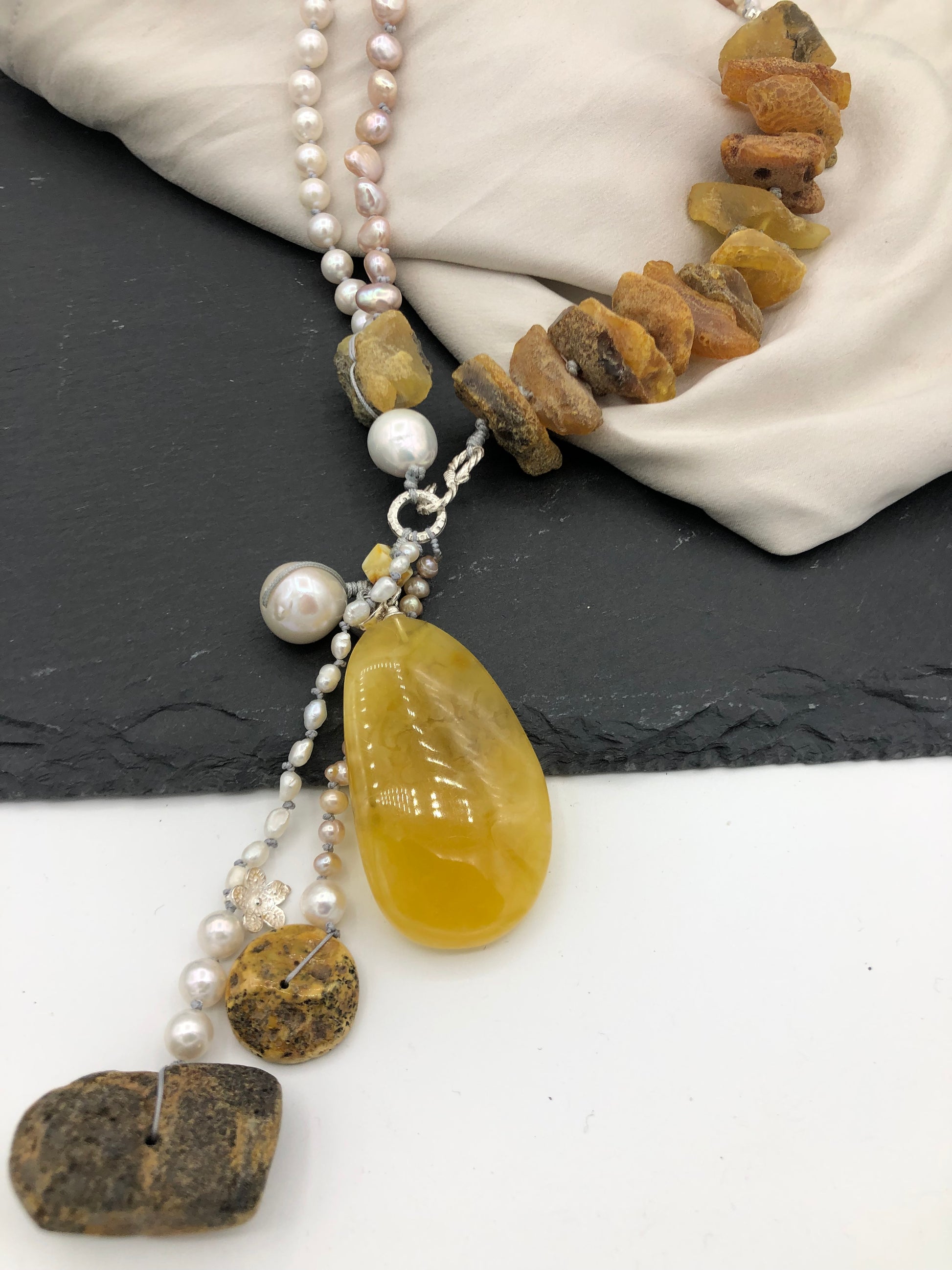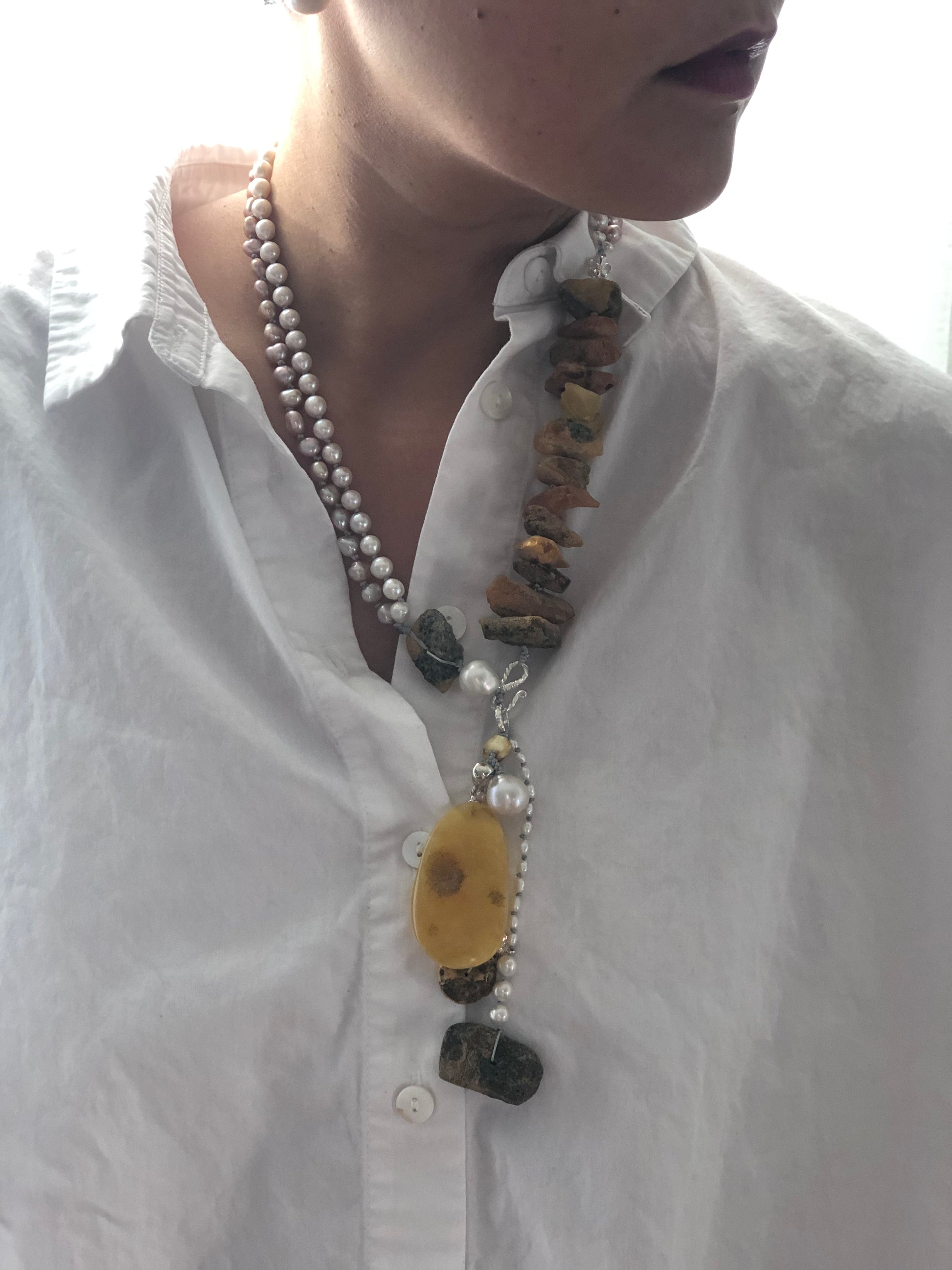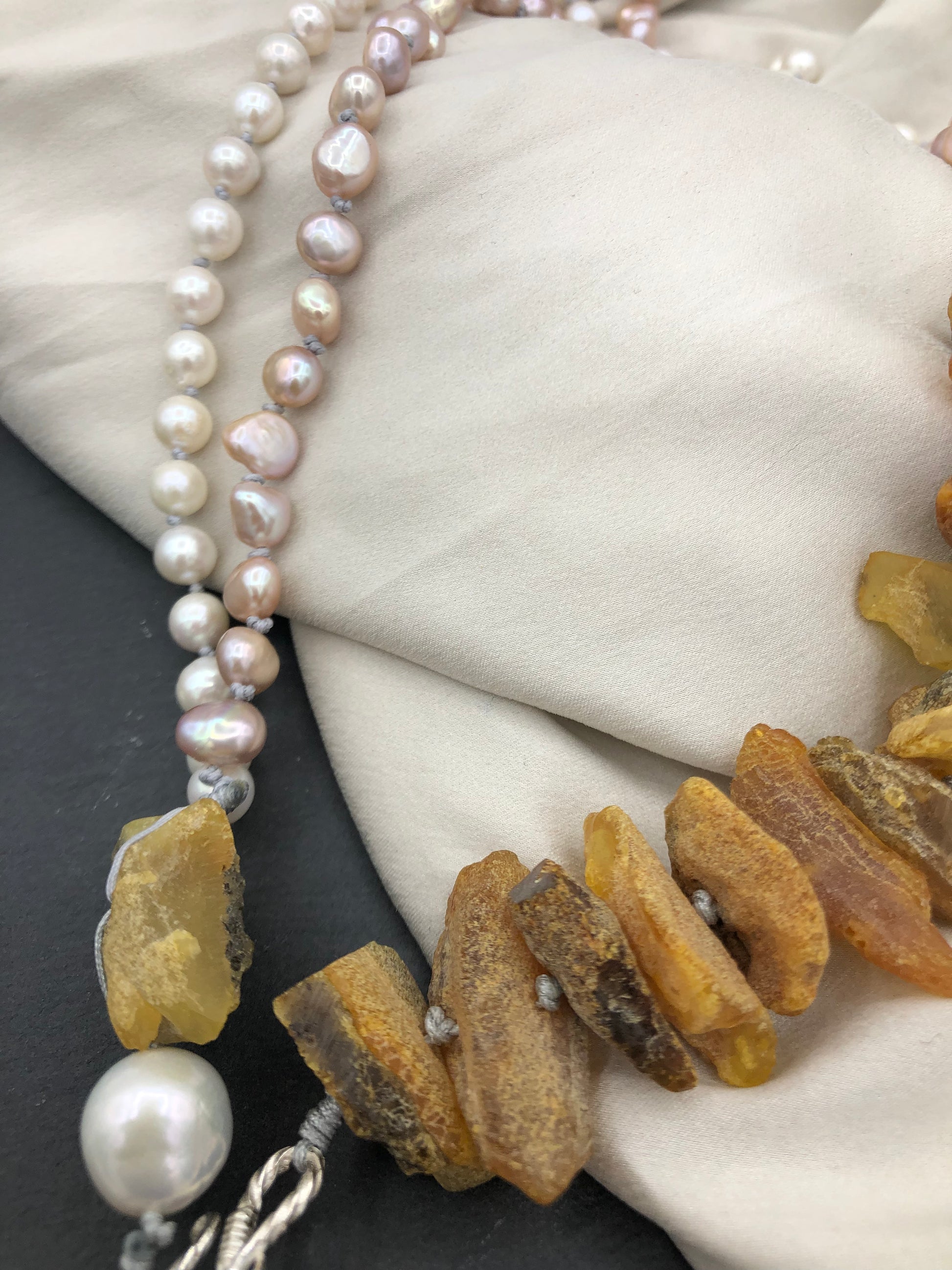 Materials : Baltic amber, fresh water pearl.