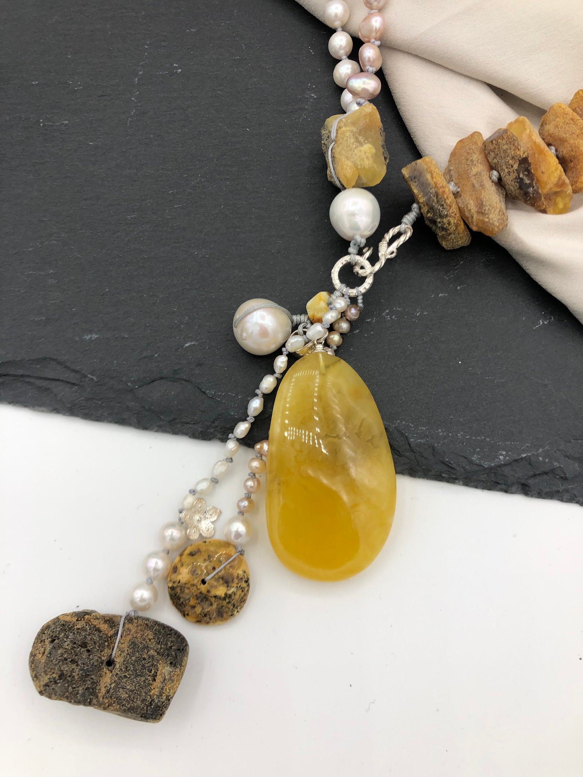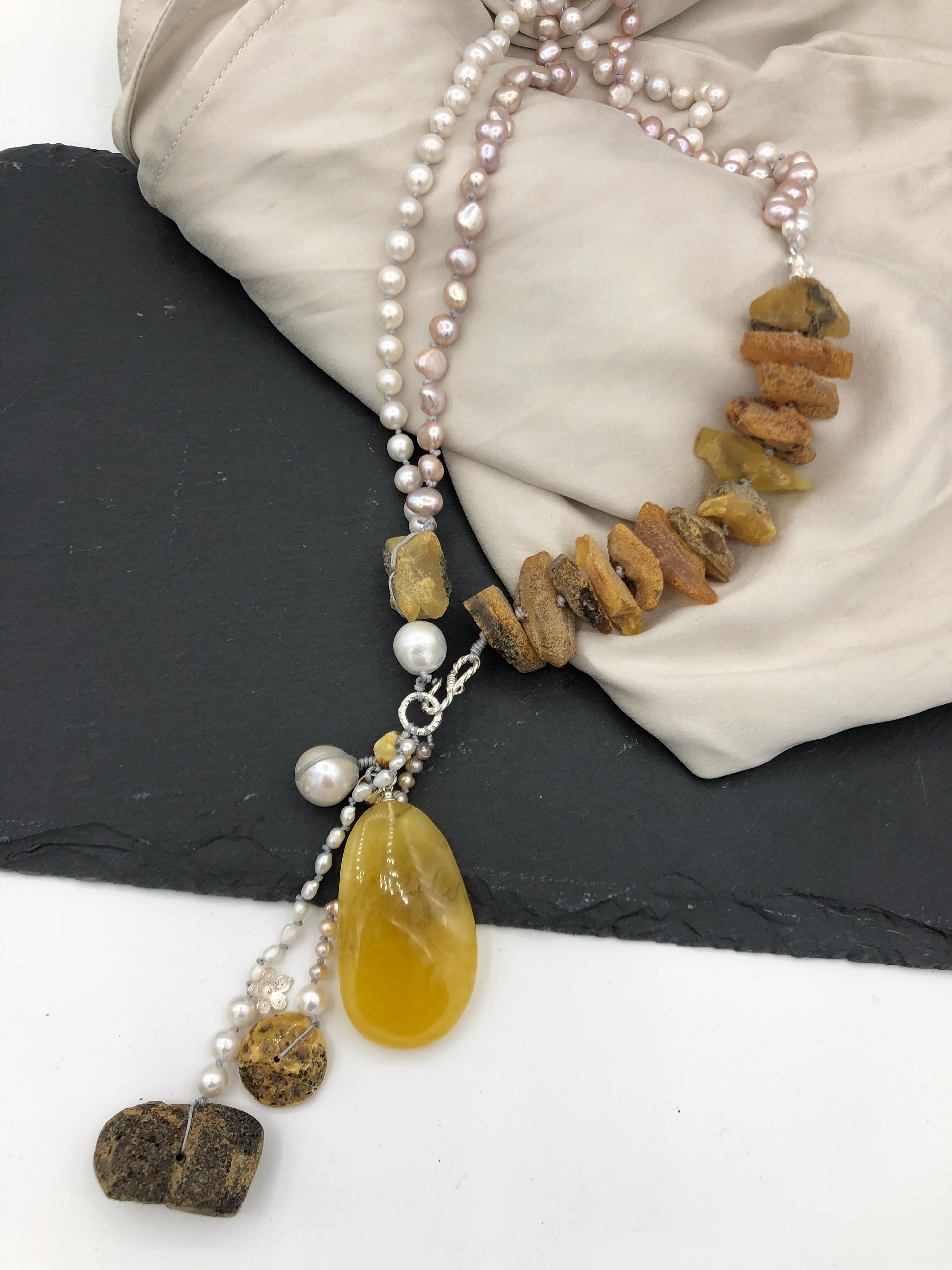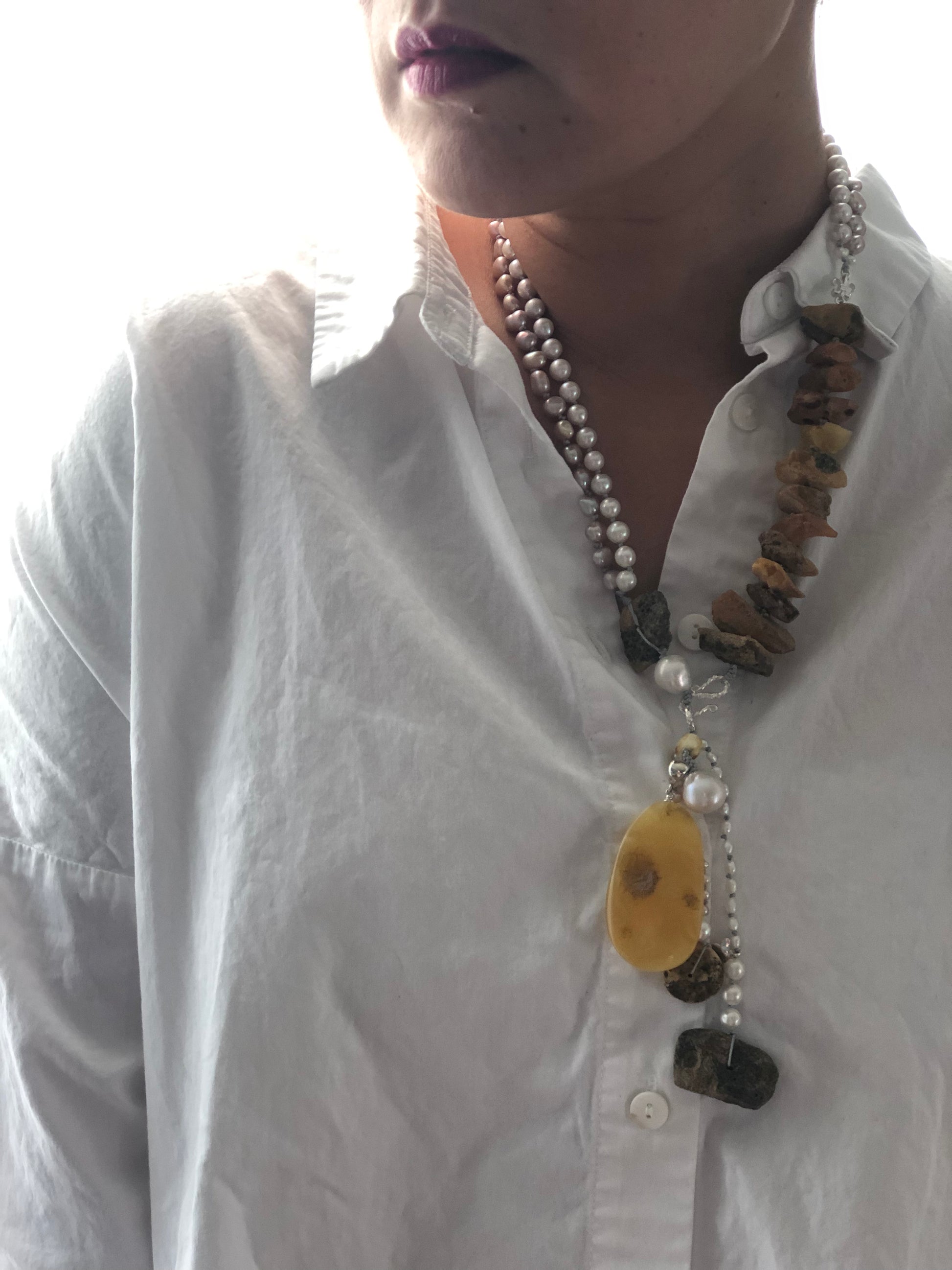 Materials : Baltic amber, fresh water pearl.