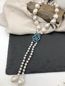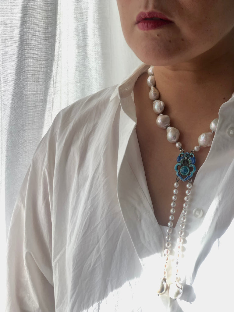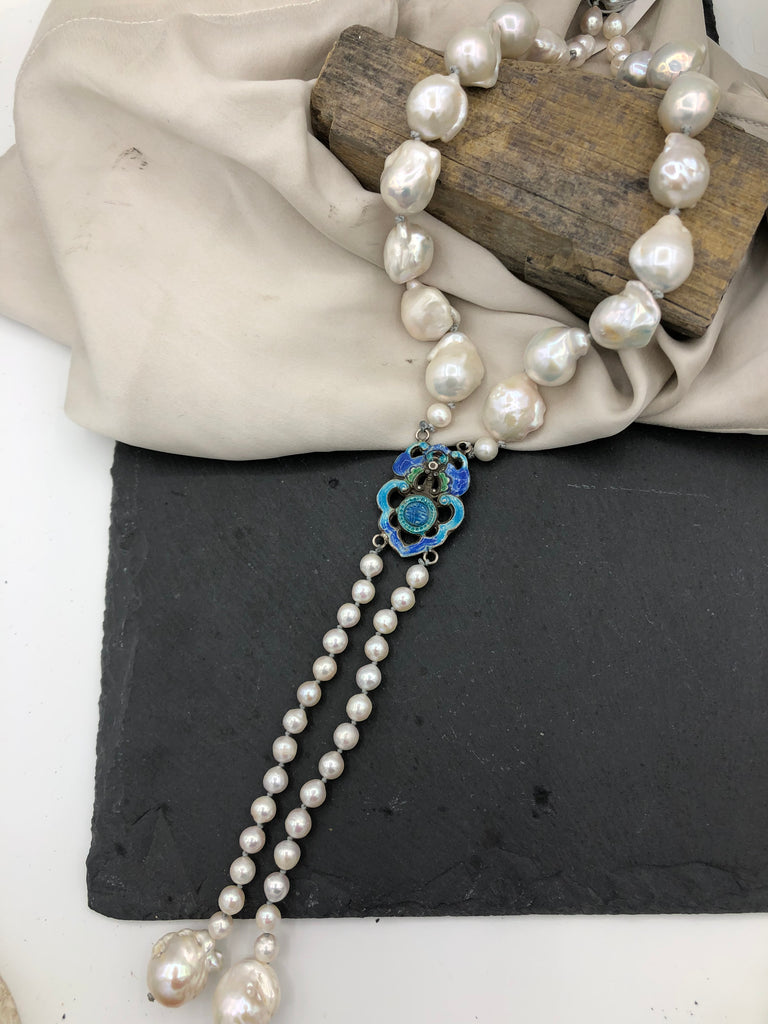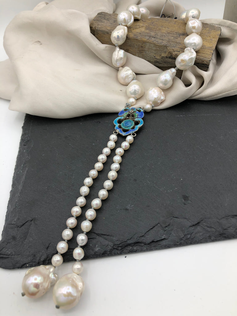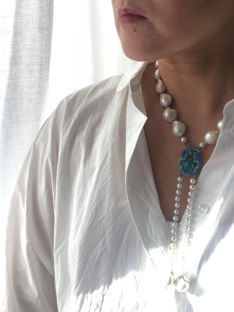 Materials : Baroque pearl, akoya pearl, old Chinese silver enamel pendent