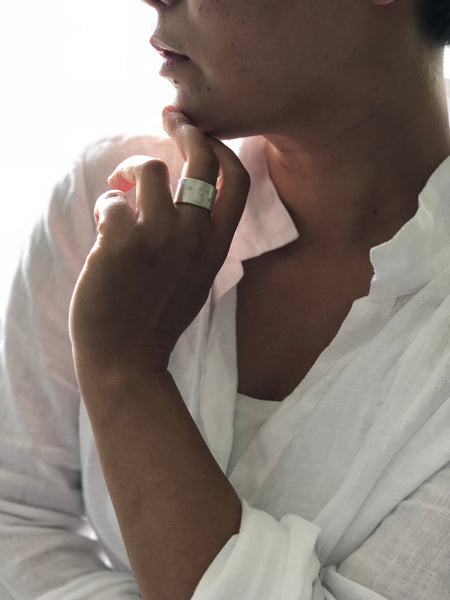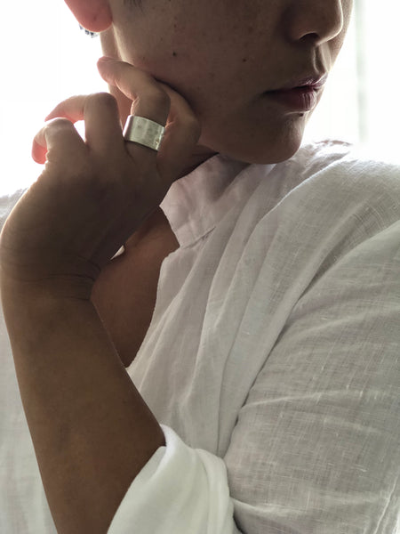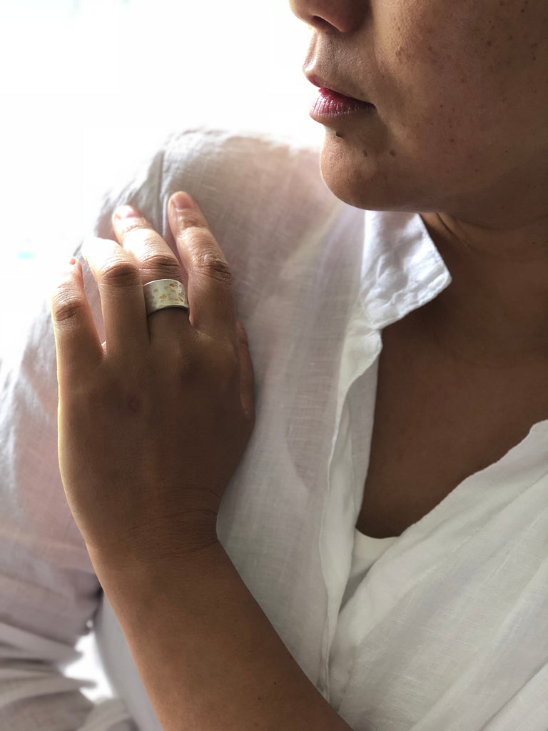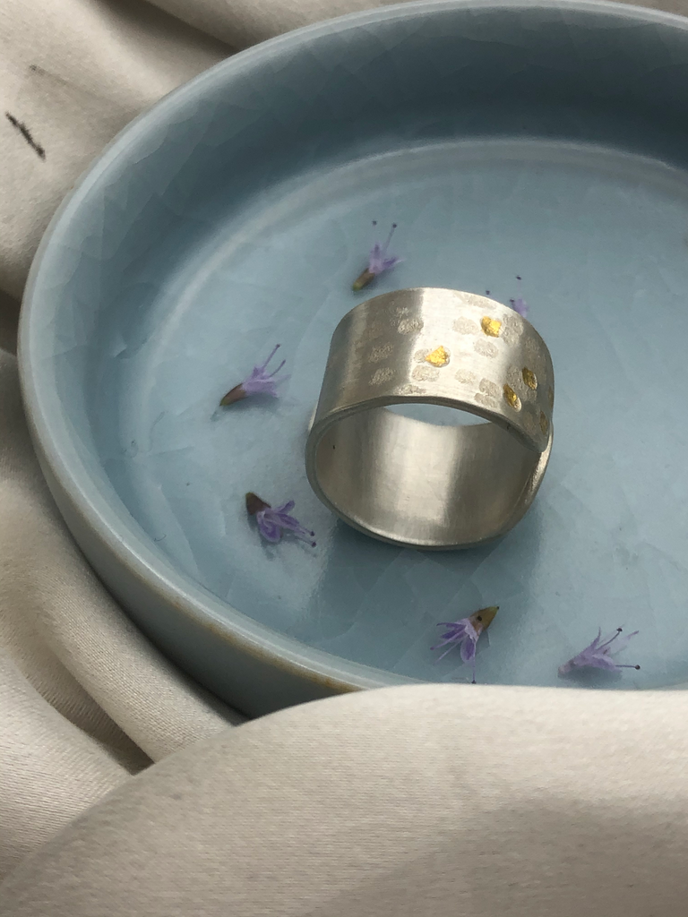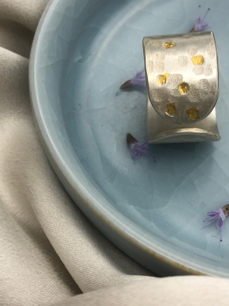 Free hand patterned and hammered on fine silver.
