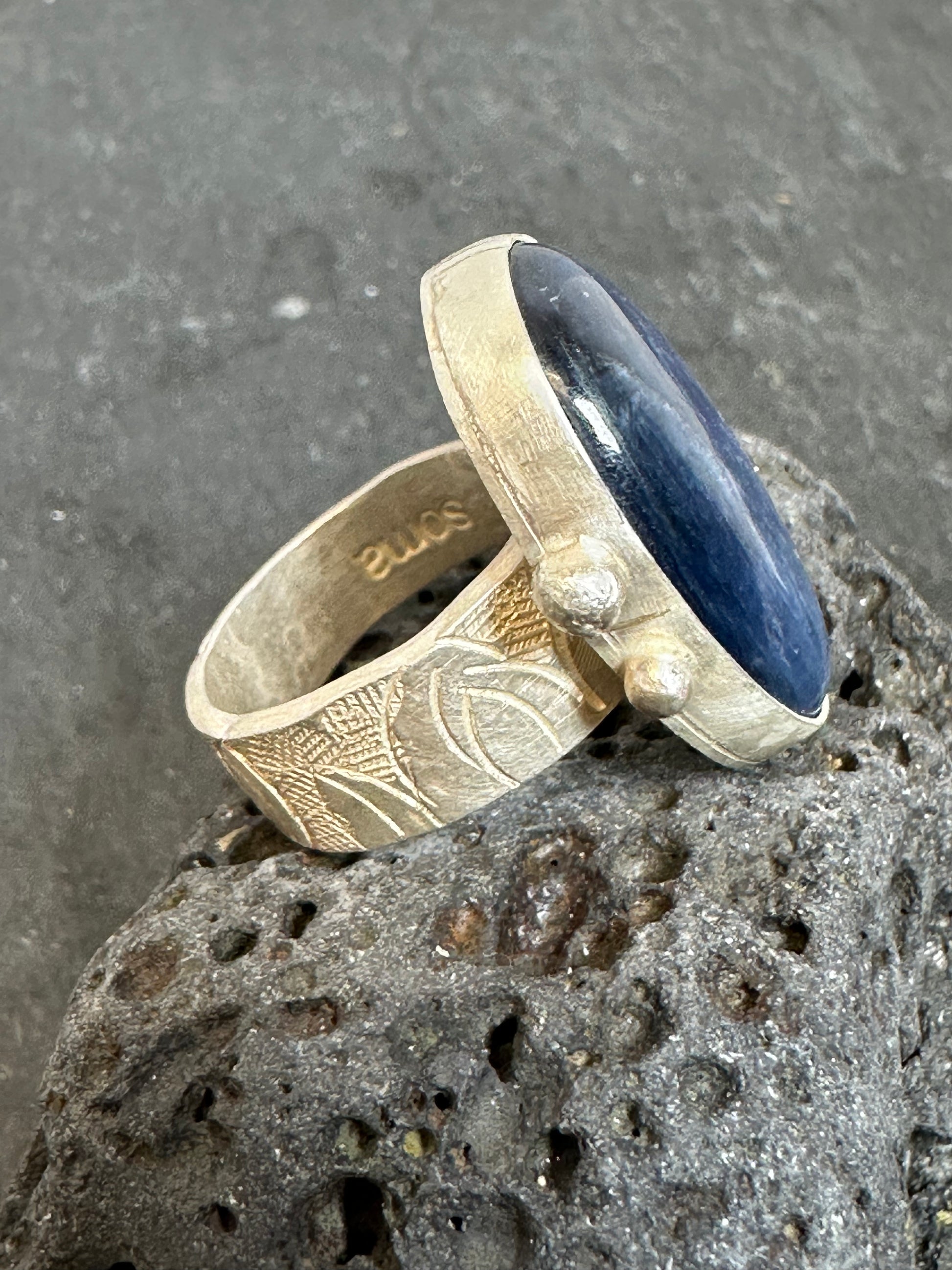 Traditional Tibetan silver technique , hand hammered on fine silver. Adjustable ring that fit most finger size.