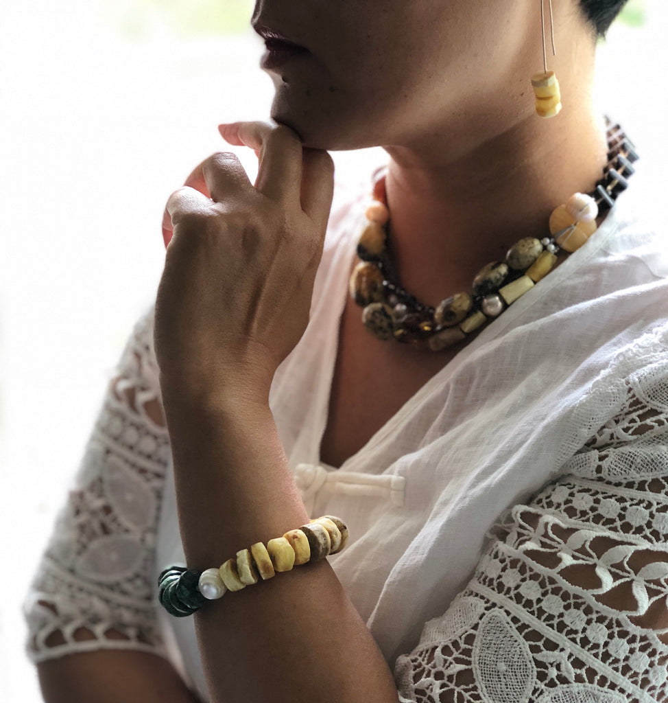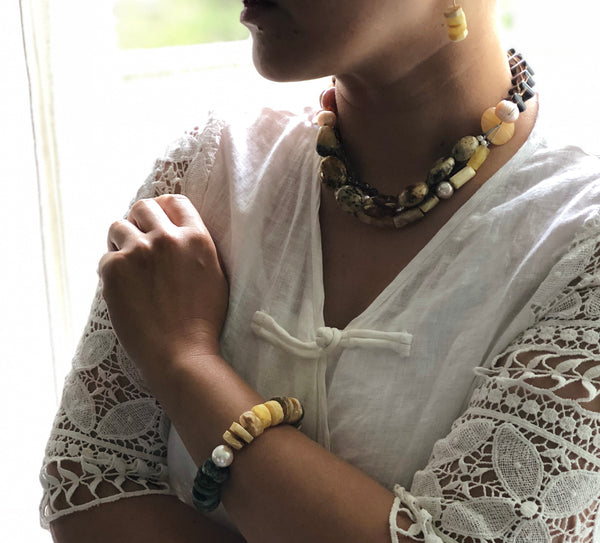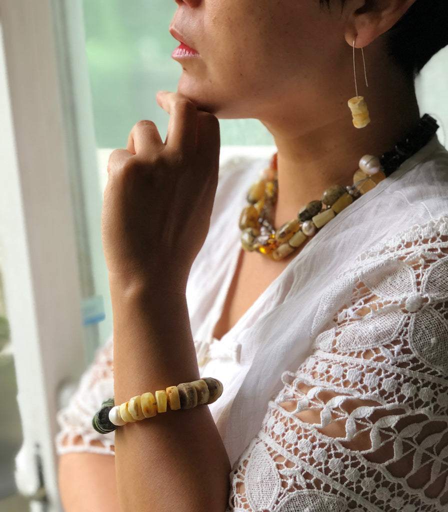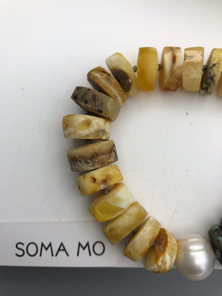 Baltic amber in matt finish, is one of my favorite, match with one fresh water pearl and Tibetan tequoise .