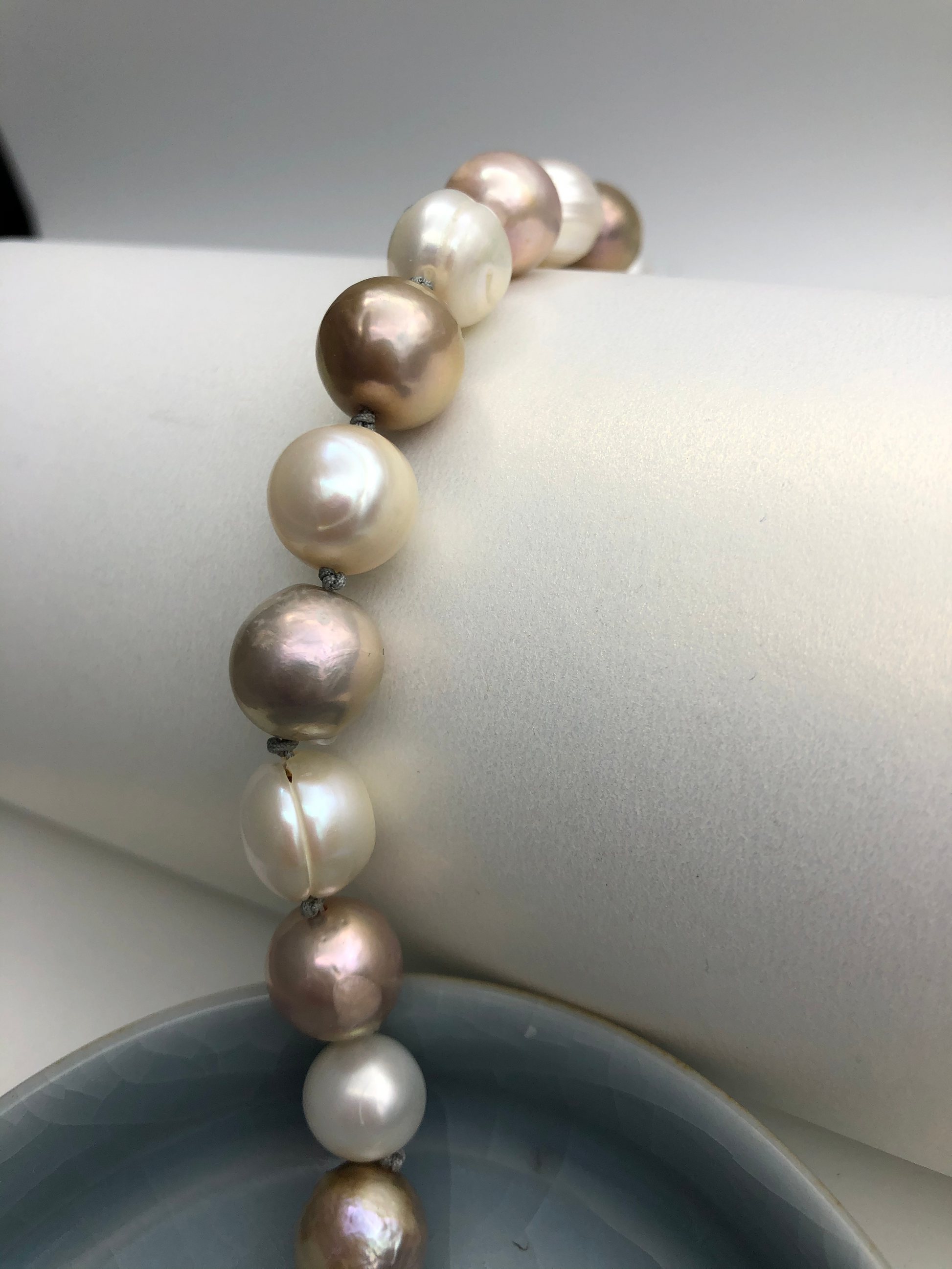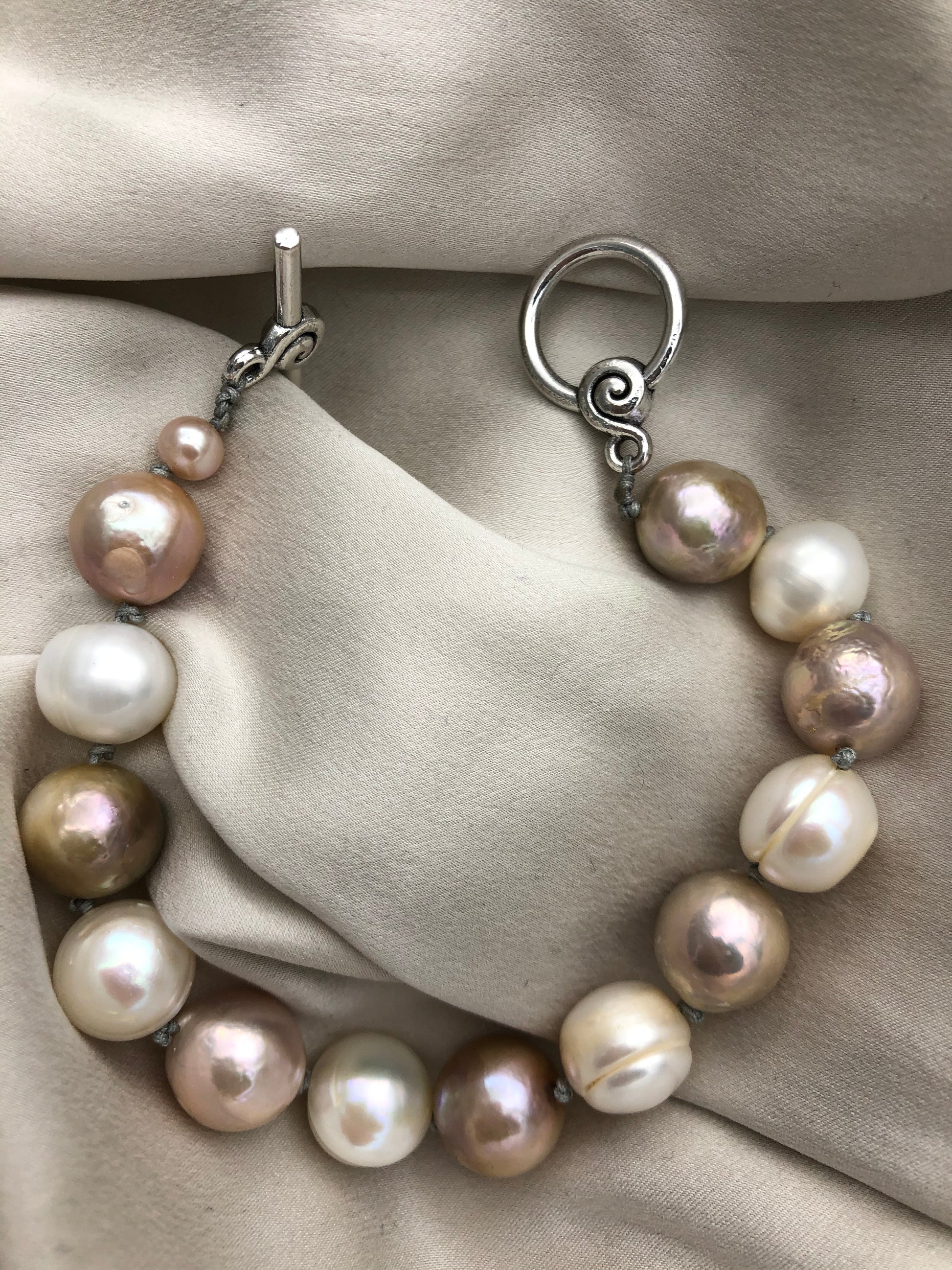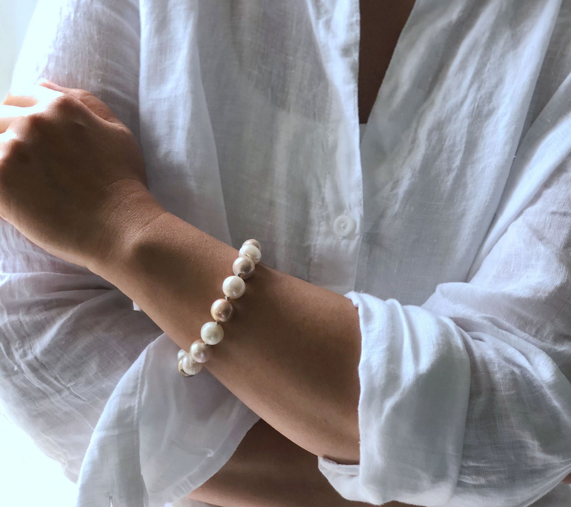 Two colors of fresh water pearl , this simple pearl bracelet is a must have for all season . Hand knotted between each beads.