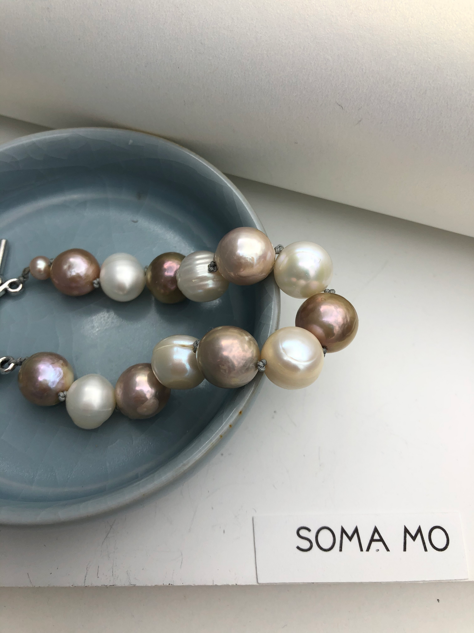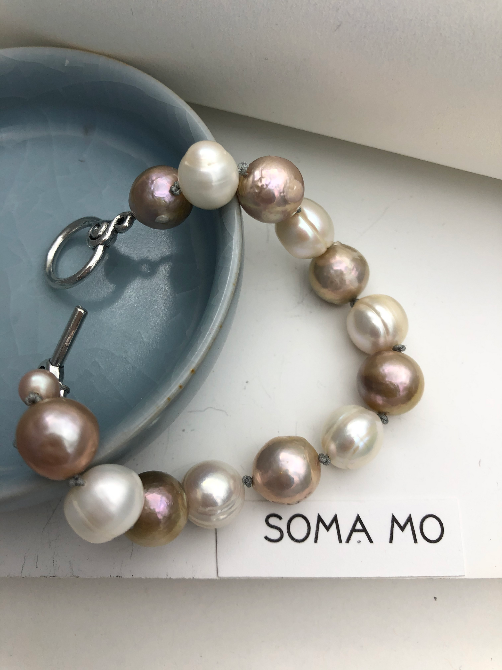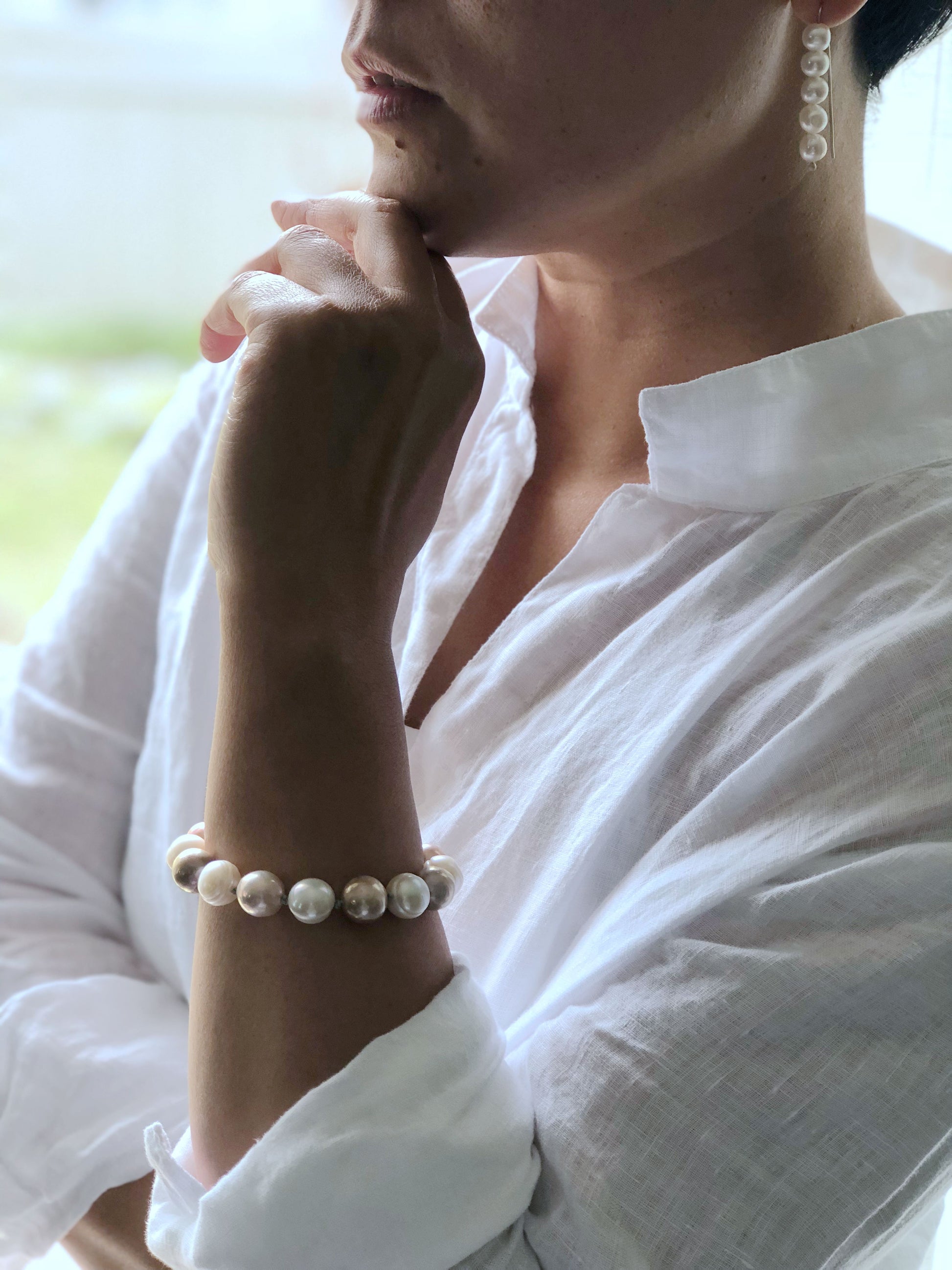 Two colors of fresh water pearl , this simple pearl bracelet is a must have for all season . Hand knotted between each beads.