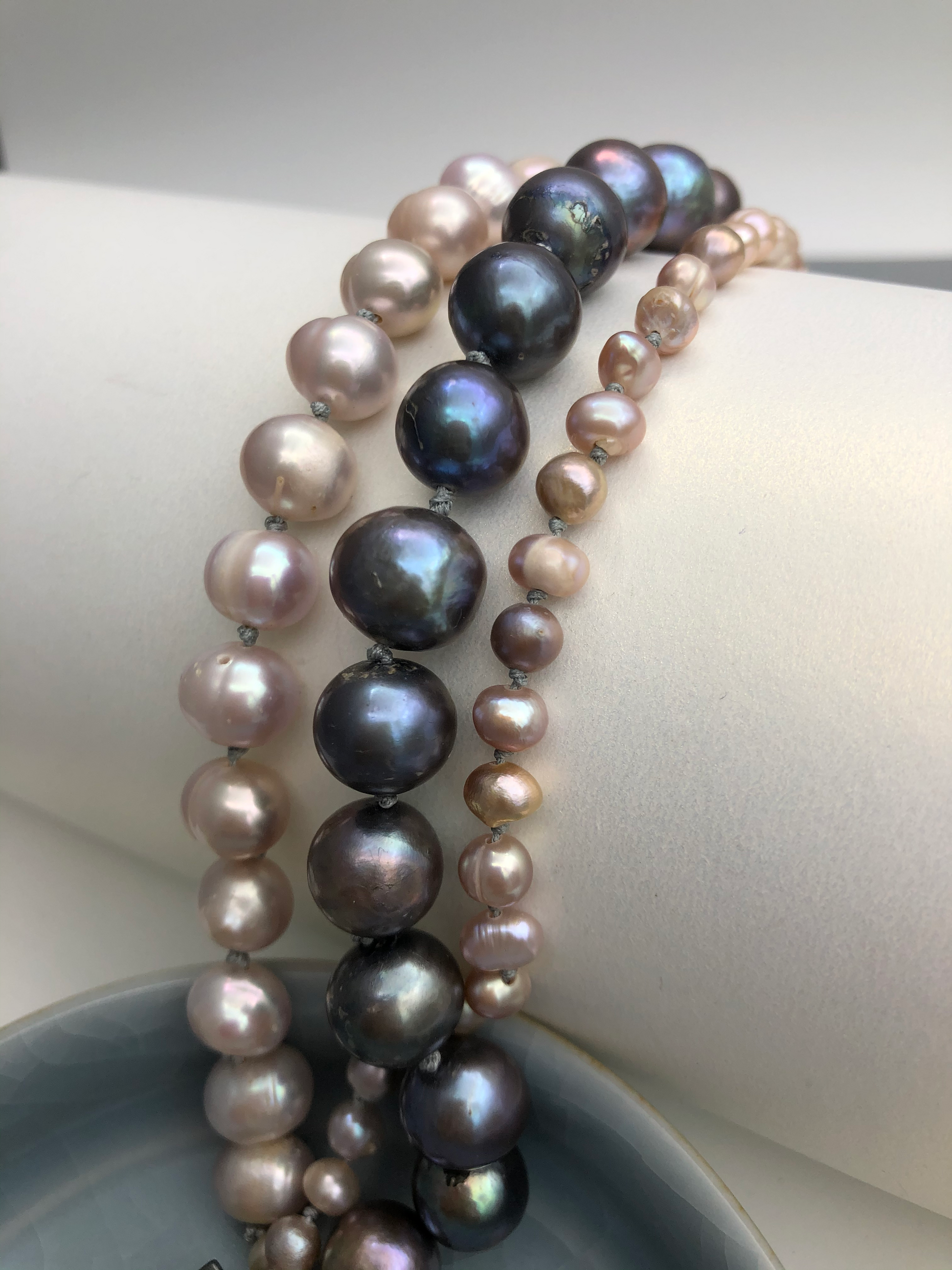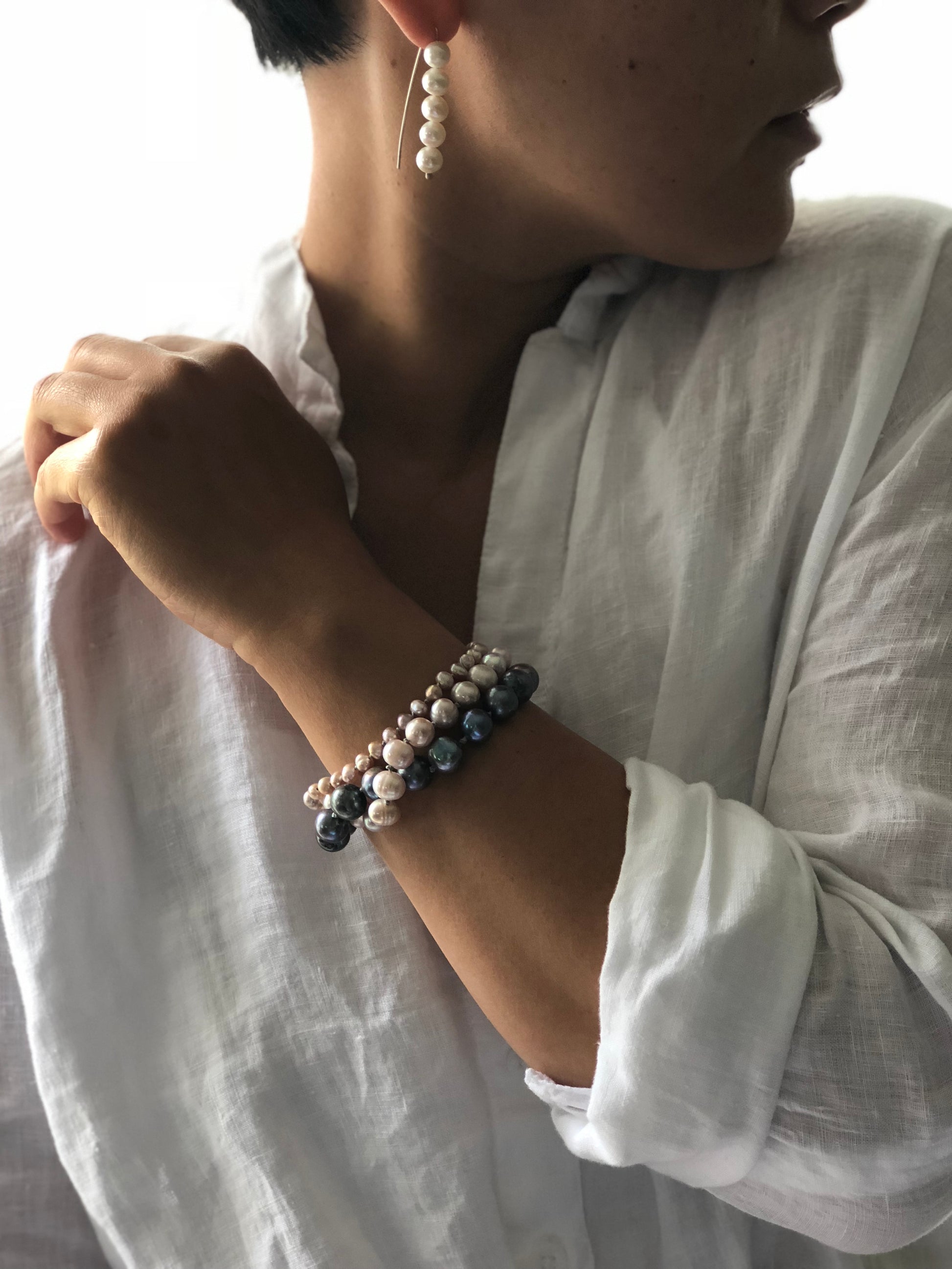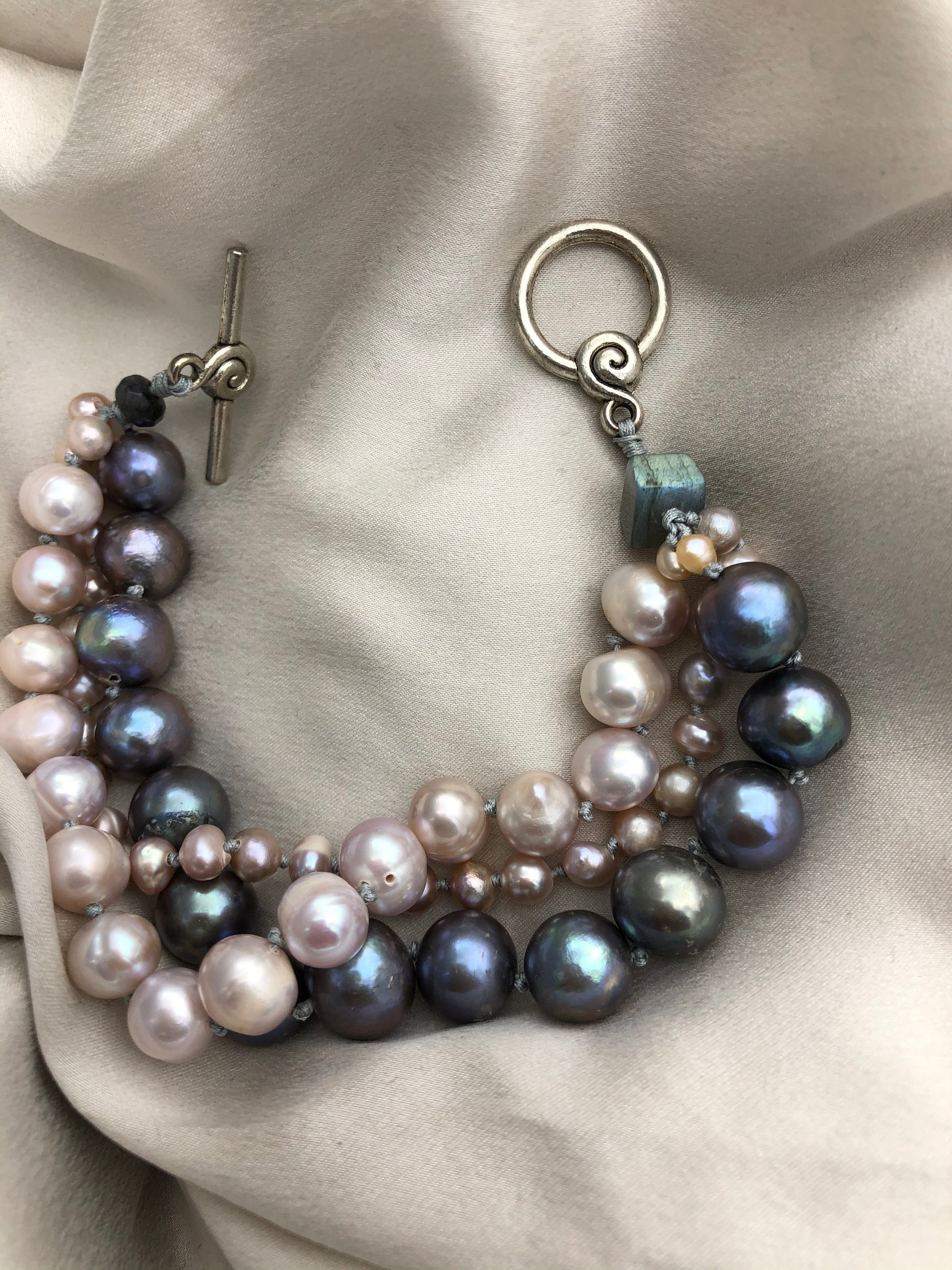 Three strands of different color of fresh water pearl, rich luster on your wrist . Hand knotted between each beads.