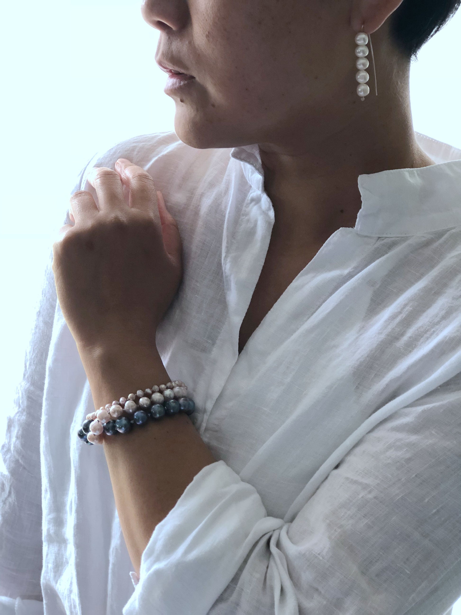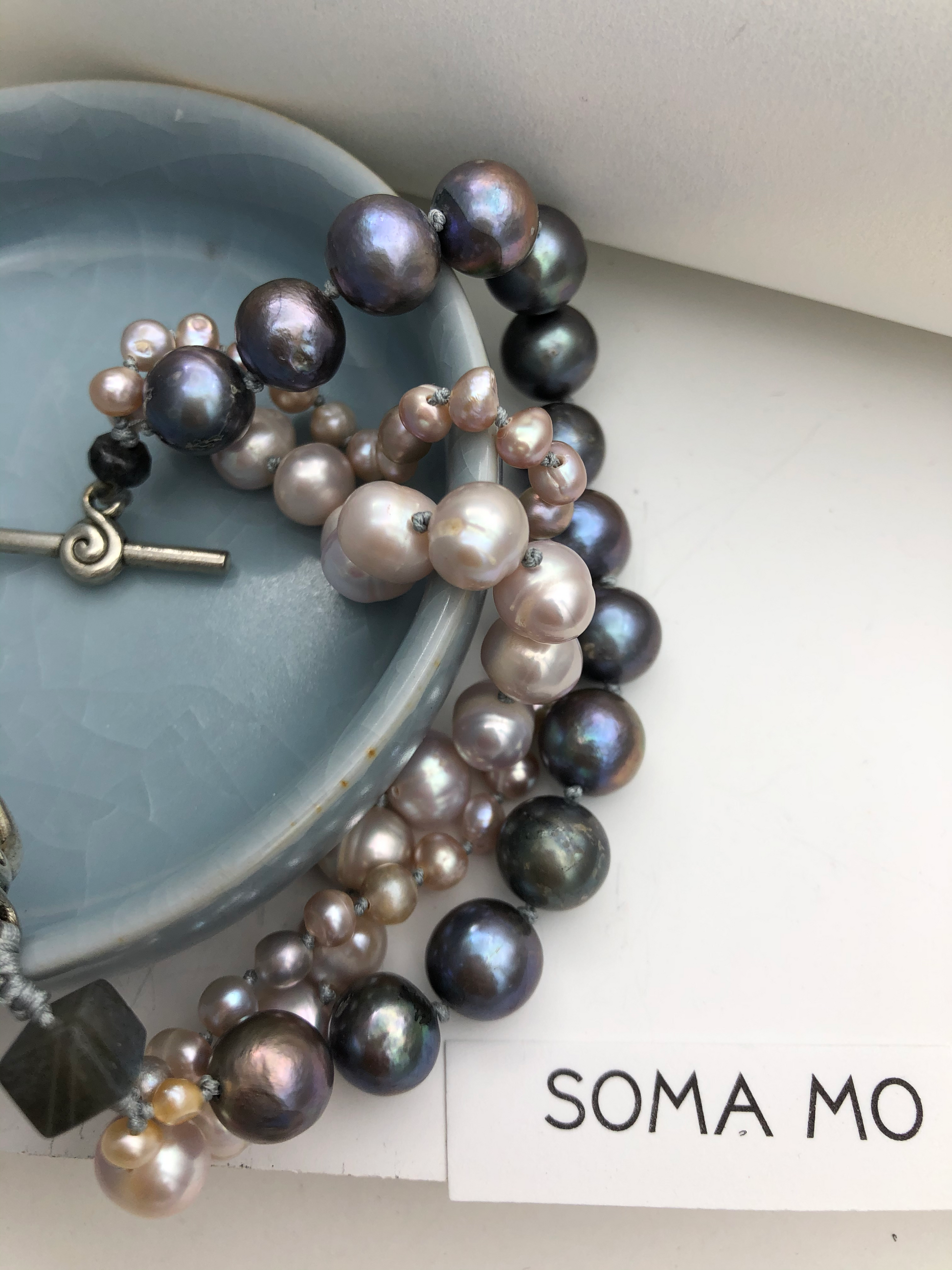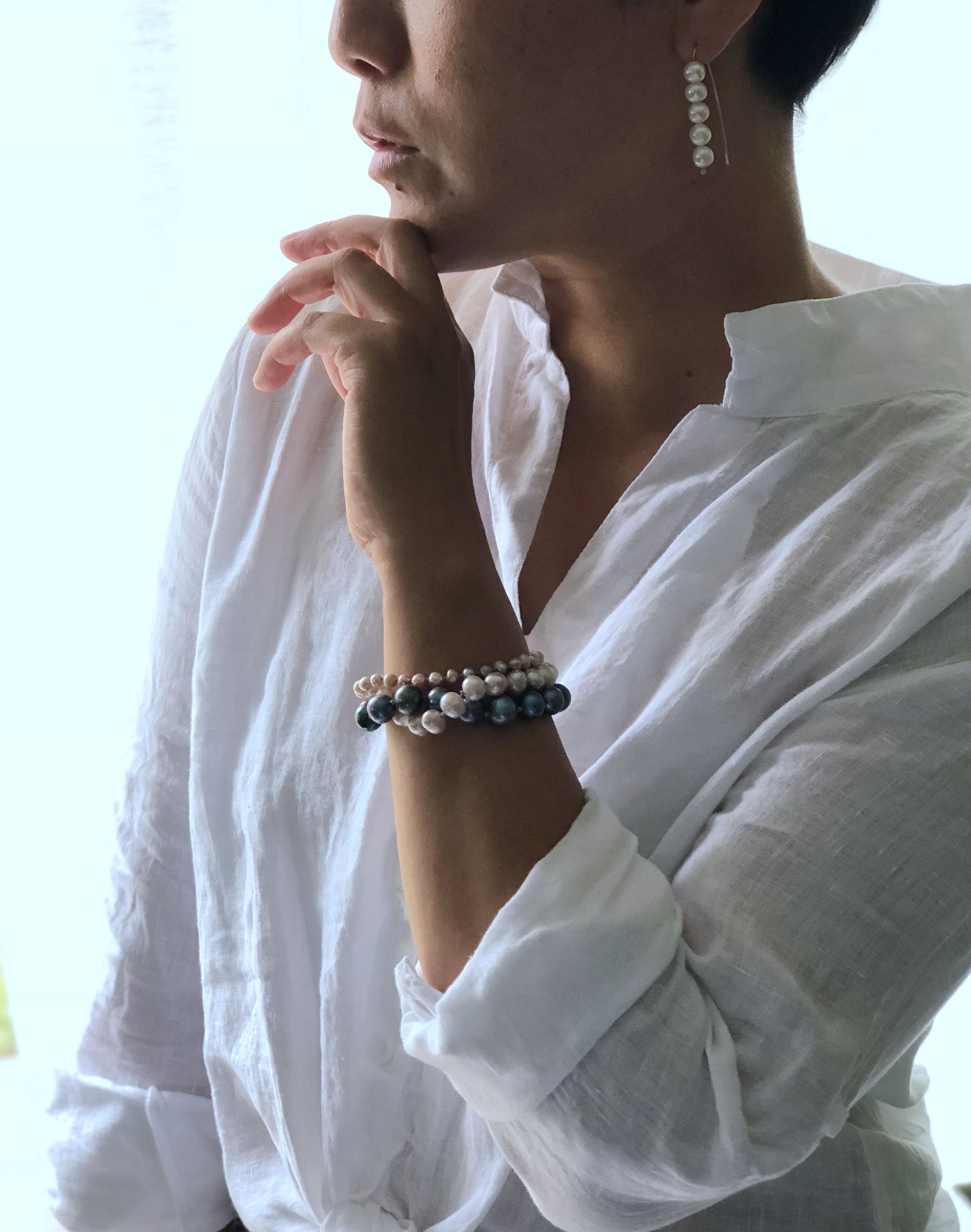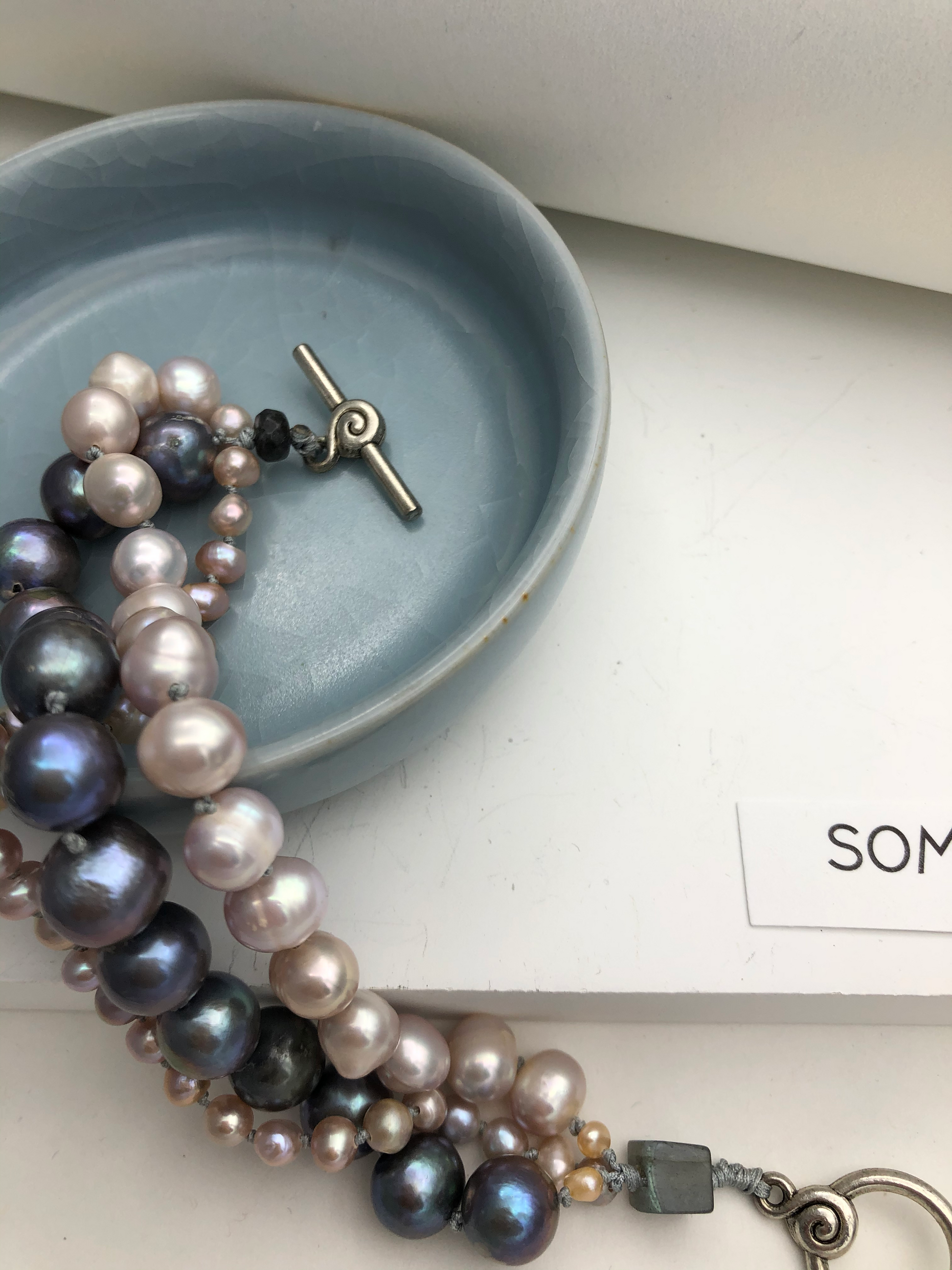 Three strands of different color of fresh water pearl, rich luster on your wrist . Hand knotted between each beads.
