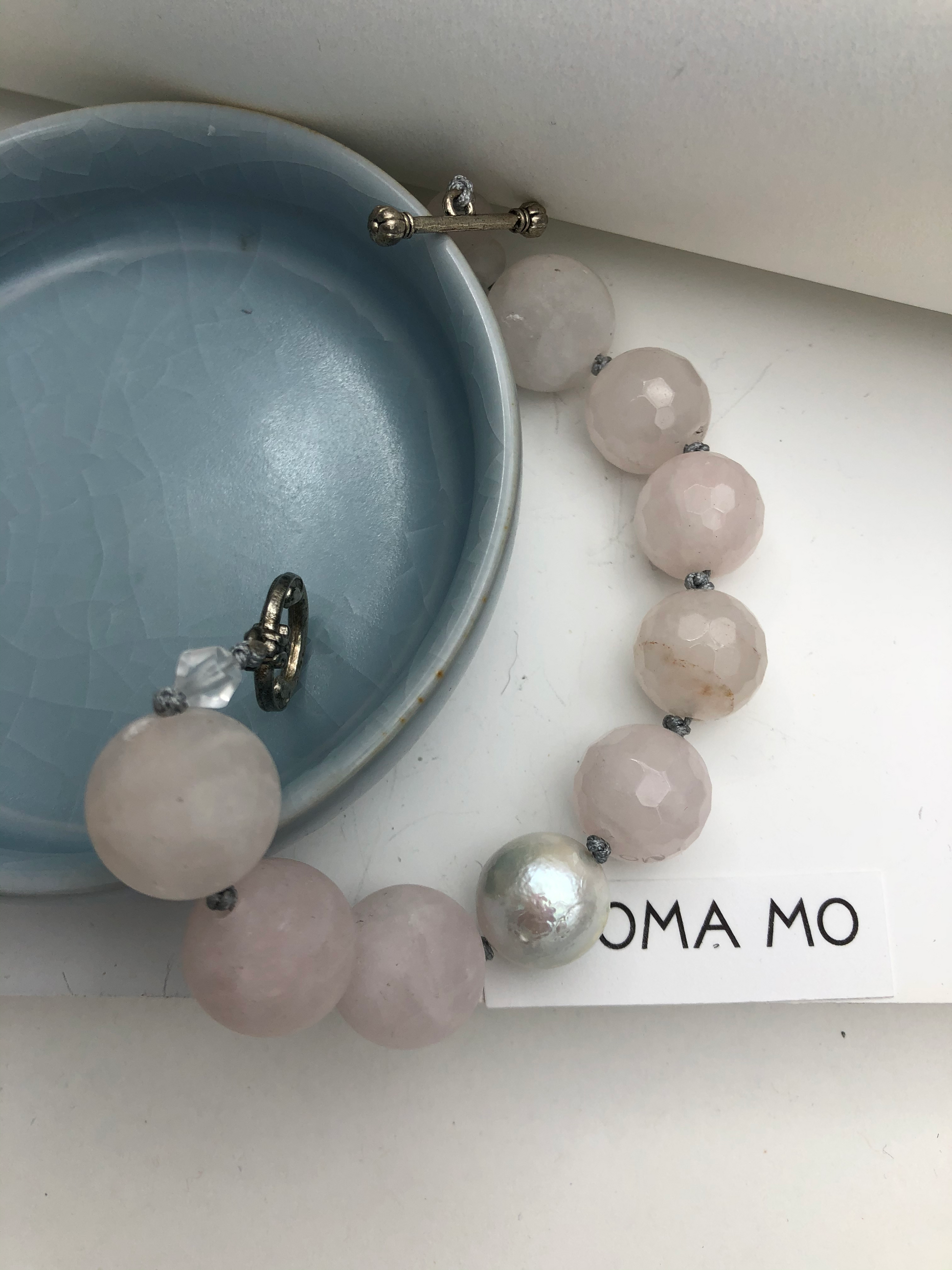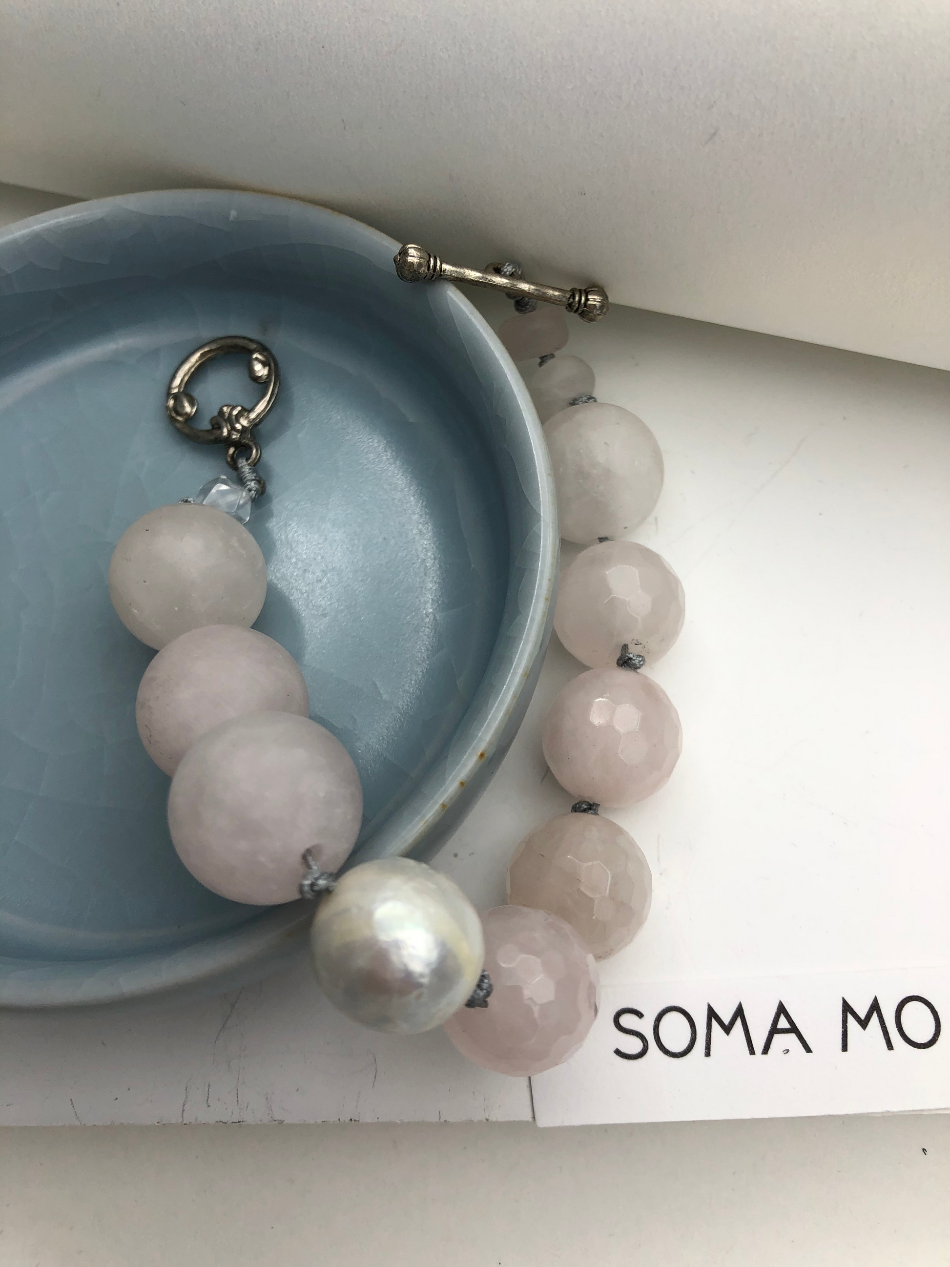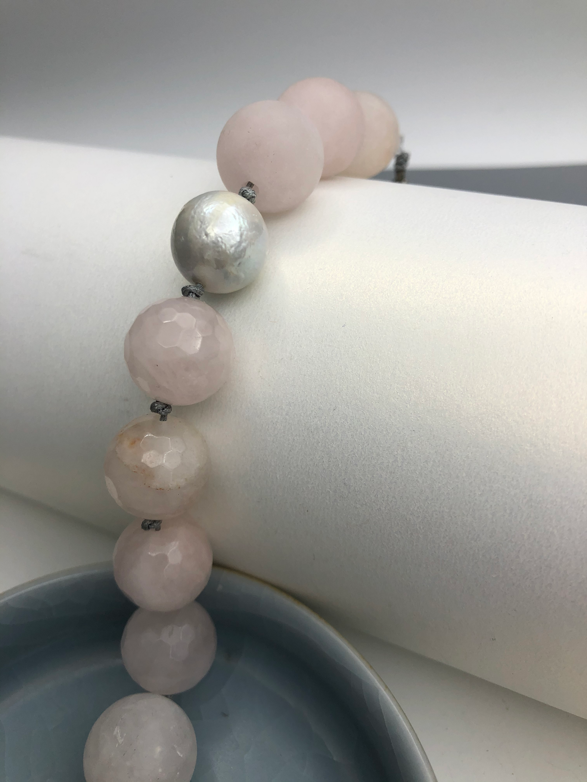 Rose quartz in two different textures, polished and matte finish, hand knotted between each beads, can be resized for special request.