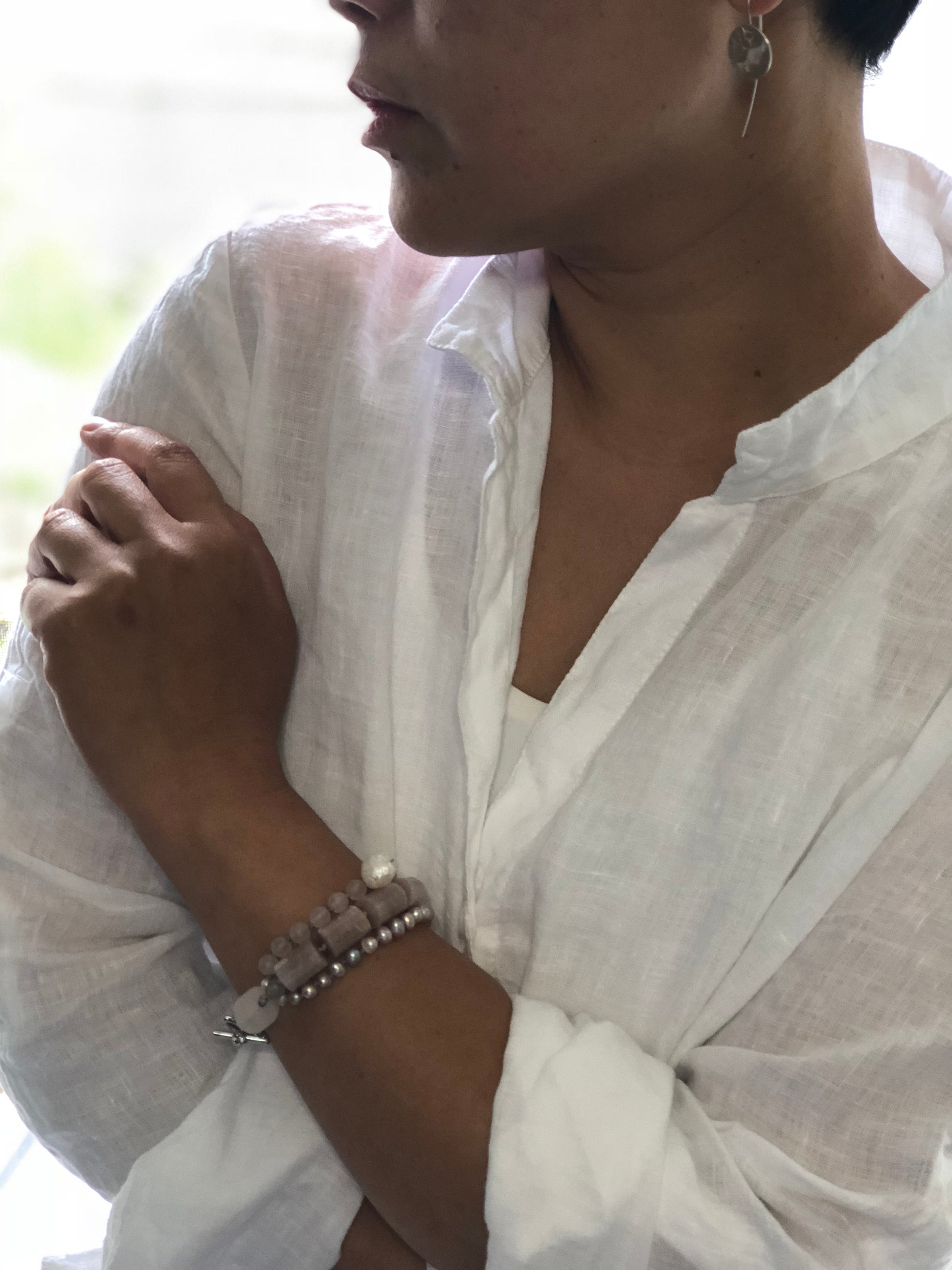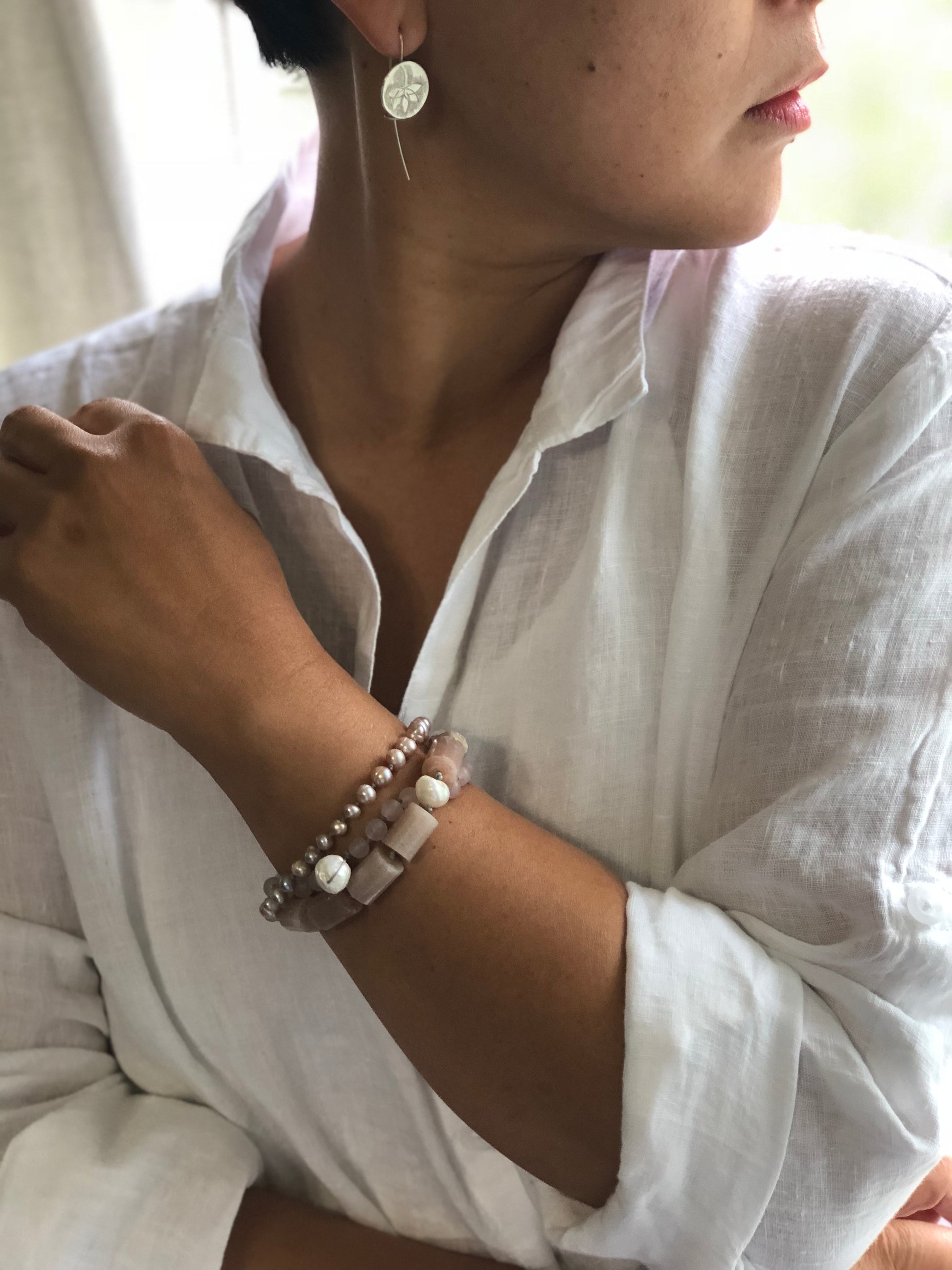Materials : Sun stone, fresh water pearl, rose quartz
