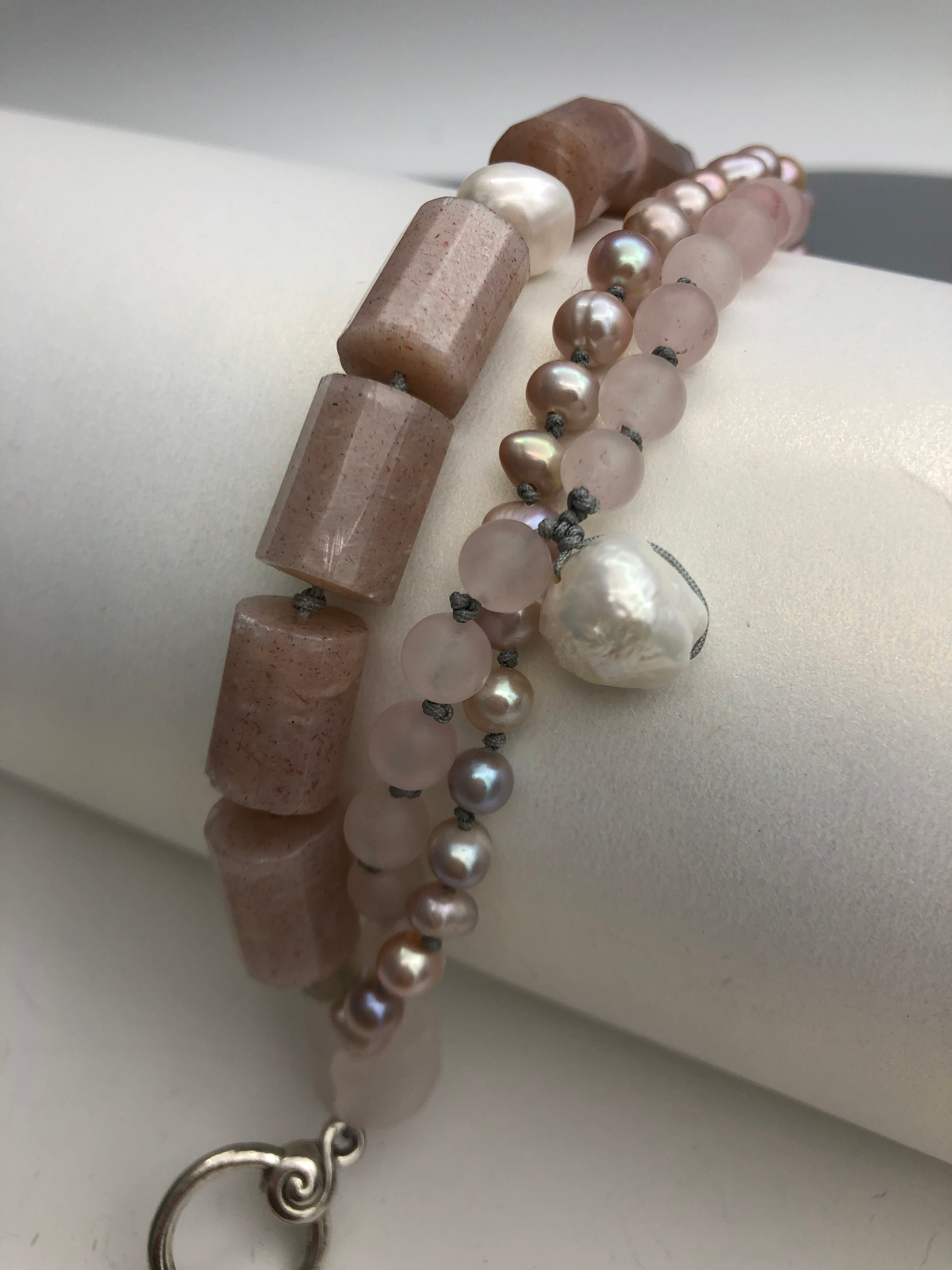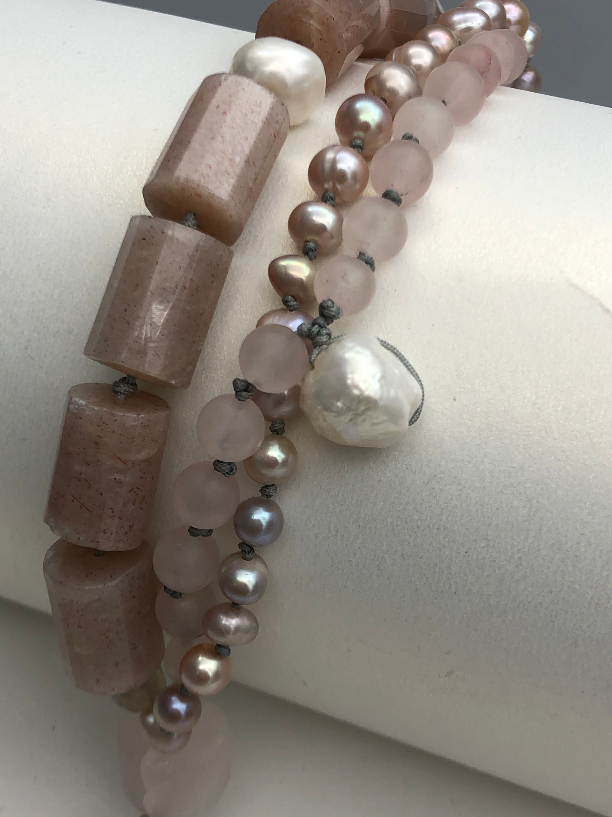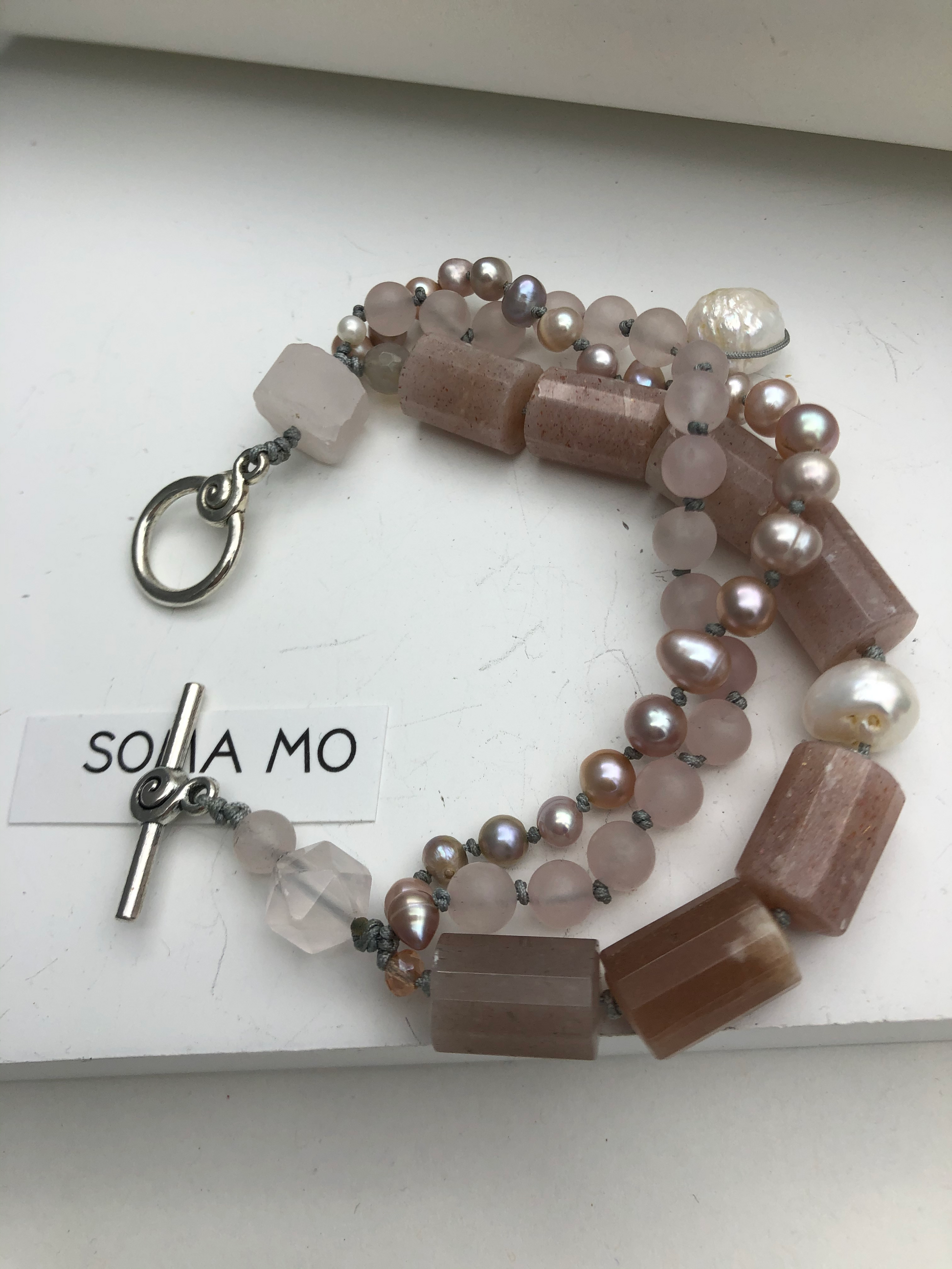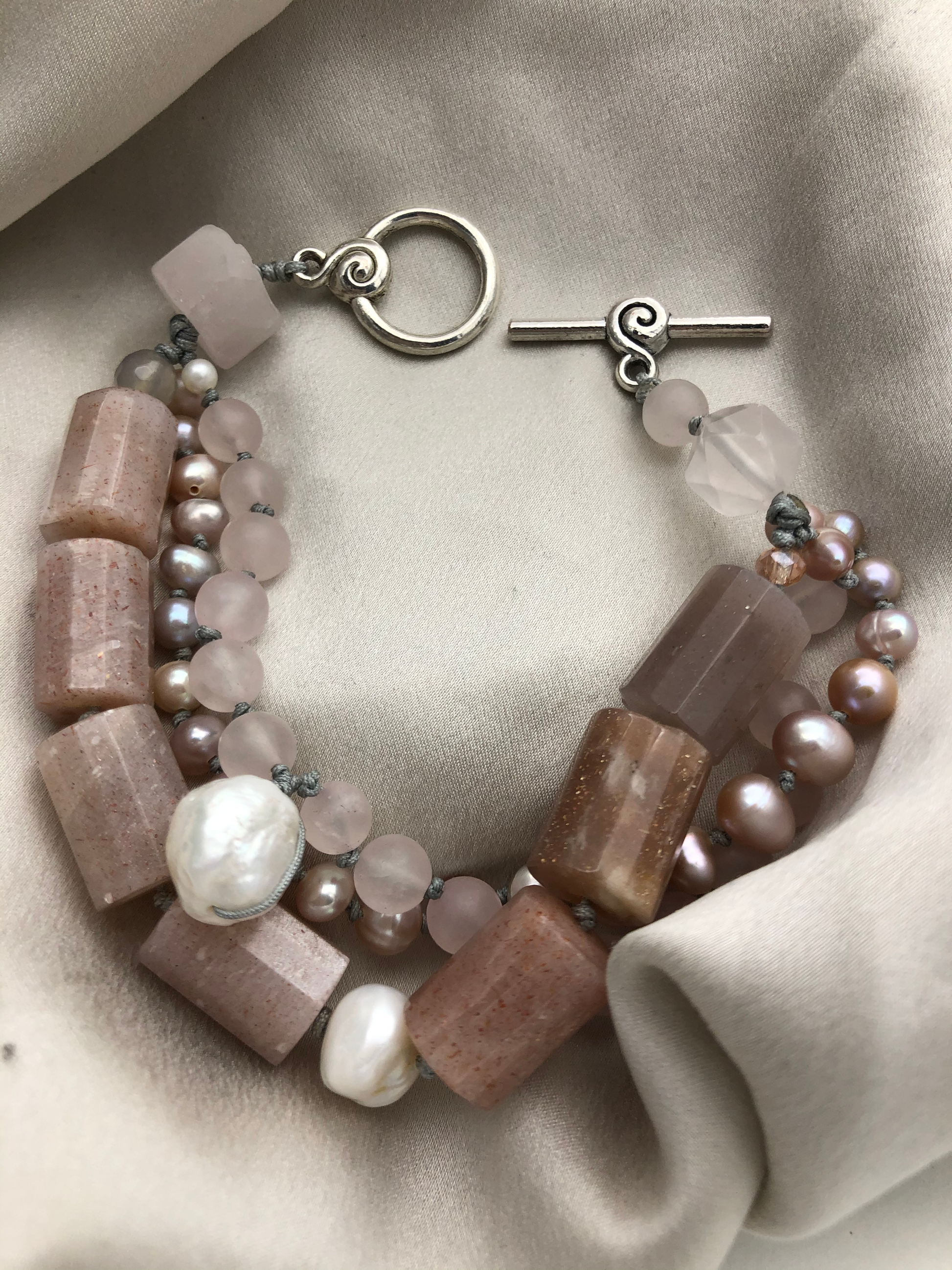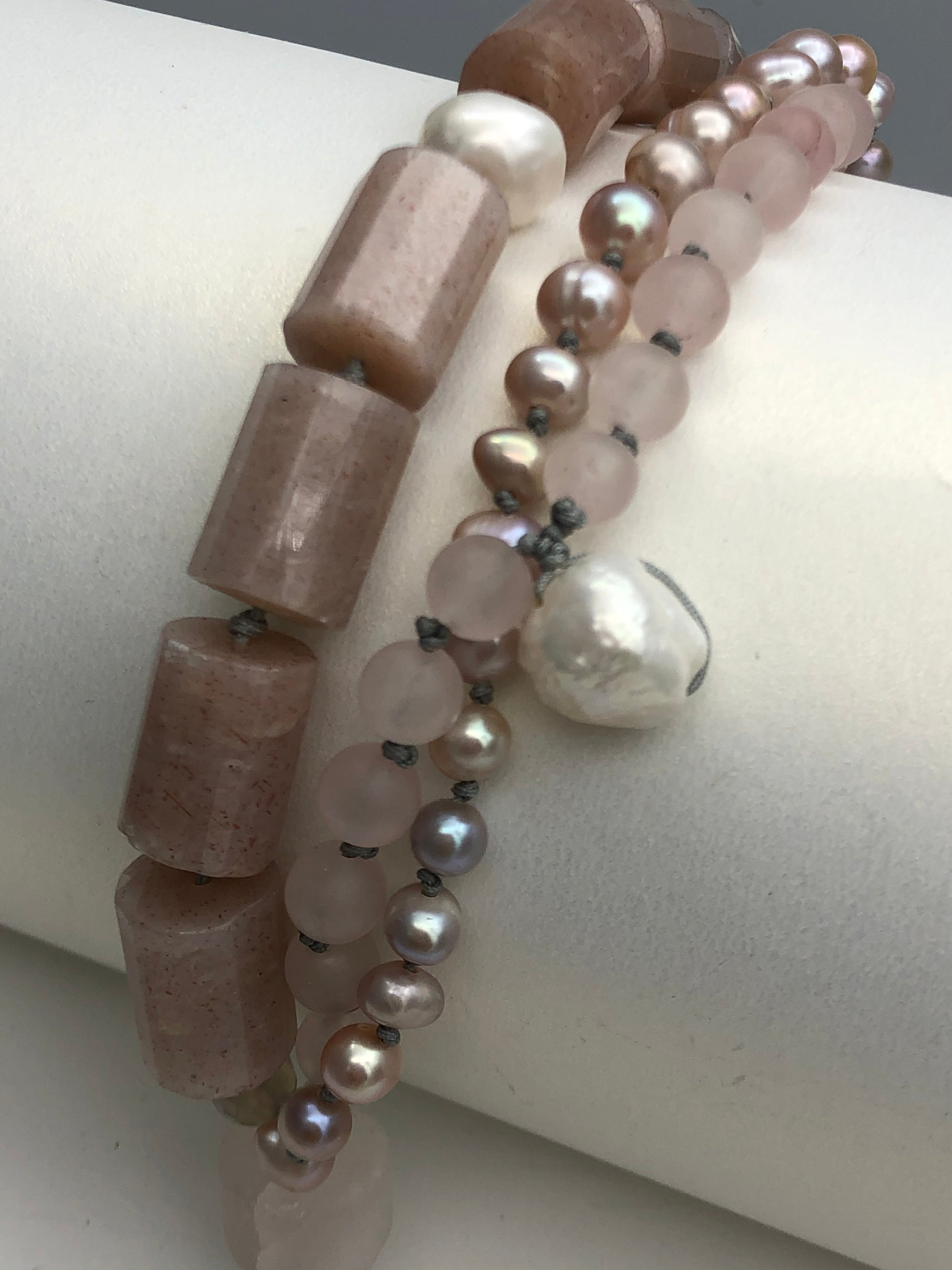 Warm color for the season, sun stone matches with rose quartz and fresh water pearls, Soft and gentle. Hand knotted between each beads. Can be resized for special request.