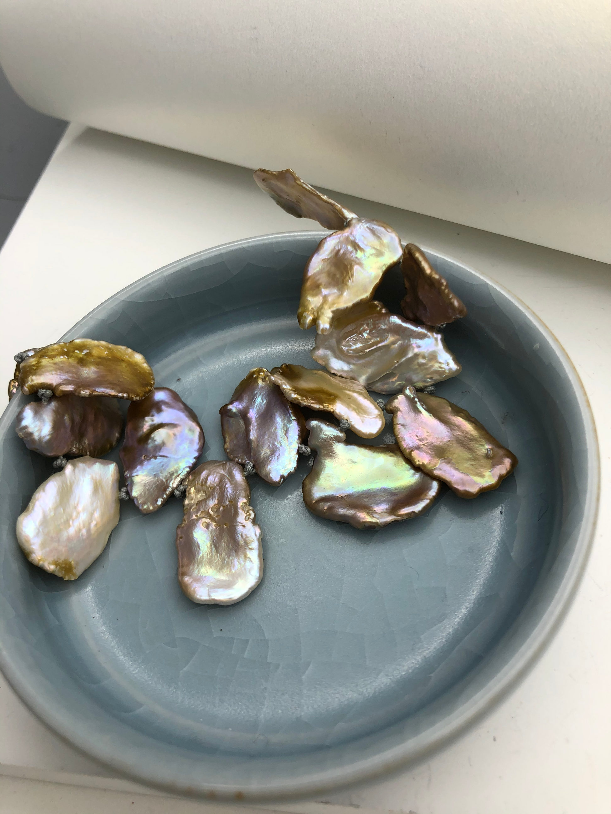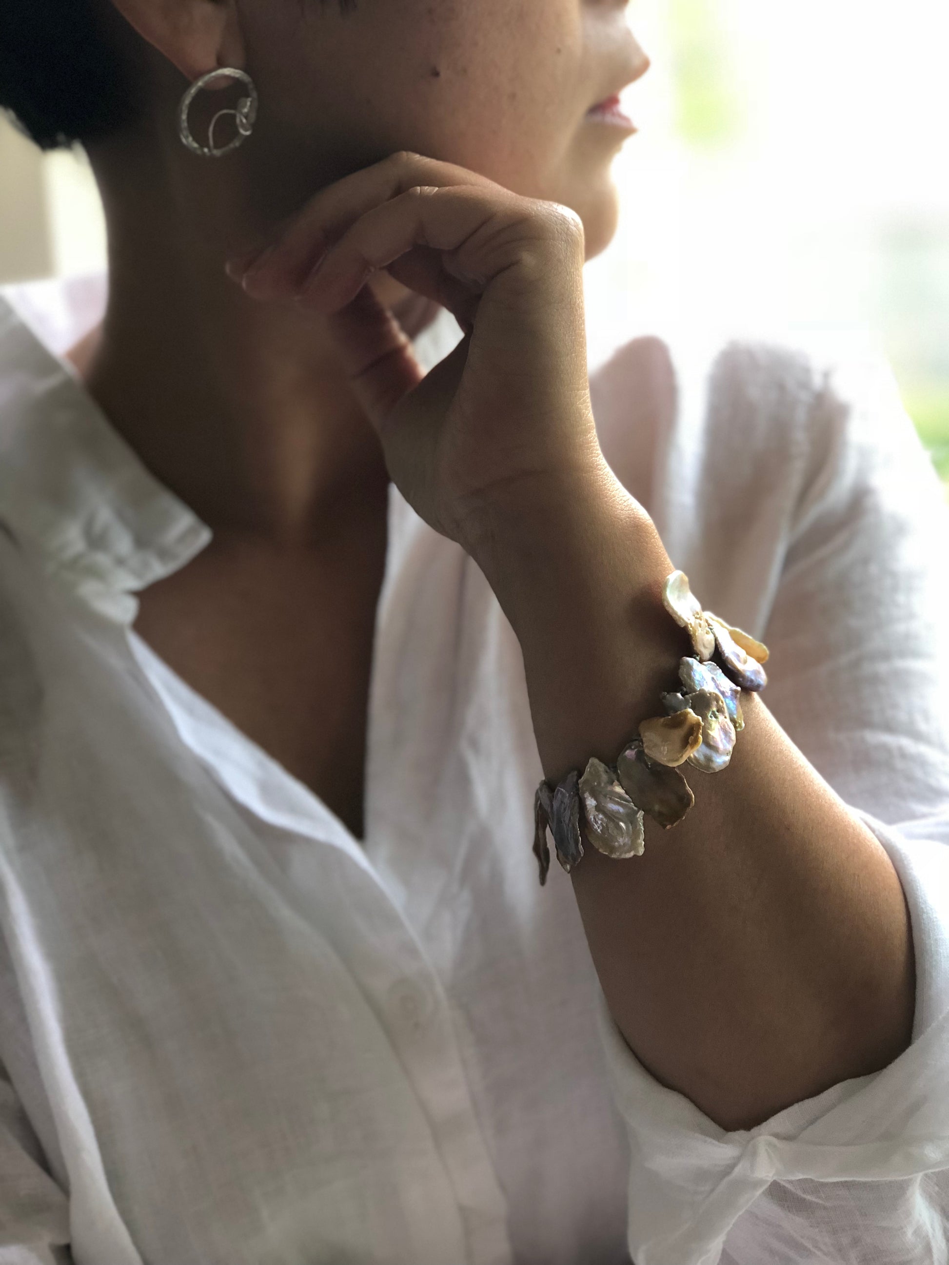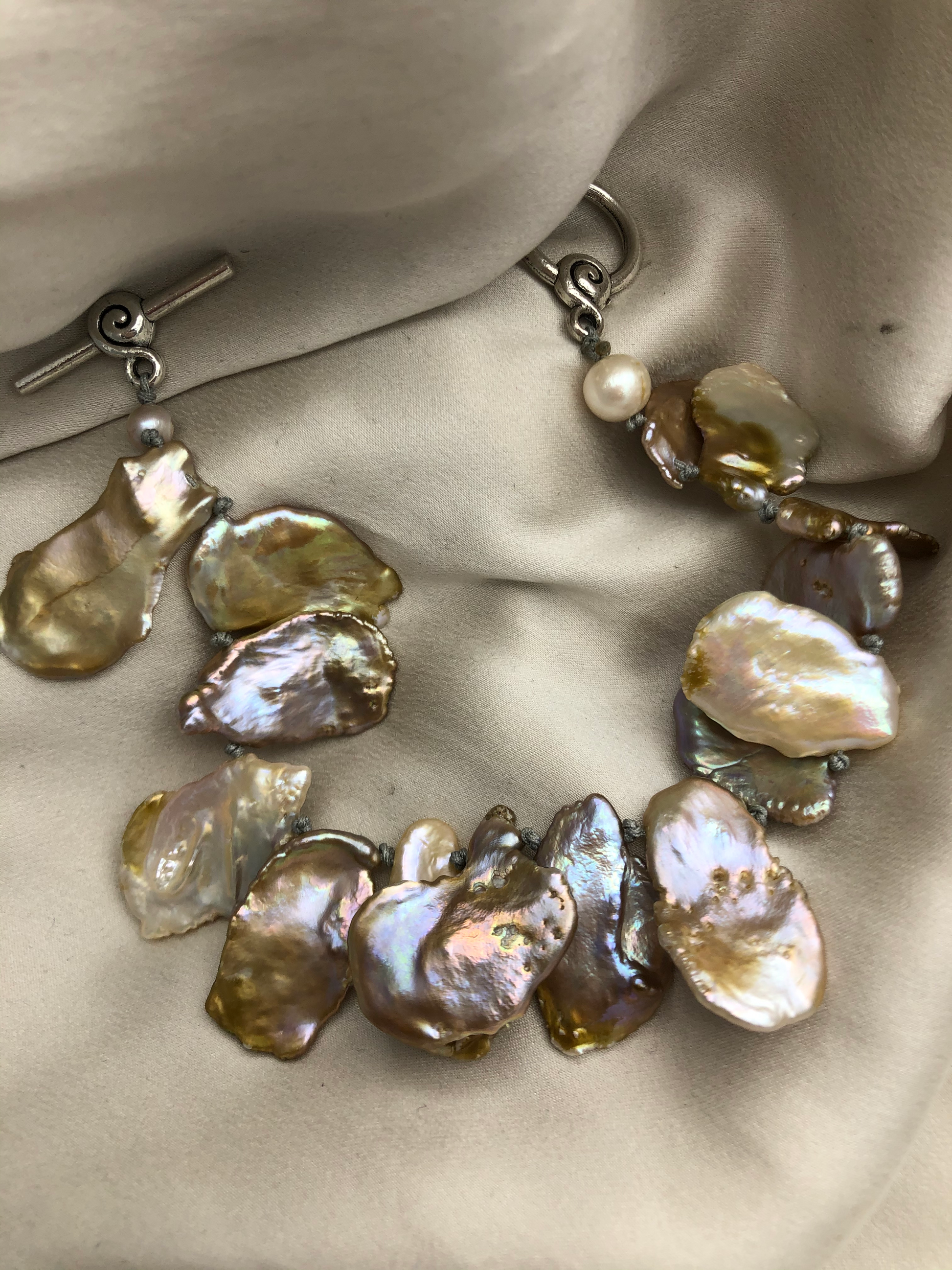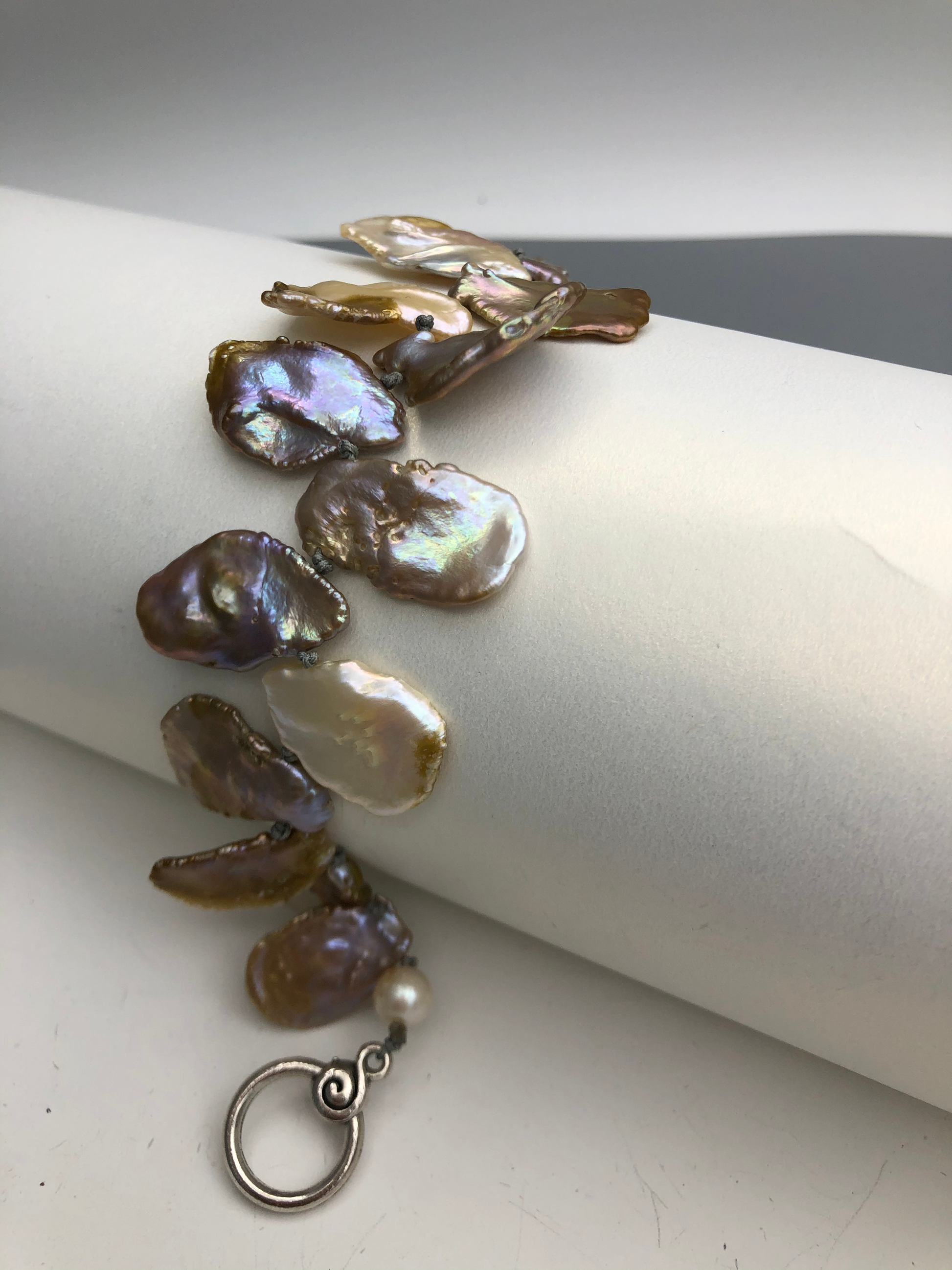 Petal shape , this type of fresh water pearl has rich luster , its delicate and chunky on your wrist. Hand knotted between each beads, can be resized for special request.