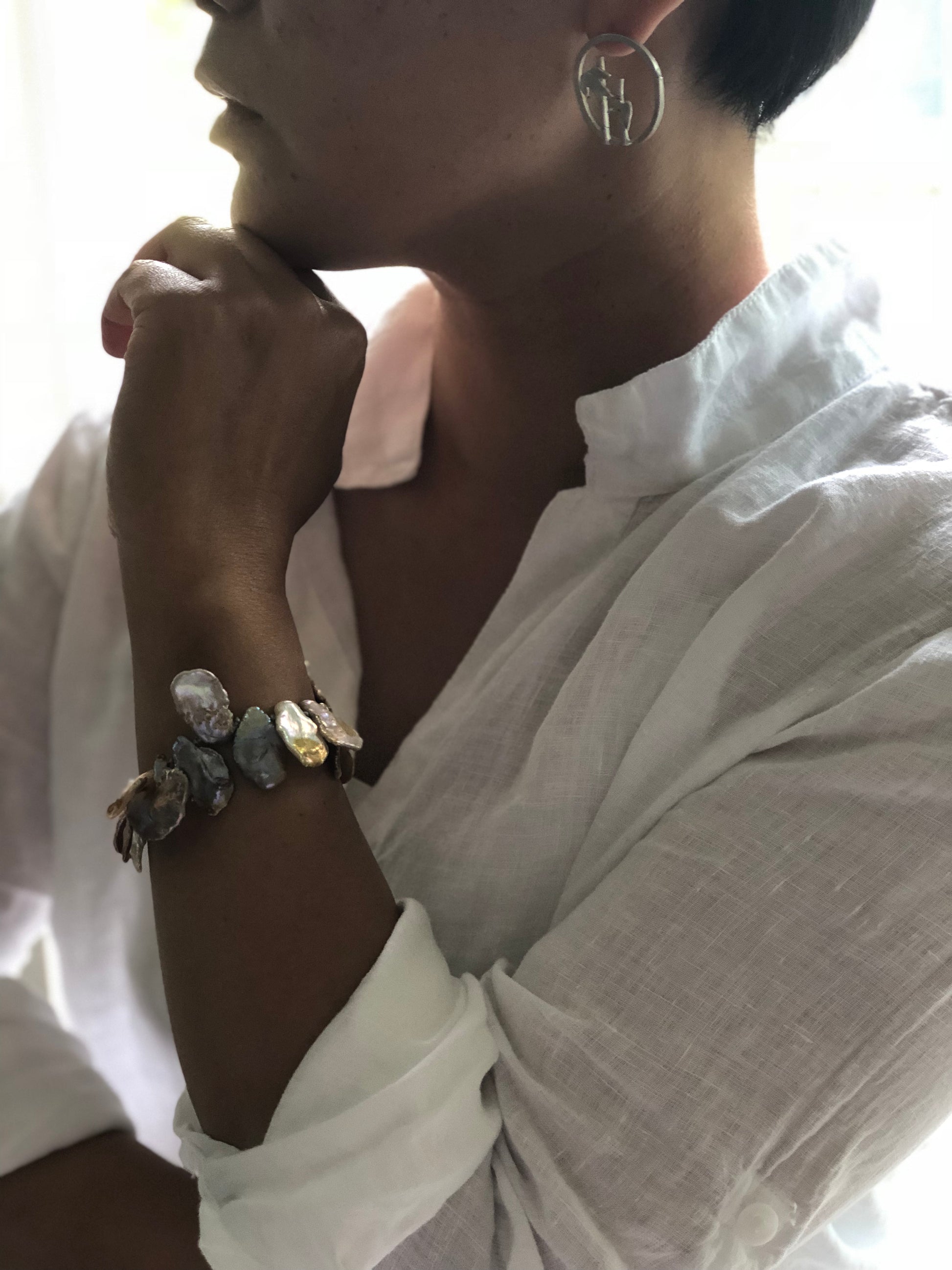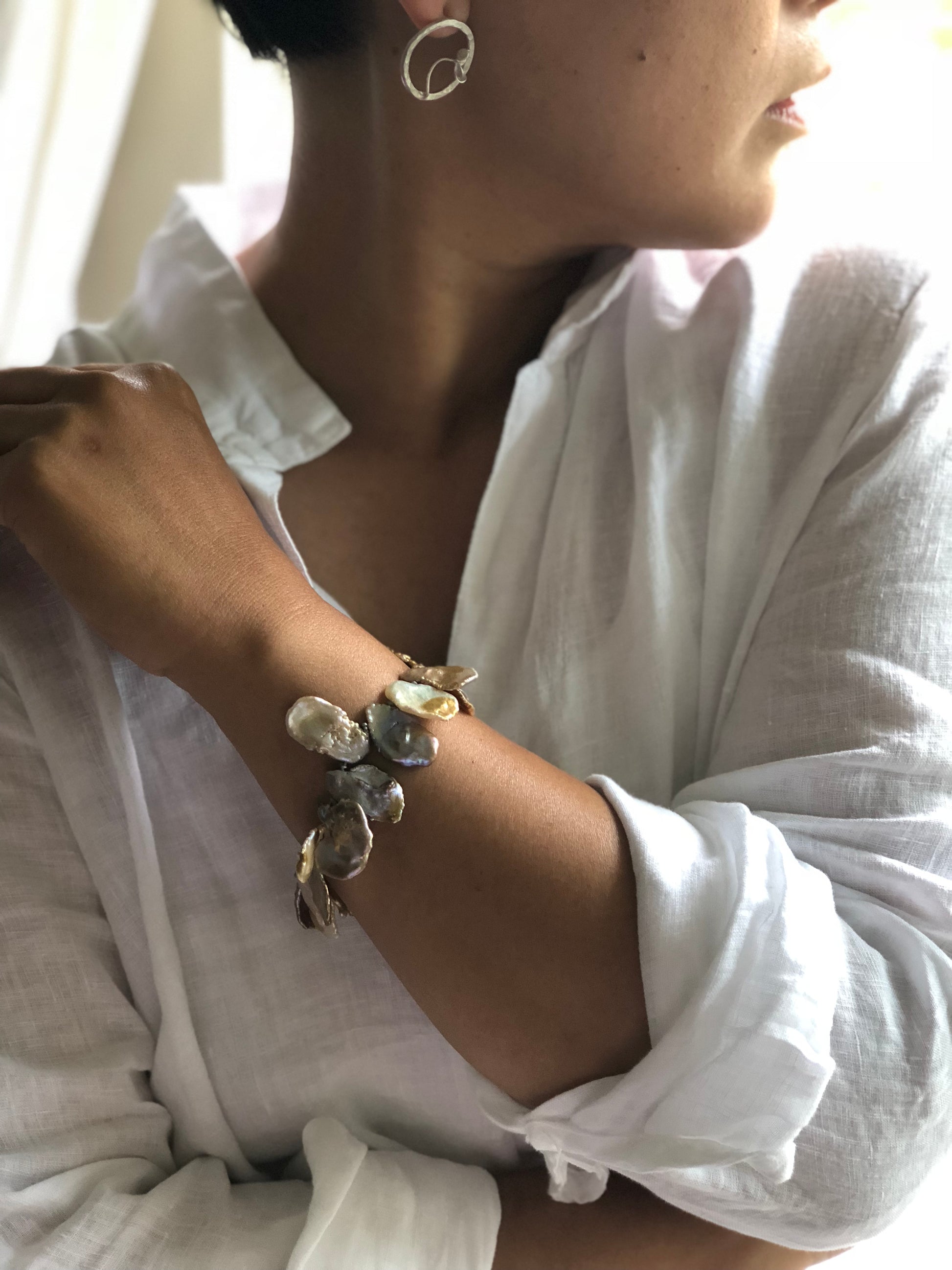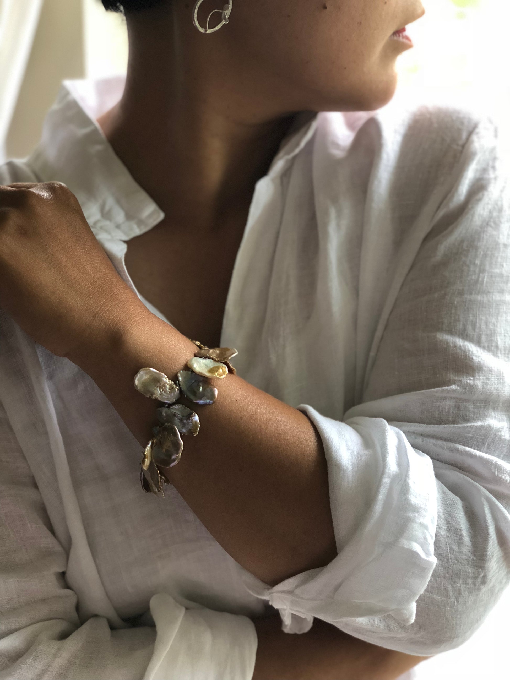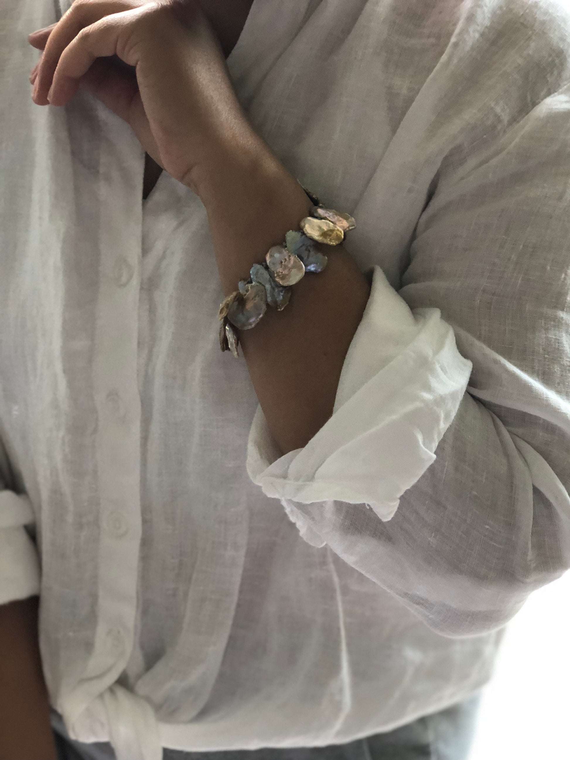 Petal shape , this type of fresh water pearl has rich luster , its delicate and chunky on your wrist. Hand knotted between each beads, can be resized for special request.