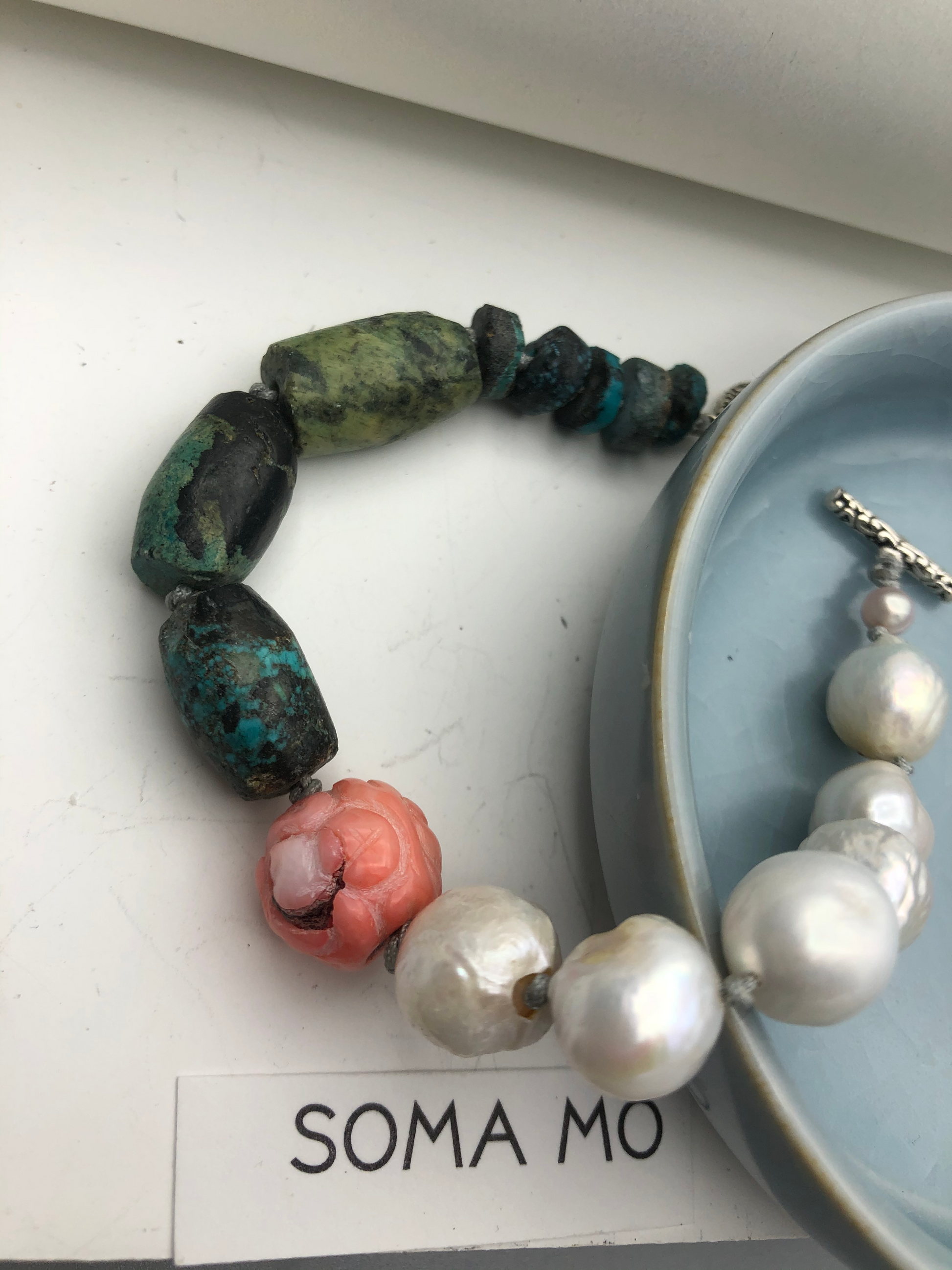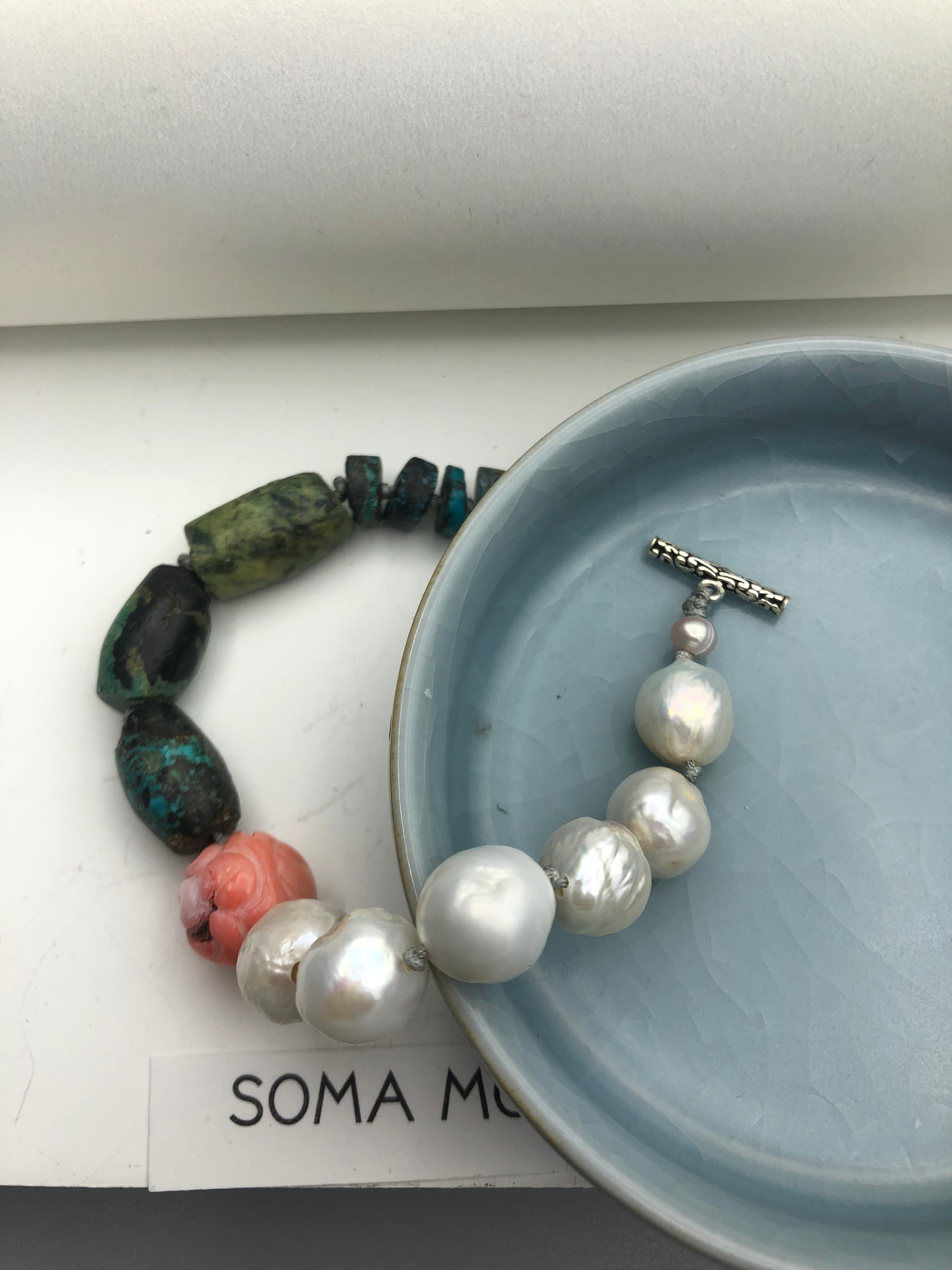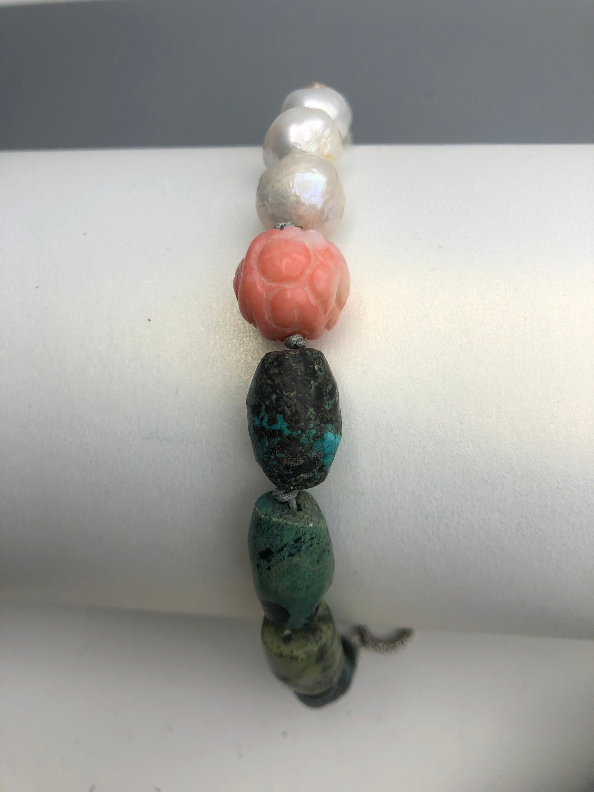Materials : Fresh water pearl, red coral , turquoise , sterling silver clasp