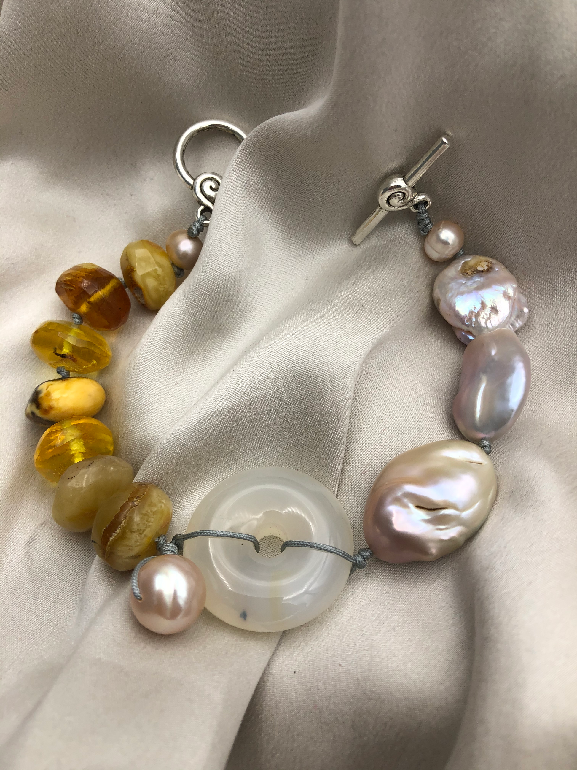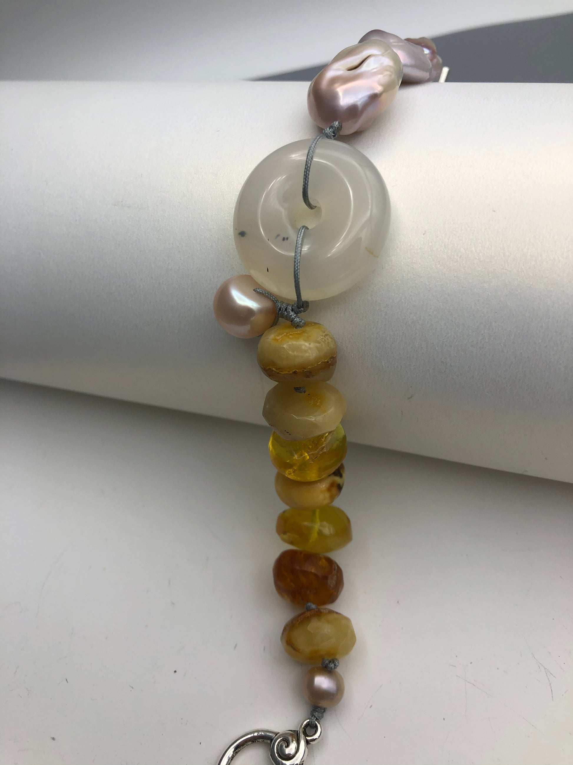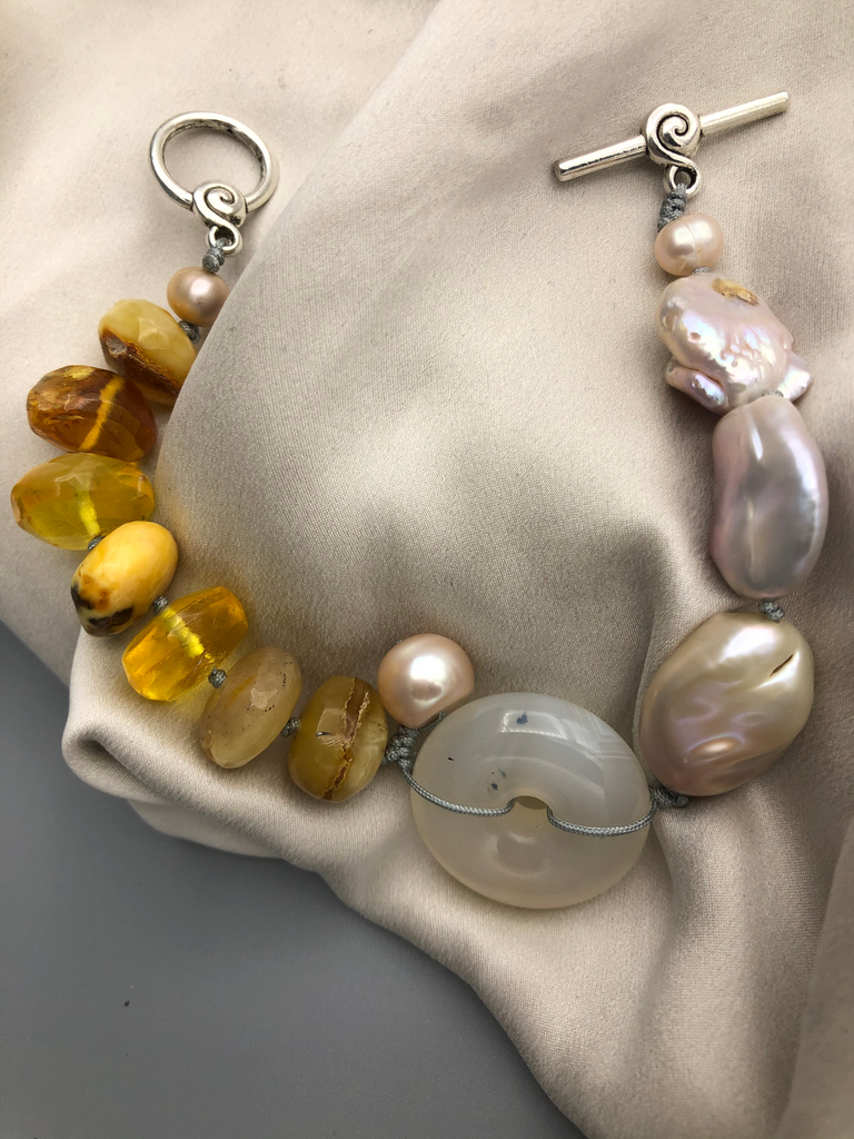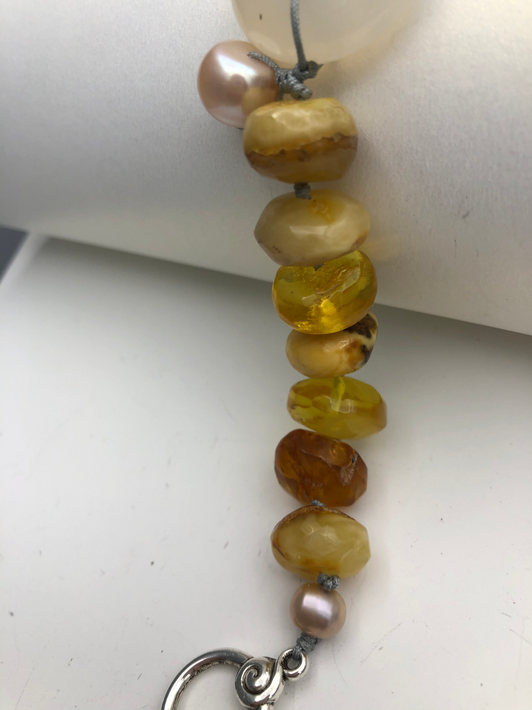 Baltic amber and baroque pearl are perfect match . Hand knotted between each beads, can be resized for special request.