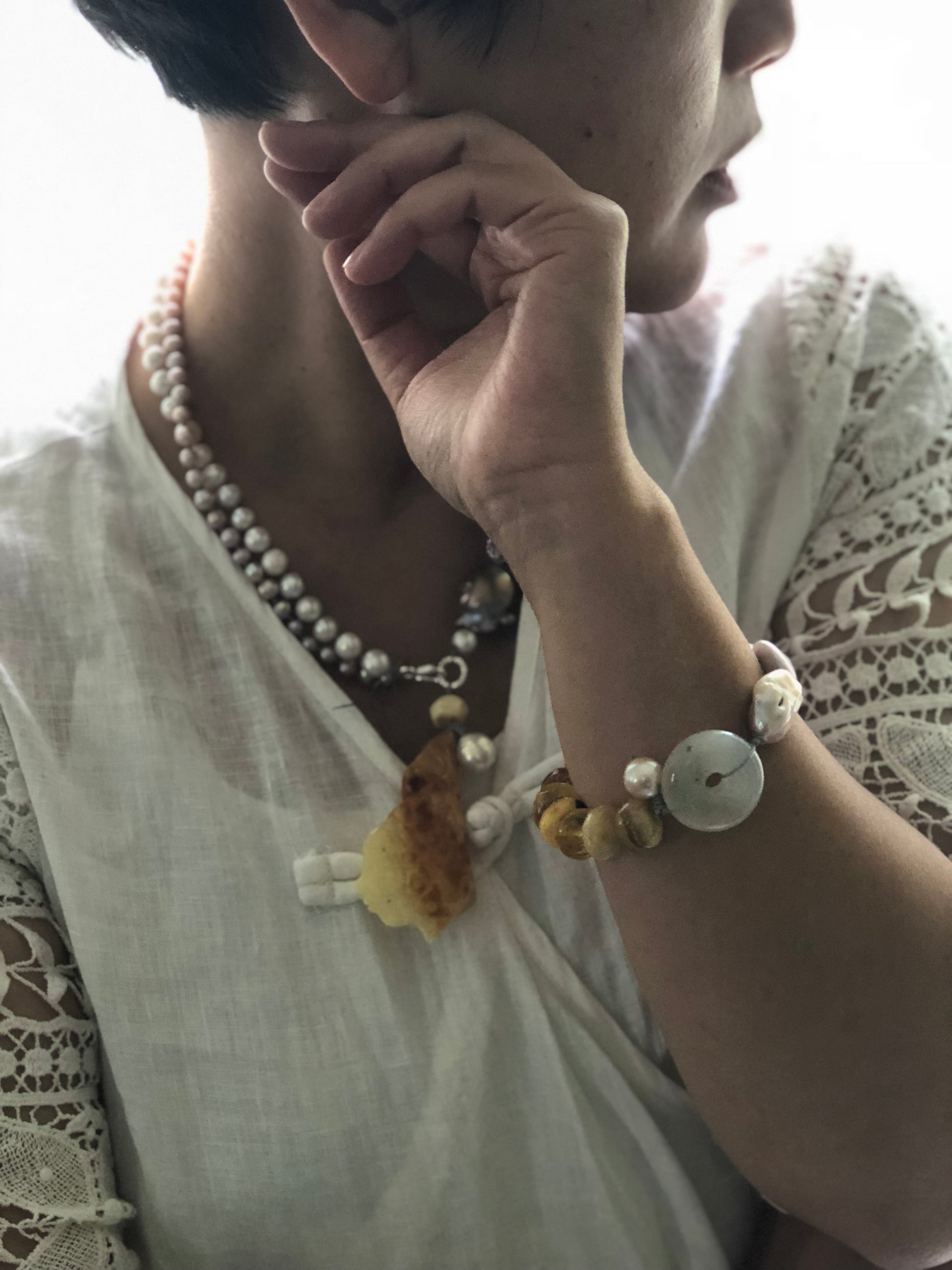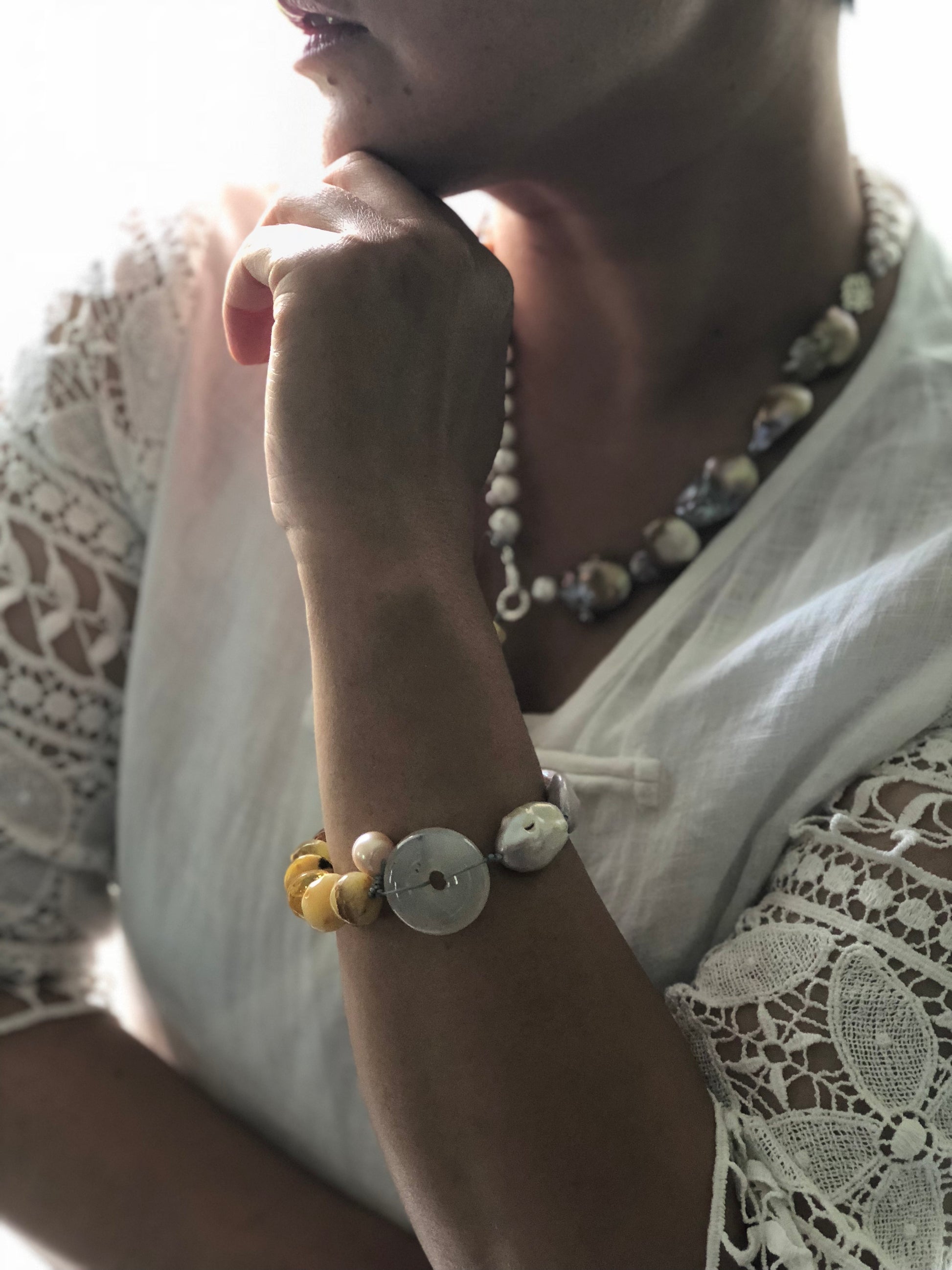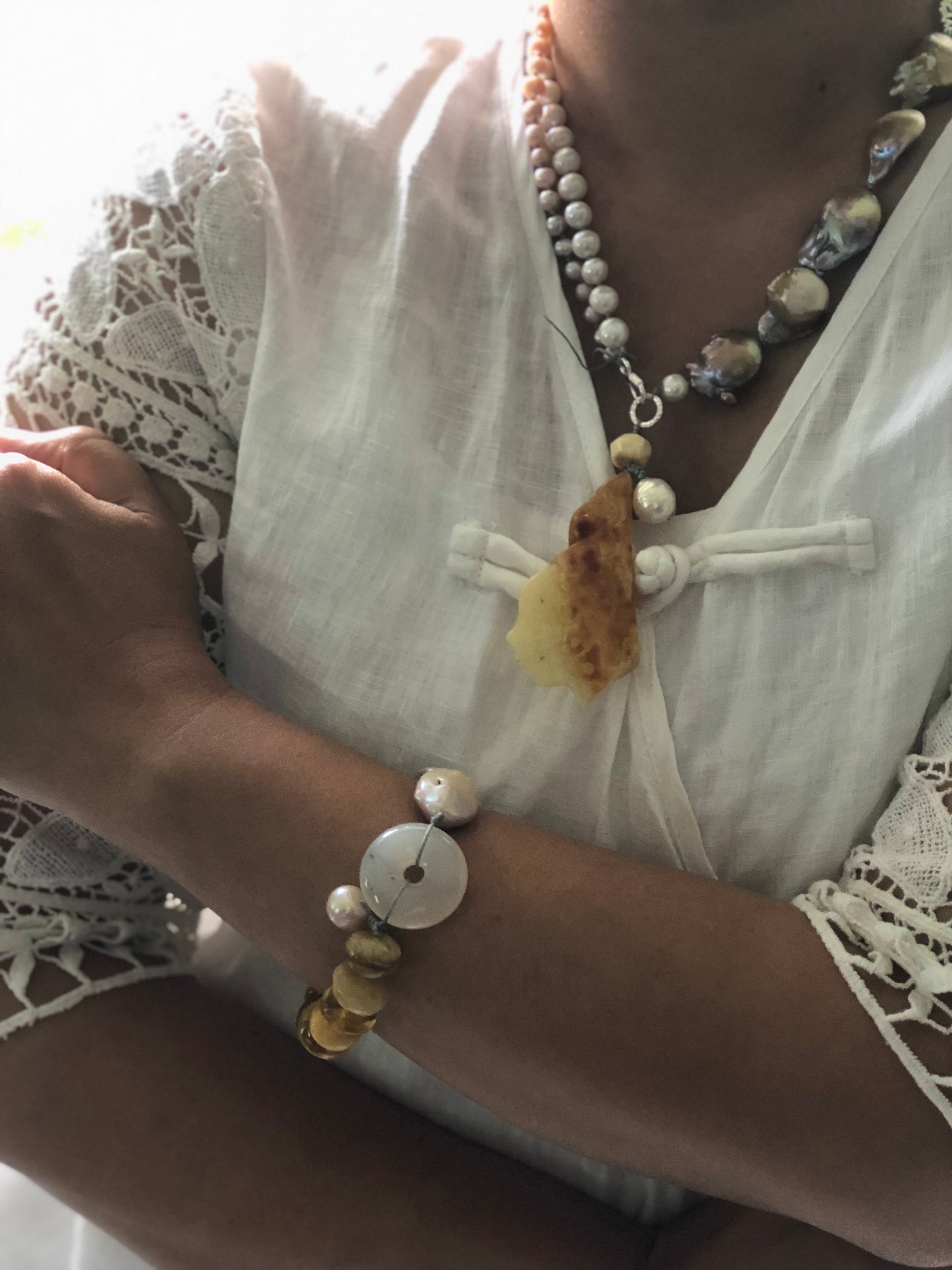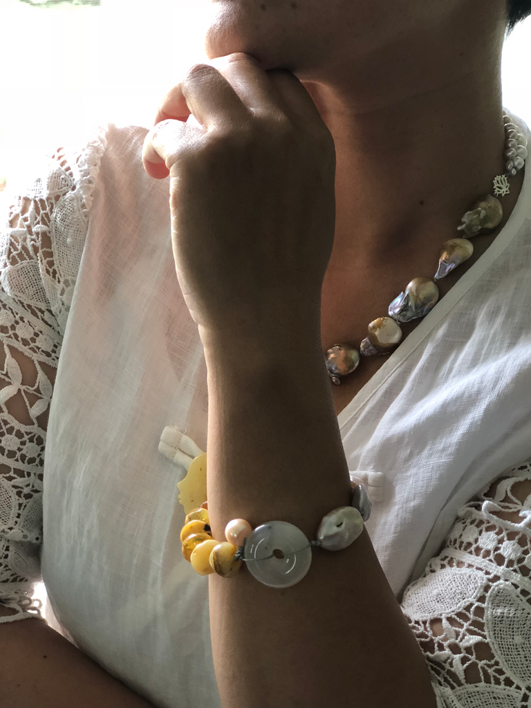 Baltic amber and baroque pearl are perfect match . Hand knotted between each beads, can be resized for special request.
