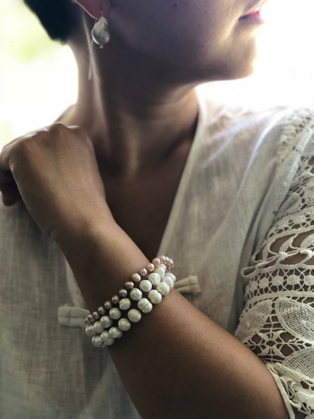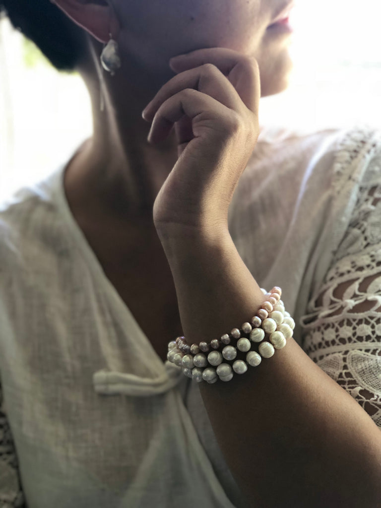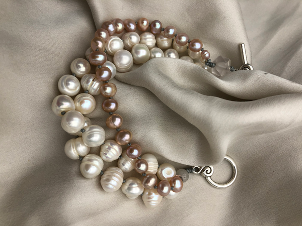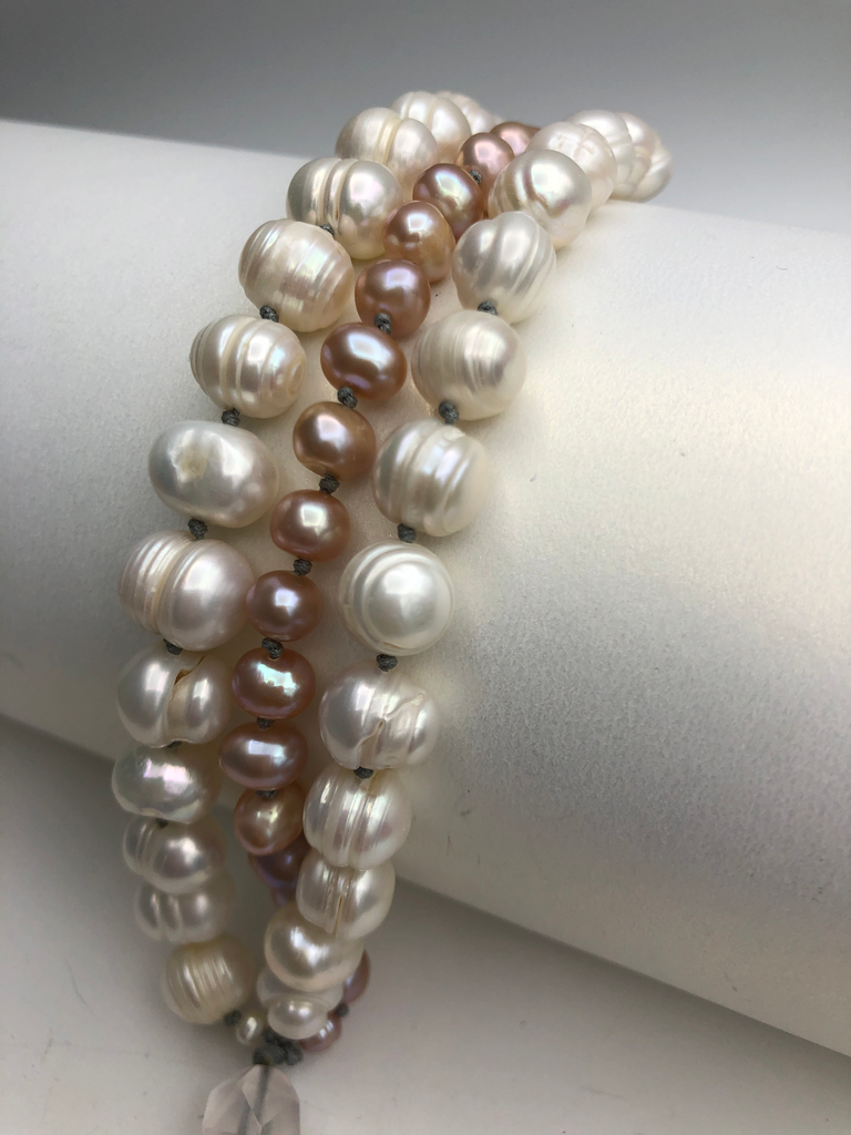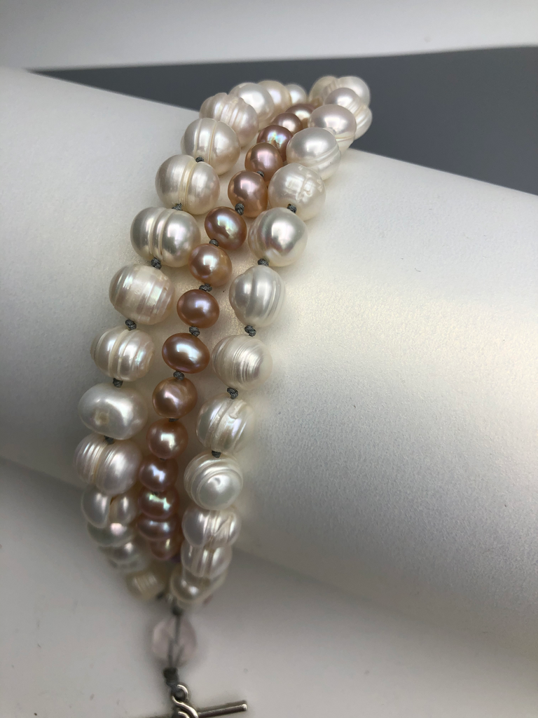 Three strand of pearls, hand knotted between each beads, can be resized for special request.