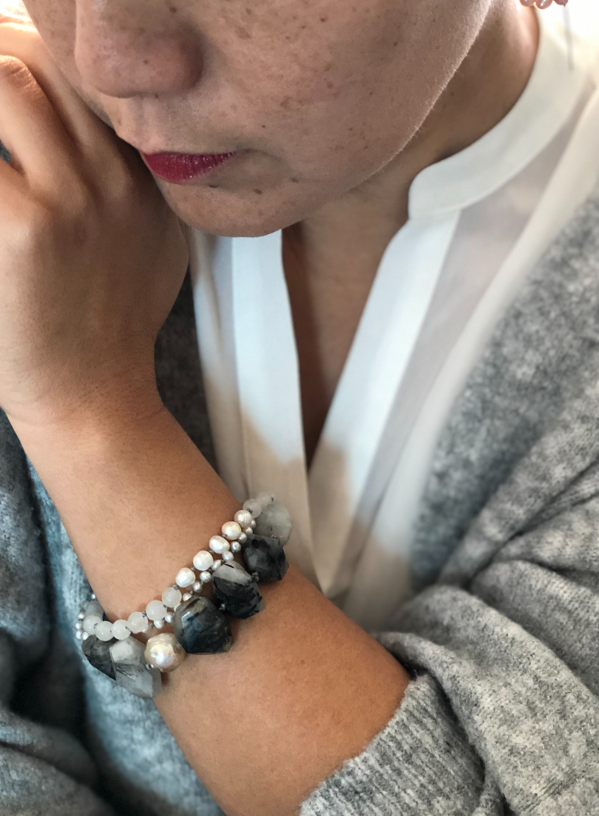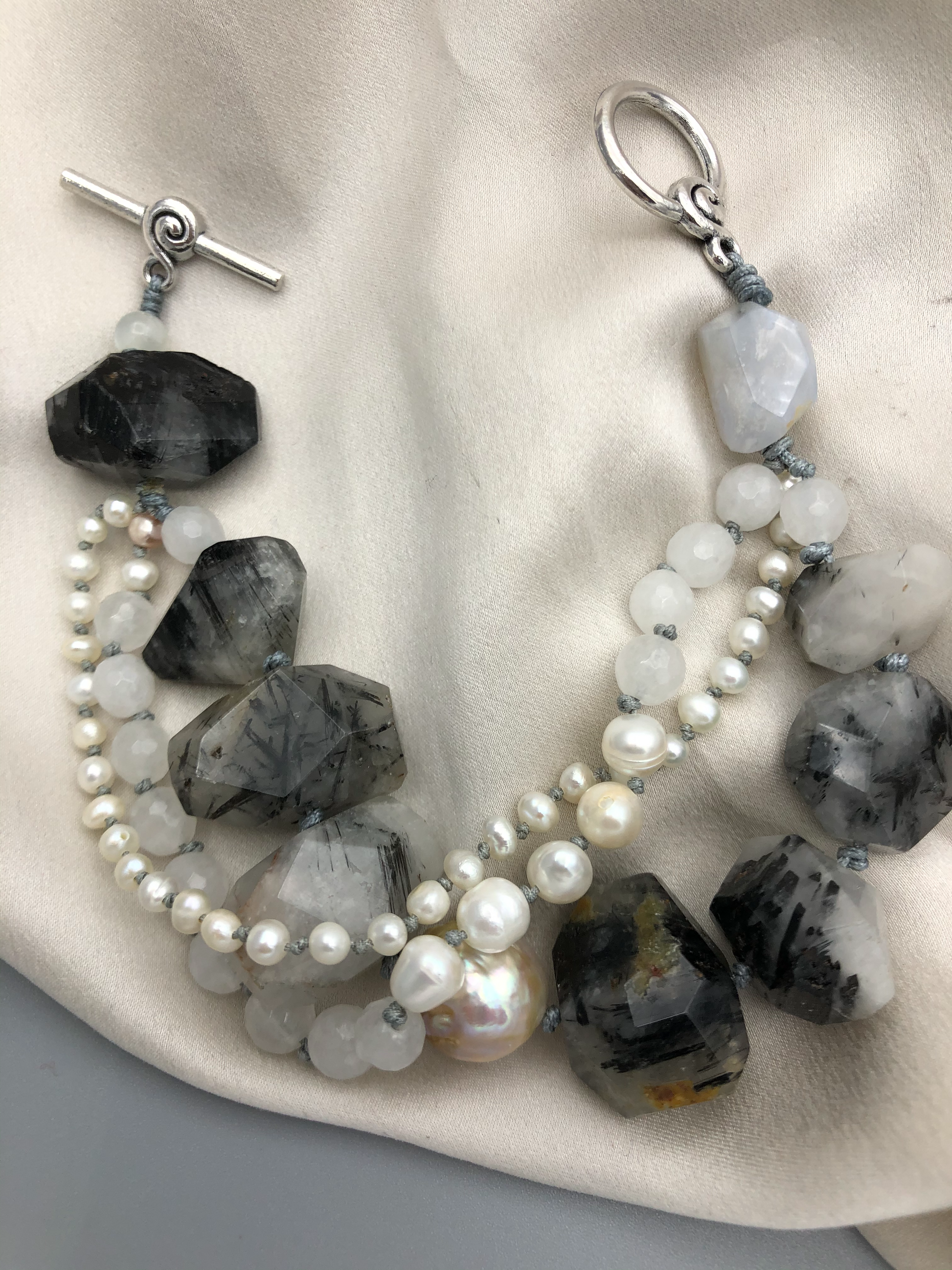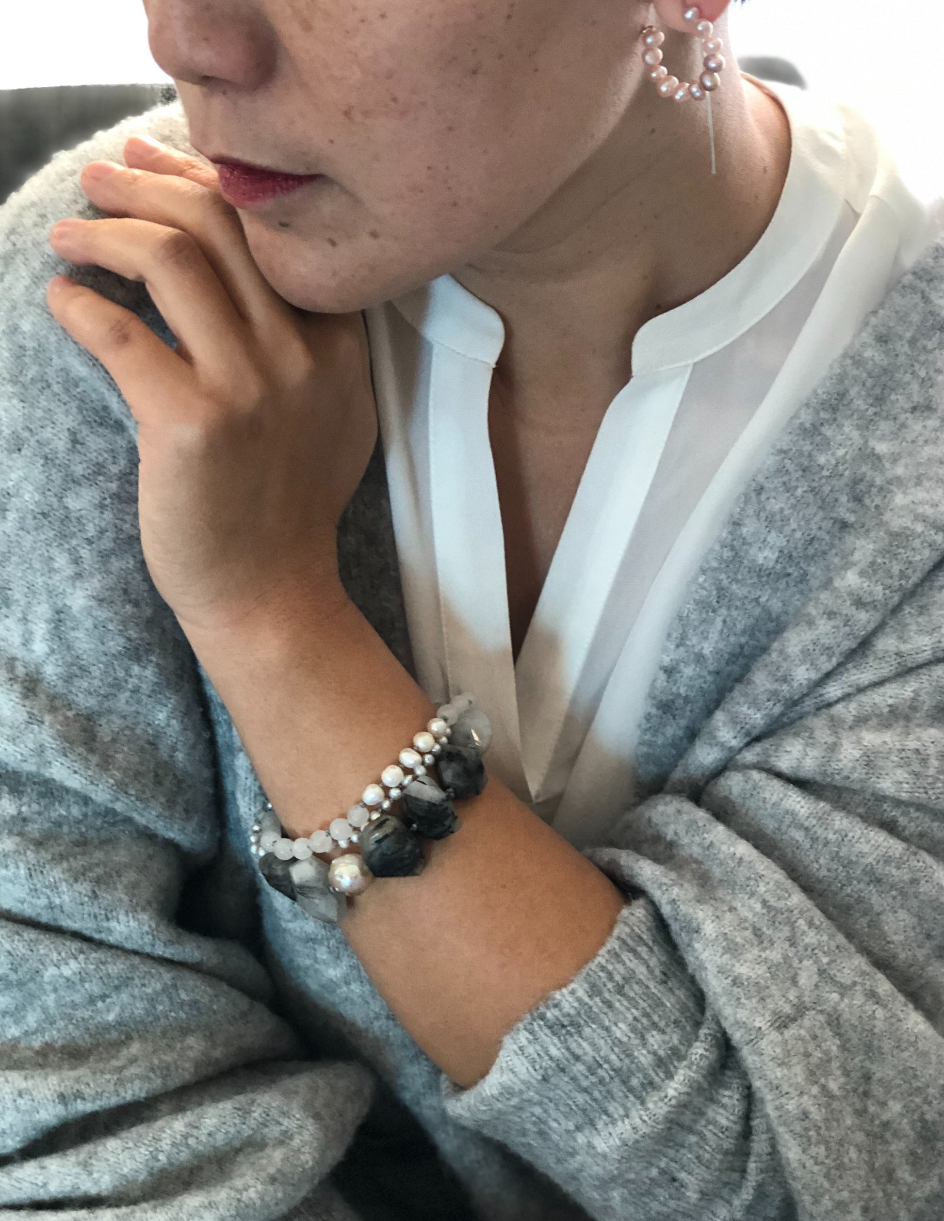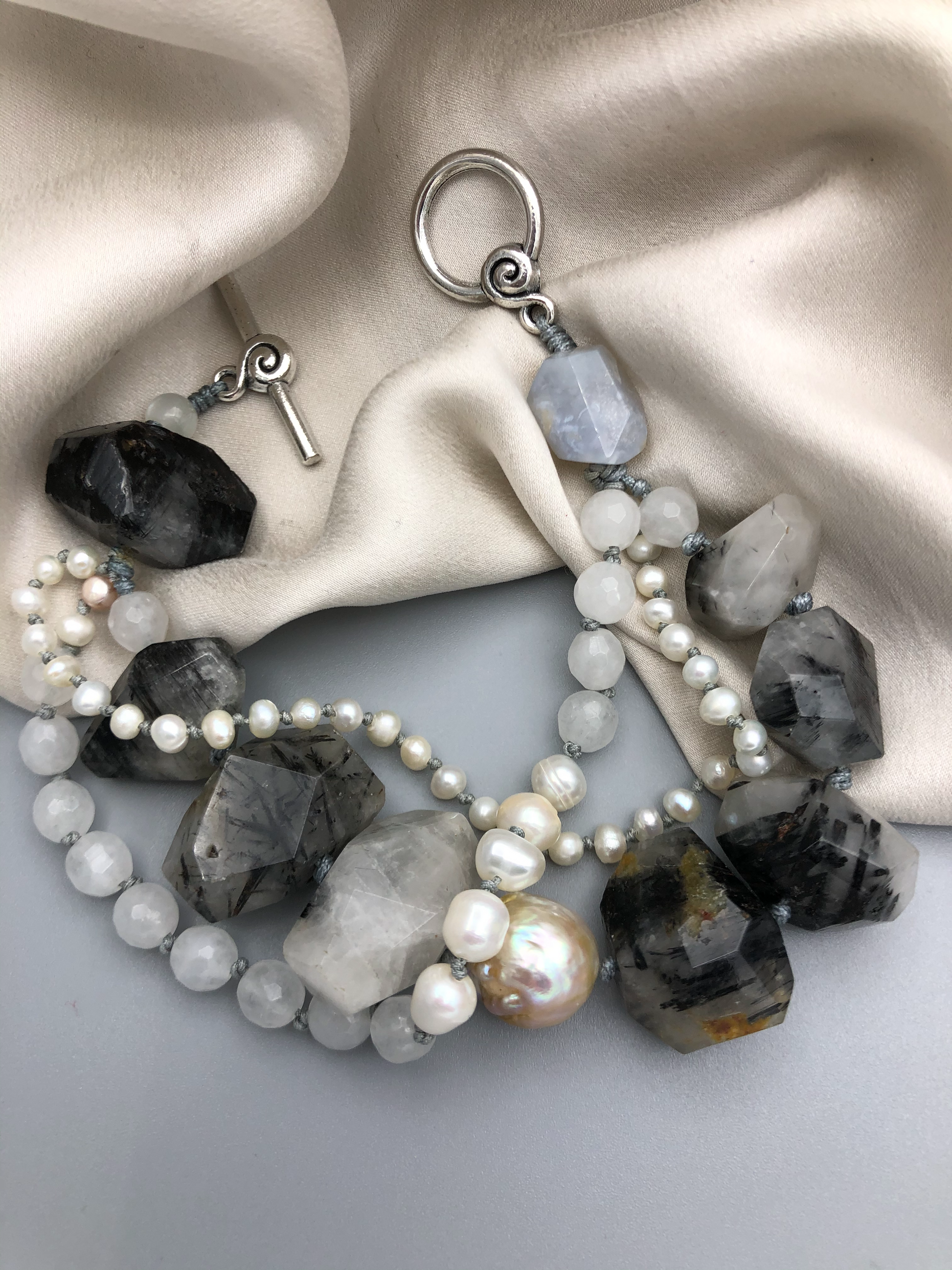Materials : Grey quartz, blue lace agate, agate, fresh water pearl