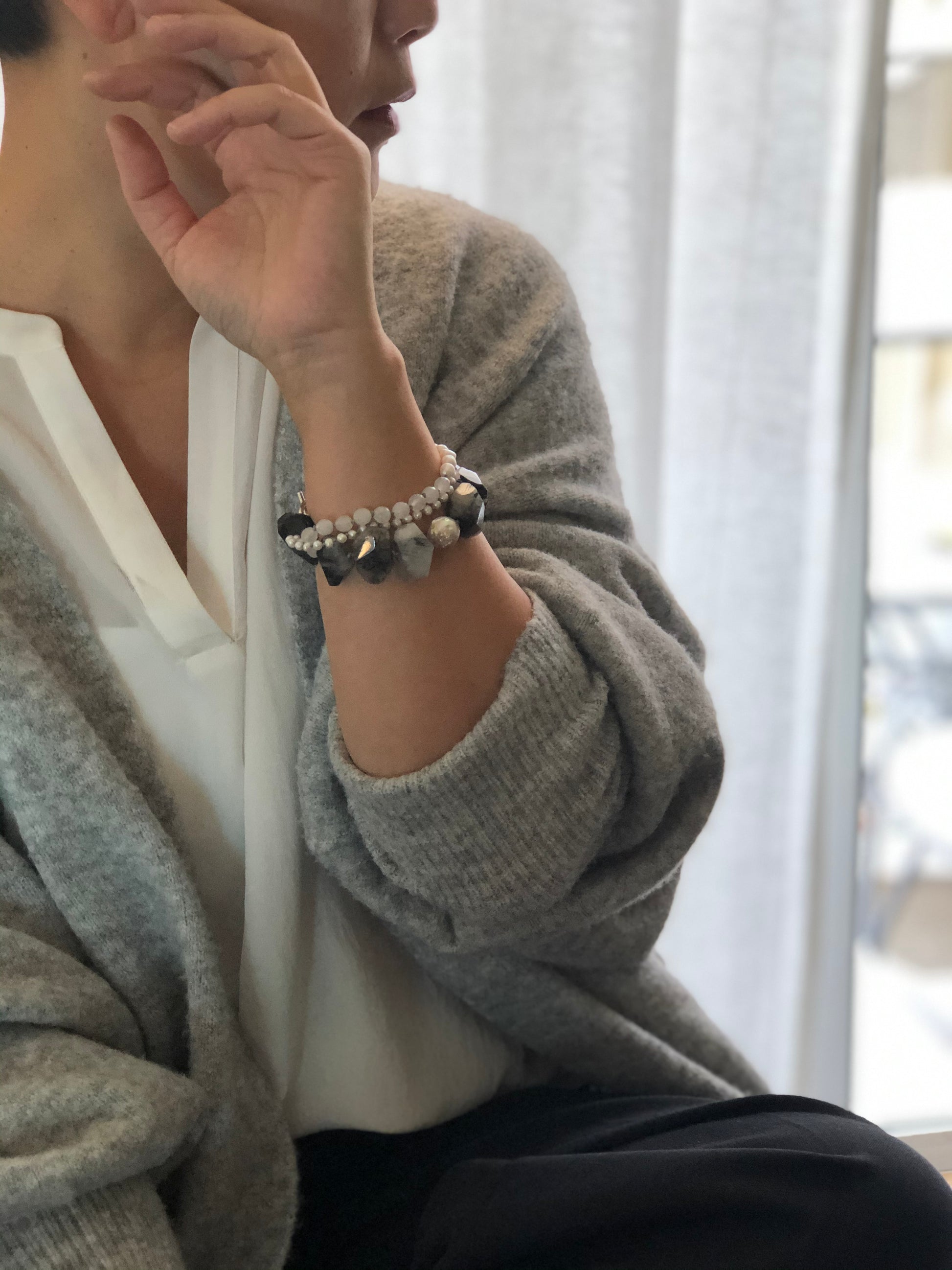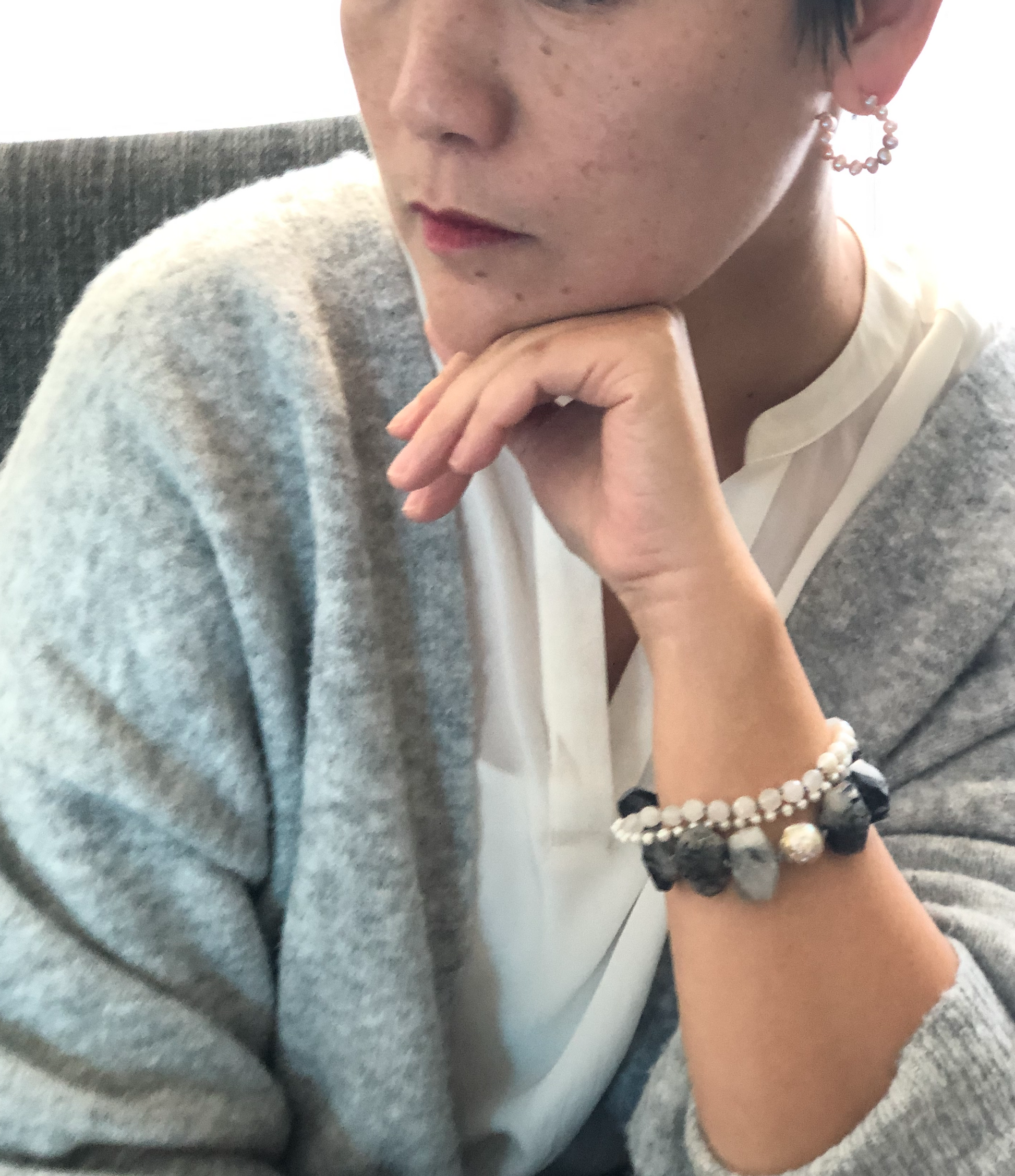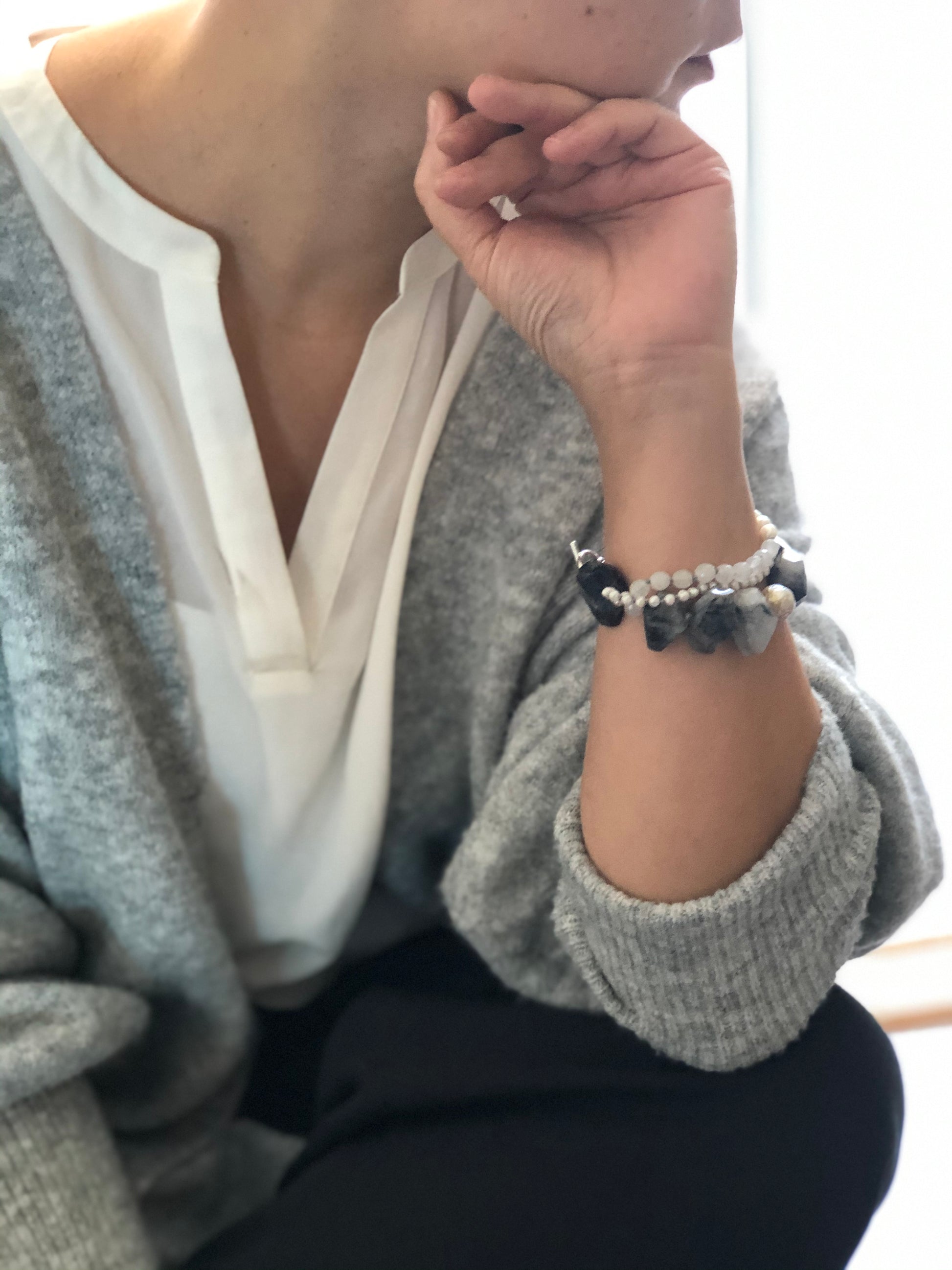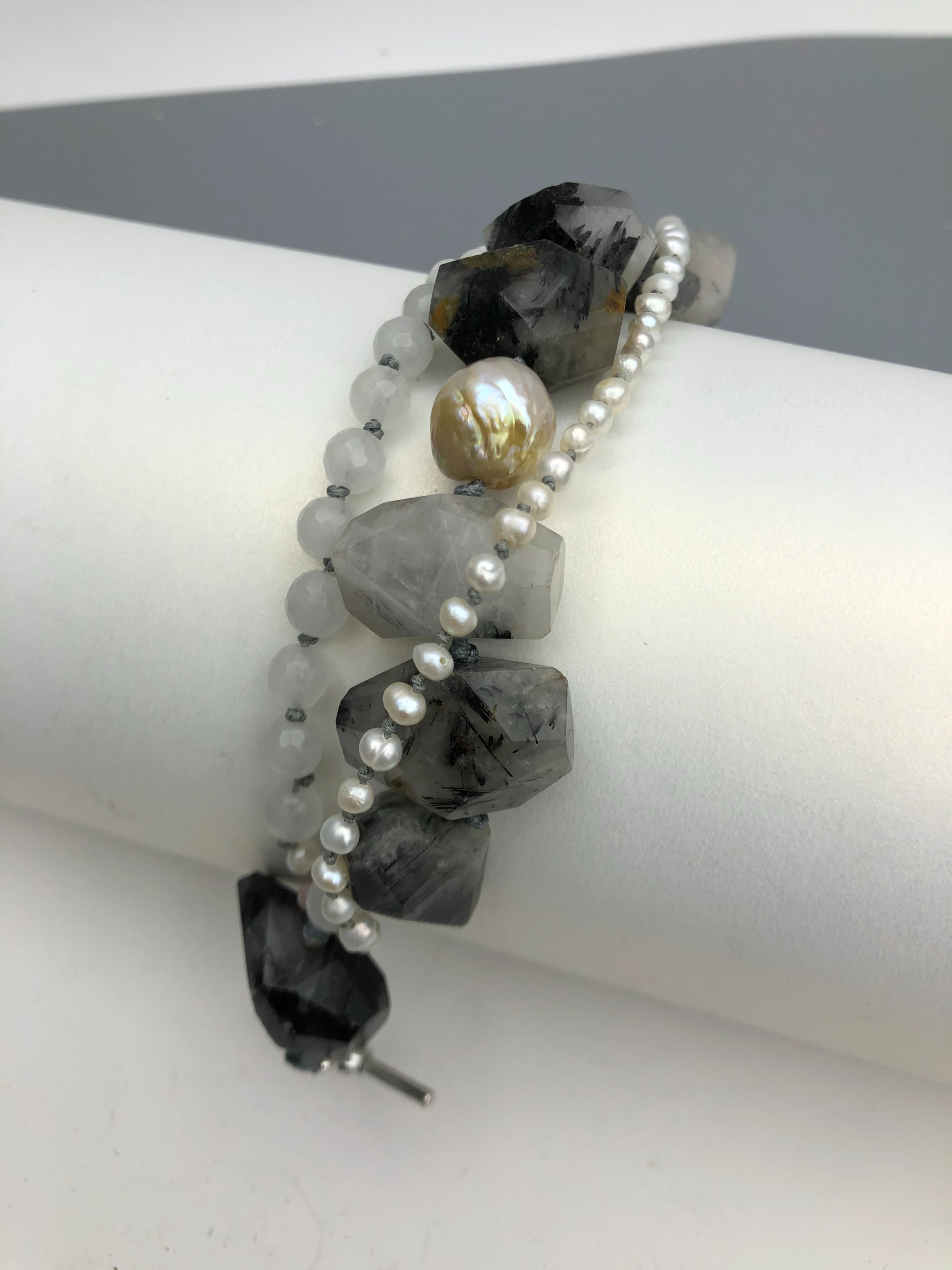 Materials : Grey quartz, blue lace agate, agate, fresh water pearl