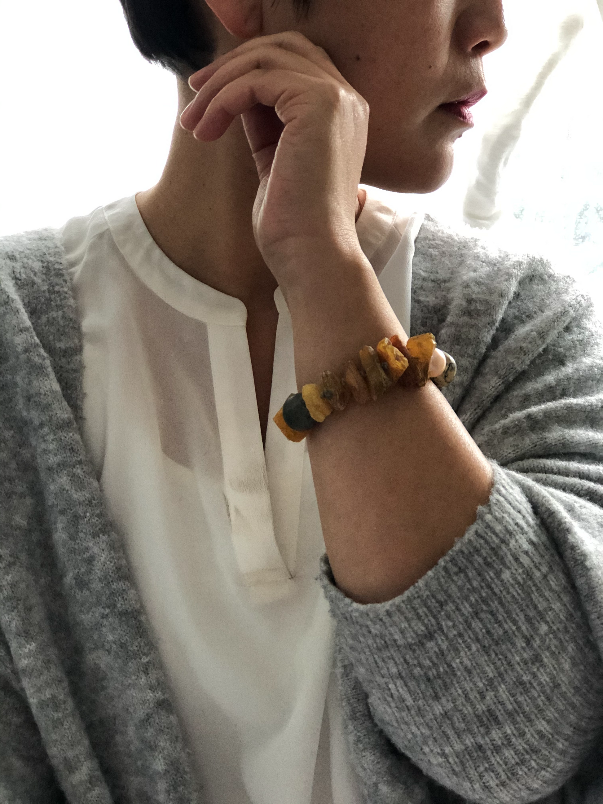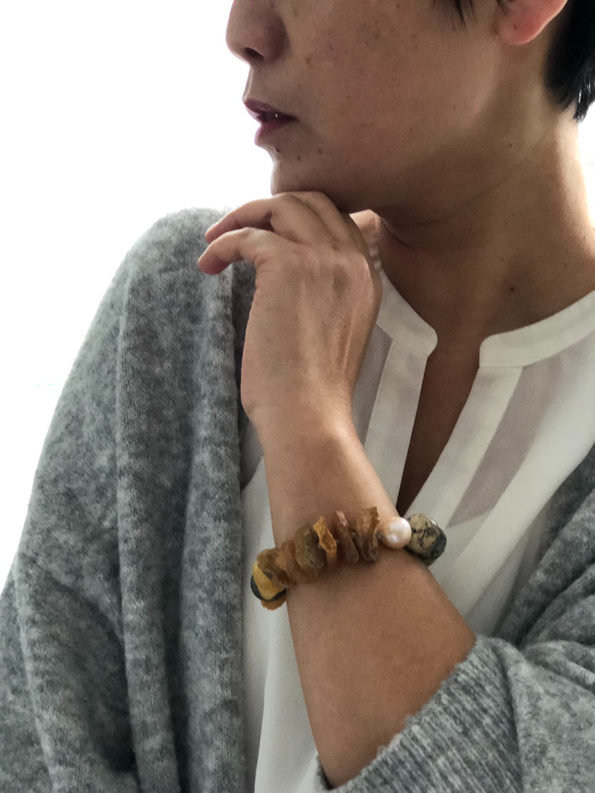 Materials : Baltic amber, jasper, fresh water pearl