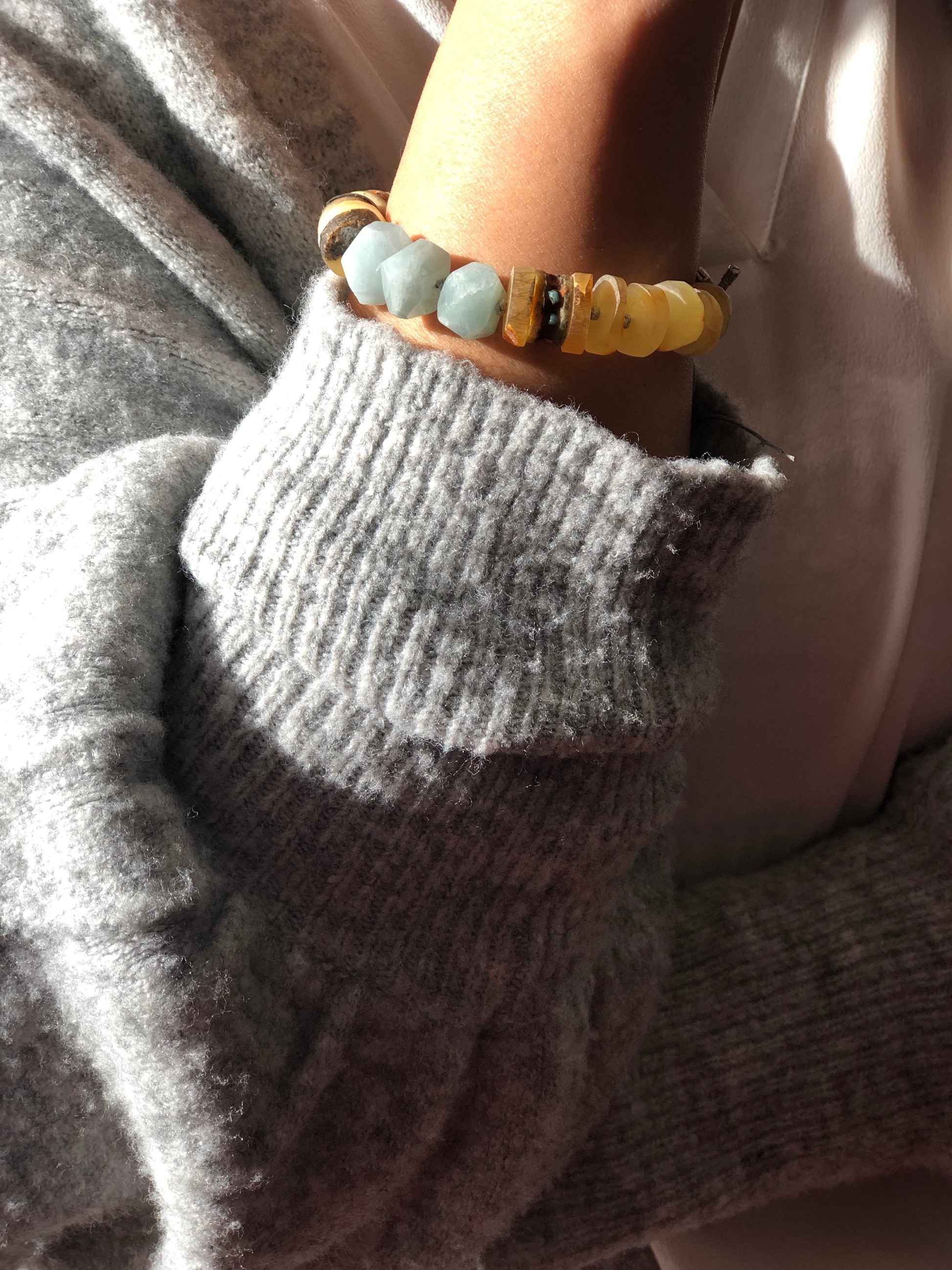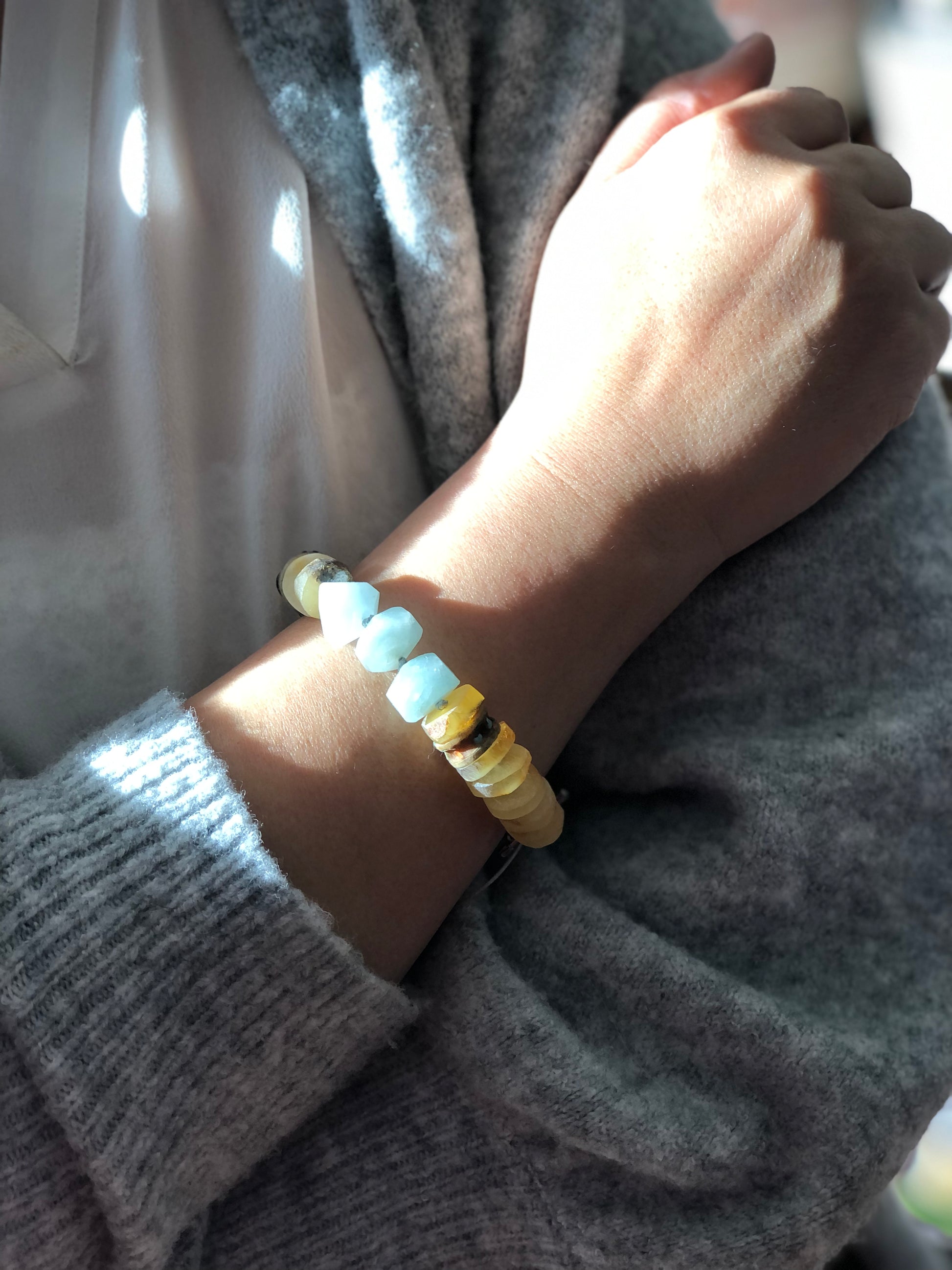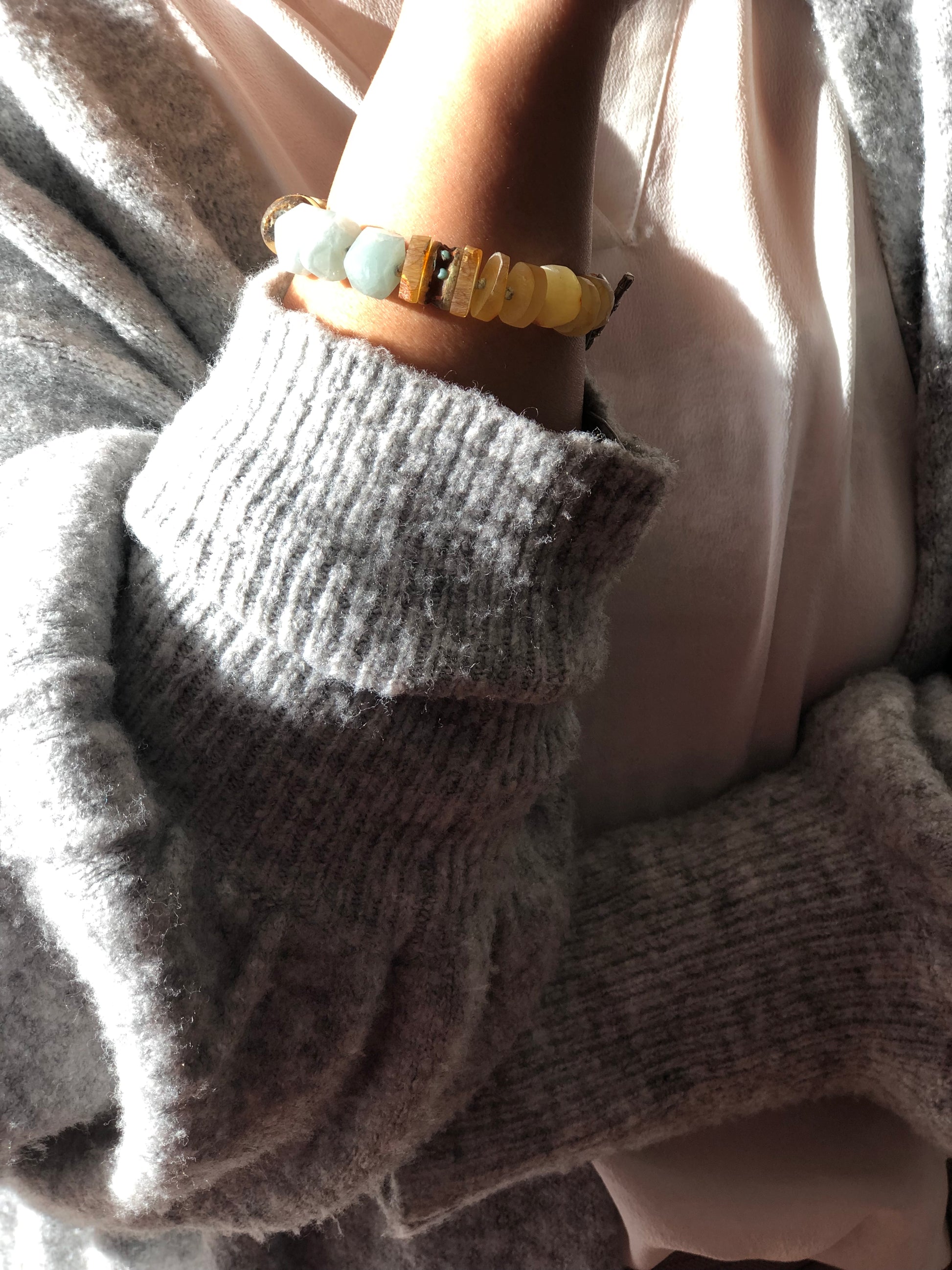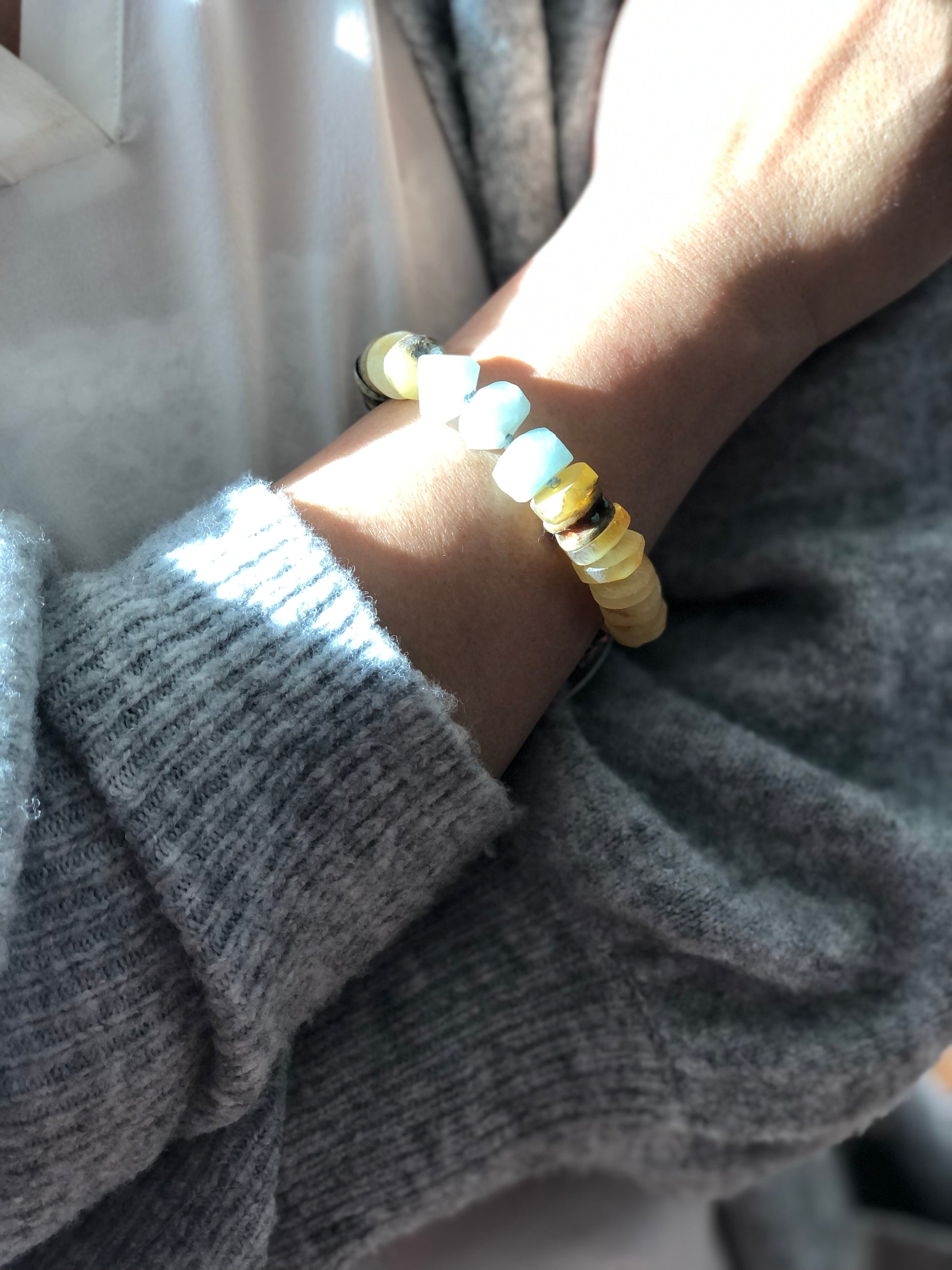 Materials : Baltic amber, fresh water pearl , aquamarine, Tibetan prayer bead