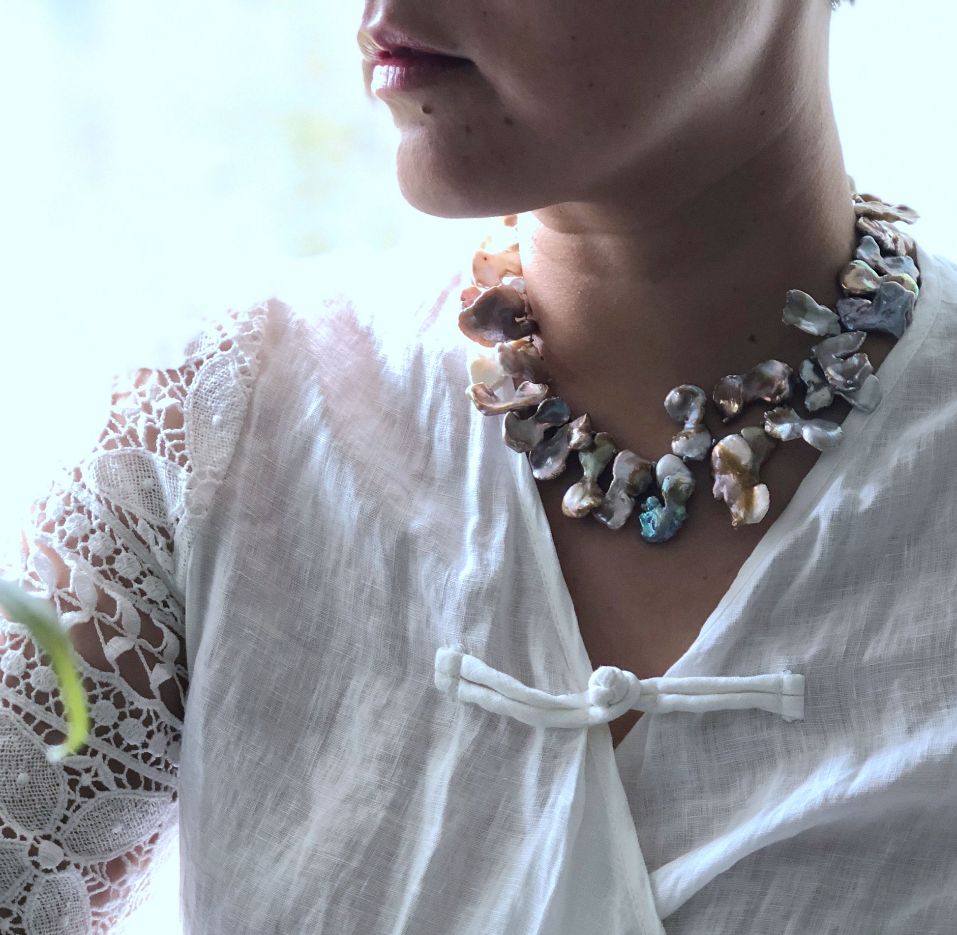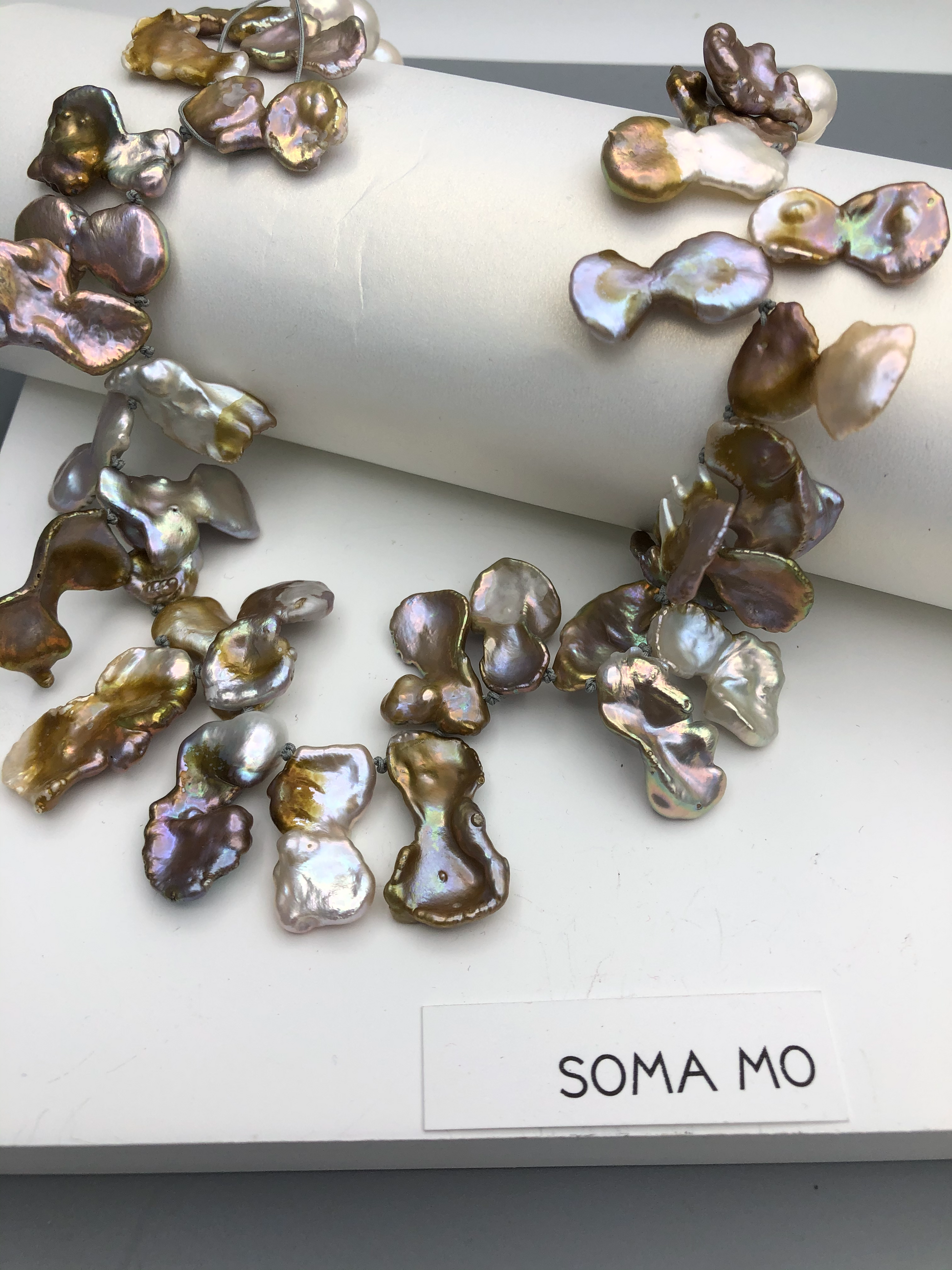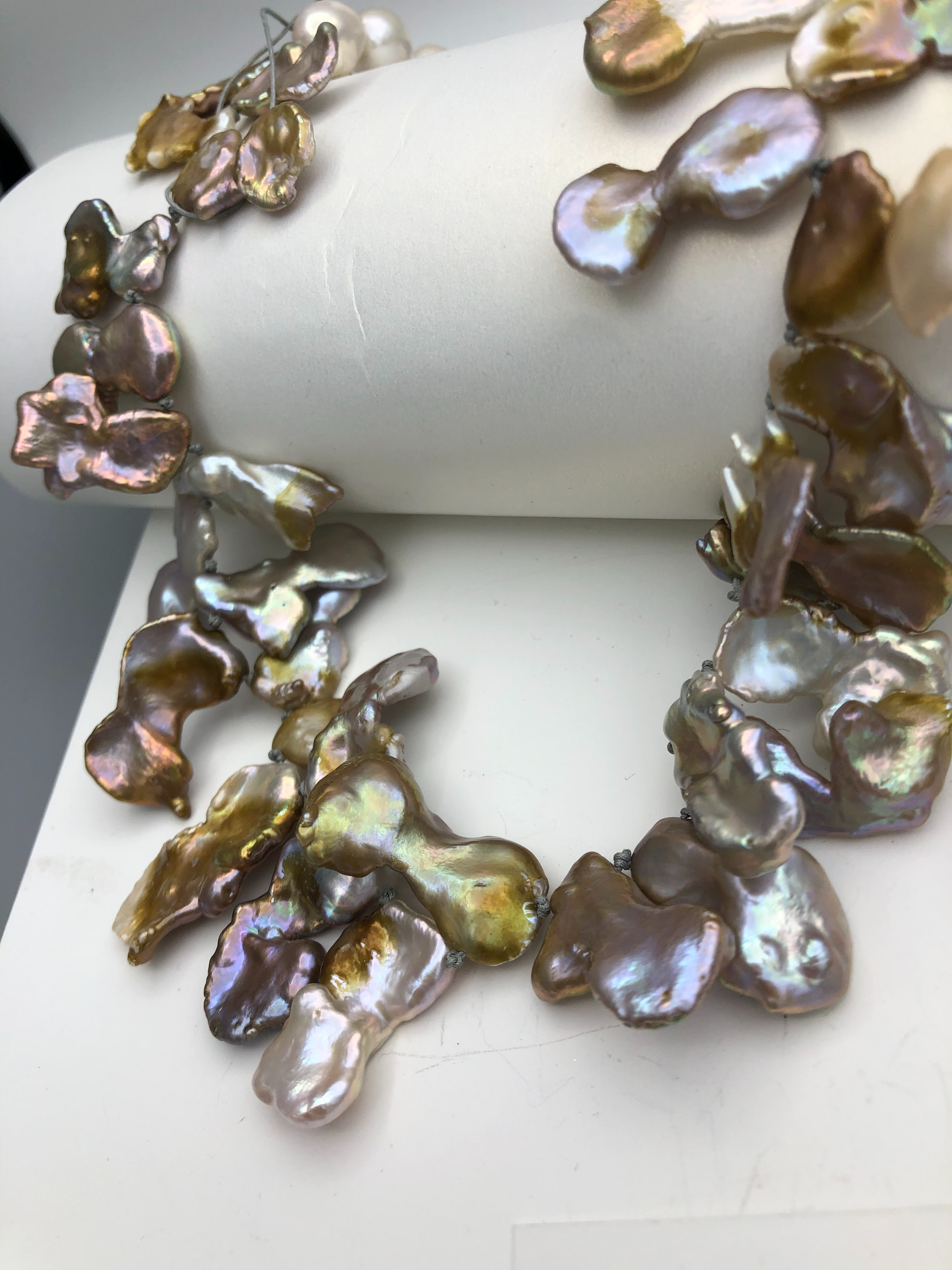 Love this color , such a rich luster , from the petal shape fresh water pearl, hand knotted between each beads.