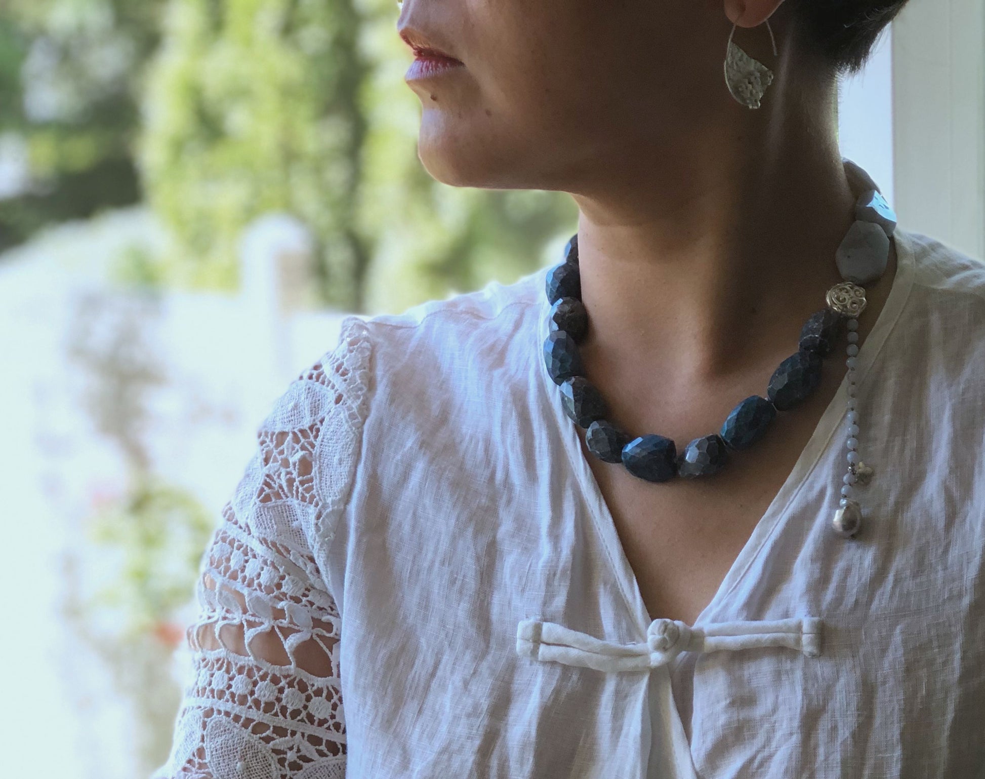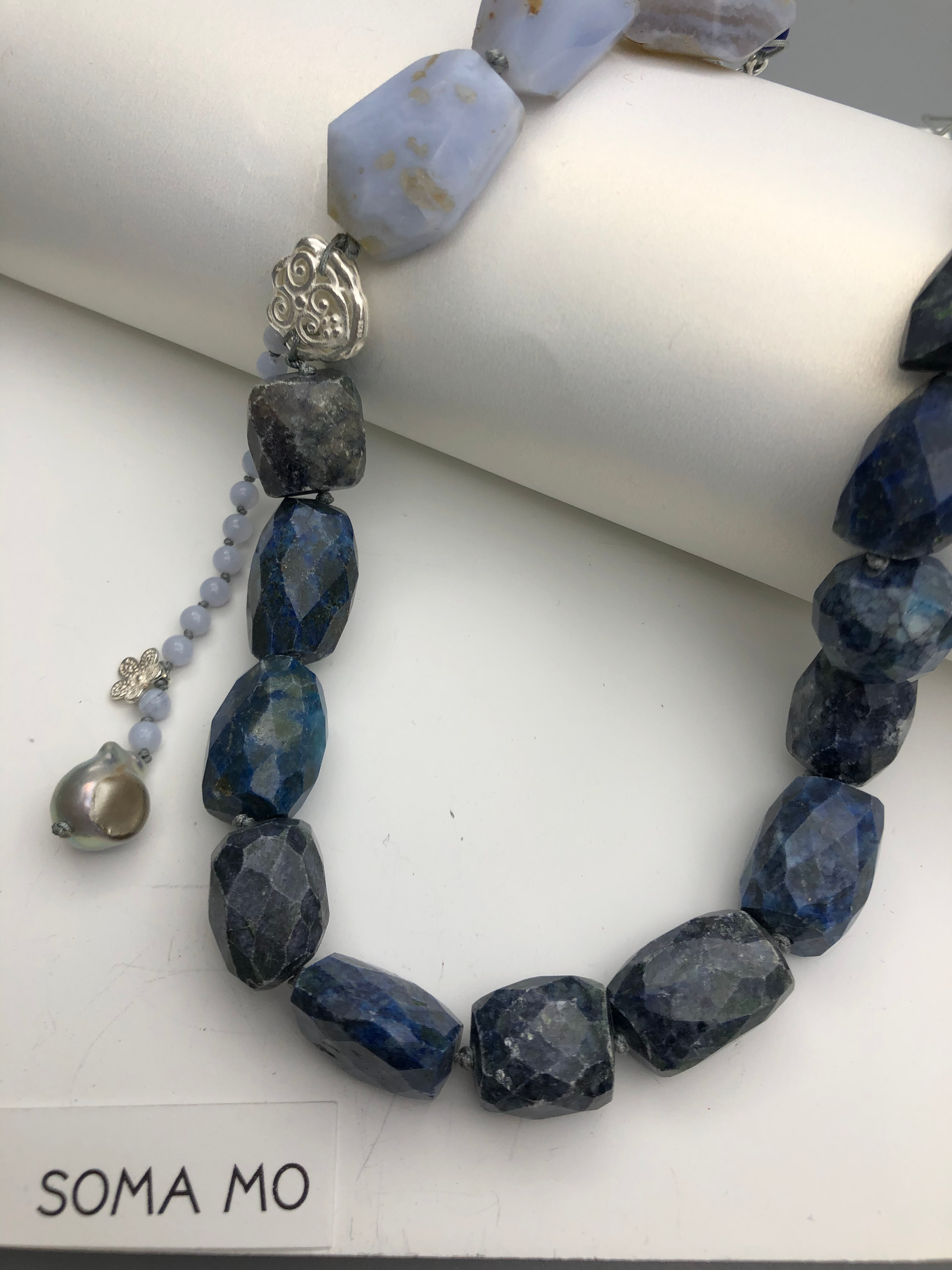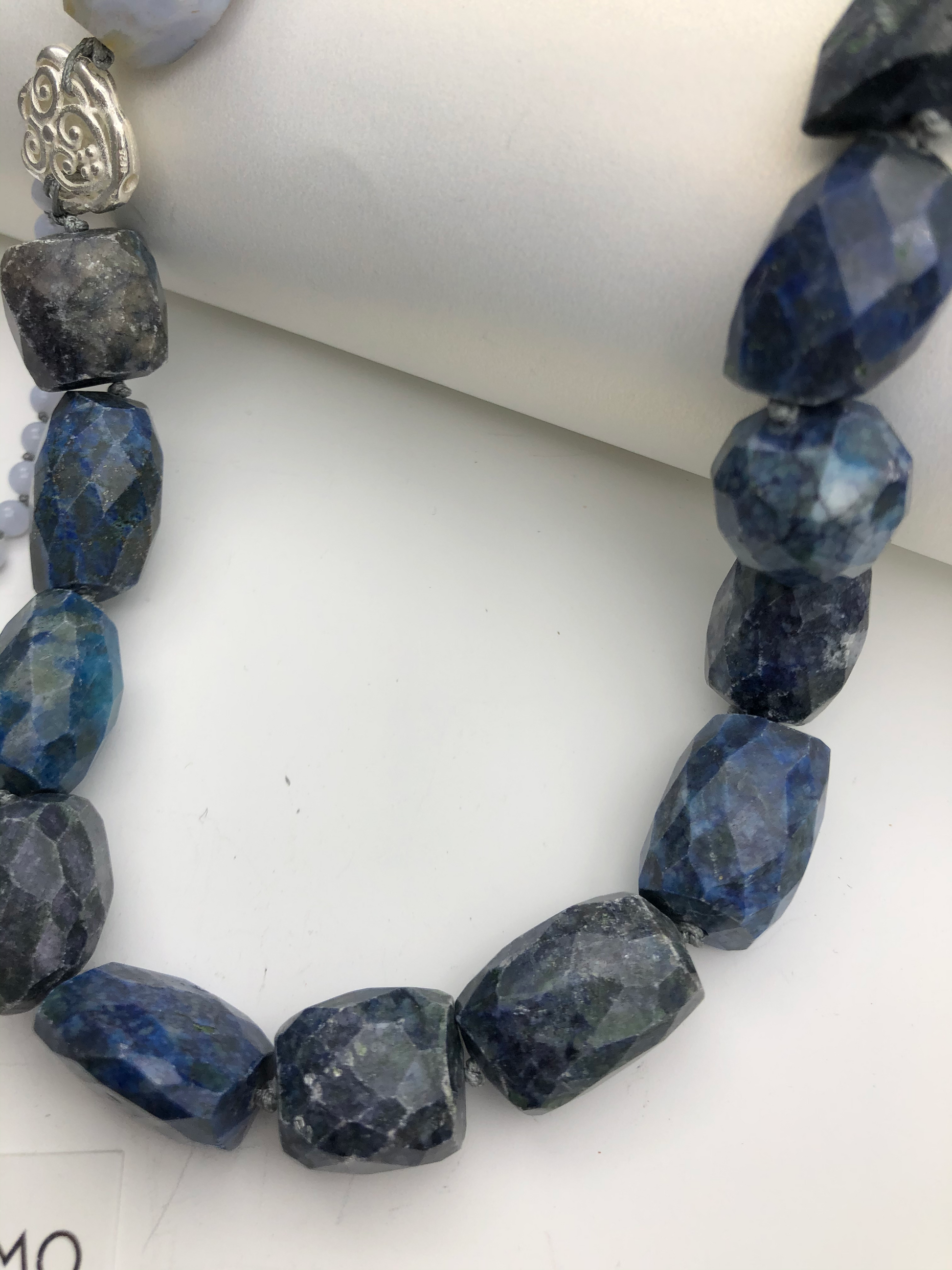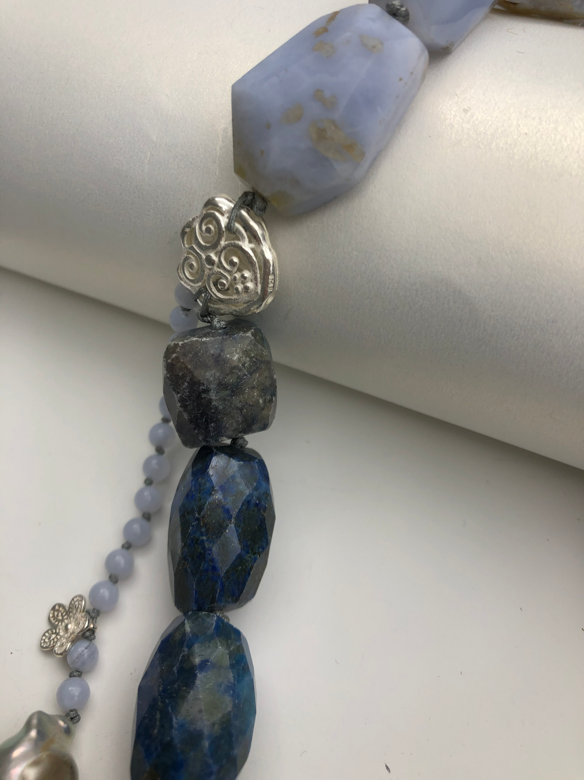 Two different shade of blue , with delicate details, is the color of summer. Hand knotted between each beads.