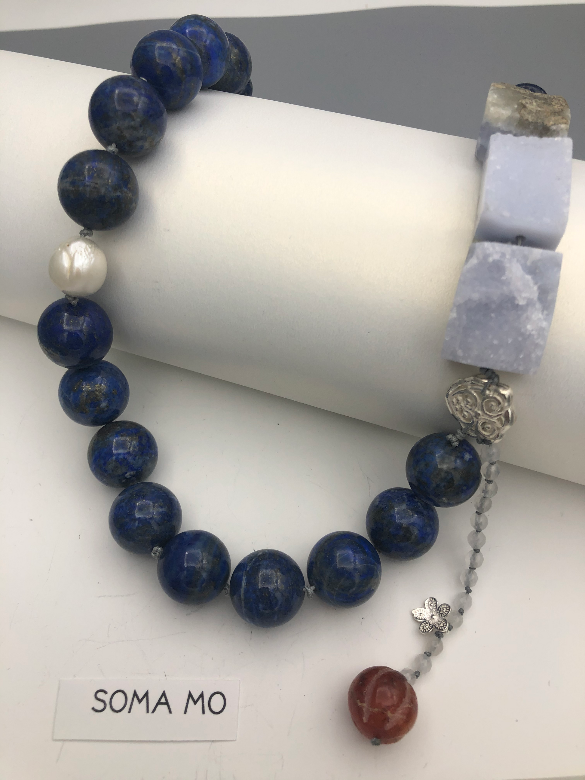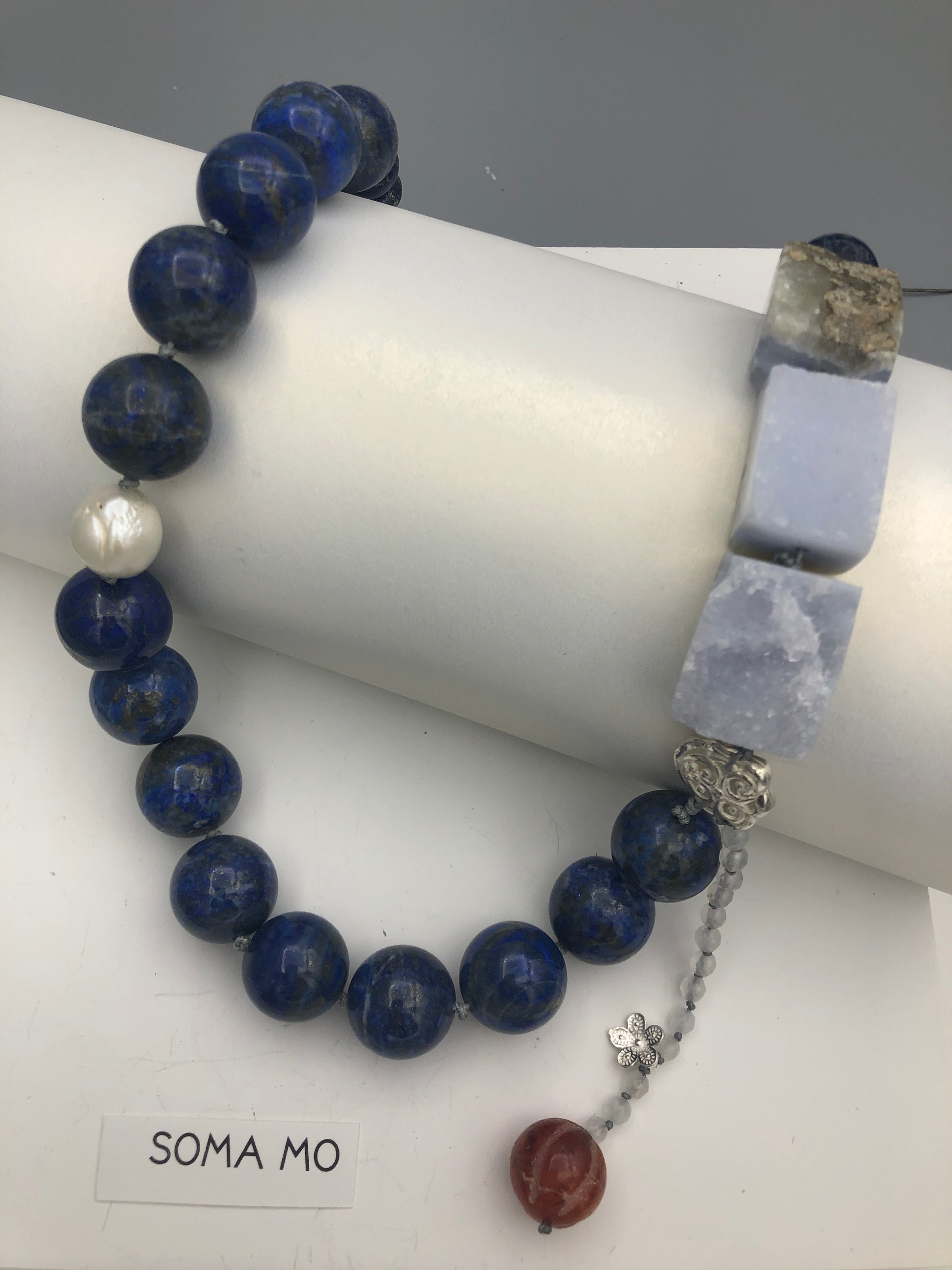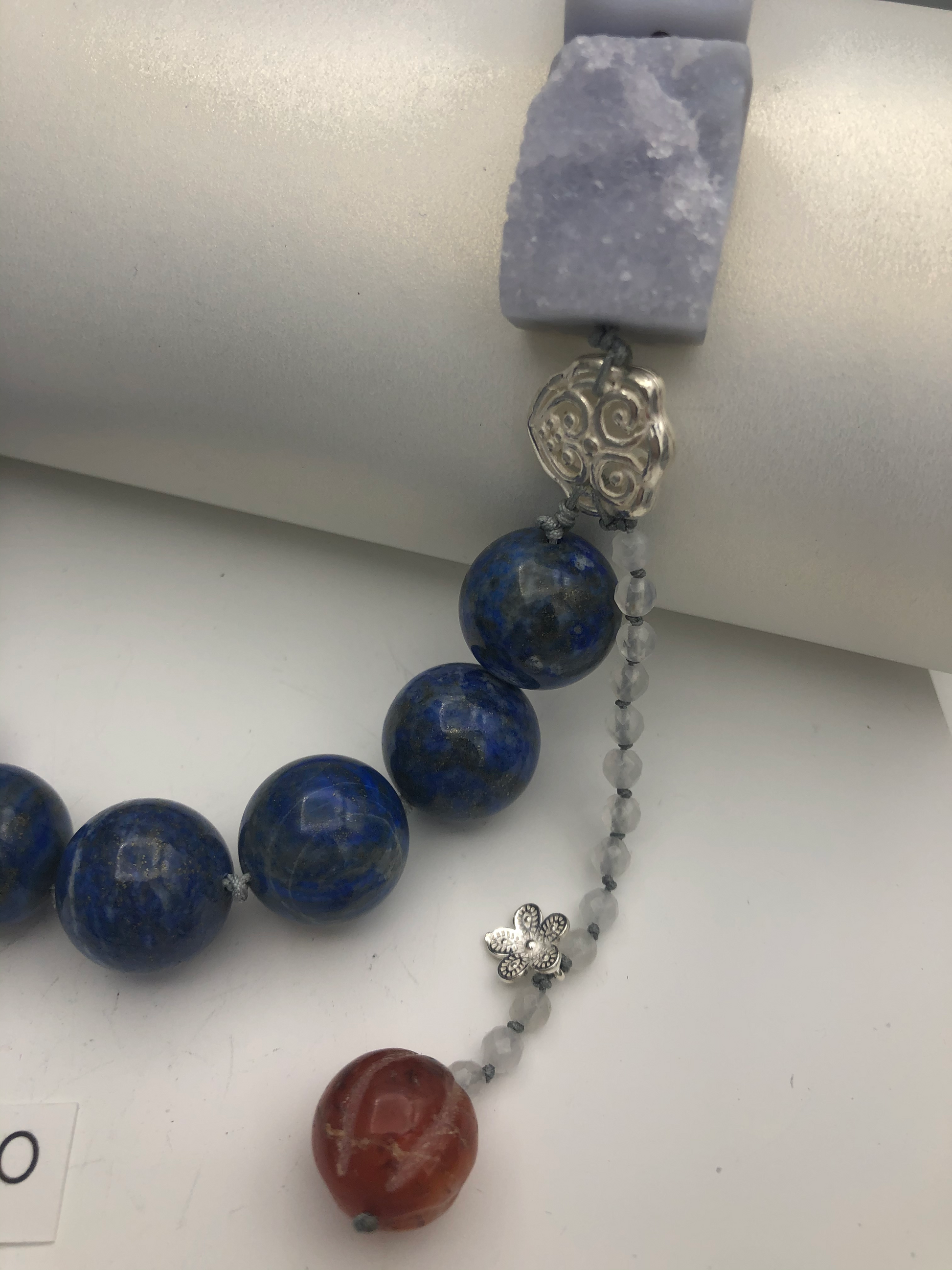 Large piece of lapis , contrast with light blue lace agate, with a little bit detail, this necklace is a statement piece. Hand knotted between each beads.