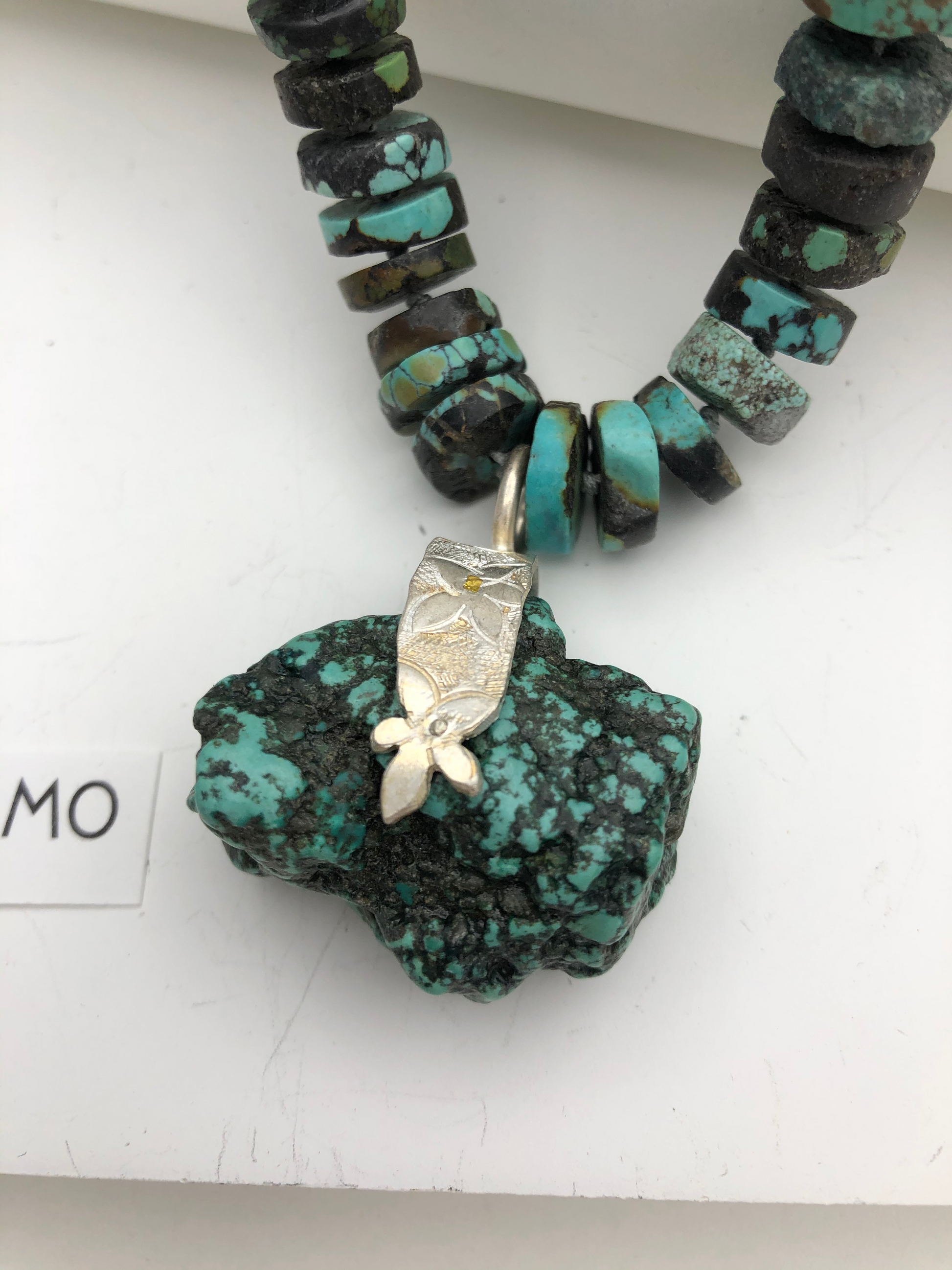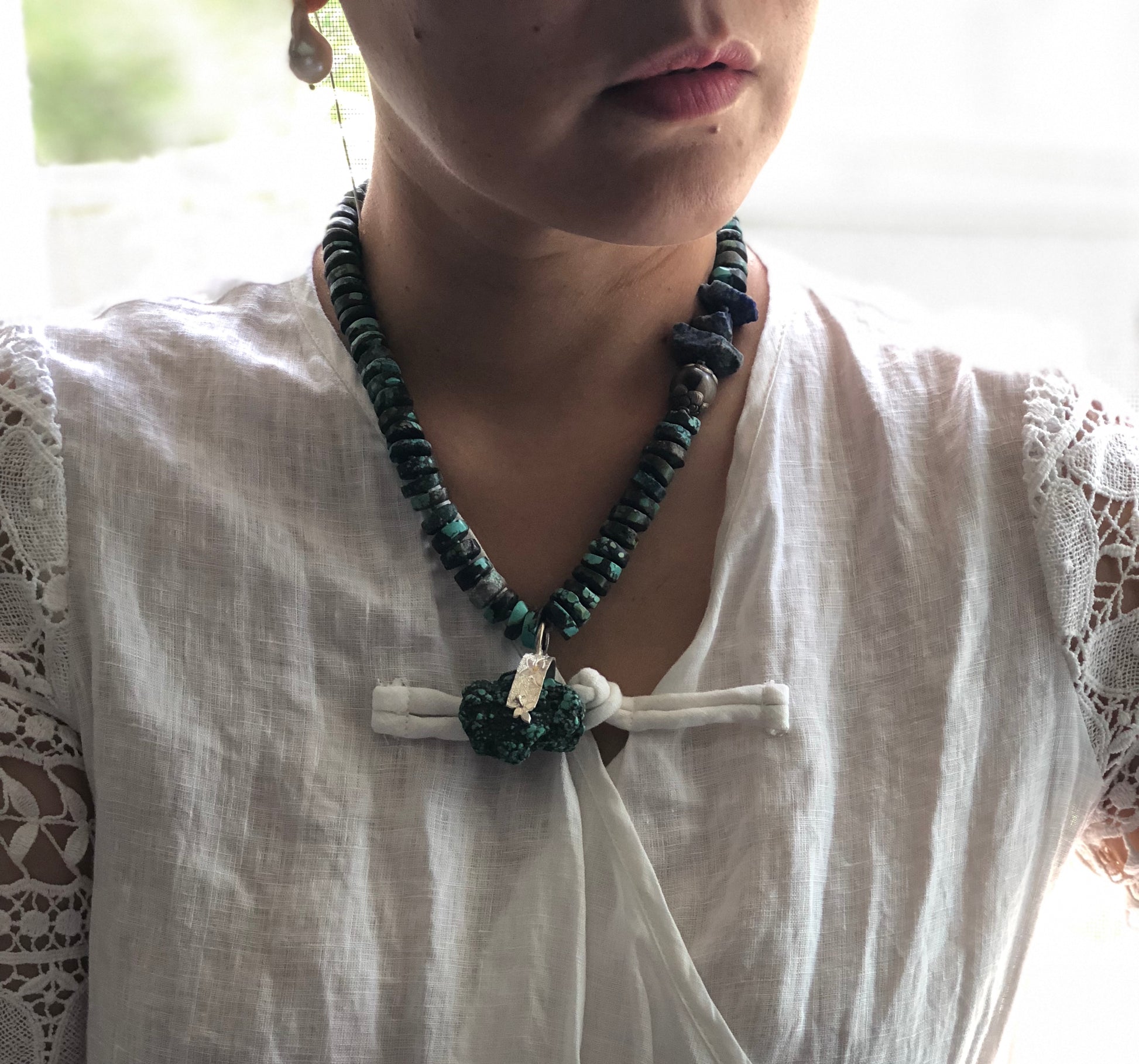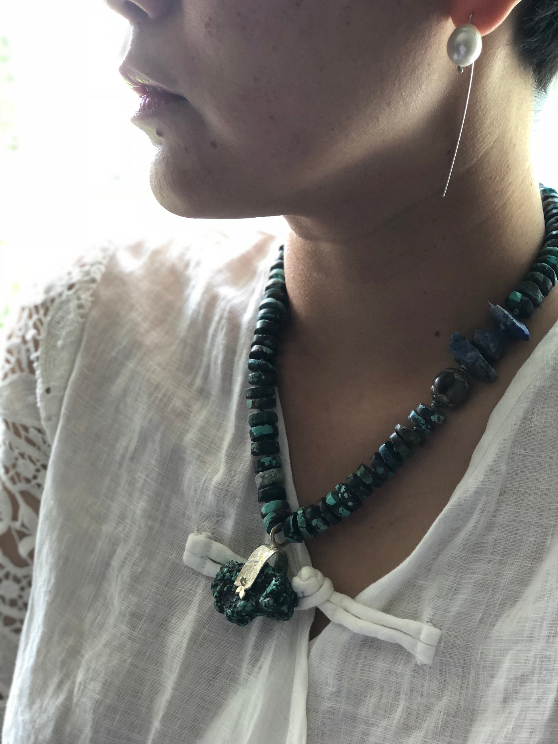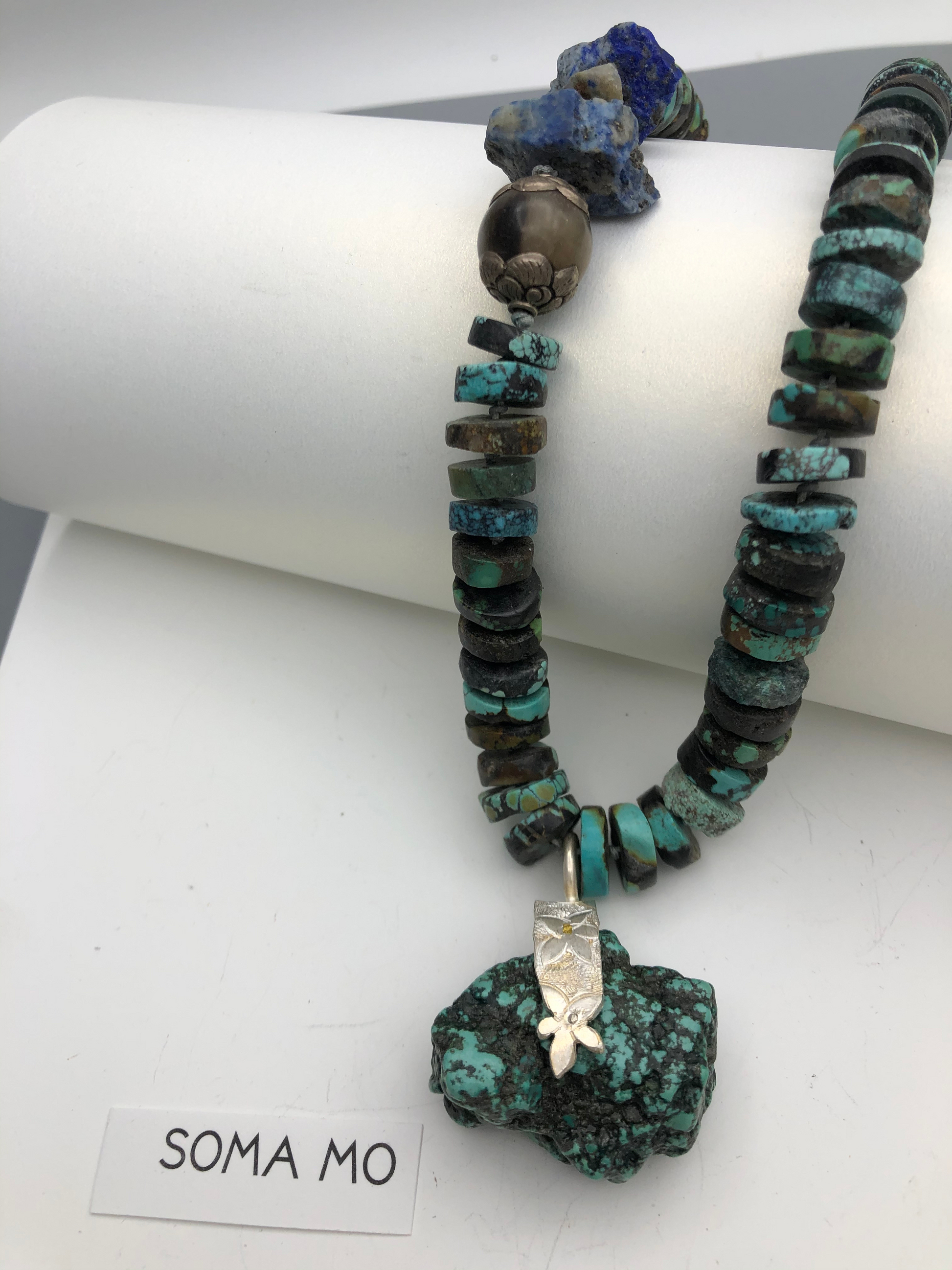 I set fine silver on the large chunk of tequoise, and made it to a necklace with other tequoise , with a little raw lapis . Hand knotted between beads.
