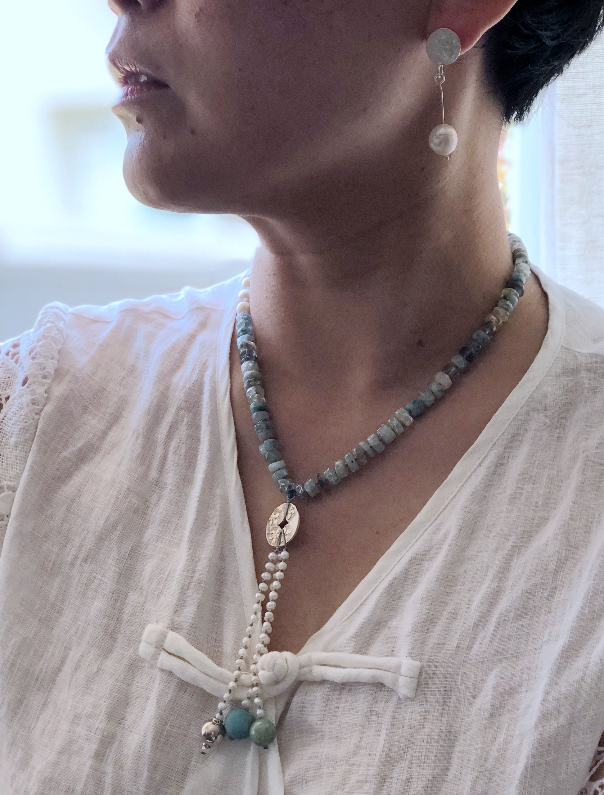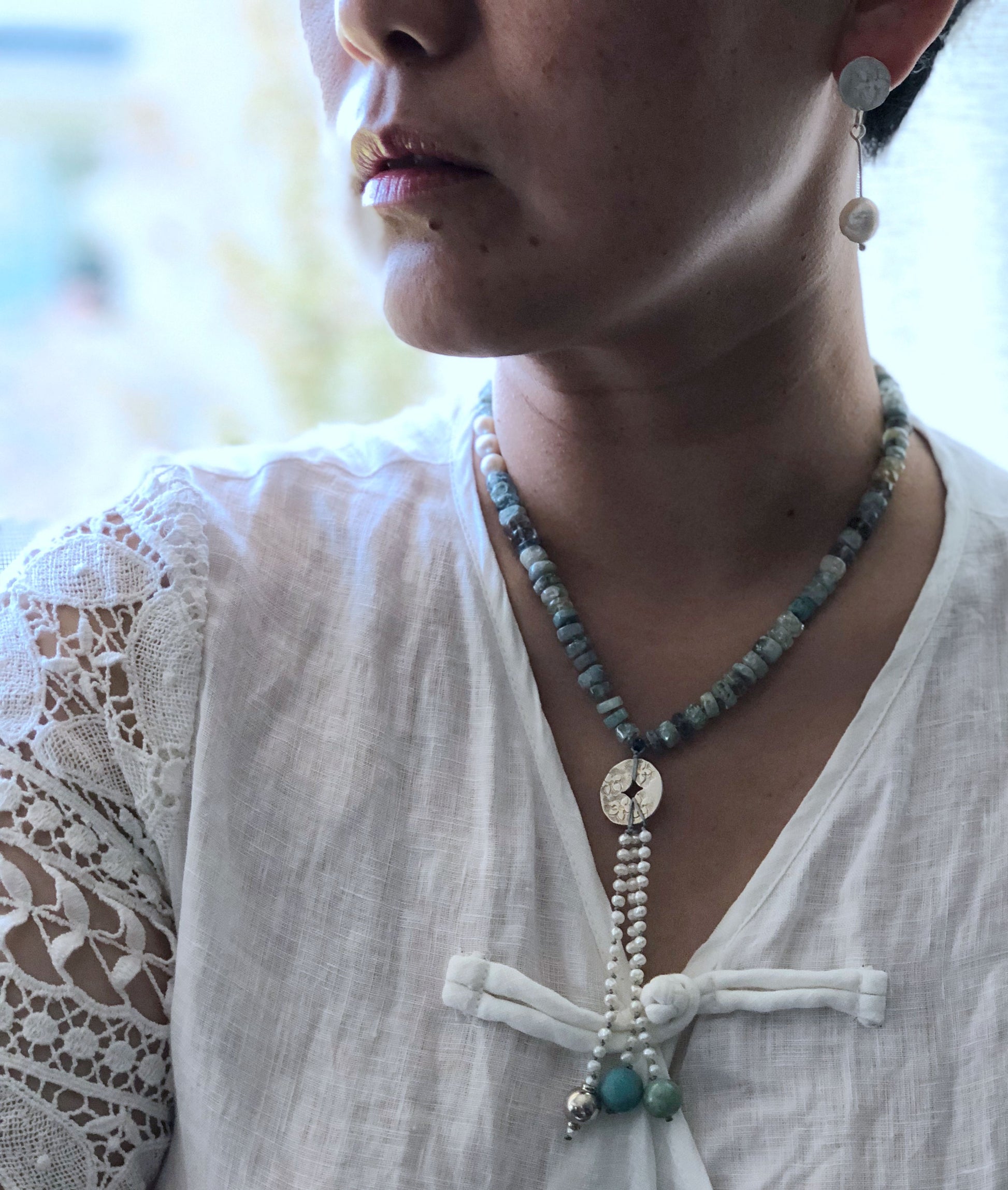 I made this fine silver pendent to match these aquamarine, because its fine color .Hand hammed pendent. Hand knotted between each beads. Can be resized for special request.