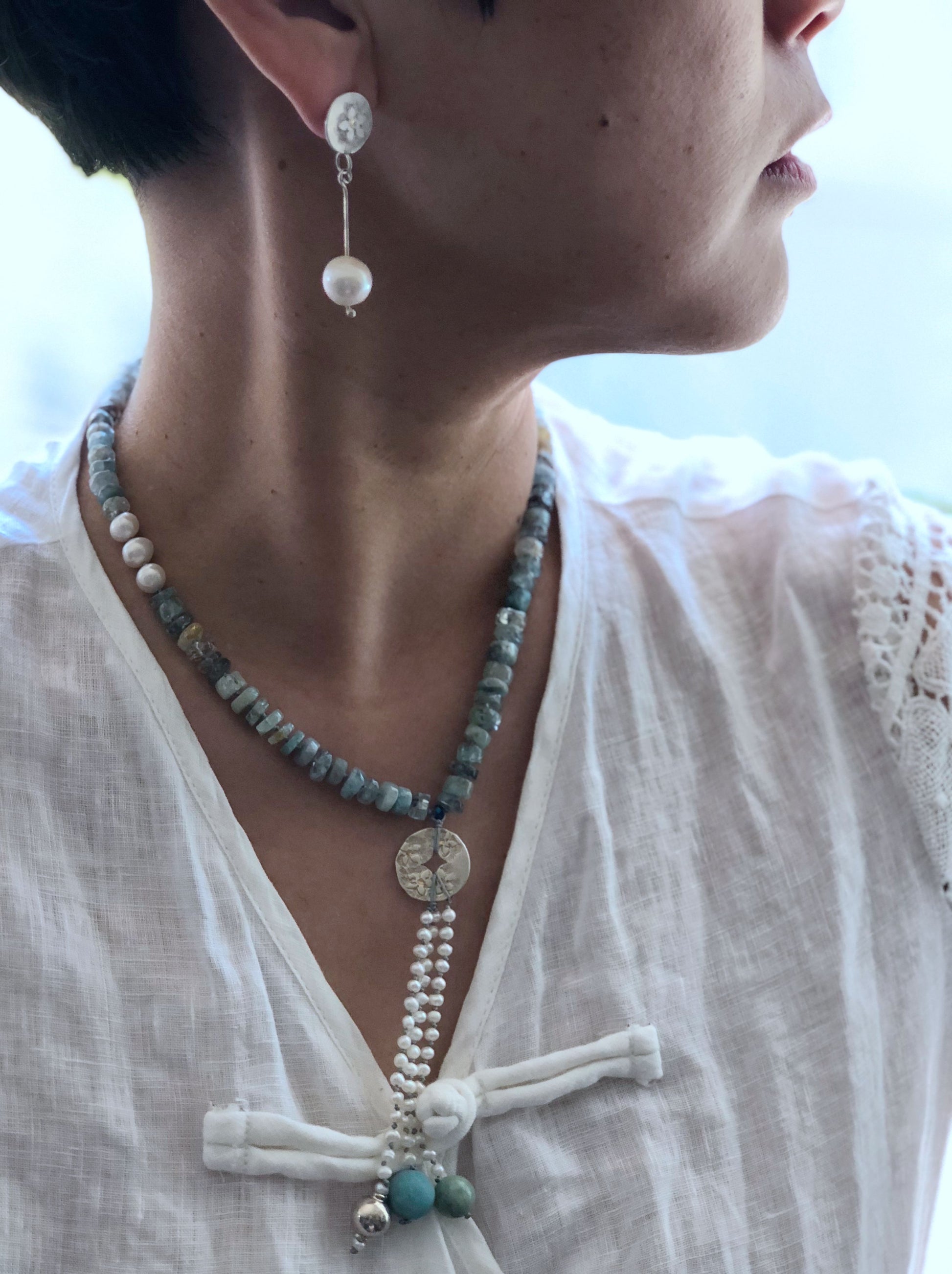 Materials : Aquamarine , fine silver pendent , fresh water pearl