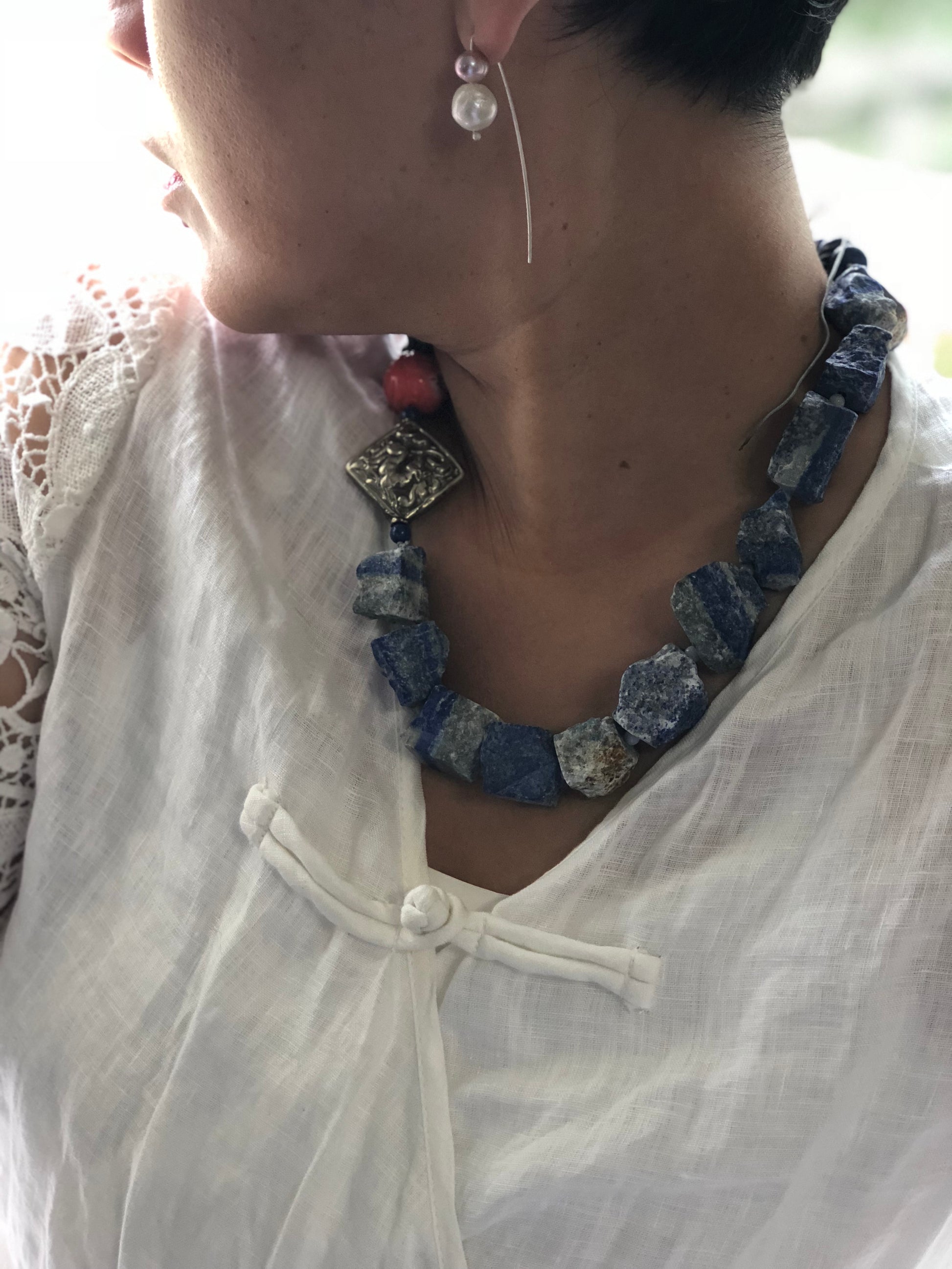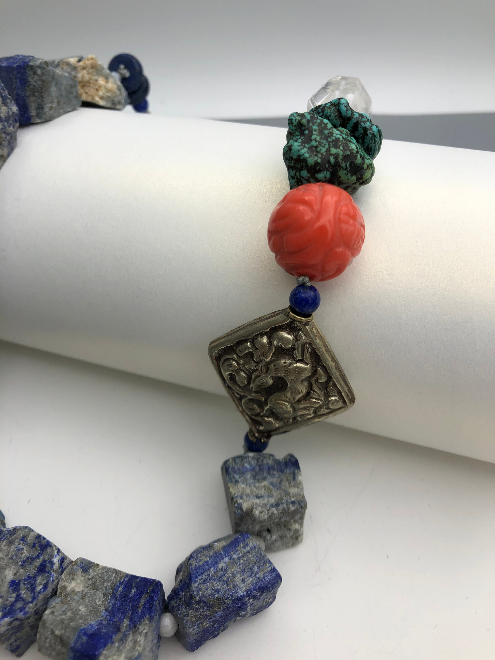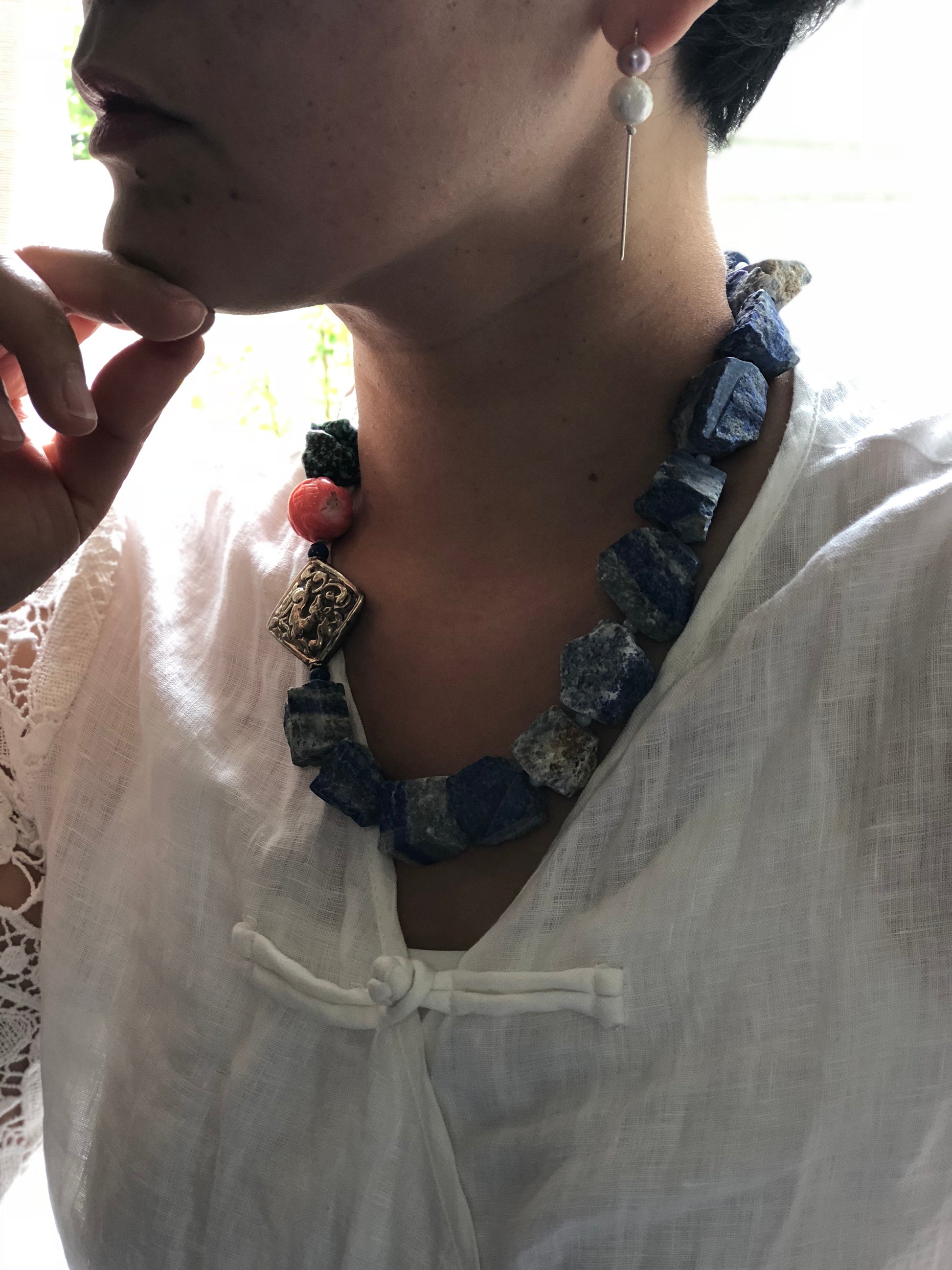 Chunky raw lapis rocks, with old Tibetan silver bead, and one piece of red coral, this is a statement piece. Hand knotted between each beads, can be resized for special request.