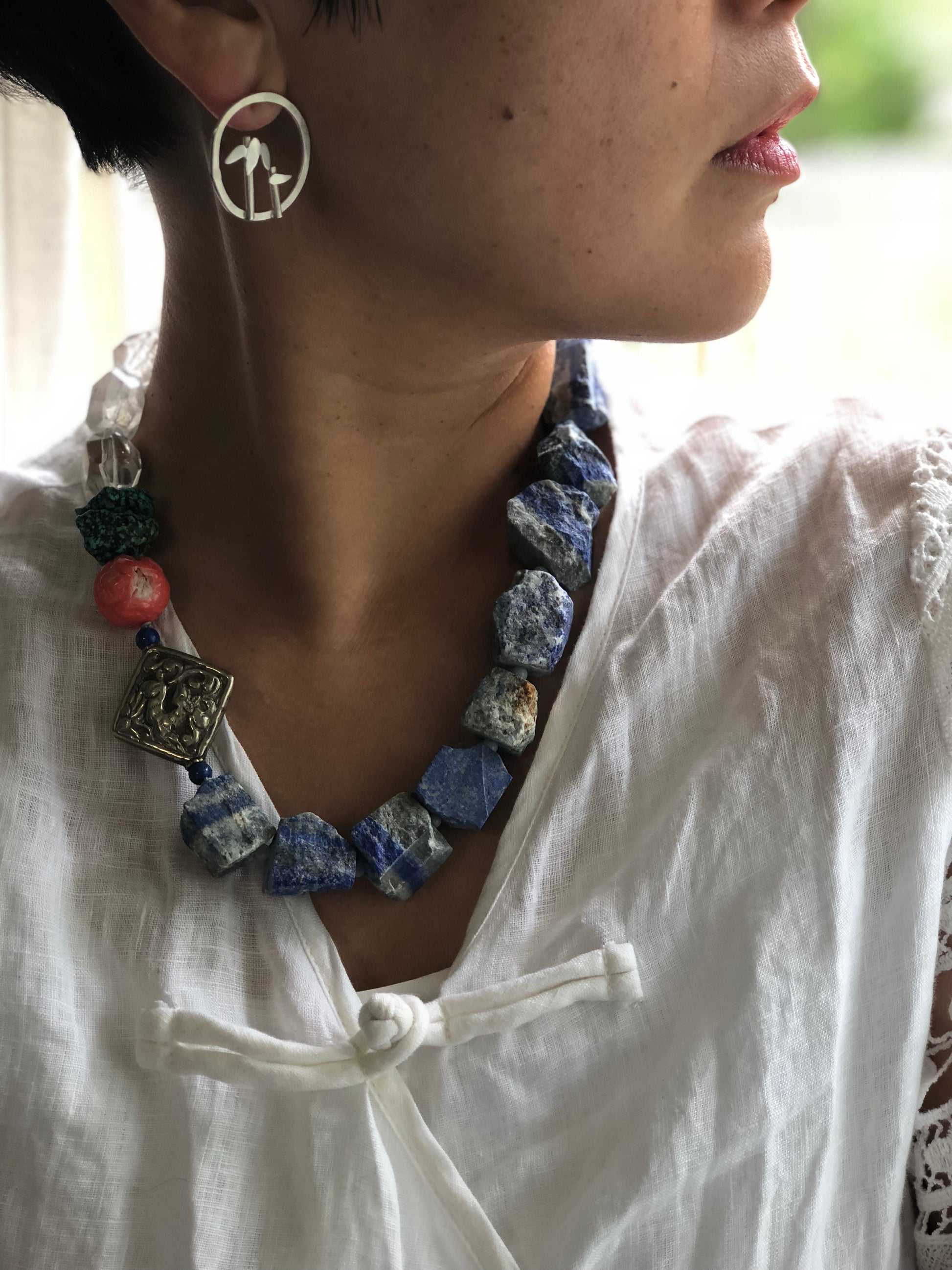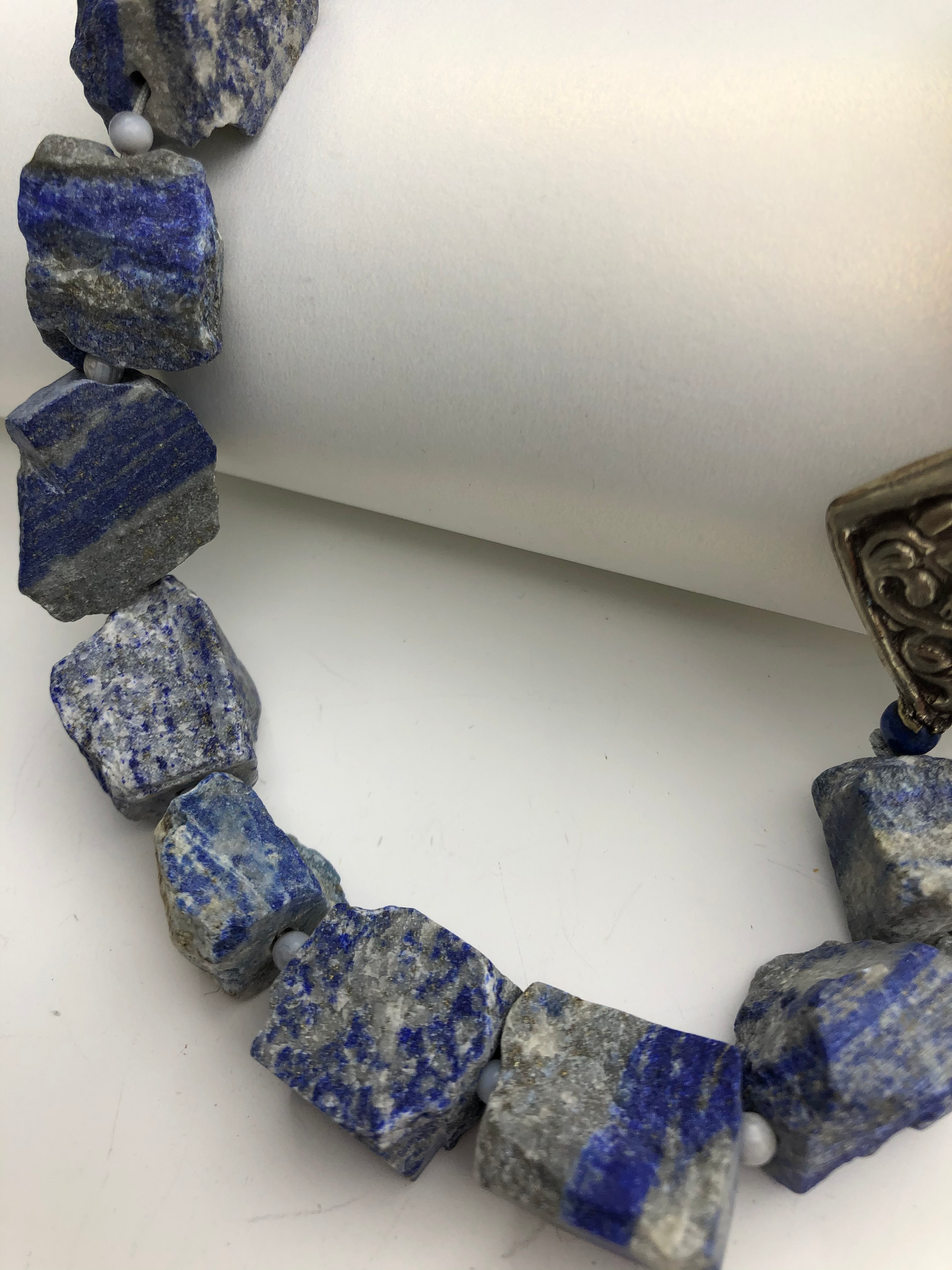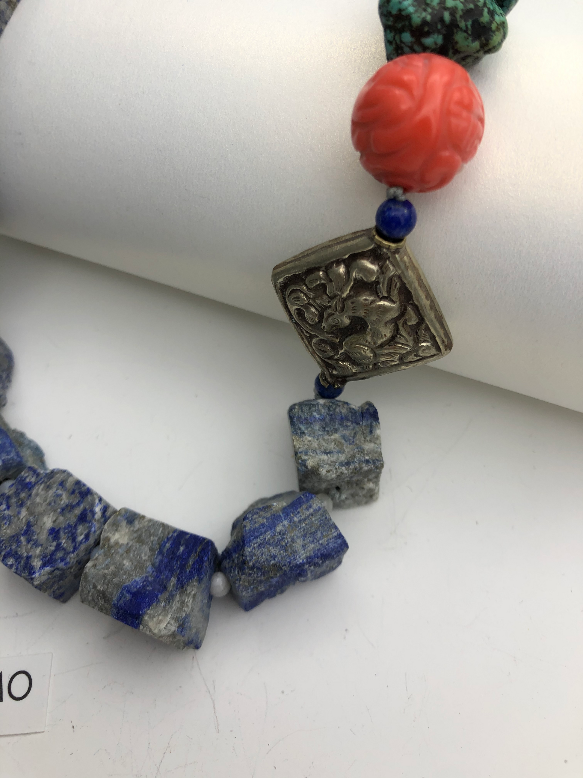 Chunky raw lapis rocks, with old Tibetan silver bead, and one piece of red coral, this is a statement piece. Hand knotted between each beads, can be resized for special request.