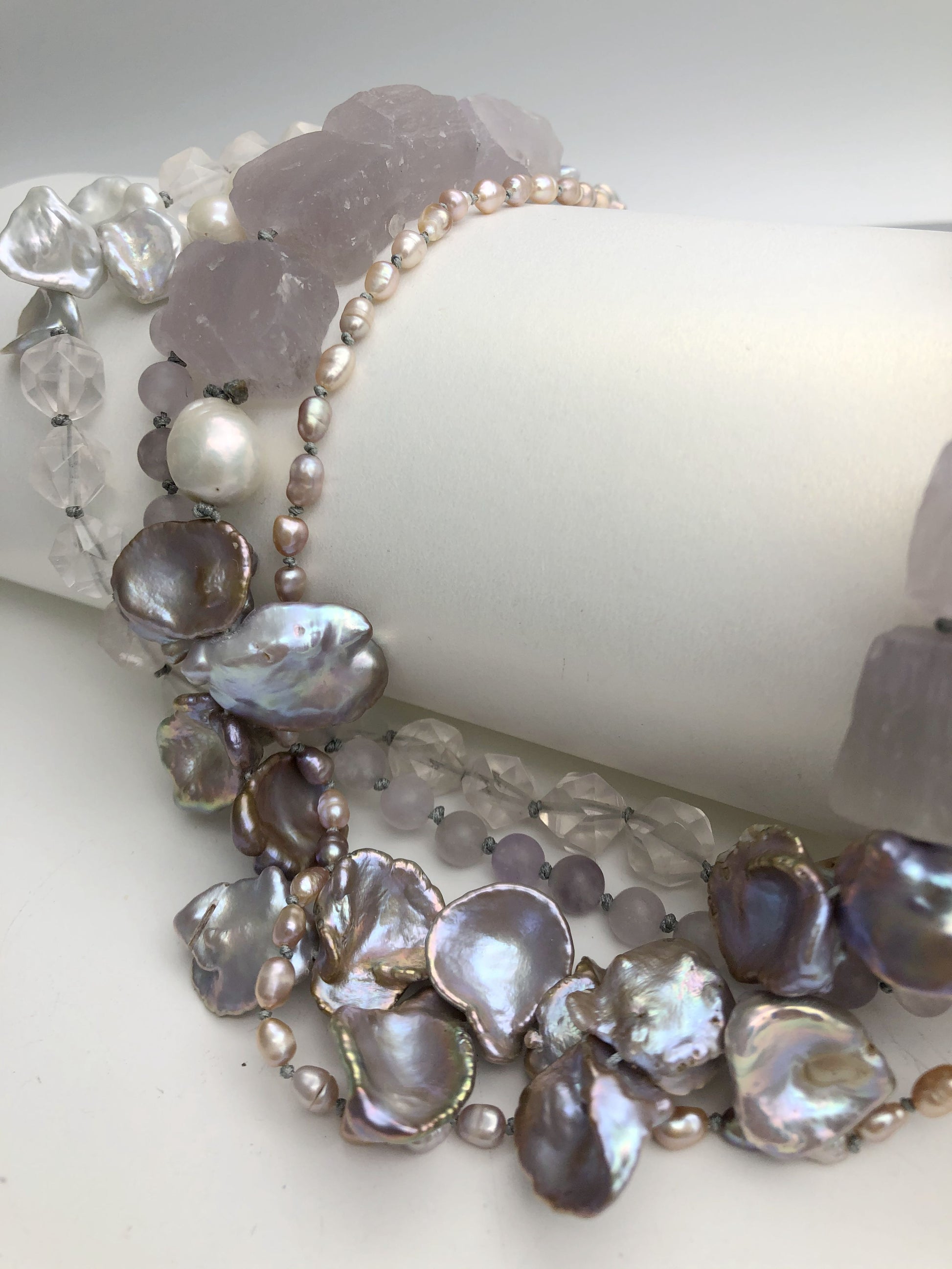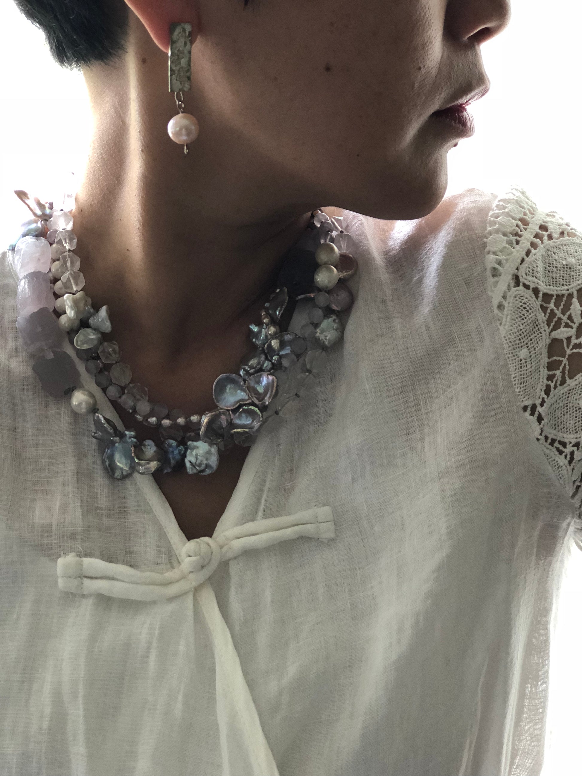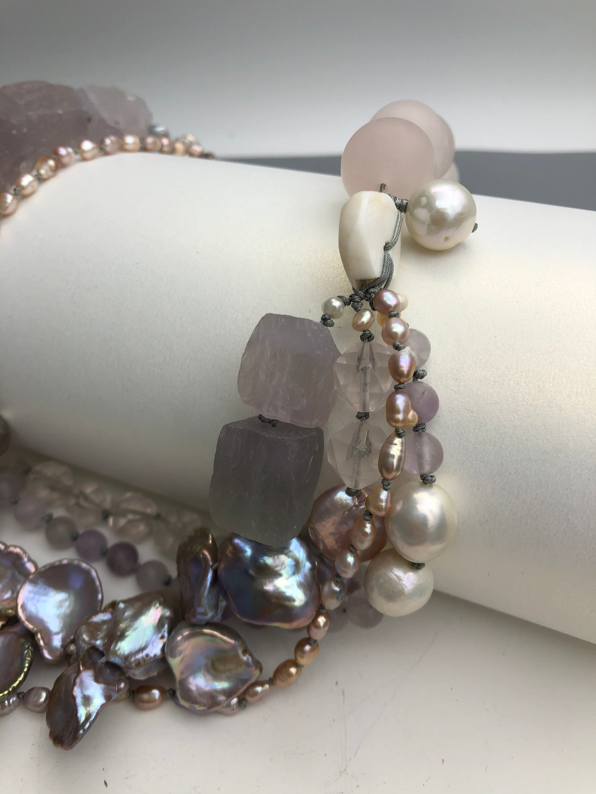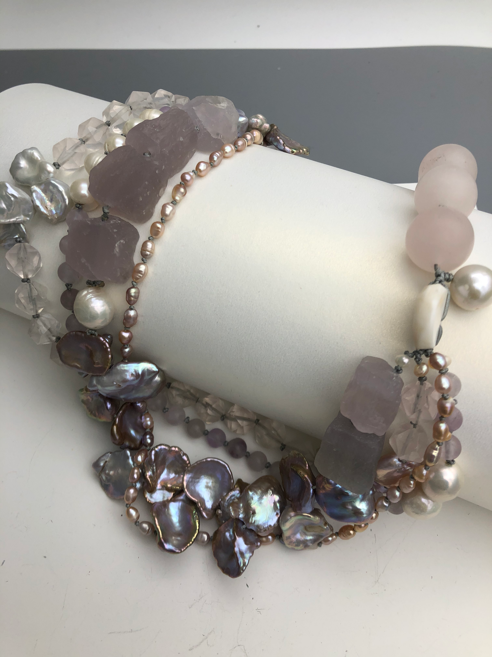Multi strand of treasures, very gentle purple amethyst , layer with petal shape fresh water pearl and soft pink rose quartz. Hand knotted between each beads, can resized for special request.