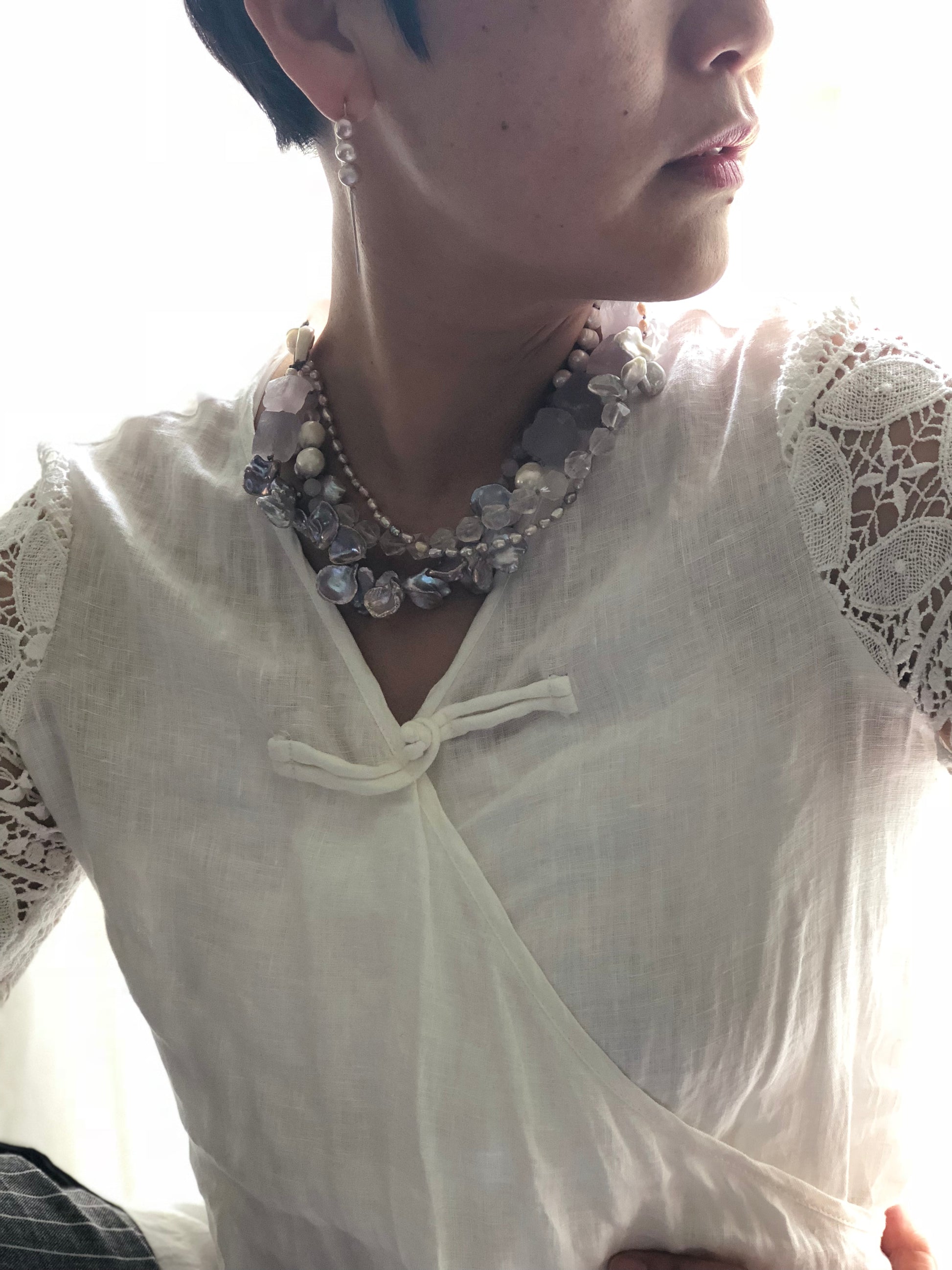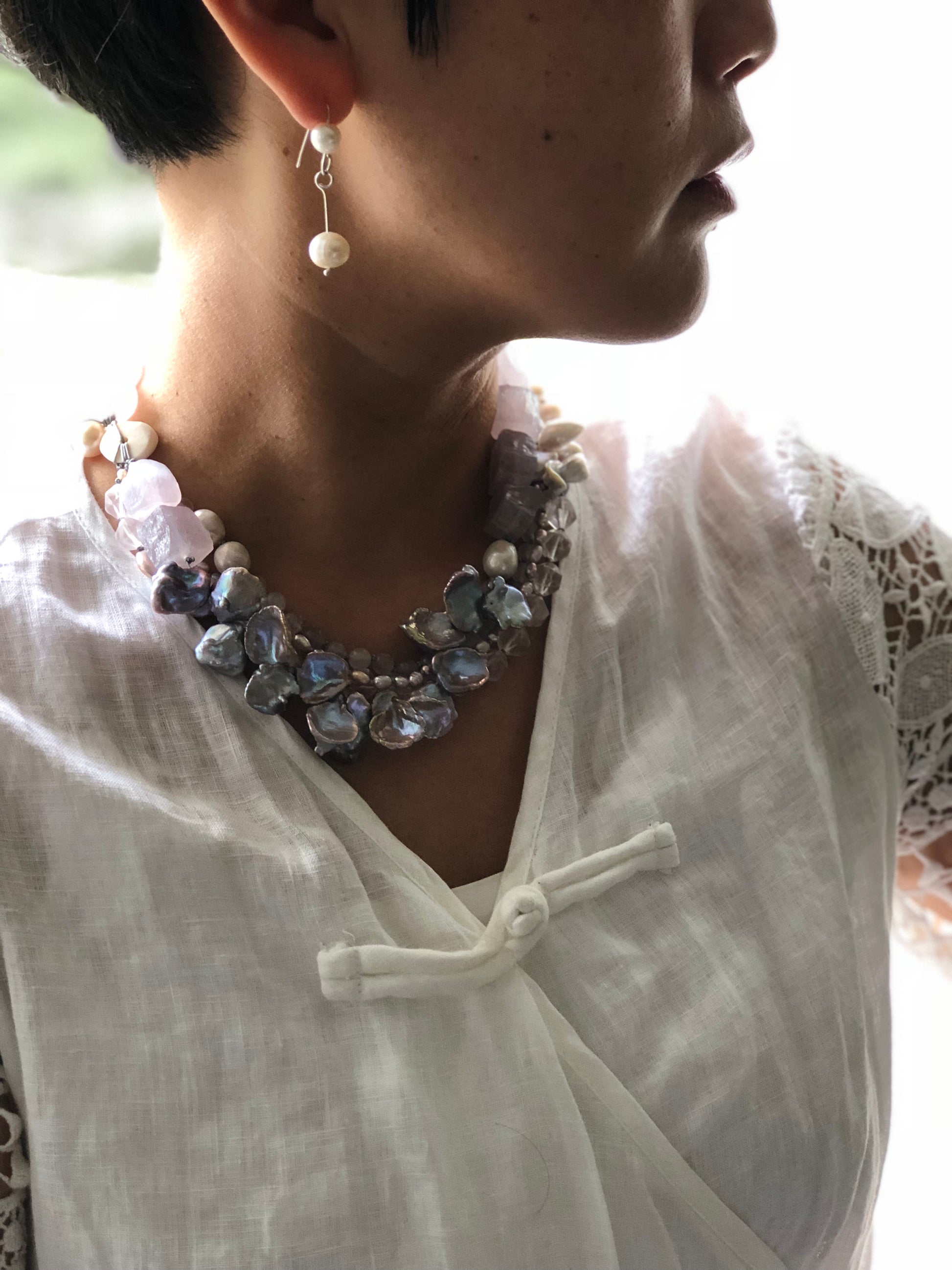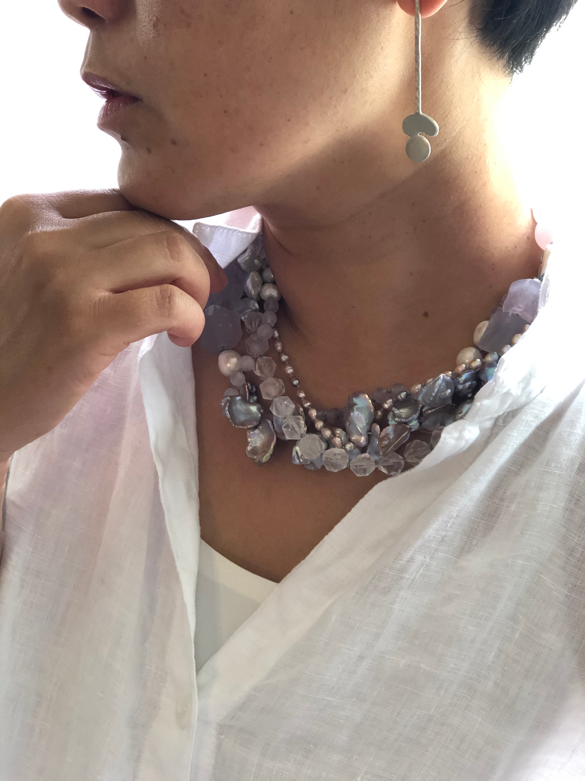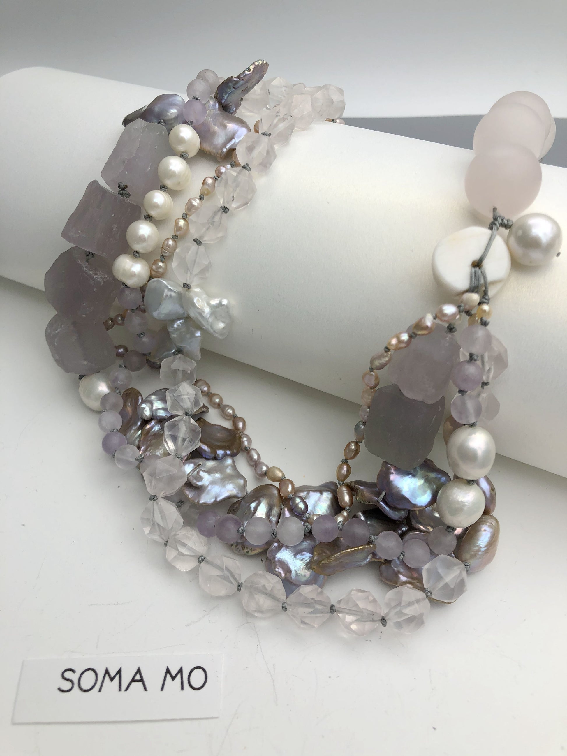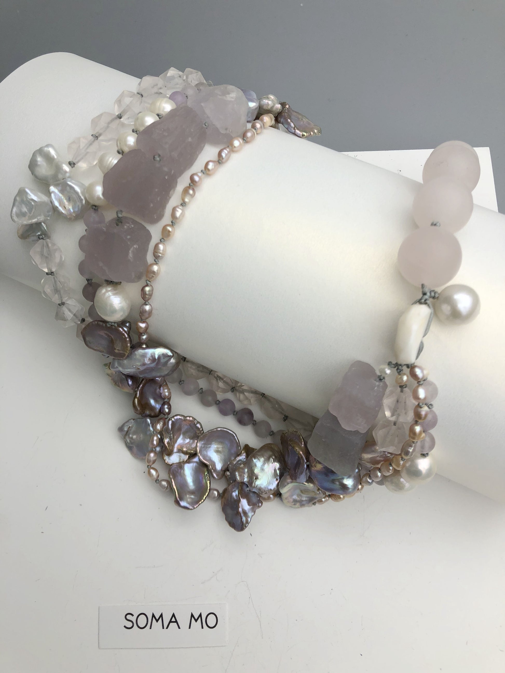 Multi strand of treasures, very gentle purple amethyst , layer with petal shape fresh water pearl and soft pink rose quartz. Hand knotted between each beads, can resized for special request.