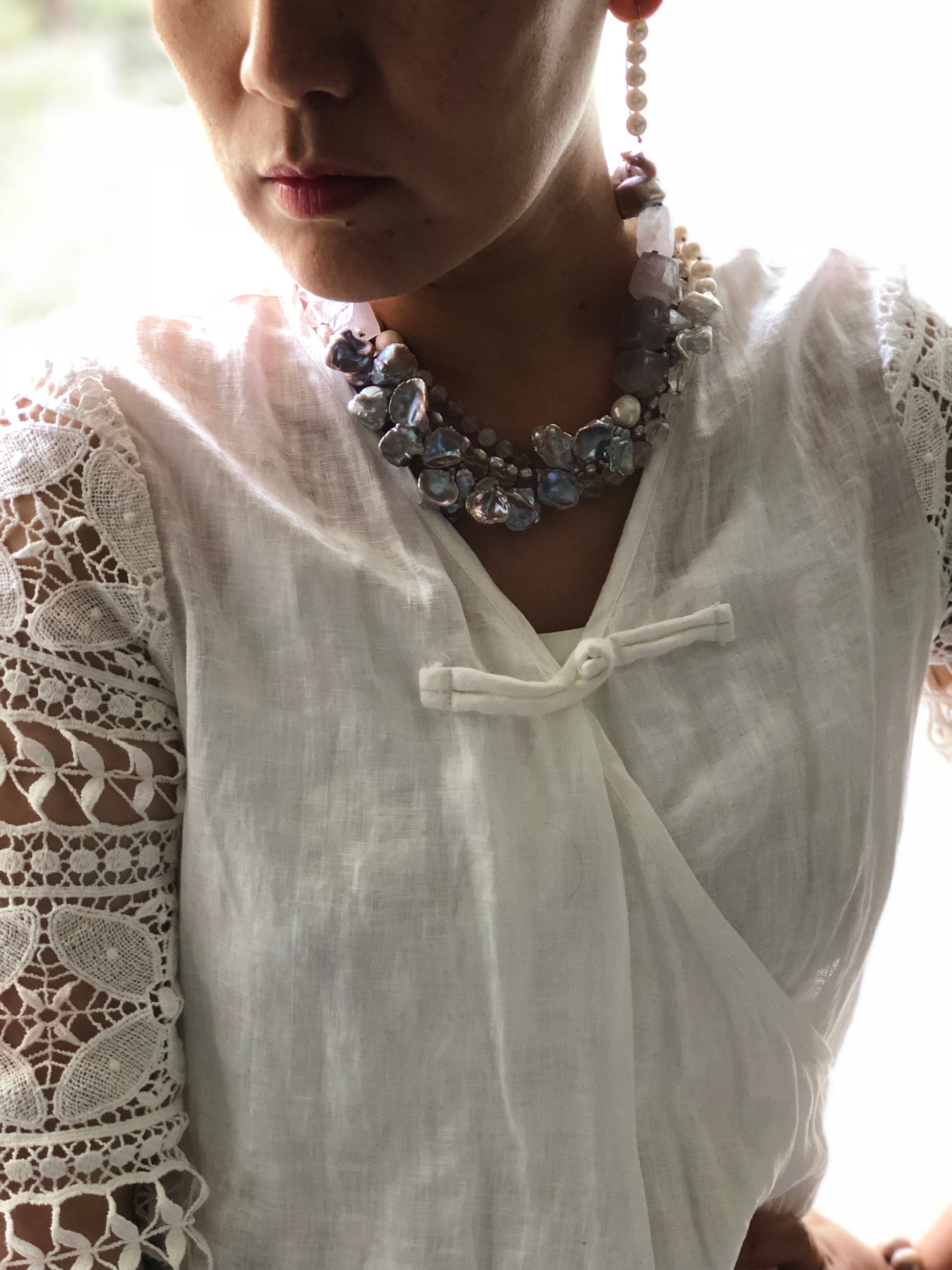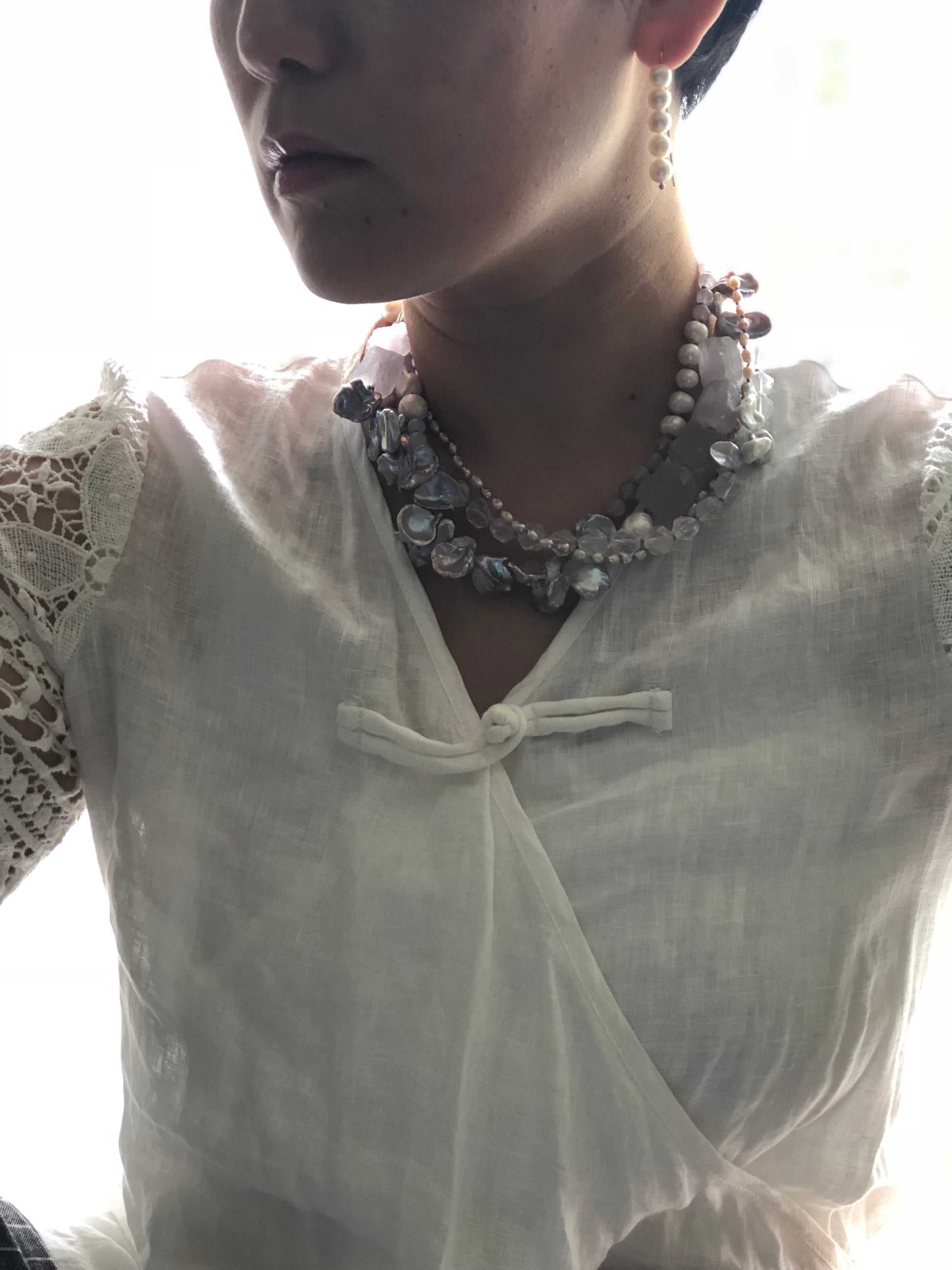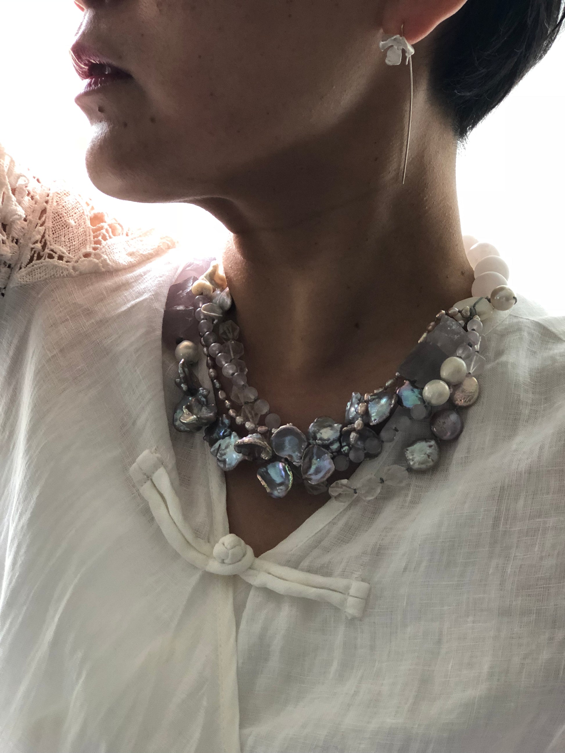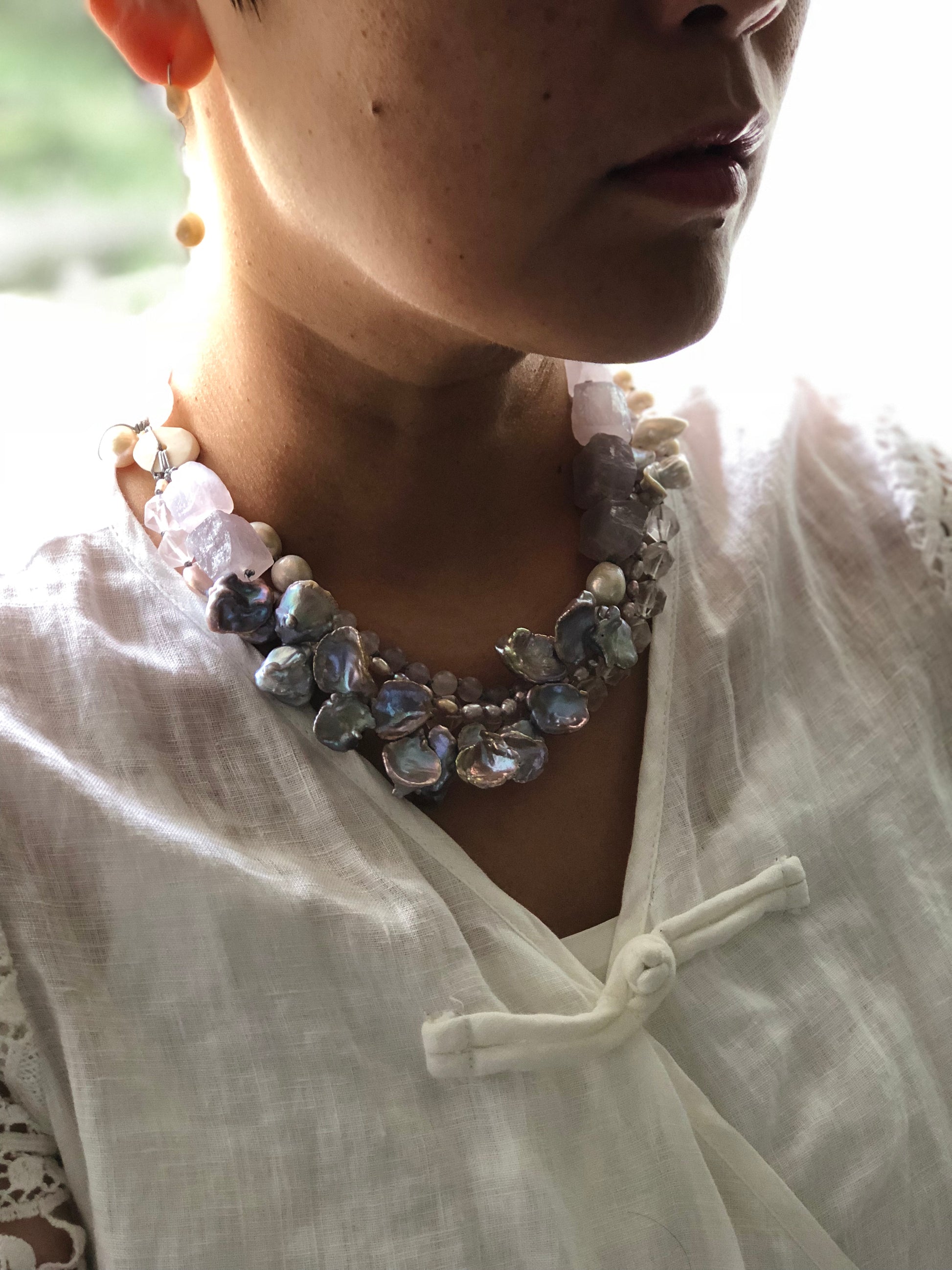 Multi strand of treasures, very gentle purple amethyst , layer with petal shape fresh water pearl and soft pink rose quartz. Hand knotted between each beads, can resized for special request.