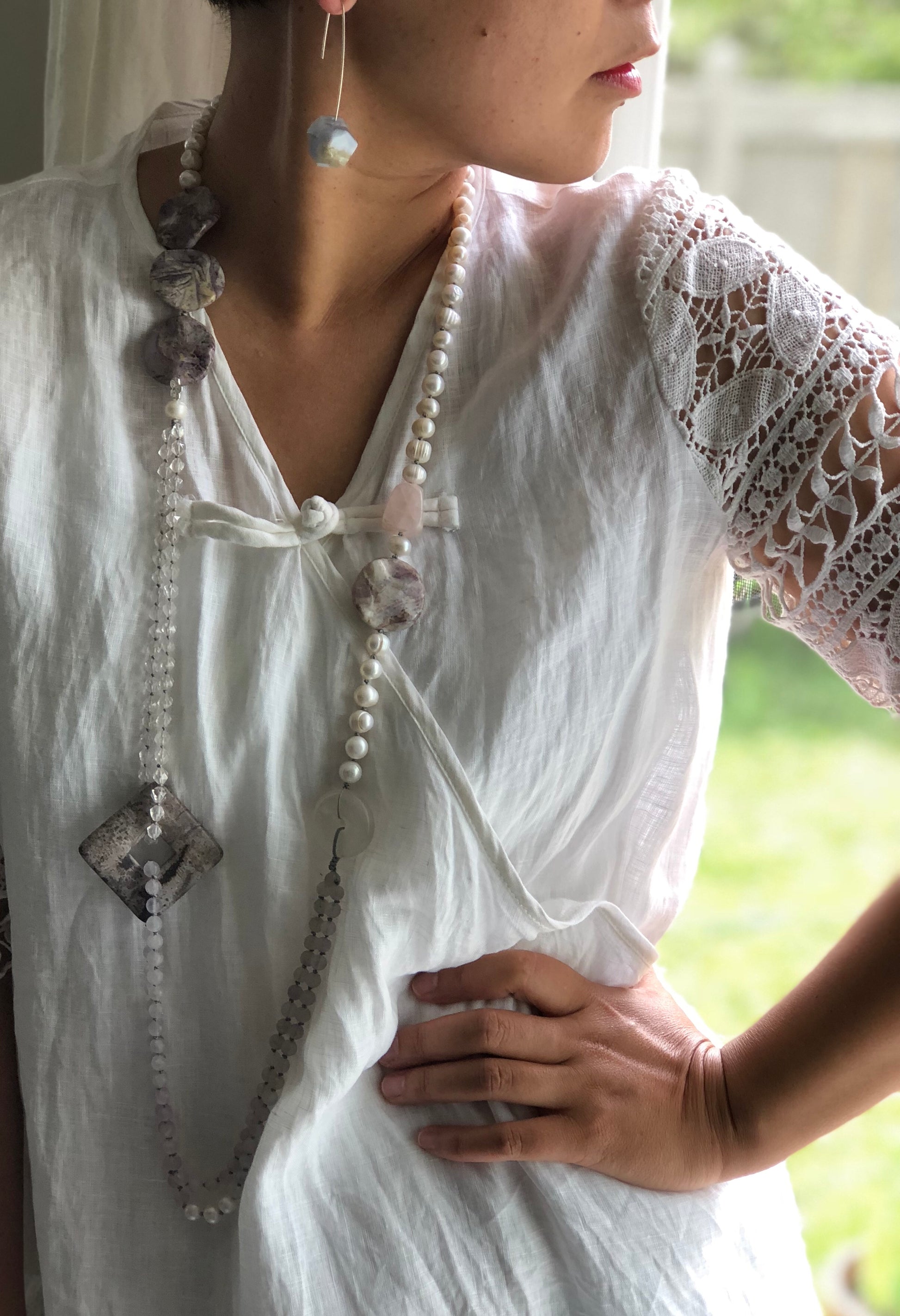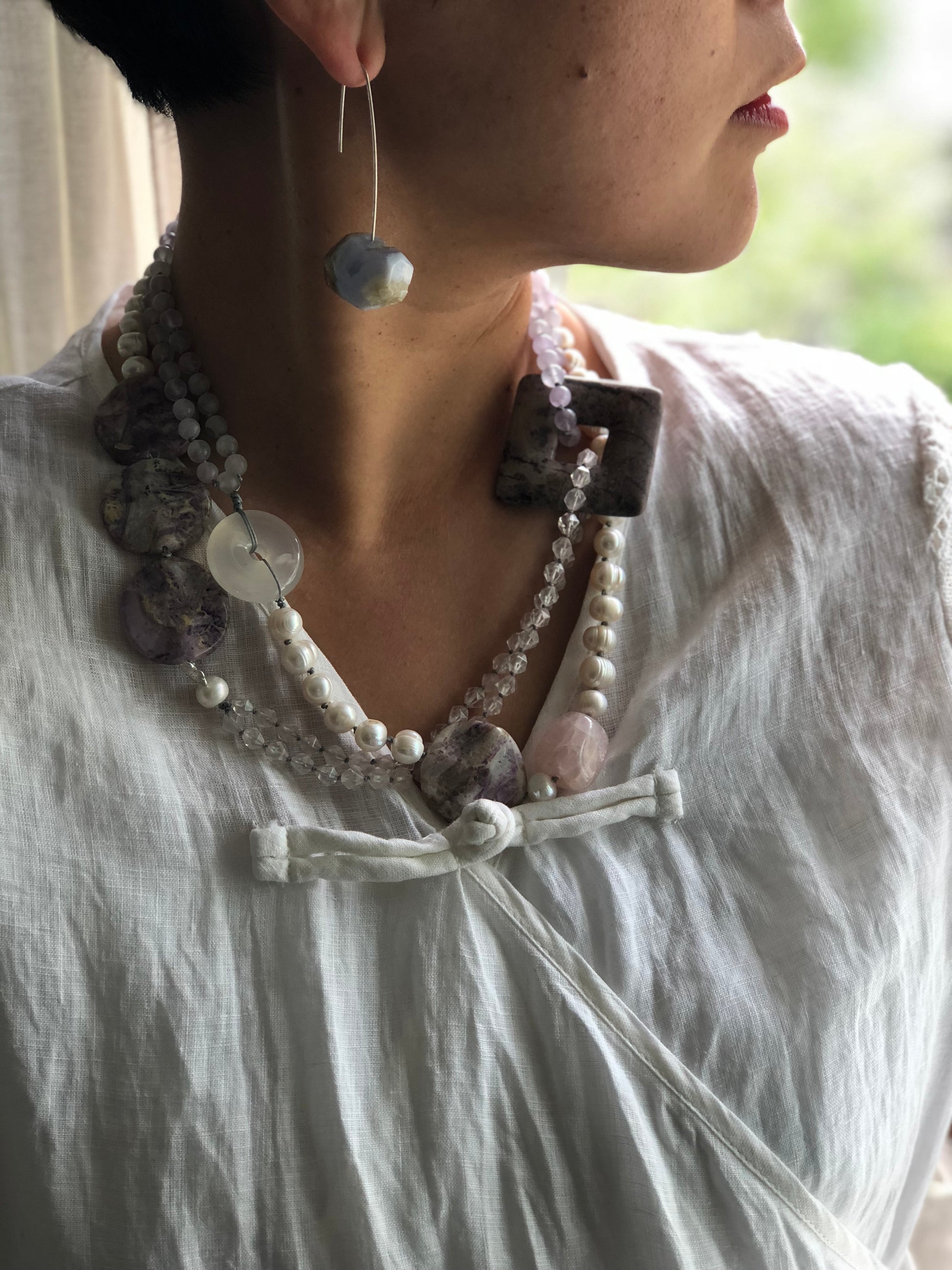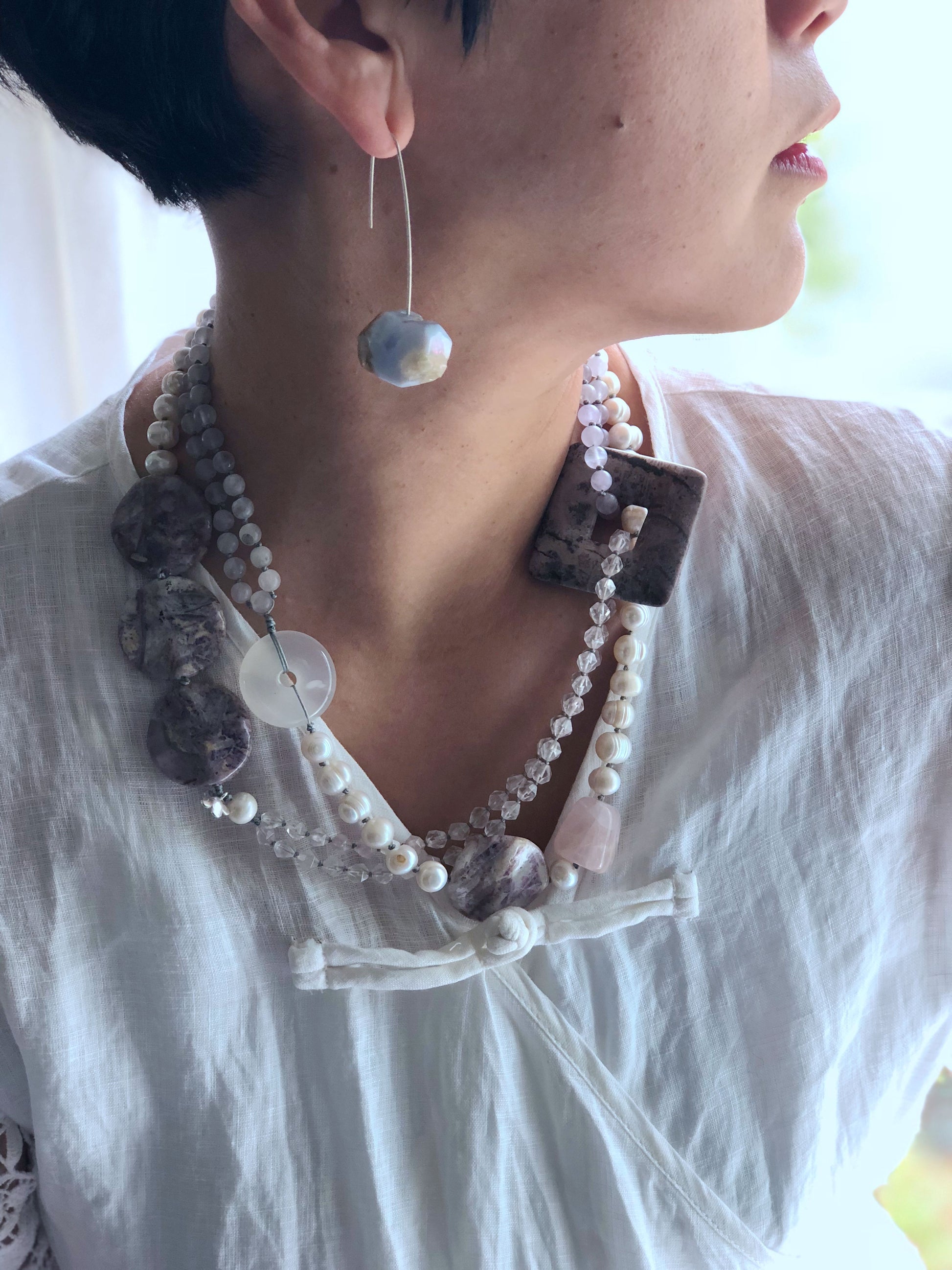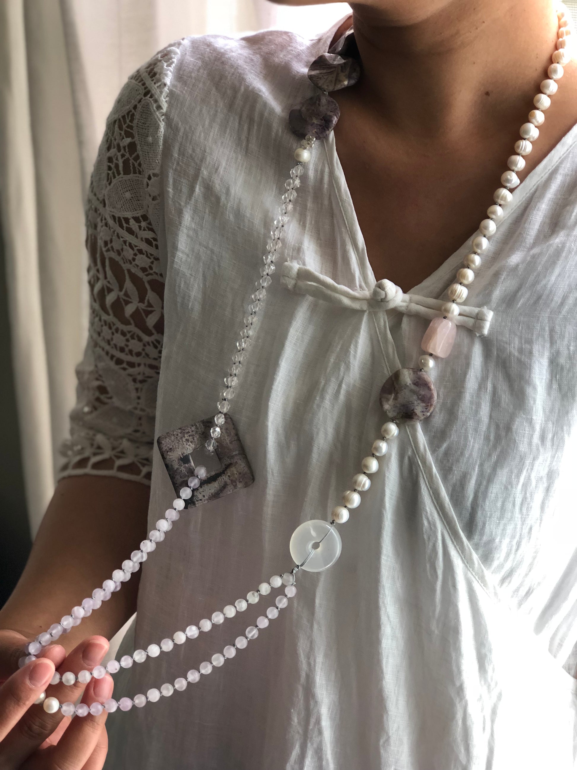 Asymmetric design, Long strand of semi precious stone and fresh water pearl. Hand knotted between each beads, you can wear long or doubled.