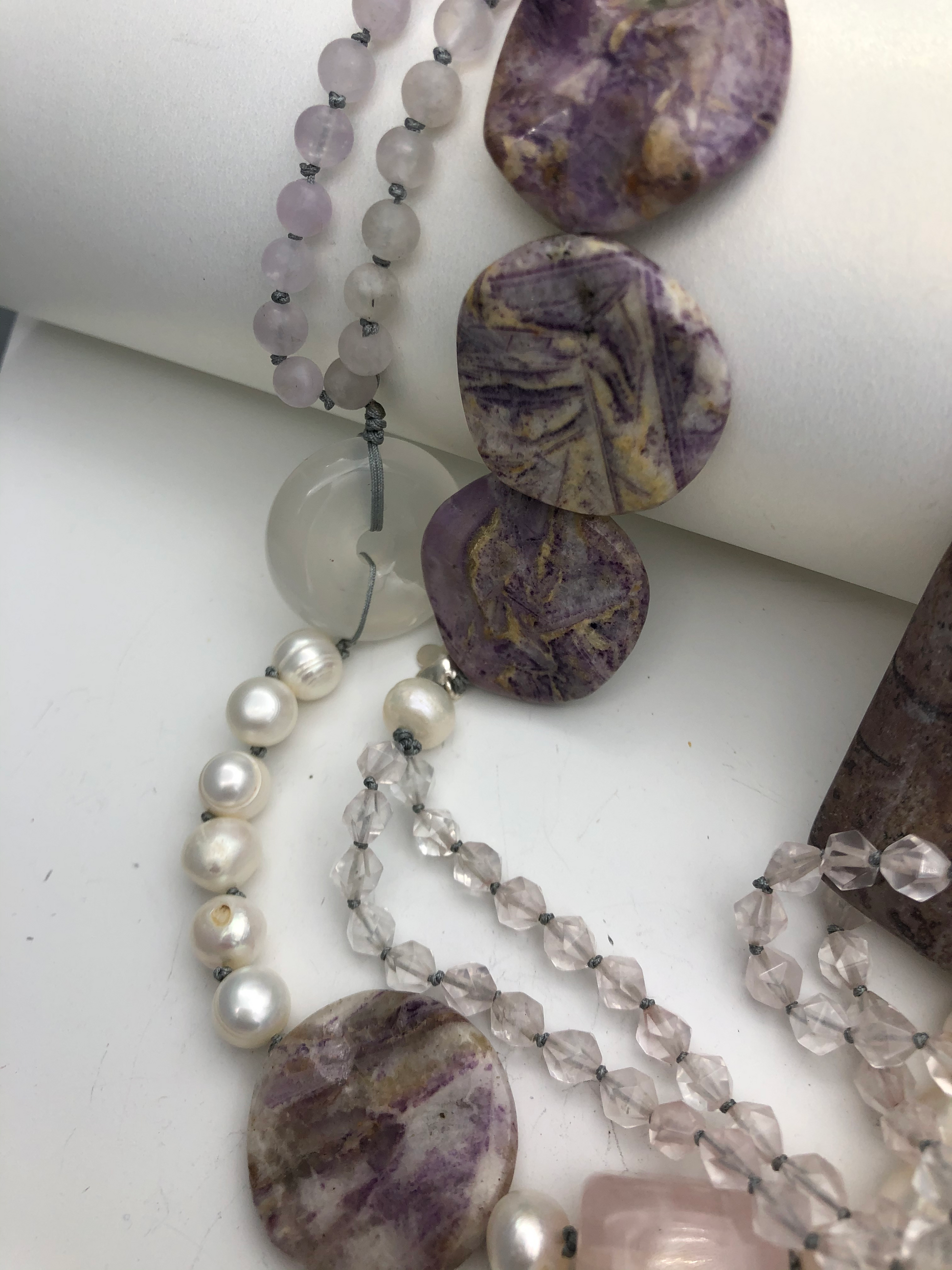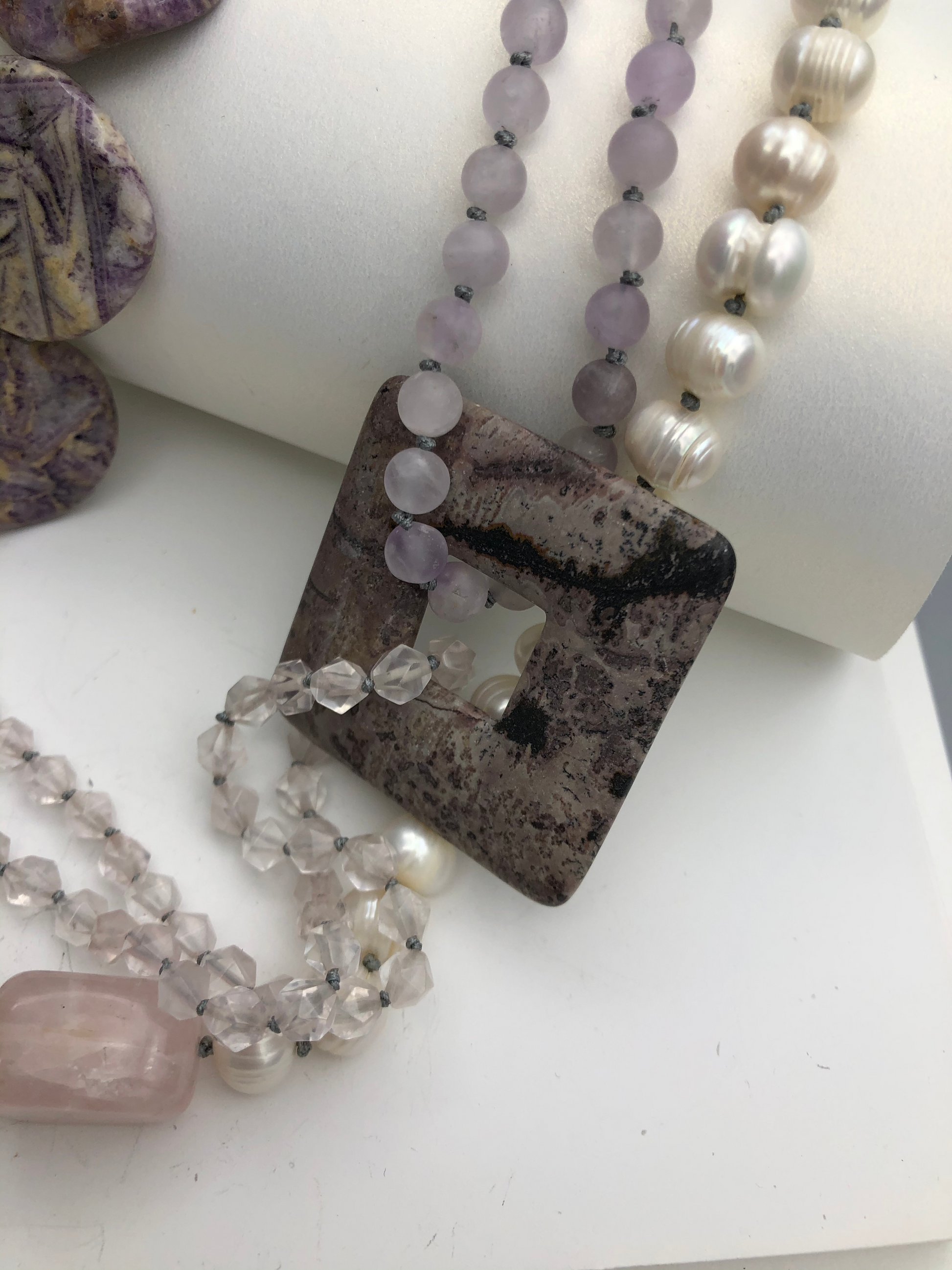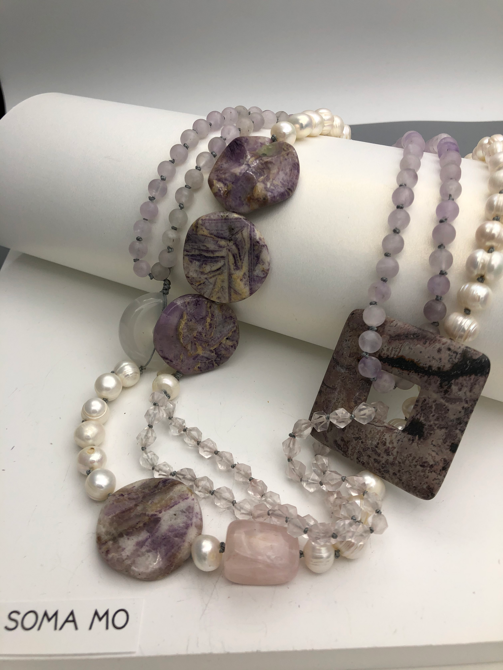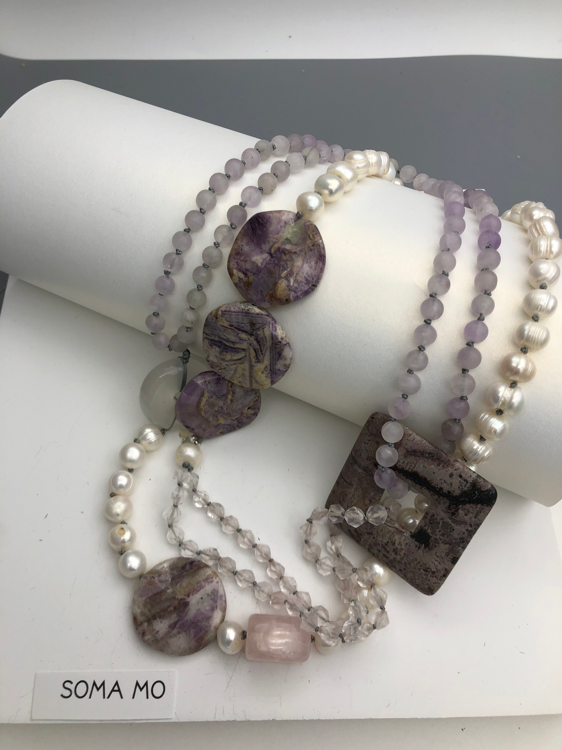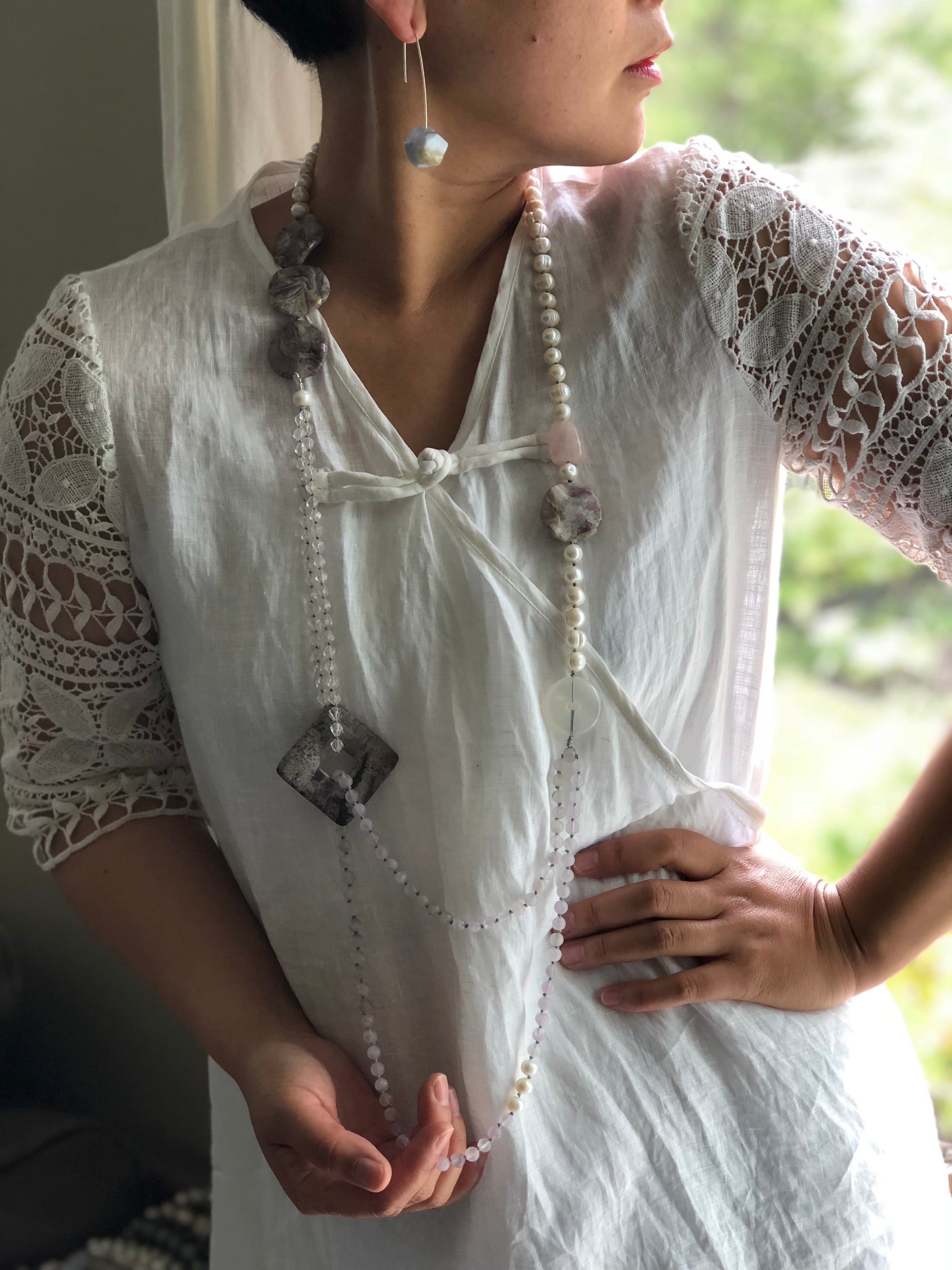 Asymmetric design, Long strand of semi precious stone and fresh water pearl. Hand knotted between each beads, you can wear long or doubled.